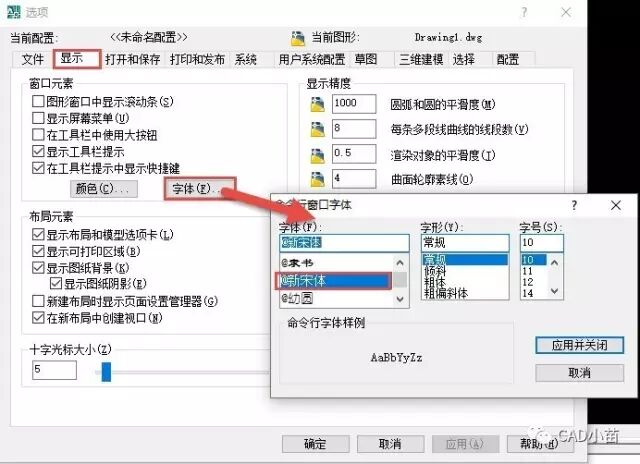 至于為什么他們的命令行字體為什么會(huì)變,這個(gè)原因我也沒有弄清楚,總之命令行的文字顯示不正常就是字體設(shè)置有問題了,只需要打開選項(xiàng)OP對(duì)話框,在“顯示”選項(xiàng)卡中將命令行文字設(shè)置成常規(guī)字體,如一下圖所示。
