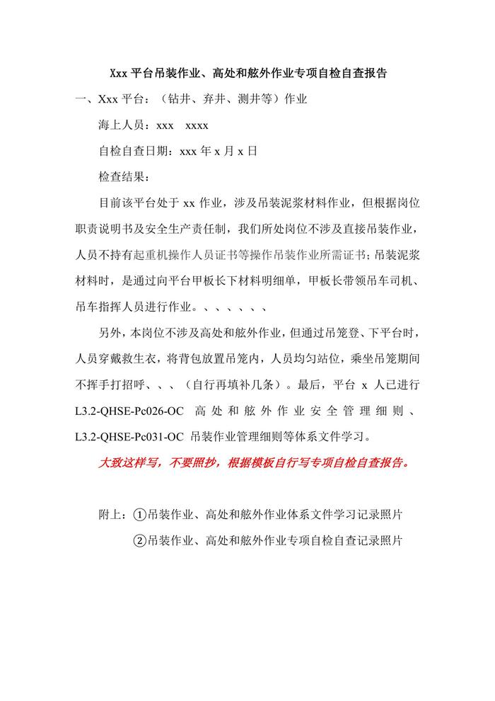 吊裝作業(yè)、高處和舷外作業(yè)專項(xiàng)自檢自查報(bào)告模板docx 吊裝作業(yè)、高處和舷外作業(yè)專項(xiàng)自檢自查報(bào)告模板docx