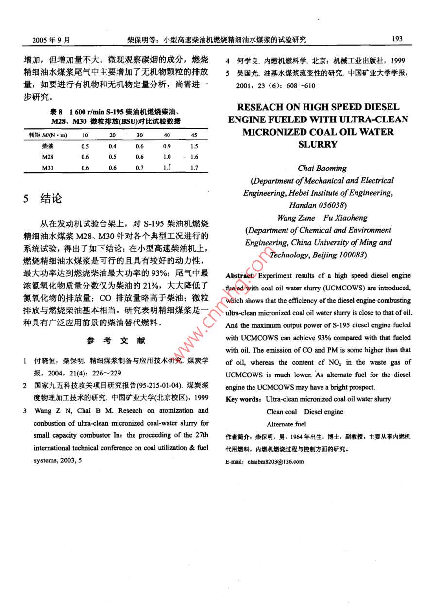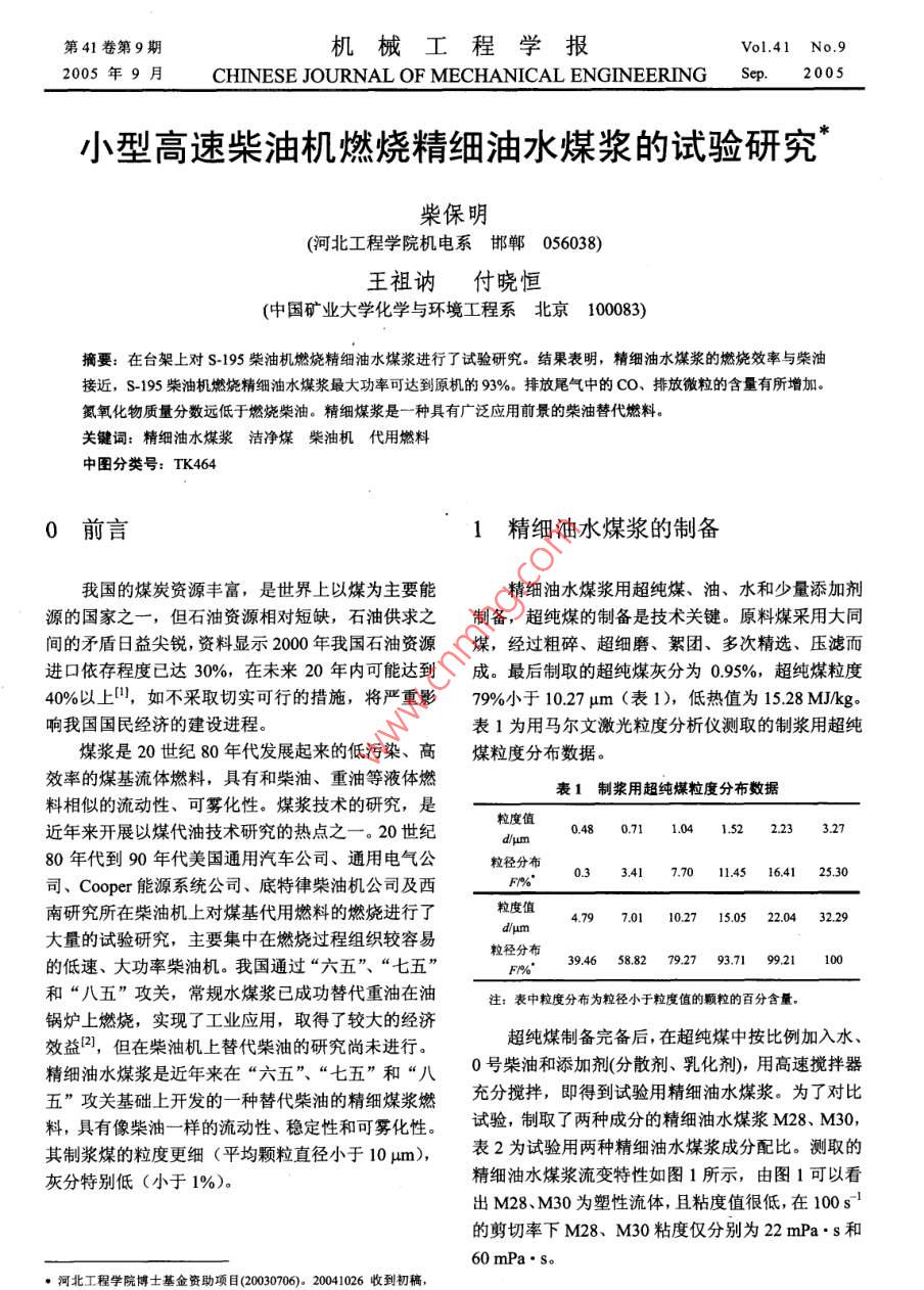 小型高速柴油機(jī)燃燒精細(xì)油水煤漿的試驗(yàn)研揪
