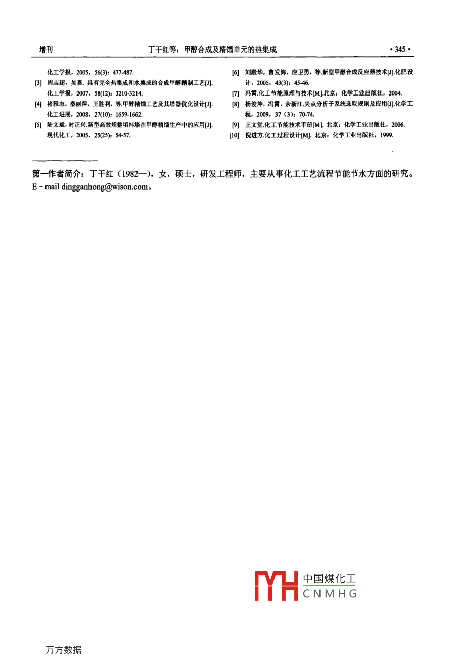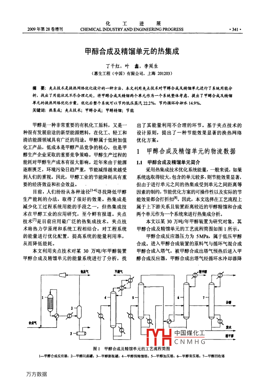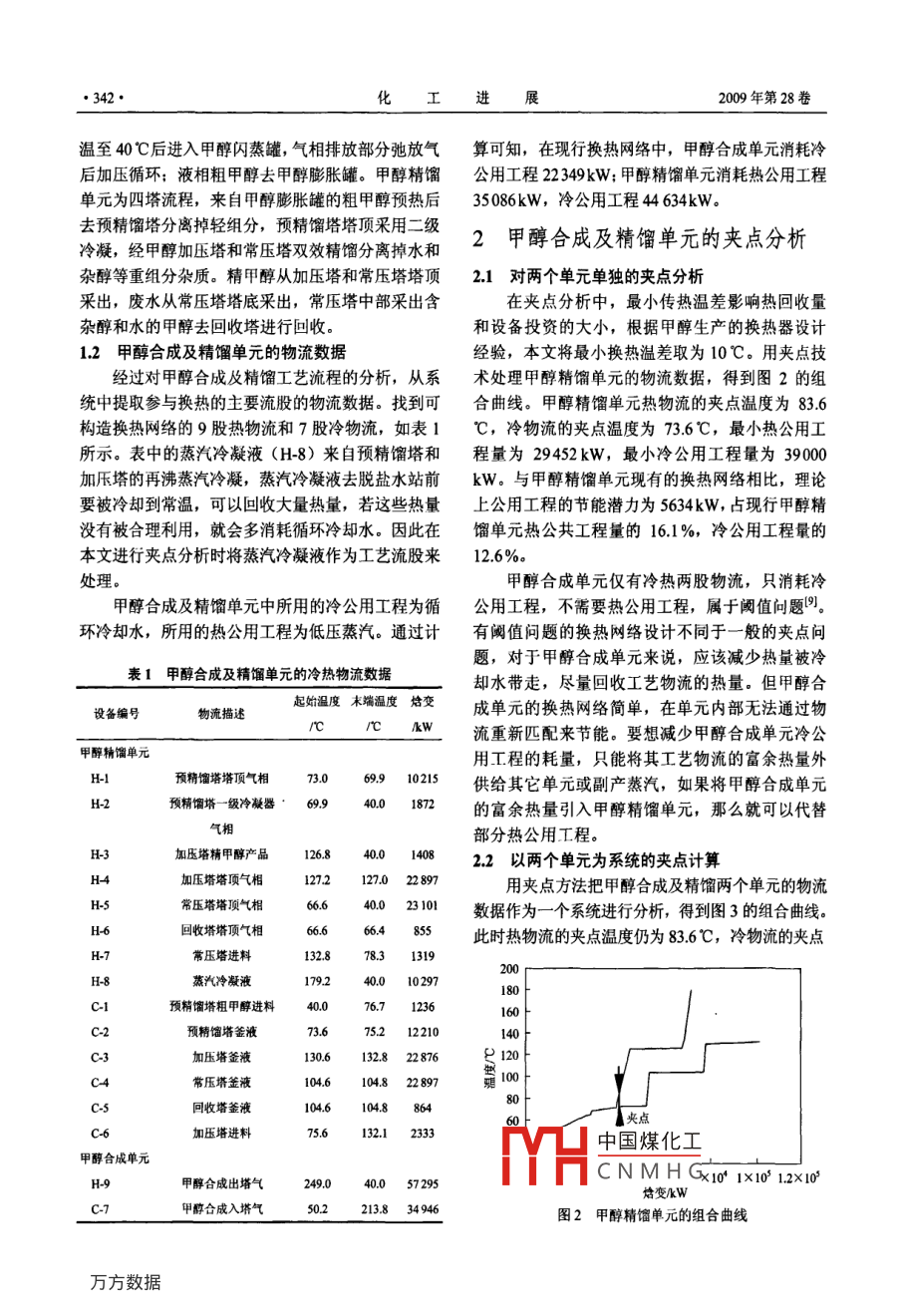 化工進展2009年第28卷增刊CHEMICAL INDUSTRY AND ENGINEERING PROGRESS·341·甲醇合成及精餾單元的熱集成丁干紅,葉鑫,李延生(惠生工程(中國)有限公司,上海201203)摘要:夾點技術是換熱網絡優(yōu)化設計的一種方法,本文利用央點技術對甲醇合成及精餾單元進行了系統(tǒng)用能分析,找出了用能狀況不盡合理之處。將甲醇合成及精餾兩個單元作為一個系純整體考慮,提出了甲醇合成及精餾單元的換熱網絡優(yōu)化方,優(yōu)化后整個系統(tǒng)可以節(jié)約低壓蒸汽2.2%,節(jié)約循環(huán)冷卻水14.9%關鍵詞:熱集成;夾點技術;甲醇合成;甲醇精餾;節(jié)能甲醇是一種非常重要的有機化工原料,又是一出了其能量利用不合理的環(huán)節(jié)?;趭A點技術的種很有發(fā)展前途的新型能源燃料,在化工、輕工和設計原則,提出了一種節(jié)能效果顯著的換熱網絡清潔能源領域具有廣泛的用途。甲醇屬于低附加值優(yōu)化方案?;ぎa品,低成本是甲醇產品競爭的核心,也是甲醇生產企業(yè)采取的重要競爭策略咯。甲醇生產過程的1甲醇合成及精餾單元的物流數(shù)據(jù)能耗對甲醇生產成本有很大影響。近年來由于能源1.1甲醇合成及精餾單元簡介逐漸匱乏,環(huán)境污染日趨嚴重,節(jié)能減排越來越受采用熱集成技術優(yōu)化系統(tǒng)能量,一般來說,如果到人們的重視。因此,甲醇工業(yè)的節(jié)能降耗具有重系統(tǒng)選取得較大,包含的單元較多,則節(jié)能效果顯著,要的經濟效益和社會效益但由于進行單元之間的熱集成受到單元之間距離等目前,人們紛紛從各種途徑16尋找降低甲醇因素的制約,節(jié)能優(yōu)化方案的可操作性以及實際的節(jié)生產能耗的辦法,取得了很好的效果。熱集成是能效果都會打折扣。因此,本文選擇在工藝流程上減少化工過程系統(tǒng)用能的手段之一,但熱集成技屬于上下游關系且裝置距離較近的甲醇精餾和合成術在甲醇工業(yè)的應用研究,至今鮮有報道。夾點兩個單元作為一個系統(tǒng)來進行熱集成分析。技術是目前應用最廣泛的熱集成技術,夾點技本文以某30萬噸/年甲醇裝置為研究對象,其術將熱力學原理和系統(tǒng)工程相結合,對工程系統(tǒng)甲醇合成及精餾單元的工藝流程簡圖如圖1所示。的能量進行優(yōu)化配置,提高系統(tǒng)的能量利用率甲醇合成反應器壓力為5MPa,屬于低壓甲醇從而降低能耗合成。進入甲醇合成裝置的原料氣與循環(huán)氣混合成本文利用夾點技術對某30萬噸/年甲醇裝置甲醇合成入塔氣,被甲醇合成出塔氣預熱后進入甲甲醇合成及精餾單元的能量系統(tǒng)進行了分析,找醇合成反應器,甲醇合成出塔氣經循環(huán)水冷卻器降不隊氣合成氣中國煤化工CNMHG圖1甲醇合成及精餾單元的工藝流程簡圖1—甲醇合成反應器;2—甲醇閃蒸罐;3甲醇膨脹罐:4甲醇預精餾塔;5—甲醇加壓塔;6甲醇常壓塔;甲醇回收塔342·化工進展2009年第28卷溫至40℃后進入甲醇閃蒸罐,氣相排放部分弛放氣算可知,在現(xiàn)行換熱網絡中,甲醇合成單元消耗冷后加壓循環(huán);液相粗甲醇去甲醇膨脹罐。甲醇精餾公用工程22349kW;甲醇精餾單元消耗熱公用工程單元為四塔流程,來自甲醇膨脹罐的粗甲醇預熱后35086kW,冷公用工程44634kW。去預精餾塔分離掉輕組分,預精餾塔塔頂采用二級冷凝,經甲醇加壓塔和常壓塔雙效精餾分離掉水和2甲醇合成及精餾單元的夾點分析雜醇等重組分雜質。精甲醇從加壓塔和常壓塔塔頂21對兩個單元單獨的夾點分析釆出,廢水從常壓塔塔底采出,常壓塔中部采出含在夾點分析中,最小傳熱溫差影響熱回收量雜醇和水的甲醇去回收塔進行回收。和設備投資的大小,根據(jù)甲醇生產的換熱器設計1.2甲醇合成及精餾單元的物流數(shù)據(jù)經驗,本文將最小換熱溫差取為10℃。用夾點技經過對甲醇合成及精餾工藝流程的分析,從系術處理甲醇精餾單元的物流數(shù)據(jù),得到圖2的組統(tǒng)中提取參與換熱的主要流股的物流數(shù)據(jù)。找到可合曲線。甲醇精餾單元熱物流的夾點溫度為83.6構造換熱網絡的9股熱物流和7股冷物流,如表1℃,冷物流的夾點溫度為736℃,最小熱公用工所示。表中的蒸汽冷凝液(H8)來自預精餾塔和程量為29452kW,最小冷公用工程量為3900加壓塔的再沸蒸汽冷凝,蒸汽冷凝液去脫鹽水站前kW。與甲醇精餾單元現(xiàn)有的換熱網絡相比,理論要被冷卻到常溫,可以回收大量熱量,若這些熱量上公用工程的節(jié)能潛力為5634kW,占現(xiàn)行甲醇精沒有被合理利用,就會多消耗循環(huán)冷卻水。因此在餾單元熱公共工程量的16.1%,冷公用工程量的本文進行夾點分析時將蒸汽冷凝液作為工藝流股來12.6%處理。甲醇合成單元僅有冷熱兩股物流,只消耗冷甲醇合成及精餾單元中所用的冷公用工程為循公用工程,不需要熱公用工程,屬于閾值問題環(huán)冷卻水,所用的熱公用工程為低壓蒸汽。通過計有闕值問題的換熱網絡設計不同于一般的夾點問題,對于甲醇合成單元來說,應該減少熱量被冷表1甲醇合成及精餾單元的冷熱物流數(shù)據(jù)卻水帶走,盡量回收工藝物流的熱量。但甲醇合起始溫度末端溫度變設備編號物流描述成單元的換熱網絡簡單,在單元內部無法通過物流重新匹配來節(jié)能。要想減少甲醇合成單元冷公甲醇精餾單元用工程的耗量,只能將其工藝物流的富余熱量外預精餾塔塔頂氣相730699供給其它單元或副