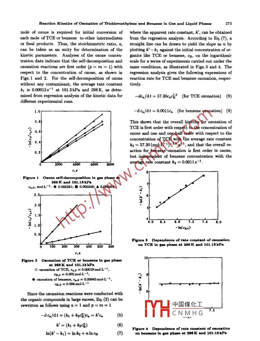 Chinese J. Ch. E. (Vol 8, No s)coefficient is independent of the gas velocities in each 4.3 Model estimationsriser and the liquid circulation speed. The regressivEstimation of the liquid circulation rate and gasvalue of the total frictional loss coefficient was 9.7 for hold-up on the basis of the gas fow rate and geome-the MT-ALR of D2 =9.0cm. a decrease in the di- try is of practical importance for operation and scaleameter of downcomer leads to an increase in the total up of ALR. here the liquid circulation rates obtainedfrictional loss coefficient, as shown in Table 1. More- at different gas aow rates and different diameters ofover, a minimum Et is obtained at A2/A1 =0.366, downcomer were calculated with Eq(16)using the avwhich may be due to the suitable distribution of gas erage frictional loss coefficients and the semi-empiricalmomentum in the liquidcorrelation[eq.(1))forgashold-up[8l.comparisonofthe calculating results and experimental data of liquidTable 1 Total frictional loss coeficients for differentdiameters of downcirculation velocity is shown in Fig. 6, in which a fairlygood agreement is obtained and the average error isD3,cm9.6% with the maximum of 30%. This demonstrates0.0123222±30the reliability of this model for estimation of the liquid0095213.3±4.0circulation speed in MT-ALR.6.8425970士230Figure 6 Comparison of calculating values of thediameters of downcomerFigure 4 Liquid circulation rate in downcomer (T2)as a function of gas flow rate of riser 1(T1)forNOMENCLATUREdifferent diameters of downcomer (T2)(v3=0.012m-1)A s cross-sectional area of tube i, m2model estimations;◇o△ experimental dataD2,cm:◇3.0;05.0;x7.0△90Ex energy input by gas, J-sEr energy dissipation,J-8-IEX mean kinetic energy, Jg-1coeleration due to gravity, m 8-2Ho liquid height without gaB,meQ volume flow rate,u velocity, ms-10.010.020.030.040.05中國煤化工CNMHG6 Total frictional loss coefFcient as a functionof gas fow rate of TI for different gas fow rates ofnumber of tube, il-4(1 and 3 are risers, while 2T3(D2=9.0cm)and 4 are downcomerst-.3,m-1:◇0;口0.012;△0.024X0.047Liquid Circulation in a Multi-tube Air-lift Loop Reactors gas liquid separatorSection )(in Chinese), 12, 73(1996)superficial6 Orazem, M.E., Fan, L. T, Erickson, L E, "Bubble flow inthe downflow section of an airlift tower", Biotechnol. Bio-z channeleng,21,1579(1979)7 Kawas, Y, Moo-Young, M ,"Mathematical model for tubulence", Chem. Eng J., 43, B19(1987).REFERENCES8 Liu,Y.M, Sun, G. D Yuan, N. J,"Experimental studyof gas holdup in a multi-tube airlift loop reactor", Chemical1 Chisti, M. P, Moo- Young, M, "Airlift reactor: charactreis-Engineering(in Chinese), 26(2), 23(1998)s and design considerations", Chem. Eng9 Joshi, J. B, Sharma. M. M., A circulation model for bu(1987)2 Bakker, w. A M, van Can, H J L, Tramper, J de gooible columns with Newtonian and non-NewtoniarTrans. Inst. Chem. Eng, 57, 244(1979)jer, C D, " Hydrodynamics and mixing in a multiple air-lift 10 Lehrer, I. H "Gas agitation of liquids", Ind. Eng. ChemProc.De.Dev,7,226(1986)3 Gasner, L. L,Development and application of the thin 11 Wallis, G.B., One Dimensional Two Phase Flow,McGraw.channel rectangular air lift mass transfer reactor to fermtation and waste-water treatment systems", Biotechonok. 12 Verlaan, P, Tramper J, Van't Riet K,"A hydroynamicBioeng,16,1】79(1974)model for an airlift loop bioreactor with externall loap4 Margaritis, A. Sheppard, J. D, "Mixing time and oxygenChem. Eng J, 38, B43(1986).transfer characteristics of a double draft tube fermentor", 13 Bello, R. A, Robinson, C. w, Moo-Young, M,"LiquidBiotechnol. Bioeng, 23, 2117(1981)circulation and Mixing characteristics of airlift contactor5 Liu, Y.M., Hu, H, Ding, F.x., Yuan, N. J,ExperimenCan. J. Chem. Eng, 62, 573(1984)14 Garcia Calvo, E,"A fluid dynamic model for airlift looploop reactor", Acta Petrolei Sinica(Petroleum Processingreactors",Chem. Eng. Sci, 44, 321(1989)中國煤化工CNMHGchin··J,Ch,E.8(8)267(2000)Chinese J of Chem. Eng, 8(3)272-275(2000)RESEARCHReaction Kinetics of Ozonation of Trichloroethylene andBenzene in Gas and Liquid PhasesZHONG Li(鐘理)College of Chemical Engineering, South China University of Technology, G510641, ChinaKuo Chiang-HaiDepartment of Chemical Engineering, Mississippi State Univeraity, MS 39762, USAAbstract The kinetics of ozonation reactions of trichloroethylene (TCe)and benzene in gas and liquid phases at101.3 kPa and 298 K was investigated in this paper. The ozonation of TCE is first order with respect to the ozone con-nd the TCE ozonation in aqueous medium is first order with reapect to both ozone and trichloroethylene with theaverage rate constant 6. 30(mol-L-)-l-s-I. The ozonation of benzene in the gas phase is first order in ozone butindependent of the benzene concentration with the average reaction rate constant 0.0011s-I. The overall kineticaof reaction between ozone and benzene in aqueous solution is found to be frat order with one-half order in bothbezene, with the averay2.67=-. It is found that the ozonation rate of pollutantsKeywor cker than that of self-decomposition of ozone in both gas and aqueous phase.1 INTRODUCTIONa syringe into the reactor to commence a kinetic exVolatile organic compounds such as trichloroethylene periment. Changes in the concentration(absorbance)(TCE)and benzene can escape readily into the am. of the limiting reactant, ozone, during the reactionbient air from waste treatment or industrial opera- were measured using an ozone monitor(PCI Modeltions because of relatively high vapor pressures. These HC-lP, high concentration ozone monitor with tem-ompounds can react with many oxidants in air to perature and pressure compensation). Details of thethe control of these volatile pollutants is important an early paper/ay dure and analyses are described inform secondary and tertiary pollutants[1, 2. Therefore, experimental procein both air and water pollution abatement. ThoughThe vapor phase ozonation of TcE or benzenet
