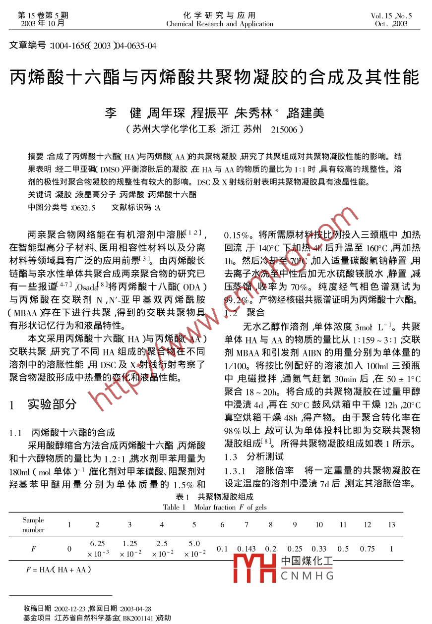 第15卷第5_期化學(xué)研究與應(yīng)用Vol.15 No.52003年10月Chemical Research and ApplicationOct. 2003文章編號:1004-1656( 2003 )04-0635-04丙烯酸十六酯與丙烯酸共聚物凝膠的合成及其性能.李健周年琛程振平朱秀林* 路建美(蘇州大學(xué)化學(xué)化工系浙江蘇州215006 )摘要:合成了丙烯酸十六酯( HA )嶼丙烯酸( AA )的共聚物凝膠研究了共聚組成對共聚物凝膠性能的影響。結(jié)果表明經(jīng)二甲亞砜(DMSO平衡溶脹后的凝膠在HA與AA的物質(zhì)的量比為1:1時具有較高的規(guī)整性。溶.劑的極性對聚合物凝膠的規(guī)整性有較大的影響。DSC及X射線衍射表明共聚物凝膠具有液晶性能。關(guān)鍵詞凝膠液晶高分子丙烯酸丙烯酸十六酯中圖分類號:0632.5文獻(xiàn)標(biāo)識碼A兩親聚合物網(wǎng)絡(luò)能在有機(jī)溶劑中溶脹12],0.15%。將所需原材料按比例投入三頸瓶中加熱在智能型高分子材料、醫(yī)用相容性材料以及分離回流于140°C 下加熱4h后升溫至160C再加熱材料等領(lǐng)域具有廣泛的應(yīng)用前景3]。由丙烯酸長1h。然后冷卻至70C加入適量碳酸氫鈉靜置,用鏈酯與親水性單體共聚合成兩親聚合物的研究已去離子水洗至中性后加無水硫酸鎂脫水靜置減有-些報道47],0sadd8]將丙烯酸十八酯(ODA)壓蒸餾,收率為70%。純度經(jīng)氣相色譜測試為與丙烯酸在交聯(lián)劑N,N'~亞甲基雙丙烯酰胺99.2%。產(chǎn)物經(jīng)核磁共振譜證明為丙烯酸十六酯。( MBAA )存在下進(jìn)行共聚,得到的交聯(lián)共聚物具1.2 聚合有形狀記憶行為和液晶特性。無水乙醇作溶劑,單體濃度3mot L-'。 共聚本文采用丙烯酸十六酯( HA )與丙烯酸( AA )單體HA與AA的物質(zhì)的量比從1:159~3:1,交聯(lián)交聯(lián)共聚研究了不同HA組成的聚合物在不同劑MBAA和引發(fā)劑AIBN的用量分別為單體量的溶劑中的溶脹性能用DSC及X_射線衍射考察了1/100。將按比例配好的溶液加入100ml三頸瓶聚合物凝膠形成中熱量的變化和液晶性能。中電磁攪拌,通氮?dú)廒s氧30min 后,在 50士1°C聚合18~ 20h。將合成的共聚物凝膠在過量甲醇1實(shí)驗(yàn)部分中浸漬4d ,再在50°C鼓風(fēng)烘箱中干燥12h ,20°C真空烘箱干燥48h得產(chǎn)物。由于聚合轉(zhuǎn)化率在1.1 丙烯酸十六酯的合成98%以上故可認(rèn)為單體投料比即為交聯(lián)共聚物采用酸醇縮合方法合成丙烯酸十六酯丙烯酸凝膠組成8。所得共聚物凝膠組成如表1所示。和十六醇物質(zhì)的量比為1.2:1 攜水劑甲苯用量為1.3分析測試180mt ( mol單體)-1催化劑對甲苯磺酸、阻聚劑對1.3.1溶脹倍率將一定重量的共聚物凝膠在羥基苯甲醚用量分別為單體質(zhì)量的1.5%和設(shè)定溫度的溶劑中浸漬7d后測定其溶脹倍率。表1共聚物凝膠組成Table 1 Molar fraction F of gelsSample4789l011213numberF6.251.252.55.00.1 0.143 0.20.25 0.330.50.75x10-3x10-2x10-2x10-2中國煤化工-F=HA( HA+ AA)MHCNMHG收稿日期2002-12-23 修回日期2003-04-28 .基金項(xiàng)目江蘇省自然科學(xué)基金( B2001141資助*通訊聯(lián)系人636化學(xué)研究與應(yīng)用第15卷溶脹凝膠重量_凝膠干重脹倍率隨F值的增加下降緩慢變化不大。溶脹倍率=凝膠干重1.3.2 DSC及XRD分析用美國TA instruments2.2共聚物凝膠的相變行為圖Xa)是F=0時聚合物凝膠(PAA)的DSC的DSC 2010進(jìn)行分析,試樣重0. 26mg ~ 0.30mg ,溫譜圖為一直線在升溫和降溫過程中不發(fā)生相升溫一降溫速率為 1°C min-' 氮?dú)饬魉?0mt變。圖Xb)是F=0.25的聚合物凝膠的DSC溫min-1 ,吸熱- -放熱量用Universal V2.6D TA譜圖,在升溫過程中,在31.18°C處有一吸熱峰,Instuments進(jìn)行處理計(jì)算?!鱄=3.201} g-1 轉(zhuǎn)換為HA則是△H= 7.99k}試樣經(jīng)特定溶劑充分溶脹后切片,用 X.射線(HA摩爾)-1 ;降溫過程中在23.88°C處有-放衍射儀(型號:D/Max-IIC ,日本理學(xué)電機(jī)株式會熱峰,OH=2.537j g-' ,轉(zhuǎn)換為HA則是△H =社Rigaku進(jìn)行分析,電壓40kV ,電流35mA掃描6.33kJ( HA摩爾)。與Osadd 11]所報道的丙烯速率3°C min-'。酸十八酯ODA和丙烯酸的共聚物凝膠的相變溫度相比要低16. 82°(升溫和19.129降溫》該2結(jié)果與討論聚合物凝膠的結(jié)構(gòu)具有較高規(guī)整性,在升溫過程中在31.18°C從液晶相向等方相轉(zhuǎn)變;降溫過程2.1共聚組成對凝膠溶脹倍率的影響中在23. 88C從等方相向液晶相轉(zhuǎn)變。圖2(c)聚丙烯酸(PAA)是高分子電解質(zhì)凝膠,在結(jié).圖x d和圖x e分別是F=0.33、F=0.5和F=構(gòu)中引入疏水鏈段丙烯酸十六酯形成具有兩親結(jié)0.75的聚合物凝膠的DSC溫譜圖,在升溫過程構(gòu)的聚合物網(wǎng)絡(luò)具有既能在水中溶脹又能在有中分別在35. 10°C、36.41°C和36.529C處有- -吸熱峰,吸熱量分別為△H= 12.54J+ g-!、 △H =36.87J g-和△H=50.03.F g-1 ,轉(zhuǎn)換為HA則是△H= 15.64kJ ( HA摩爾)1、△H = 25.62kJ ( HA .G2摩爾) l和17 .52kJ( HA摩爾)-1降溫過程中分別在28. 51°C、30.73°C和30. 87°C處各有一放熱峰吸熱量分別為△H=9.358J g-!、 △H= 39.59}g-1 ,轉(zhuǎn)換為HA則是△H= 11.67kJ. (HA摩爾)、27.76k} (HA摩爾) !和15.04k.} (HA摩爾)-1表明這三組聚合物凝膠都有-定的規(guī)整圖1共聚物凝膠在 DMSO中的溶脹性能性。圖Xf)是F=1的聚合物PHA )凝膠在升溫Fig. 1 Dependence of degree of swelling in DMSO on F ofpol( HA-co-AA )gels過程中,在36.71°C處有一吸熱峰,△H = 59.30F機(jī)溶劑中溶脹的獨(dú)特性能。這種溶脹性能與共聚g1轉(zhuǎn)換為HA則是OH=23.78kJ.(HA摩物中丙烯酸十六酯所占的比例( F值)有很大關(guān)爾)-1 ;降溫過