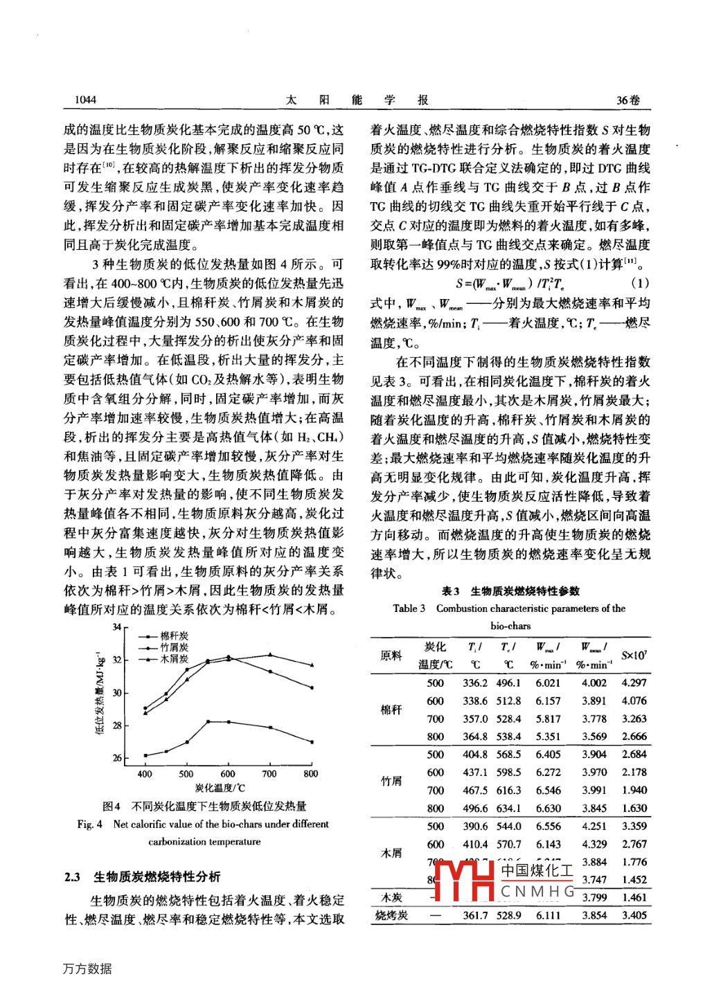 第36卷第5期太陽(yáng)能學(xué)報(bào)Vol 36, No 5015年5月ACTA ENERGIAE SOLARIS SINICAMay,2015文章編號(hào):02540096(2015)05104107生物質(zhì)制備燃料炭實(shí)驗(yàn)研究熊紹武,張守玉,吳巧美,郭熙,董愛霞,陳川上海理工大學(xué)能源與動(dòng)力工程學(xué)院熱能工程研究所,上海20093)摘要:利用管式固定床炭化裝置對(duì)棉稈、木屑和竹屑進(jìn)行炭化實(shí)驗(yàn),利用工業(yè)分析儀、快速量熱儀和熱重分析儀對(duì)炭化實(shí)驗(yàn)制得的生物質(zhì)炭進(jìn)行分析,用木炭和燒烤炭質(zhì)量指標(biāo)評(píng)價(jià)生物質(zhì)炭質(zhì)量,用著火溫度、燃盡溫度和綜合燃燒特性指數(shù)S評(píng)價(jià)生物質(zhì)炭燃燒特性。結(jié)果表明隨著炭化溫度的升高,生物質(zhì)炭產(chǎn)率和干基揮發(fā)分產(chǎn)率減小干基固定碳產(chǎn)率增大,相應(yīng)的變化速率減小;著火溫度和燃盡溫度隨著炭化溫度的升高而升高,S值減小;相比木屑炭和竹屑炭,棉稈炭的燃燒特性最好。對(duì)比生物質(zhì)炭與木炭和燒烤炭的燃燒特性和炭質(zhì)量發(fā)現(xiàn),木屑和竹屑可用于生產(chǎn)木炭替代品,棉稈可用于制作燒烤炭,500℃為棉稈制備燒烤炭的最佳炭化溫度。關(guān)鍵詞:生物質(zhì);炭化;生物質(zhì)炭;燃燒特性;燒烤炭中圖分類號(hào):TK6文獻(xiàn)標(biāo)識(shí)碼:A本文在上述研究的基礎(chǔ)上,利用固定床炭化裝0引言置進(jìn)行生物質(zhì)的炭化實(shí)驗(yàn)研究,考察溫度對(duì)生物質(zhì)生物質(zhì)炭化技術(shù)將生物質(zhì)在隔絕空氣的環(huán)境炭產(chǎn)率及炭的組成成分和燃燒特性的影響。通過中加熱,析出揮發(fā)分,生成生物質(zhì)炭生物油和生物與傳統(tǒng)木炭和燒烤炭對(duì)比研究可替代傳統(tǒng)木炭和質(zhì)氣等產(chǎn)物,具有很高的經(jīng)濟(jì)和生態(tài)效益。生物燒烤炭的生物質(zhì)炭的最佳制備溫度。質(zhì)炭化工藝從傳統(tǒng)的窯式炭化已發(fā)展出很多種炭化工藝,如回轉(zhuǎn)窯內(nèi)熱式炭化工藝兩步式炭化工1實(shí)驗(yàn)藝以及多聯(lián)產(chǎn)炭化工藝等24。國(guó)內(nèi)外學(xué)者對(duì)生物1.1原料質(zhì)炭化進(jìn)行了大量理論和實(shí)驗(yàn)研究”。研究表明,隨著炭化溫度的升高,炭產(chǎn)率減小,氣體產(chǎn)率增加實(shí)驗(yàn)選用棉稈、木屑和竹屑,其工業(yè)分析和元生物質(zhì)油產(chǎn)率先增大后減小;較大的升溫速率有利素分析如表1所示。所有原料均在105℃下干燥于增大氣體產(chǎn)率;停留時(shí)間越長(zhǎng)固體炭產(chǎn)率越小,6h后用破碎機(jī)破碎,過篩(16目,小于1m,以用氣體產(chǎn)率越大;催化劑和真空有利于提高油產(chǎn)率。于后續(xù)炭化實(shí)驗(yàn)。表1原料樣品的工業(yè)分析和元素分析Table 1 Proximate and ultimate analysis of the samples工業(yè)分析/%,ad元素分析%,ad樣品低位發(fā)熱量MJkg',ad水分灰分揮發(fā)分固定碳C][H][oa[N][s棉稈4.253.7872.11198647563.1839970.860.40木屑2131.6480.6715.5653.60278388619.8竹屑2852016.1448.513.3542.200.750.2818.4412干餾炭化實(shí)驗(yàn)溫控裝置、加熱爐和供氣控制裝置3部分組成,如本文使用自制的干餾炭化裝置,該裝置主要由圖1所示。炭化實(shí)驗(yàn)開始前,首先將物料在105℃中國(guó)煤化工收稿日期:2013-0403CNMHG基金項(xiàng)目:上海市研究生創(chuàng)新基金( JWCXSL1202)通信作者:張守玉(I9Ⅰ—),男,博土、教授、碩土生導(dǎo)師,主要從事低階煤(褐煤、髙鈉煤等)提質(zhì),煤炭熱解、氣化、燃燒,生物質(zhì)能源化轉(zhuǎn)化利用方面的研究。 zhangsy-guc@163c0m1042太陽(yáng)能學(xué)報(bào)36卷恒溫干燥2h,然后用電子天平稱取40g加入石英成,其炭化過程可分為:失水干燥、預(yù)熱、快速熱解管。連接好氣體管路后通入N流量為200mL/min),和炭化4個(gè)階段。第1個(gè)階段為室溫-120℃,該30min后,在保證出氣無氧情況下開始炭化實(shí)驗(yàn)°階段中,樣品持續(xù)升溫,失去水分,質(zhì)量略有下降;實(shí)驗(yàn)中升溫速率為10℃/min,升至設(shè)定溫度后,恒溫30min,然后在N保護(hù)下降至室溫。炭化完成后第2階段為120~230℃時(shí),該階段質(zhì)量變化很小,生稱量炭粉質(zhì)量計(jì)算各溫度下的炭產(chǎn)率。所制得的物質(zhì)組分開始軟化,為熱解作準(zhǔn)備;第3階段為生物質(zhì)炭在經(jīng)研磨后過篩(150目,小于01mm),230-400℃時(shí),是失重的主要階段析出大量揮發(fā)用于后續(xù)分析實(shí)驗(yàn)。分,失重率達(dá)60%;第4階段為大于400℃溫度段,該階段殘留物緩慢分解,C-H和C—O鍵斷裂,形成富碳的固體殘?jiān)?。為研究生物質(zhì)炭化制備生物質(zhì)炭,本文選取400-800℃進(jìn)行炭化實(shí)驗(yàn),實(shí)驗(yàn)結(jié)果見圖2棉稈木屑1.氣瓶2.減壓閥3.轉(zhuǎn)子流量計(jì)4.石英管物料6.管式爐7.熱電偶8.溫控儀圖1炭化實(shí)驗(yàn)裝置圖Fig. 1 Schematic diagram of the carbonization experimentalapparatus600炭化溫度/℃13工業(yè)分析實(shí)驗(yàn)圖2不同炭化溫度下生物質(zhì)炭干基產(chǎn)率使用長(zhǎng)沙開元儀器有限公司生產(chǎn)的5EMACⅢFig. 2 Bio-char yield on dry basis of the samples under紅外快速分析儀對(duì)生物質(zhì)炭粉進(jìn)行工業(yè)分析,實(shí)驗(yàn)樣different carbonization temperature品為炭化實(shí)驗(yàn)制得的生物質(zhì)炭粉(粒徑小于01mm),每次用料1g,進(jìn)行重復(fù)實(s