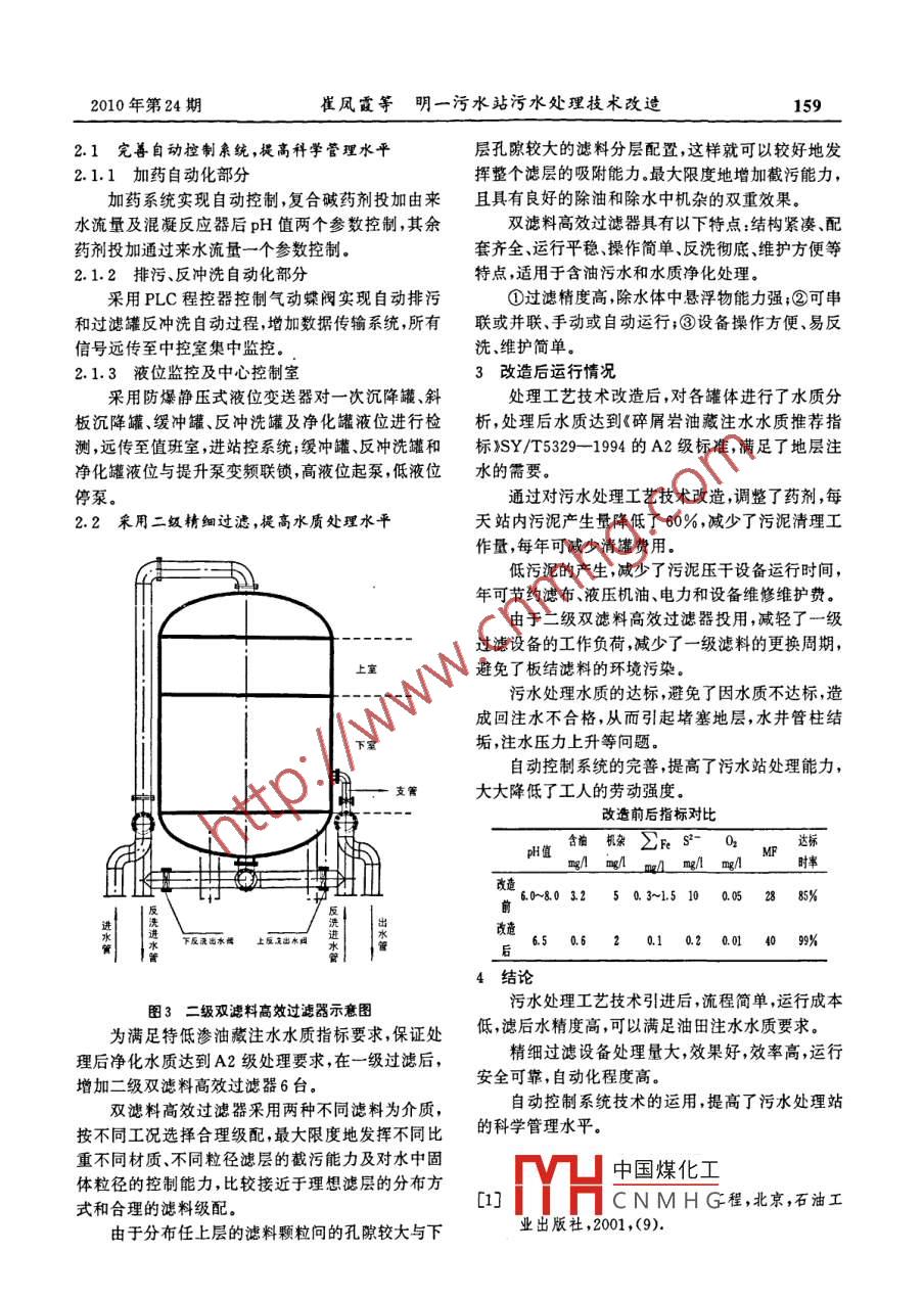 158內(nèi)蒙古石油化工2010年第24期明一污水站污水處理技術(shù)改造崔鳳霞,呂秀生,張紀(jì)東,李菊兵,何修勝(中原油田分公司采油三廠勘探處,山東莘縣252434)摘要:明一污水處理站投產(chǎn)早,處理工藝存在著設(shè)備老化嚴重、 自動化水平低、污泥處理難度大、藥劑投加成本高,污泥量大、過濾流程不精細等弊端,針對現(xiàn)場的生產(chǎn)實際情況,工作人員對明一污水處理系統(tǒng)及工藝流程進行了改造,改遭后處理水質(zhì)指標(biāo)滿足了地層注水的需要。.關(guān)鍵詞:污水站;污水處理;技術(shù)改造中圖分類號:X741.031文獻標(biāo)識碼:A文 章編號:1006- -7981 (2010)24-0158- -02明一污水處理站投產(chǎn)早,處理工藝存在著設(shè)備污水站加藥、排污、反沖洗罐位監(jiān)控、流量監(jiān)控老化嚴重、自動化水平低、污泥處理難度大(污油污及污水自動提升等環(huán)節(jié)均未實現(xiàn)自動控制。所有的染濾布)、藥劑投加成本高,污泥量大(大量污泥的產(chǎn)罐位控制、排污.反沖洗、加藥等均使用人工操作,設(shè)生,增加了排污工作的難度)、過濾流程不精細(機械定2小時巡視一-次并采取措施。調(diào)節(jié)滯后,容易造成雜質(zhì)得不到有效降低)等弊端,凈化水質(zhì)最好僅能達水質(zhì)的波動。現(xiàn)有的人工調(diào)節(jié)方式,無法滿足污水站到B2級,不能滿足衛(wèi)城及古云油田注水水質(zhì)要求,保持水質(zhì)平穩(wěn)達標(biāo)的要求。增加了油水井的維護成本,給油田的穩(wěn)產(chǎn)基礎(chǔ)造成1.3 過濾設(shè)備不精細,懸浮物含量偏高了一定影響。針對現(xiàn)場的生產(chǎn)實際情況,工作人員對以石英砂過濾罐為主要過濾設(shè)備的含油污水處明一污水處理系統(tǒng)及工藝流程進行了改造,改造后理設(shè)備,處理后的水質(zhì)不穩(wěn)定,達不到油田回注水質(zhì)處理水質(zhì)指標(biāo)滿足了地層注水的需要。標(biāo)準(zhǔn)要求;反沖洗時,濾料流失嚴重,系統(tǒng)效率低;濾1改造前污水處理工藝流程罐性能單一,濾料易板結(jié),且更換出的石英砂濾料難處理,污染環(huán)境。1.4 反洗流程不完善,無反洗罐明一污水站8座濾罐每次反洗水量在500m'左右,但站內(nèi)無反洗儲水罐,反洗時直接從注水罐吸水,造成注水罐液位大幅度下降,直接影響注水安全性2改造后污水處理工藝流程提升素圖1改造前的明- -污水處理工藝流程示意圖改造前污水處理工藝流程存在的主要問題如下:,三次沉降罐1.1 加藥系統(tǒng)不完善,無法實現(xiàn)準(zhǔn)確加藥站內(nèi)混凝反應(yīng)器是廢棄濾罐改造而成,反應(yīng)時間不到2分鐘,反應(yīng)器體積無法滿足加藥混合要求;站內(nèi)無加藥自控系統(tǒng),現(xiàn)階段加藥過程主要靠手動提升量本化園調(diào)節(jié),無法實現(xiàn)準(zhǔn)確加藥;加藥泵運行年限超過10年,腐蝕損壞嚴重;連續(xù)投加的藥劑無備用泵,無法醫(yī)選本耀反洗水罐停產(chǎn)檢修。1.2 自動化程度低,水質(zhì)波動大中國煤化工藝流程示意圖MYHCNMHG收稿日期:2010-09-08作者簡介:崔鳳霞(1974-),女,1991年參加工作,從事油田污水處理工作。2010年第24期崔鳳霞等明一污水 站污水處理技術(shù)改造1592.1 完善自動控制系統(tǒng),提高科學(xué)管理水平:層孔隙較大的濾料分層配置,這樣就可以較好地發(fā)2.1.1加藥 自動化部分揮整個濾層的吸附能力。最大限度地增加截污能力,加藥系統(tǒng)實現(xiàn)自動控制,復(fù)合堿藥劑投加由來且具有良好的除油和除水中機雜的雙重效果。水流量及混凝反應(yīng)器后pH值兩個參數(shù)控制,其余.雙濾料高效過濾器具有以下特點:結(jié)構(gòu)緊湊、配藥劑投加通過來水流量- -個參數(shù)控制.套齊全運行平穩(wěn)操作簡單、反洗徹底、維護方便等2.1.2排污、反沖洗 自動化部分特點,適用于含油污水和水質(zhì)凈化處理。采用PLC程控器控制氣動蝶閥實現(xiàn)自動排污①過濾精度高,除水體中懸浮物能力強;②可串和過濾罐反沖洗自動過程,增加數(shù)據(jù)傳輸系統(tǒng),所有聯(lián)或并聯(lián)、手動或自動運行;③設(shè)備操作方便、易反信號遠傳至中控室集中監(jiān)控。洗、維護簡單。2.1.3液位 監(jiān)控及中心控制室3改造后運行情況采用防爆靜壓式液位變送器對-一次沉降罐、斜.處理工藝技術(shù)改造后,對各罐體進行了水質(zhì)分板沉降罐、緩沖罐、反沖洗罐及凈化罐液位進行檢析,處理后水質(zhì)達到《碎屑巖油藏注水水質(zhì)推薦指測,遠傳至值班室,進站控系統(tǒng);緩沖罐、反沖洗罐和標(biāo))SY/T5329- -1994的A2級標(biāo)準(zhǔn),滿足了地層注凈化罐液位與提升泵變頻聯(lián)鎖,高液位起泵,低液位水的需要。停泵。通過對污水處理工藝技術(shù)改造,調(diào)整了藥劑,每2.2采用二級精 細過濾,提高水質(zhì)處理水平天站內(nèi)污泥產(chǎn)生量降低了60% ,減少了污泥清理工作量,每年可減少清罐費用。低污泥的產(chǎn)生,減少了污泥壓干設(shè)備運行時間,年可節(jié)約濾布、液壓機油、電力和設(shè)備維修維護費。由于二級雙濾料高效過濾器投用,減輕了一級過濾設(shè)備的工作負荷,減少了一級濾料的更換周期,上室避免了板結(jié)濾料的環(huán)境污染。污水處理水質(zhì)的達標(biāo),避免了因水質(zhì)不達標(biāo),造成回注水不合格,從而引起堵塞地層,水井管柱結(jié)下室