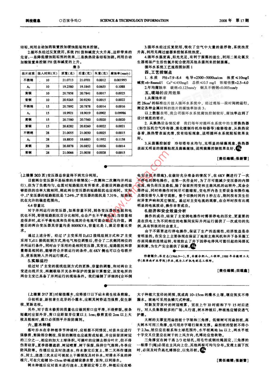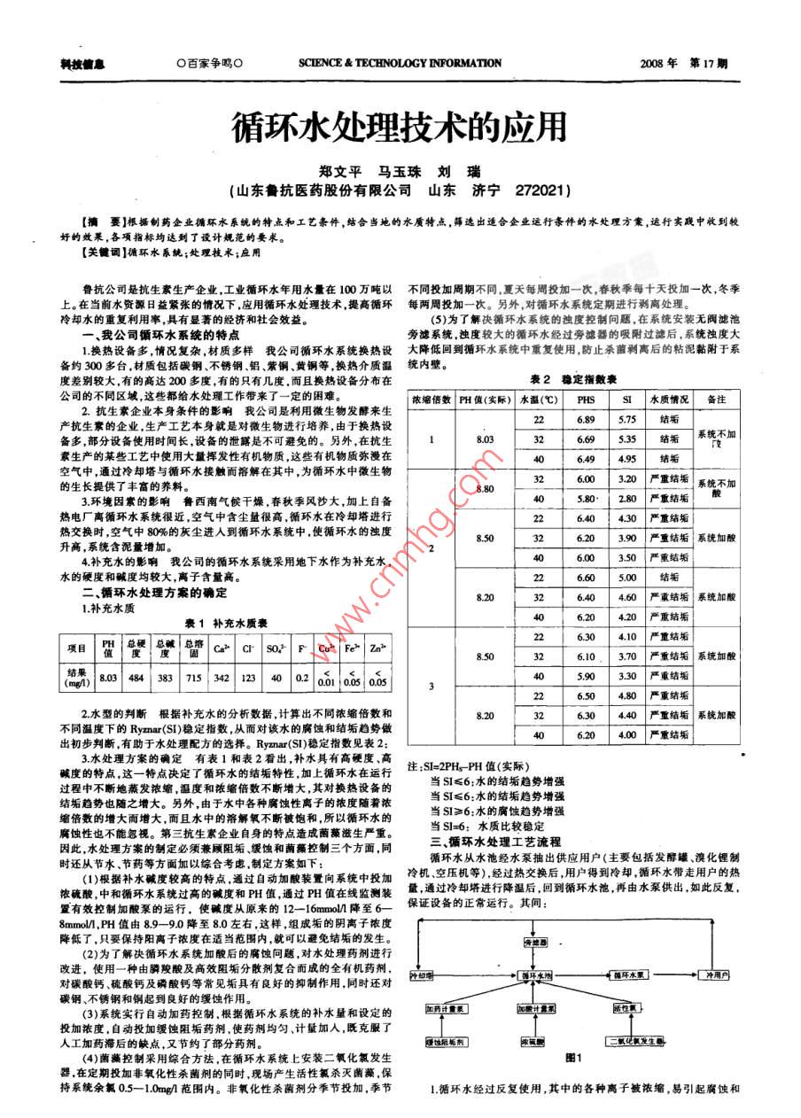 利信息O百家爭(zhēng)鷗OSCIENCE TECHNOLOGY INFORMATION2008年第17期循環(huán)水處理技術(shù)的應(yīng)用鄭文平馬玉珠劉瑞(山東魯抗醫(yī)藥股份有限公司山東濟(jì)寧272021)【擴(kuò)要】根攝制藥企業(yè)循環(huán)水系統(tǒng)的特點(diǎn)和工藝條件,結(jié)合當(dāng)?shù)氐乃攸c(diǎn),篩選出選合企業(yè)運(yùn)行條件蚋水處理方案,運(yùn)行實(shí)譏中收到較妤的效果,各項(xiàng)指標(biāo)均達(dá)到了設(shè)計(jì)規(guī)范的要求【關(guān)鬟詞】循環(huán)水系純;處理枝術(shù);應(yīng)用魯抗公司是抗生素生產(chǎn)企業(yè),工業(yè)循環(huán)水年用水量在100萬(wàn)噸以不同投加周期不同,夏天每周投加一次,春秋季每十天投加一次,冬季上。在當(dāng)前水資源日益緊張的情況下,應(yīng)用循環(huán)水處理技術(shù)提高循環(huán)每?jī)芍芡都右淮?。另外?duì)循環(huán)水系統(tǒng)定期進(jìn)行剝離處理。冷卻水的重復(fù)利用率,具有顯著的經(jīng)濟(jì)和社會(huì)效益(5)為了解決循環(huán)水系統(tǒng)的濁度控制問(wèn)題,在系統(tǒng)安裝無(wú)閥濾池一、我公司循環(huán)水系統(tǒng)的特點(diǎn)旁濾系統(tǒng)濁度較大的循環(huán)水經(jīng)過(guò)旁濾器的吸附過(guò)濾后,系統(tǒng)濁度大換熱設(shè)備多,情況復(fù)雜,材質(zhì)多樣我公司循環(huán)水系統(tǒng)換熱設(shè)大降低回到循環(huán)水系統(tǒng)中重復(fù)使用防止殺菌剝離后的粘泥黏附于系備約300多臺(tái),材質(zhì)包括碳鋼不銹鋼鋁紫銅、黃銅等換熱介質(zhì)溫統(tǒng)內(nèi)壁。度差別較大,有的高達(dá)200多度,有的只有幾度,而且換熱設(shè)備分布在表2穩(wěn)定指數(shù)公司的不同區(qū)域,這些都給水處理工作帶來(lái)了一定的困難。濃縮倍數(shù)FH值(實(shí)際)水溫(℃)PHs水質(zhì)情況備注2.抗生素企業(yè)本身?xiàng)l件的影響我公司是利用微生物發(fā)酵來(lái)生產(chǎn)抗生素的企業(yè),生產(chǎn)工藝本身就是對(duì)微生物進(jìn)行培養(yǎng),由于換熱設(shè)備多部分設(shè)備使用時(shí)間長(zhǎng)設(shè)備的泄露是不可避免的。另外在抗生169535結(jié)垢系統(tǒng)不加素生產(chǎn)的某些工藝中使用大量揮發(fā)性有機(jī)物質(zhì)這些有機(jī)物質(zhì)彌漫在49495結(jié)垢空氣中,通過(guò)冷卻塔與循環(huán)水接觸而溶解在其中,為循環(huán)水中微生物6.00的生長(zhǎng)提供了豐富的養(yǎng)料20嚴(yán)重結(jié)垢系統(tǒng)不加3環(huán)境因素的影響魯西南氣候干燥,春秋季風(fēng)沙大,加上自備28熱電廠離循環(huán)水系統(tǒng)很近,空氣中含塵量很高,循環(huán)水在冷卻塔進(jìn)行640430嚴(yán)重結(jié)垢熱交換時(shí),空氣中80%的灰塵進(jìn)入到循環(huán)水系統(tǒng)中,使循環(huán)水的濁度升高,系統(tǒng)含泥量增加620390嚴(yán)重結(jié)垢系統(tǒng)加酸4補(bǔ)充水的影響我公司的循環(huán)水系統(tǒng)采用地下水作為補(bǔ)充水50嚴(yán)重結(jié)垢水的硬度和堿度均較大,離子含量高226605.00二、循環(huán)水處理方案的確定640460嚴(yán)重結(jié)垢系統(tǒng)加酸1補(bǔ)充水質(zhì)衰1補(bǔ)充水質(zhì)衰420嚴(yán)重結(jié)垢ca" Cr So/ F Cu?Fe Zo326.10.370嚴(yán)重結(jié)垢系統(tǒng)加酸(嗎)/80344383n5342|1234002on0s003重結(jié)垢重結(jié)垢2水型的判斷根據(jù)補(bǔ)充水的分析數(shù)據(jù),計(jì)算出不同濃縮倍數(shù)和630440嚴(yán)重結(jié)垢系統(tǒng)加酸不同溫度下的 Ryna(SI)穩(wěn)定指數(shù),從而對(duì)該水的腐蝕和結(jié)垢趨勢(shì)做出初步判斷有助于水處理配方的選擇。 Ryznar(S)穩(wěn)定指數(shù)見表2:620400嚴(yán)重結(jié)垢3水處理方案的確定有表1和表2看出,補(bǔ)水具有高硬度、高堿度的特點(diǎn)這一特點(diǎn)決定了循環(huán)水的結(jié)垢特性加上循環(huán)水在運(yùn)行注:S=2PH-PH值(實(shí)際)過(guò)程中不斷地燕發(fā)濃縮,溫度和濃縮倍數(shù)不斷增大,其對(duì)換熱設(shè)備的當(dāng)S≤6:水的結(jié)垢趨勢(shì)增強(qiáng)結(jié)垢趨勢(shì)也隨之增大。另外,由于水中各種腐蝕性離子的濃度隨著濃當(dāng)SI≤6:水的結(jié)垢趨勢(shì)增強(qiáng)縮倍數(shù)的增大而增大,而且水中的溶解氧不斷被飽和,所以循環(huán)水的當(dāng)Sl≥6:水的腐蝕趨勢(shì)增強(qiáng)腐蝕性也不能忽視。第三抗生素企業(yè)自身的特點(diǎn)造成蘸藻滋生嚴(yán)重。當(dāng)Sl6:水質(zhì)比較穩(wěn)定因此水處理方案的制定必須兼顧阻垢緩蝕和菌藻控制三個(gè)方面,同三、循環(huán)水處理工藝流程時(shí)還從節(jié)水、節(jié)藥等方面加以綜合考慮制定方案如下循環(huán)水從水池經(jīng)水泵抽出供應(yīng)用戶(主要包括發(fā)酵罐、溴化鋰制(1)根據(jù)補(bǔ)水堿度較高的特點(diǎn)通過(guò)自動(dòng)加酸裝置向系統(tǒng)中投加冷機(jī)、空壓機(jī)等),經(jīng)過(guò)熱交換后用戶得到冷卻循環(huán)水帶走用戶的熱置有效控制加酸的運(yùn)行,使堿度從原來(lái)的12-16mM降至6-保證設(shè)備的正常運(yùn)行。其間:8mmM,PH值由8990降至80左右,這樣,組成垢的陰離子濃度降低了,只要保持陽(yáng)離子濃度在適當(dāng)范圍內(nèi),就可以避免結(jié)垢的發(fā)生(2)為了解決循環(huán)水系統(tǒng)加酸后的腐蝕問(wèn)題,對(duì)水處理藥劑進(jìn)行改進(jìn),使用一種由膦羧酸及高效阻垢