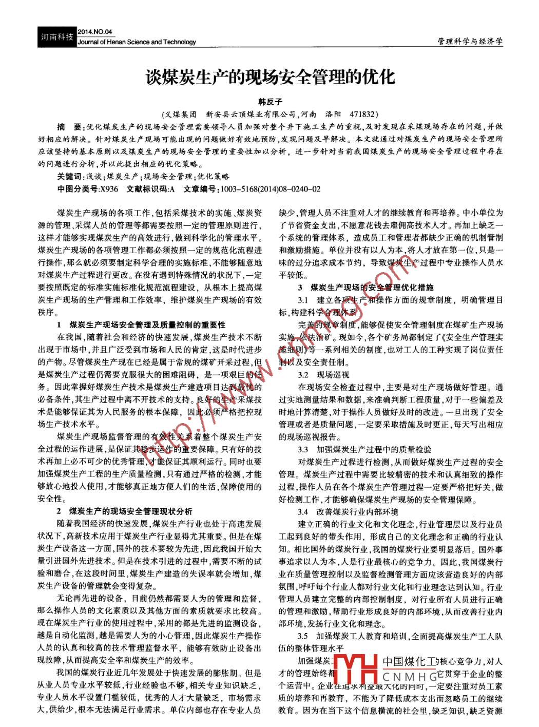 河南科技2014.NO.04Journal of Henan Science and Technology管理科學與經(jīng)濟學談煤炭生產(chǎn)的現(xiàn)場安全管理的優(yōu)化韓反子(義煤集團新安縣云頂煤業(yè)有限公司,河南摘要:優(yōu)化煤炭生產(chǎn)的現(xiàn)場安全管理需要領導人員加強對整個井下施工生產(chǎn)的重視,及時發(fā)現(xiàn)在采煤現(xiàn)場存在的問題,并做好相應的解決。針對煤炭生產(chǎn)現(xiàn)場可能出現(xiàn)的問題做好有效地預防,發(fā)現(xiàn)問題及早解決。本文就通過對煤炭生產(chǎn)的現(xiàn)場安全管理所應該堅持的基本原則以及煤炭生產(chǎn)的現(xiàn)場安全管理的重要性加以分析,進一步針對當前我國煤炭生產(chǎn)的現(xiàn)場安全管理過程中存在的問題進行分析,并以此提出相應的優(yōu)化策略。關鍵詞:淺談;煤炭生產(chǎn);現(xiàn)場安全管理;優(yōu)化策略中圖分類號:X936文獻標識碼:A 文章編 號:1003- -5168(2014)08- -0240-02煤炭生產(chǎn)現(xiàn)場的各項工作,包括采煤技術的實施、煤炭資缺少 ,管理人員不注重對人才的繼續(xù)教育和再培養(yǎng)。中小單位為源的管理、采煤人員的管理等都需要按照一定的管理原則進行,了節(jié)省資金支出,不愿意花錢去雇傭高技術人才。再加上缺乏- -這樣才能夠實現(xiàn)煤炭生產(chǎn)的高效進行,做到科學化的管理水平。個系統(tǒng)的管理體系,造成員工和管理者都缺少正確的機制管制煤炭生產(chǎn)現(xiàn)場的各項管理工作都必須按照--定的規(guī)范化流程進和激勵措施。單位并沒有以人為本,將人才放在第一位,只是一行操作,那么就必須要制定科學合理的實施標準,不能夠隨意地味的過分追求成本節(jié)約,導致煤炭生產(chǎn)過程中專業(yè)操作人員水對煤炭生產(chǎn)過程進行更改。在沒有遇到特殊情況的狀況下,一定平較低。要按照既定的標準實施標準化規(guī)范流程建設,從根本上提高煤3煤炭生產(chǎn)現(xiàn)場的安全管理優(yōu)化措施炭生產(chǎn)現(xiàn)場的生產(chǎn)管理和工作效率,維護煤炭生產(chǎn)現(xiàn)場的有效3.1建立各項生產(chǎn) 和操作方面的規(guī)章制度,明確管理目標,構建科學合理體系1煤炭生產(chǎn)現(xiàn)場安全管理及質 控制的重要性完善的規(guī)章制度,能夠促使安全管理制度在煤礦生產(chǎn)現(xiàn)場在我國,隨著社會和經(jīng)濟的快速發(fā)展,煤炭生產(chǎn)技術不斷實施,依法治礦?,F(xiàn)如今,各個礦務局都制定了《安全生產(chǎn)管理實出現(xiàn)于市場中,并且廣泛受到市場和人民的肯定,這是時代進步施細則》等- - 系列相關的制度,也對工人的工種實現(xiàn)了崗位責任的產(chǎn)物。盡管煤炭生產(chǎn)現(xiàn)在已經(jīng)是屬于常規(guī)的煤礦開采過程,但制以及安全責任制。是煤炭生產(chǎn)過程仍需要克服很大的困難阻礙,是- -項艱巨的任3.2 現(xiàn)場巡視務。因此掌握好煤炭生產(chǎn)技術是煤炭生產(chǎn)建造項目達到最優(yōu)的在現(xiàn)場安全檢查過程中,主要是對生產(chǎn)現(xiàn)場做好管理。通必備條件,其生產(chǎn)過程中離不開技術的支持。良好的生產(chǎn)采煤技過實地測量結果和數(shù)據(jù),來準確判斷工程質量,對于一些偏差及術是能夠保證其為人民服務的根本保障,因此必須嚴格把控現(xiàn)時 地計算清楚,對于操作人員做好及時的改進。-旦出現(xiàn)了安全場生產(chǎn)技術水平。管理或者是質量問題,一定要采取措施及時更正,每天寫出相應煤炭生產(chǎn)現(xiàn)場監(jiān)督管理的有效性關系著整個煤炭生產(chǎn)安的現(xiàn)場巡視報告。全過程的運作進展,是保證其穩(wěn)步運作的重要保障。只有好的技3.3加強煤炭生產(chǎn)過程 中的質量檢驗術再加上:必不可少的優(yōu)秀管理,才能保證其順利運行。同時也要對煤炭生產(chǎn)過程進行檢測,從而做好煤炭生產(chǎn)過程的安全加強煤炭生產(chǎn)工程的生產(chǎn)質量檢測,只有通過嚴格的檢測,才能管理。 煤炭生產(chǎn)過程中需要比較精密的技術和認真細致的操作夠放心地投人使用,才能夠真正地方便人們的生活,保障使用的過程,操作人員在各個煤炭生產(chǎn)管理過程- -定要嚴格把好關, 做安全性。好檢測工作,才能夠確保煤炭生產(chǎn)現(xiàn)場的安全管理保障。2煤炭生產(chǎn)的現(xiàn)場安全 管理現(xiàn)狀分析3.4改善煤炭行業(yè) 內(nèi)部環(huán)境隨著我國經(jīng)濟的快速發(fā)展,煤炭生產(chǎn)行業(yè)也處于高速發(fā)展建立正確的行業(yè)文化和文化理念,行業(yè)管理層以及行業(yè)員狀況下,高新技術應用于煤炭生產(chǎn)行業(yè)顯得尤其重要。但是在煤工起到良好的帶 頭作用,形成自己的文化理念和正確的行業(yè)認炭生產(chǎn)設備這-方面,國外的技術要較為先進,因此我國開始大知。相比國外的煤炭行業(yè),我國的煤炭行業(yè)要明顯落后。國外事量引進國外先進技術。但是在技術引進的過程中,需要不斷的試事追求以人為本 ,人是行業(yè)最核心的競爭力。因此,我國煤炭行驗和磨合,在這段時間里,煤炭生產(chǎn)建造的失誤率就會增加,煤業(yè)在質量管理控制以及監(jiān)督檢測管理方面應該營造良好的內(nèi)部炭生產(chǎn)設備的管理就會變得復雜。氛圍,呼吁每個行業(yè)人都對行業(yè)文化和行業(yè)理念達到認知。行業(yè)無論再先進的設備,目前仍然都需要人為的