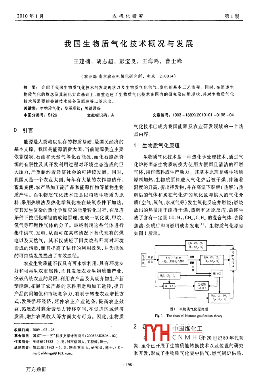 2010年1月農(nóng)機(jī)化研究第1期我國(guó)生物質(zhì)氣化技術(shù)概況與發(fā)展王建楠,胡志超,彭寶良,王海鷗,曹士峰(農(nóng)業(yè)部南京農(nóng)業(yè)機(jī)械化研究所,南京210014)摘要:介紹了我國(guó)生物質(zhì)氣化技術(shù)的發(fā)展現(xiàn)狀以及生物質(zhì)氣化供氣、發(fā)電的基本工藝流程。同時(shí),在簡(jiǎn)述生物質(zhì)氣化的概念及其轉(zhuǎn)化方式基礎(chǔ)上,著重論述了生物質(zhì)氣化技術(shù)在國(guó)內(nèi)的研究及應(yīng)用現(xiàn)狀,并對(duì)生物質(zhì)氣化技術(shù)所需要的關(guān)鍵技術(shù)裝備及原理等以圖示出。關(guān)鍵詞:生物質(zhì)氣化;發(fā)展現(xiàn)狀;關(guān)鍵設(shè)備中圖分類號(hào):S126文獻(xiàn)標(biāo)識(shí)碼:A文章編號(hào):1003-188X(2010)01-0198-040引言氣化技術(shù)已成為我國(guó)能源及農(nóng)業(yè)研發(fā)領(lǐng)域的一個(gè)熱點(diǎn)內(nèi)容能源是人類賴以生存的物質(zhì)基礎(chǔ),是國(guó)民經(jīng)濟(jì)的基本支撐。我國(guó)是能源消費(fèi)大國(guó),當(dāng)前能源供應(yīng)主要1生物質(zhì)氣化原理依靠煤炭、石油和天然氣等化石能源,而化石能源資生物質(zhì)氣化技術(shù)是一種熱化學(xué)處理技術(shù),通過氣源的有限性及其開發(fā)利用過程對(duì)環(huán)境生態(tài)造成的巨化爐將固態(tài)生物質(zhì)轉(zhuǎn)換為使用方便而且清潔的可燃大壓力,嚴(yán)重制約著經(jīng)濟(jì)社會(huì)的可持續(xù)發(fā)展。同時(shí),氣體,用作燃料或生產(chǎn)動(dòng)力。其基本原理是將生物質(zhì)我國(guó)又是一個(gè)農(nóng)業(yè)大國(guó),每年有大量的農(nóng)作物秸稈、原料加熱,生物質(zhì)原料進(jìn)入氣化爐后被干燥,伴隨著畜禽糞便、農(nóng)產(chǎn)品加工副產(chǎn)品和能源作物等植物生物溫度的升高,析出揮發(fā)物,并在高溫下裂解(熱解);熱質(zhì)產(chǎn)生。而生物質(zhì)氣化技術(shù)正是以植物生物質(zhì)為原解后的氣體和炭在氣化爐的氧化區(qū)與供入的氣化介料,采用熱解法及熱化學(xué)氧化法在缺氧條件下加熱,質(zhì)(空氣、氧氣、水蒸氣等)發(fā)生氧化反應(yīng)并燃燒;燃燒使其發(fā)生復(fù)雜的熱化學(xué)反應(yīng)的能量轉(zhuǎn)化過程,在反應(yīng)放出的熱量用于維持干燥、熱解和還原反應(yīng),最終生條件下按照化學(xué)鍵的成鍵原理,變成一氧化碳、甲烷、成了含有一定量CO,H2,CH4,CnH。的混合氣體,去除氫氣等可燃性氣體的分子。最終利用這些氣體進(jìn)行焦油、雜質(zhì)后即可燃用或者發(fā)電。生物質(zhì)氣化原理集中供氣、發(fā)電,從而可在某些情況下替代現(xiàn)有的煤如圖1所示。電以及天然氣。其不僅減輕了因焚燒秸稈而對(duì)環(huán)境造成的污染,而且提高了秸稈的利用效果,并為能源的可持續(xù)發(fā)展提出了有效途徑。夫分子有機(jī)物農(nóng)業(yè)生物質(zhì)能不僅具有可永續(xù)利用,具有環(huán)境友烴,芳吾化臺(tái)物好和可再生雙重屬性,而且發(fā)展農(nóng)業(yè)生物質(zhì)能產(chǎn)業(yè)突破傳統(tǒng)農(nóng)業(yè)的局限,利用農(nóng)產(chǎn)品及其廢棄物生產(chǎn)新型能源,拓展了農(nóng)產(chǎn)品的原料用途和加工途徑,提升產(chǎn)品的附加值和市場(chǎng)競(jìng)爭(zhēng)力,有利于轉(zhuǎn)變農(nóng)業(yè)增長(zhǎng)方式,發(fā)展循環(huán)經(jīng)濟(jì),延伸農(nóng)業(yè)產(chǎn)業(yè)鏈條,提高農(nóng)業(yè)效益,拓展農(nóng)村剩余勞動(dòng)力轉(zhuǎn)移空間,在促進(jìn)區(qū)域經(jīng)濟(jì)圖1牛物質(zhì)氣化原理圖發(fā)展、增加農(nóng)民收入等方面大有可為。因此,生物質(zhì)8. 1 The chart of biomass gasification theory收稿日期:2009-02-28中國(guó)煤化工基金項(xiàng)目:國(guó)家“十一五”科技支撐計(jì)劃項(xiàng)目(2006BAD2806-02)作者簡(jiǎn)介:王建楠(1983-),男,河南信陽人,工程師,碩士。CNMHG20世紀(jì)80年代初通訊作者:胡志超(1963-),男,陜西藍(lán)田人,研究員,博士,(E-期至今已開展了生物質(zhì)能轉(zhuǎn)換技術(shù)以及裝置的研究l)zhongzi@163.com。和開發(fā),形成了生物質(zhì)氣化集中供氣燃?xì)忮仩t供熱2010年1月農(nóng)機(jī)化研究第1期內(nèi)燃機(jī)發(fā)電等技術(shù),把農(nóng)林廢棄物、工業(yè)廢棄物等生生物質(zhì)氣化,在氣化爐中把固體生物質(zhì)轉(zhuǎn)化為氣體燃物質(zhì)能轉(zhuǎn)換為高效能的煤氣、電能或蒸汽,提高生物料;二是氣體凈化,氣化出來的燃?xì)舛己幸欢ǖ碾s質(zhì)能源的利用效率,實(shí)現(xiàn)以生物質(zhì)替代氣、油和煤的質(zhì),包括灰分焦炭和焦油等,需經(jīng)過凈化系統(tǒng)把雜質(zhì)新型能源12。生物質(zhì)氣化集中供氣即將生物質(zhì)氣化除去,以保證燃?xì)獍l(fā)電設(shè)備的正常運(yùn)行;三是燃?xì)獍l(fā)爐產(chǎn)生的氣體通過凈化除焦、除塵后通過用戶管網(wǎng)送電,利用燃?xì)廨啓C(jī)或燃?xì)鈨?nèi)燃機(jī)進(jìn)行發(fā)電,有的工藝至用戶以實(shí)現(xiàn)供暖、供熱、供電。生物質(zhì)氣化集中供為了提高發(fā)電效率,發(fā)電過程可以增加余熱鍋爐和蒸氣系統(tǒng)工藝流程如圖2所示。汽輪機(jī),典型的系統(tǒng)如圖3所示。口e除塵除焦位備圖3生物質(zhì)氣化發(fā)電工藝流程示意圖1.上料器2.氣化爐3.凈化器4.分離器Fig 3 The chart of biomass 