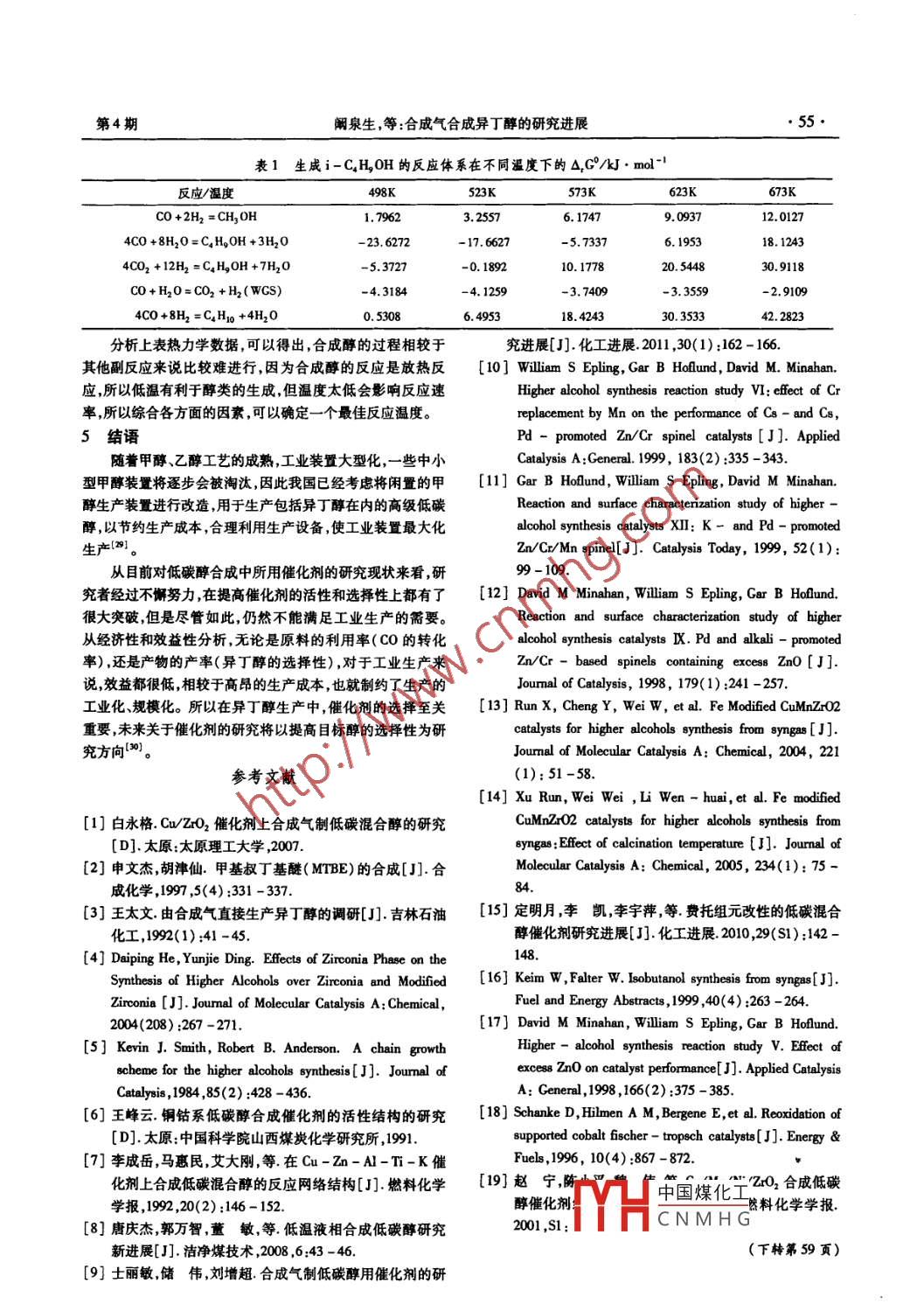 山東化工52SHANDONG CHEMICAL INDUSTRY2014年第43卷合成氣合成異丁醇的研究進(jìn)展闞泉生,屈濤,鄭長(zhǎng)征,朱煒(西安工程大學(xué)環(huán)境與化學(xué)工程學(xué)院陜西西安710048)擴(kuò)要:異丁醇作為基本有機(jī)化工原料在工業(yè)生產(chǎn)中有廣泛的應(yīng)用。由合成氣直接合成異丁醇作為一種新的工藝思路對(duì)世界各國(guó)科學(xué)家都有強(qiáng)大的吸引力。該文章討論了合成氣合成異丁醇反應(yīng)過(guò)程中的動(dòng)力學(xué)、熱力學(xué)以及反應(yīng)機(jī)理,并分析了合成過(guò)程中所需催化劑的研究現(xiàn)狀對(duì)合成氣直接合成異丁醇的工藝開(kāi)發(fā)和催化劑的制備有指導(dǎo)意義關(guān)鍵詞:異丁醇;催化劑;動(dòng)力學(xué);熱力學(xué);反應(yīng)機(jī)理中圖分類號(hào):TQ214文獻(xiàn)標(biāo)識(shí)碼:A章編號(hào):1008-021X(2014)04-0052-04The Research Progress of Synthetic Gas Synthetize IsobutanolKAN Quan-sheng, QU Tao, ZHENG Chang-zheng, ZHU Wei(Xian Polytechnic University, Xian 710048, China)Abstract: As a basic organic chemical raw material, isobutyl alcohol is widely used in industrial production, While isobutylalcohol directly made by syngas emerges great attraction to scientists around the world by its new technology. This paperthermodynamics and reaction mechanism during the process of synthesis of isobutyl alcohol bysyngas and analyzed the research advance of catalyst in the synthesis progress, which shows guiding significance fortechnique development and preparation of catalyst in systhesis of isobutyl alcohol by syngasKey words: Isobutyl alcohol; catalyst; dynamics thermodynamics; reaction mechanism1緒論增,而來(lái)自于煉油廠和石油化學(xué)工業(yè)的異丁烯卻受到種種限近年來(lái)隨著工業(yè)飛速發(fā)展環(huán)境問(wèn)題也日益凸顯作為制。異丁醇可以脫氫制取異丁烯所以世界各國(guó)對(duì)用合成氣不可再生資源煤炭資源的潔凈利用已經(jīng)成為了世界性的課直接制取異丁醇的工藝路線都有濃厚的興趣題。由煤經(jīng)由合成氣制低碳混合醇(MHA)是煤炭資源清潔目前合成氣工業(yè)已經(jīng)有了相當(dāng)?shù)囊?guī)模,合成氣合成低高效利用的有效途徑之一,低碳混合醇不僅可以作為發(fā)動(dòng)機(jī)碳醇的研究開(kāi)發(fā)有了很大的進(jìn)展合成氣合成甲醇、乙醇等燃料或清潔汽油添加劑而且可以分離獲得乙醇丙醇等化已工業(yè)化若能研究成功由合成氣直接合成異丁醇,必將為工原料,目前煤氣化技術(shù)工藝已經(jīng)十分成熟開(kāi)展對(duì)低碳混合成氣工業(yè)的發(fā)展注人新的活力合醇的研究對(duì)合理利用煤炭資源以及減少環(huán)境污染都有其研究由合成氣直接合成異丁醇這一課題還可以促進(jìn)合重要的戰(zhàn)略意義(。成化學(xué)催化理論的發(fā)展。在由合成氣制備低碳醇工藝路線中,備受人們關(guān)注的是過(guò)去幾十年研究者對(duì)合成氣合成混合醇所用催化劑進(jìn)由合成氣直接制備甲醇、異丁醇的工藝路線,其中甲醇可以行了許多改進(jìn),以期找到一種催化劑僅適用于單一醇的合用于精細(xì)化工,還可以作為發(fā)電站的代用燃料;異丁醇是最成。但是卻沒(méi)有一種催化劑非常好地適合于單一醇的合成好的助溶劑之一,異丁醇還可以脫水生成異丁烯與甲醇反工藝設(shè)計(jì)??傮w來(lái)看所開(kāi)發(fā)的催化劑體系反應(yīng)條件苛刻應(yīng)制取汽油添加劑--甲基叔丁基醚(MTBE)2。異丁醇催化活性低、產(chǎn)品分離困難且回收難度大掣肘了低碳混合還是基本有機(jī)合成原料,主要用在塑料橡膠等的合成,同時(shí)醇合成的工業(yè)化商業(yè)化。盡管研究者對(duì)于合成氣合成低碳還可以作為萃取劑,從氯化鋰與氯化鈉或鉀的混合物中提取醇催化劑體系(尤其是合成氣合成異丁醇催化劑)的開(kāi)發(fā)已氯化鋰等。2010年已經(jīng)被美國(guó)環(huán)保署列入燃料添加劑目做出了非凡的努力但就催化劑的催化活性和低碳醇的選擇錄性來(lái)說(shuō),還有很大空間可以提高。以往異丁醇產(chǎn)品主要來(lái)自于丙烯羰基合成制丁辛醇工2低碳醇合成中異丁醇的形成機(jī)理藝中的副產(chǎn)物回收。由于近年來(lái)丙烯羰基合成正向低壓法研究目標(biāo)產(chǎn)物(異丁醇)的形成機(jī)理可以為選擇催化劑(銠基催化劑)發(fā)展,這樣使得粗羰基合成液中的正異構(gòu)比和優(yōu)化反應(yīng)條件提供理論基礎(chǔ)。升至10:1左右自然異丁醇的來(lái)源也日趨下降。另外,由于1984年, Smith等在用Cu作活性成分,AM2O3作載體甲基叔丁基醚(MTBE)汽油摻和劑的需求增長(zhǎng)速度與日俱的催化劑上研YH中國(guó)煤化工時(shí),大膽猜想和收稿日期:2014-02-13CNMHG作者簡(jiǎn)介:闞泉生(1988—),男,安徽碭山人,西安工程大學(xué),碩士,研究方向?yàn)榈吞即嫉暮铣?通訊作者:朱煒(1982-),西安工程大學(xué)講師博士學(xué)位。第4期闞泉生,等:合成氣合成異丁醇的研究進(jìn)展假設(shè)提出了著名的碳鏈增長(zhǎng)理論,如圖1所示。圖1合成CO0+H2與低碳醇磯鏈增長(zhǎng)機(jī)理的生產(chǎn)示意圖研究結(jié)果表明:(1)在反應(yīng)過(guò)程中,CO+H2首先形成甲成CO2烴類酮類等副產(chǎn)物因此在低碳醇合成技術(shù)中的關(guān)醇,它是鏈增長(zhǎng)的起始步驟因而甲醇在產(chǎn)物中選擇性最高;鍵就在于設(shè)計(jì)出高選擇性高活性并具有優(yōu)