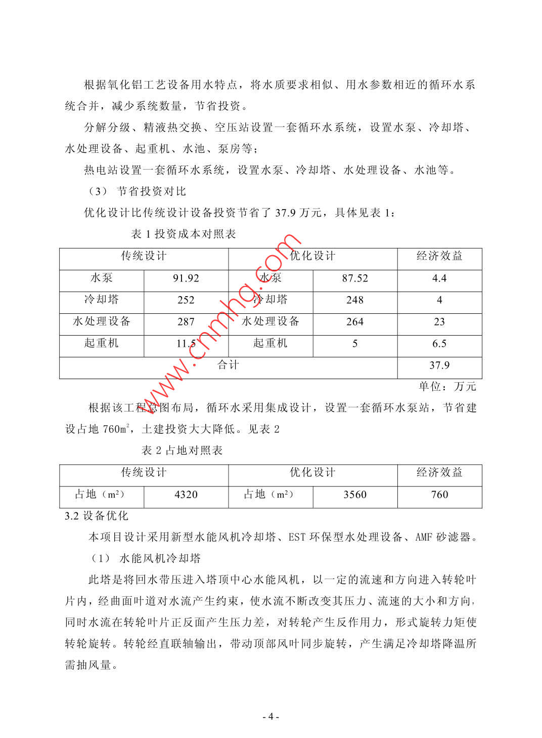 淺談循環(huán)水系統(tǒng)優(yōu)化設計沈琪趙波2張旭3東北大學設計研究院有限公司遼寧沈陽110013摘要:針對氧化鋁廠循環(huán)水系統(tǒng)冷卻塔及旁濾系統(tǒng),采用水能風杋塔代替機械冷卻塔;采用EST電解水處理器及砂濾器代替?zhèn)鹘y(tǒng)離子交換和高速過來系統(tǒng),采用循環(huán)水集中設置代替分散設置等優(yōu)化設計,使得循環(huán)水運行節(jié)省電耗,節(jié)省占地,方便管理,同時避免藥劑二次污染關鍵詞:節(jié)能;管理方便;環(huán)保;大型化;水能風機冷卻塔;EST電解水處理器Abstract: in view of the cooling tower and circulating water system of alumina plant besidefilter system adopts the water tower to replace mechanical cooling tower fan; Using ESTelectrolysis of water processor and sand filter instead of traditional ion exchange andhigh-speed system adopts the circulating water concentration set instead of dispersionSettings such as optimum design makes the operation of circulating water to save powerconsumption, save floor, convenient management and to avoid secondary pollutionpharmacyKeywords: energy conservation; Convenient management; Environmental protection; Largescale; Water cooling tower fan; Est electrolysis of water processor中圖分類號:TE683文獻標識碼:A文章編號:2095-2104(2013)1、工程概況:本工程為貴州某地年產(chǎn)80萬氧化鋁工程,本工程需要總供新水量為20580m3/d,其中生產(chǎn)新水平均用水量為20280m3/d,生活用水量為300m3/d,循環(huán)水量為475310.4m3/d,全廠水循環(huán)利用率為95.9%。根據(jù)總圖總體布局和各工段的用水需求,全廠設置5套循環(huán)水系統(tǒng):即蒸發(fā)循環(huán)水、焙燒循環(huán)水、原料磨循環(huán)水、煤氣站循環(huán)水、分解熱電站循環(huán)水。本次針對分解熱電循環(huán)水優(yōu)化設計進行論述,該套循環(huán)水采用集成化設計,包括三套循環(huán)水系統(tǒng),主要供給分解分級、精液熱交換、空壓站、熱電站及泵冷卻循環(huán)水。其中分解分級、空壓站及設備泵冷卻循環(huán)水最大循環(huán)水供水量4100m3/h,供水溫度35°C,供回溫差15°C,壓力回水;熱電站循環(huán)水供水量1550m3/h,供水溫度35°C,供回溫差10°C;精液熱交換循環(huán)水供水量1200m3/h,供水溫度35°C,供回溫差15°C,壓力回水。2、工藝流程工藝流程如圖1所示,分解寬流道板式換熱器冷卻循環(huán)回水、綜合過濾精液板式換熱器冷卻循環(huán)冷卻回水及空壓站壓縮空氣機循環(huán)冷卻回水,通過分水器恒壓后通過冷卻塔冷卻,將水溫為50C循環(huán)水冷卻至35℃C后進入冷水池,再經(jīng)循環(huán)水水泵加壓送至用水點;其中,綜合過濾板式換熱器冷卻循環(huán)回水需經(jīng)減壓后進如分水器恒壓上塔,且在循環(huán)給水系統(tǒng)中,綜合過濾板式換熱器由于供水壓力為0.MPa,故單獨設置兩臺供水泵一用一備,分解寬流道板式換熱器冷卻水和壓縮空氣機冷卻水共用3臺水泵,二用一備,由于分解根據(jù)不同的氣候,用水量變化,故電機采用變頻電機;熱電站循環(huán)水通過余壓直接上塔,循環(huán)回水經(jīng)冷卻塔將水溫從45循環(huán)水冷卻至35C后進入冷水池,系統(tǒng)配置4臺冷水泵加壓后送至熱電站主廠房,三用一備;為了改善循環(huán)水水質,特設兩臺旁濾水泵,一用備王王:.觀50圖3、布置方式、設備選型及控制系統(tǒng)的優(yōu)化3.1布置方式優(yōu)化(1)傳統(tǒng)設計分解分級、精液熱交換設置一套循環(huán)水系統(tǒng),設置水泵、冷卻塔、水處理設備、起重機、水池、泵房等;空壓站設置一套循環(huán)水系統(tǒng),設置水泵、冷卻塔、水處理設備、起重機、水池、泵房等;熱電站設置一套循環(huán)水系統(tǒng),設置水泵、冷卻塔、水處理設備、起重機、水池、泵房等。(2)優(yōu)化設計根據(jù)氧化鋁工藝設備用水特點,將水質要求相似、用水參數(shù)相近的循環(huán)水系統(tǒng)合并,減少系統(tǒng)數(shù)量,節(jié)省投資。分解分級、精液熱交換、空壓站設置一套循環(huán)水系統(tǒng),設置水泵、冷卻塔水處理設備、起重機、水池、泵房等;熱電站設置一套循環(huán)水系統(tǒng),設置水泵、冷卻塔、水處理設備、水池等(3)節(jié)省投資對比優(yōu)化設計比傳統(tǒng)設計設備投資節(jié)省了37.9萬元,具體見表1表1投資成本對照表傳統(tǒng)設計優(yōu)化設計經(jīng)濟效益水泵91.92水泵87.524.4冷卻塔252冷卻塔248水處理設備287水處理設備26423起重機11.5起重機6.5合計37.9單位:萬元根據(jù)該工程總圖布局,循環(huán)水采用集成設計,設置一套循環(huán)水泵站,節(jié)省建設占地760m2,土建投資大大降低。見表2表2占地對照表傳統(tǒng)設計優(yōu)化設計經(jīng)濟效益地4320占地(m2)35607603.2設備優(yōu)化本項目設計采用新型水能風機冷卻塔、EST環(huán)保型水處理設備、AMF砂濾器。(1)水能風機冷卻塔此塔是將回水帶壓進入塔頂中心水能風機,以一定的流速和方向進入轉輪葉片內,經(jīng)曲面葉道對水流產(chǎn)生約束,使水流不斷改變其壓力、流速的大小和方向,同時水流在轉輪葉片正反面產(chǎn)生壓力差,對轉輪產(chǎn)生反作用力,形式旋轉力矩使轉輪旋轉。轉輪經(jīng)直聯(lián)軸輸岀,帶動頂部風葉同步旋轉,產(chǎn)生滿是冷卻塔降溫所需抽風量。釆用水能風機冷卻塔,設備一次性投資比常規(guī)機械通風冷卻塔高出124萬元,但運行費用每年節(jié)省138萬元,不到1年收回設備多