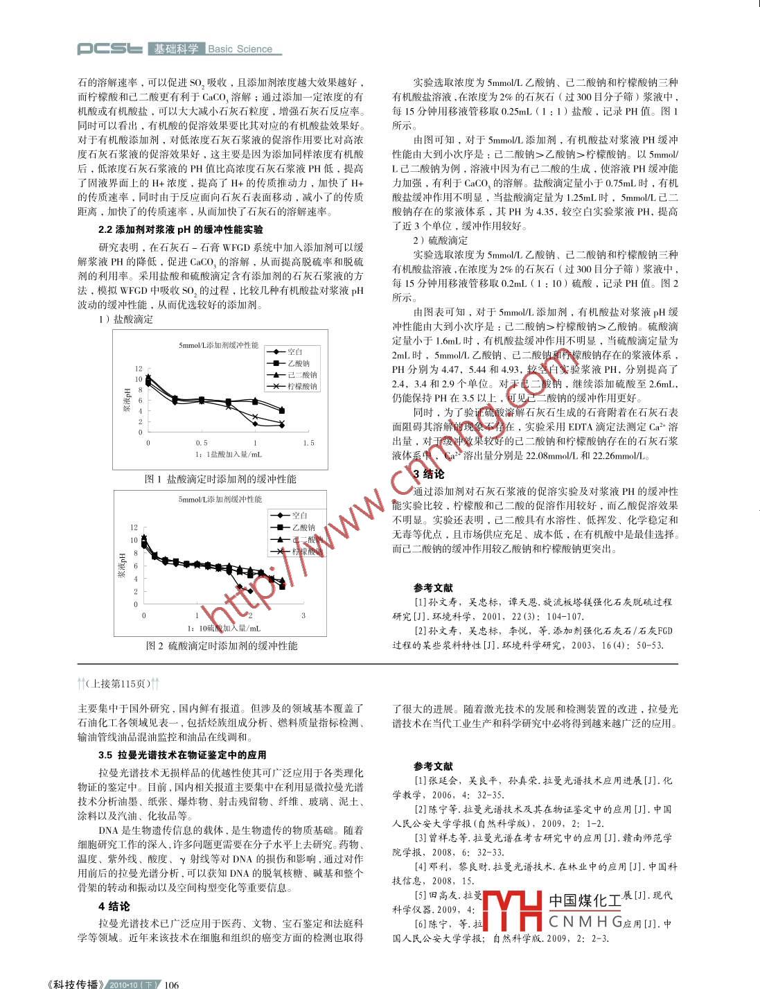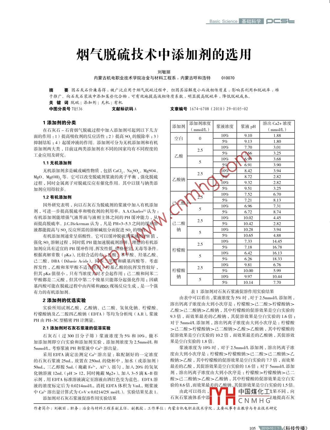 _Basic Sciencel 基礎(chǔ)科學(xué)pCSb煙氣脫硫技術(shù)中添加劑的選用劉敏麗內(nèi)蒙古機(jī)電職業(yè)技術(shù)學(xué)院冶金與材料工程系,內(nèi)蒙古呼和浩特010070 .摘要因石灰石價(jià)廉易得,被廣泛應(yīng)用于煙氣脫硫過(guò)程中。但因其溶解度小而液相傳質(zhì)差,影響其利用和脫硫率,難于推廣。向石灰石漿液中添加某些化合物,可有效地提高液相傳質(zhì)系數(shù),明顯提高脫硫率,降低脫硫成本.關(guān)鍵詞脫硫;添加劑;無(wú)機(jī);有機(jī)中圖分類(lèi)號(hào)TQ536文獻(xiàn)標(biāo)識(shí)碼A .文章編號(hào)1674-6708 (2010) 29-0105-021添加劑的分類(lèi)添加 劑濃度溶出Ca2+濃度添加劑漿液濃度漿液pH在石灰石-石膏煙氣脫硫過(guò)程中加入添加劑可起到以下幾方( mmol/L)面的作用: 1)提高吸收劑的反應(yīng)活性;2)提高sO2的脫除率;3)空白)10% .9.101.88抑制結(jié)垢;4)起緩沖液的作用。添加劑可分為無(wú)機(jī)添加劑和有機(jī)5%9.131.8010%7.70添加劑兩大類(lèi),目前這兩類(lèi)添加劑在不同的國(guó)家均有不同程度的.5597.663.25工業(yè)應(yīng)用及研究。乙酸6.993.681.1無(wú)機(jī)添加劑6.91無(wú)機(jī)添加劑多是堿或堿性物質(zhì),包括CaCl、Na,SO2、 MgS04、8.423.94Mg0、Mg(OH)2 等。它可以改變脫硫劑漿液的離子平衡,強(qiáng)化脫硫乙酸鈉8.72過(guò)程,同時(shí)金屬離子對(duì)脫硫反應(yīng)有催化作用。其中以鎂與鈉類(lèi)添9.322.82加劑應(yīng)用得較多。5% _9.517.526.701.2有機(jī)添加劑2.57.218.13己二酸國(guó)外研究表明,向以石灰石為脫硫劑的漿液中加入有機(jī)添加6.967.31劑,可進(jìn)一步提高脫硫率和吸收劑的利用率。A.A.Charles!I 認(rèn)為:6.728.74有機(jī)添加劑能增強(qiáng)氣液界面與液相主體之間的PH緩沖能力,從10.02而提高脫硫率。J.C.Dickerman 認(rèn)為,凡是PH=3-5.3之間的緩沖溶10.42液都能提高與SO,反應(yīng)所需的溶解堿組分而促進(jìn)SsO,的吸收。鈉10.28有機(jī)添加劑通常呈弱酸性。它可以緩沖脫硫劑漿液的PH值,10.65_ 4.88強(qiáng)化SO,溶解過(guò)程,同時(shí)低PH能加速脫硫劑溶解。理想的有機(jī)添7.3314.45加劑應(yīng)具有適宜的PH緩沖作用、揮發(fā)性低價(jià)格便宜無(wú)毒等條件。檸檬酸7.1816.786.4216.13根據(jù)離解常數(shù)( pKa),比較合適的有:乙酸、苯甲酸、羥基乙酸、62618.33己二酸、DBA ( Dibasic Aeids).間苯二甲酸和磺基丙酸等??紤]0816.76揮發(fā)性,乙酸和苯甲酸不適合使用;羥基乙酸的抗揮發(fā)性較好,10.00但其pKa值很小,只有當(dāng)濃度大時(shí)才會(huì)起作用;己二酸和間苯二甲酸都是二元酸,但其中第二個(gè)羧基只能部分起強(qiáng)化作用;因磺內(nèi)9.9710.44_5910.14基丙酸可能在脫硫過(guò)程中由丙烯和HSO;現(xiàn)場(chǎng)反應(yīng)生成,是一個(gè)強(qiáng)有力的有機(jī)添加劑。表1添加劑對(duì)石灰石漿液促溶作用實(shí)驗(yàn)結(jié)果由表中可以看出,漿液濃度為5%時(shí),對(duì)于2.5mmo/L添加劑,2添加劑的優(yōu)選實(shí)驗(yàn)實(shí)驗(yàn)所用試劑乙酸、乙酸鈉、己二酸、氫氧化鈉、檸檬酸、溶出鈣離子濃度由大到小次序是:檸檬酸>己二酸>檸檬酸鈉>檸檬酸鈉及乙二胺四乙酸鈉( EDTA)等均為分析純( AR),漿液乙酸>已二酸鈉>乙酸鈉,其中檸檬酸的促溶效果是空白實(shí)驗(yàn)的9.3倍,而效果最差的乙酸鈉,其促溶效果是空白實(shí)驗(yàn)的1.6倍;PH由PH-3C型精密PH計(jì)測(cè)量。對(duì)于5mmol/L添加劑,溶出鈣離子濃度由大到小次序是:檸檬酸2.1添加劑對(duì)石灰石漿液的促溶實(shí)驗(yàn)>己二酸>檸檬酸鈉>己二酸鈉>乙酸>乙酸鈉,其中檸檬酸的石灰石(過(guò)300日分子篩)漿液濃度為5%和10%,做不促溶效果是空白實(shí)驗(yàn)的10.2倍,而效果最差的乙酸鈉,其促溶效加添加劑即空白實(shí)驗(yàn)和添加劑實(shí)驗(yàn),添加劑濃度為2.5mmol/L和果是空白實(shí)驗(yàn)的1.8倍。5mmol/L,考察漿液PH和漿液中Ca2+溶出量。漿液濃度為 10%時(shí),對(duì)于2.5mmol/L添加劑,溶出鈣離子濃采用EDTA滴定法測(cè)定Ca2+溶出量:取配制好的一-定濃度度由大到小次序是:檸檬酸>檸檬酸鈉>已二酸>己二酸鈉>乙的石灰石漿液25mL,放置在250mL的燒杯中,加水(或添加劑)酸鈉>乙酸,其中檸檬酸的促溶效果是空白實(shí)驗(yàn)的7.7倍,而效果50mL,三乙醇胺5mL (掩蔽Fe2+, AIP+), 搖勻,加入20%的氫氧最差的乙酸,其促溶效果是空白實(shí)驗(yàn)的1.6 倍;對(duì)于5mmol/L添加化鈉溶液12mL (pH> 12, 同時(shí)掩蔽Mg2+),加入3~5滴K-B指劑,溶出鈣離子濃度由大到小次序是:檸檬酸>檸檬酸鈉>已二示劑,用EDTA標(biāo)準(zhǔn)溶液滴定至溶液由酒紅色變?yōu)樗{(lán)色。EDTA溶酸>已二酸鈉>乙酸>乙酸鈉,其中檸檬酸的促溶效果是空白實(shí)液的濃度標(biāo)定后為0.0214mo/L,消耗EDTA體積為VmL,則漿液驗(yàn)的8.6倍,而效果最差的乙酸鈉,其促溶效果是空白實(shí)驗(yàn)的1.5倍。中Ca2"溶出量計(jì)算式為C=V x 0.021425( mol/L )。實(shí)驗(yàn)結(jié)果見(jiàn)表1。由此可以得出,中國(guó)煤化工果不同,向添加劑對(duì)石灰石漿液促溶作用實(shí)驗(yàn)結(jié)果石灰石漿液體系中添YHCN MH G地提高石灰作者簡(jiǎn)介:劉敏麗,職務(wù):冶金與材料工程系副主任、副教授,工作單位:內(nèi)蒙古機(jī)電職業(yè)技術(shù)學(xué)院,主要從事專(zhuān)業(yè)教學(xué)與專(zhuān)業(yè)技術(shù)研究105 2010.10(下《科技傳 播》pcSu基礎(chǔ)
