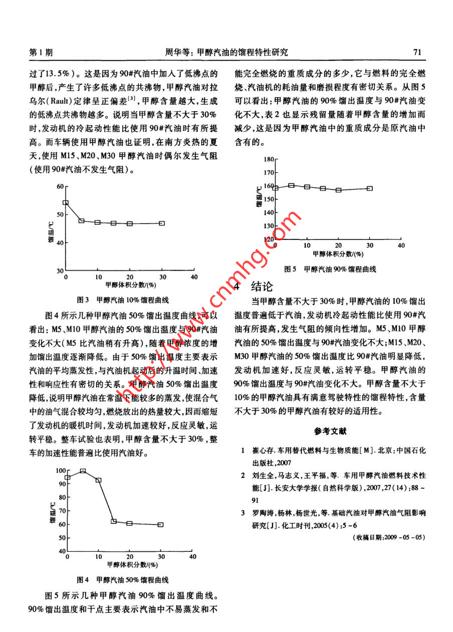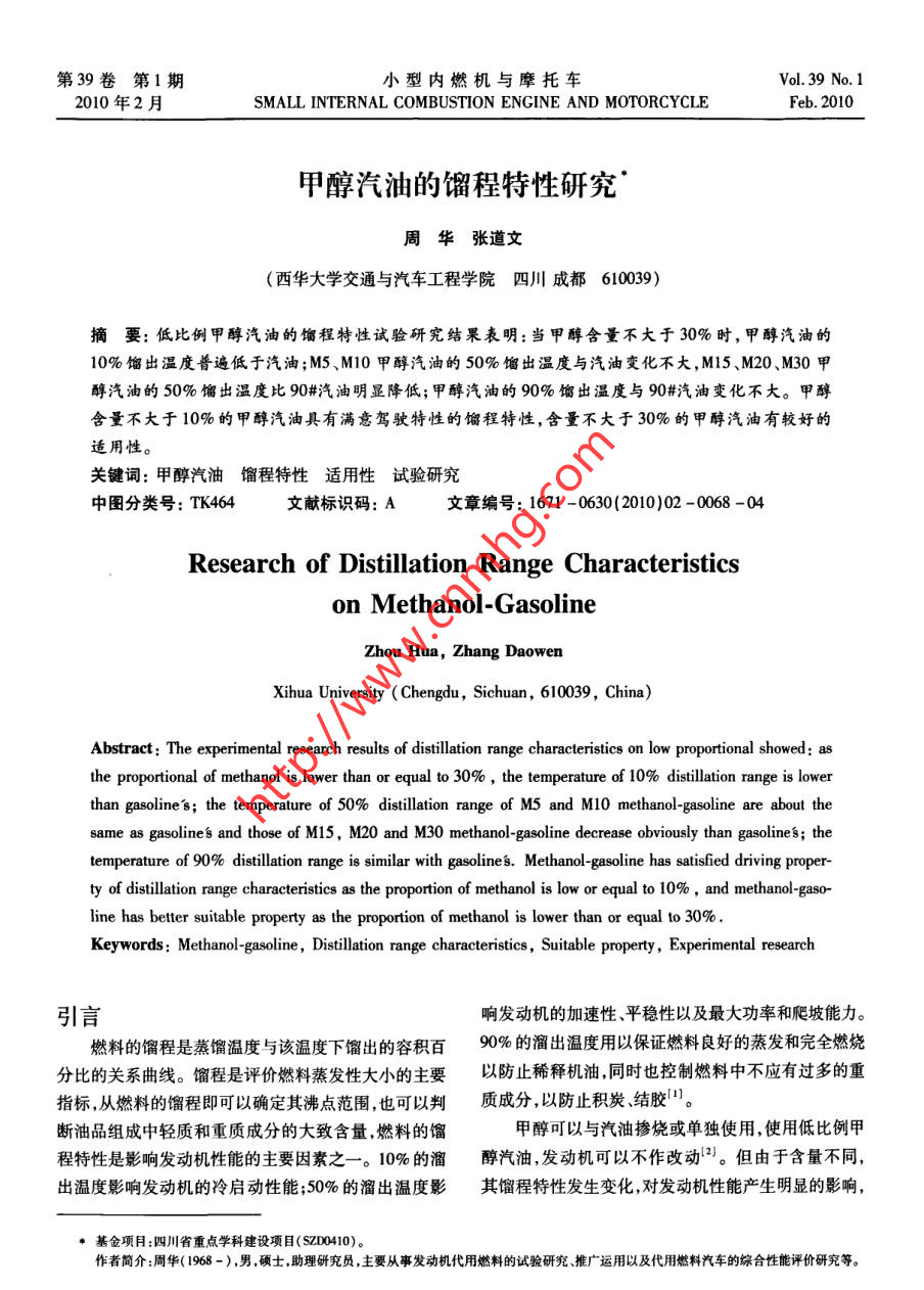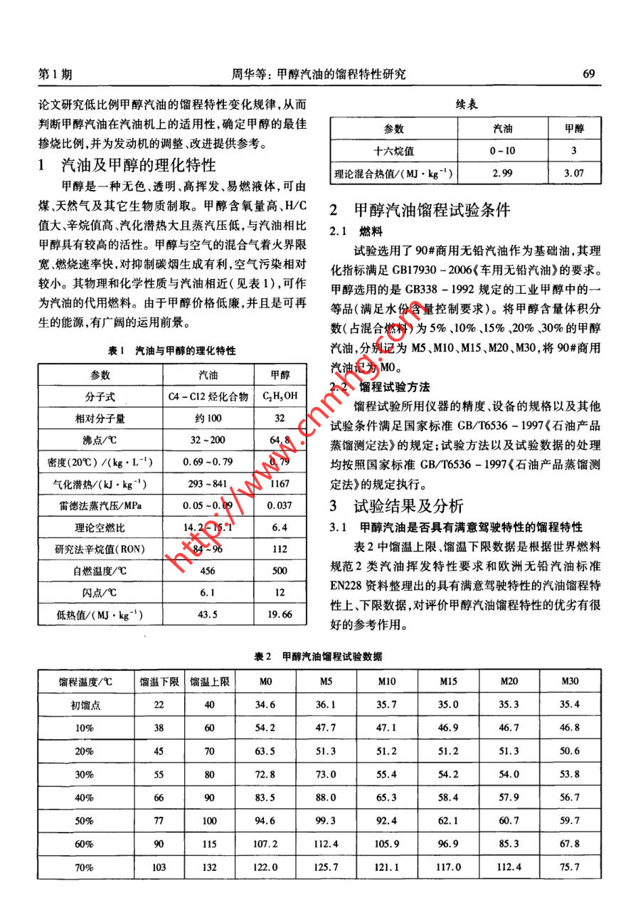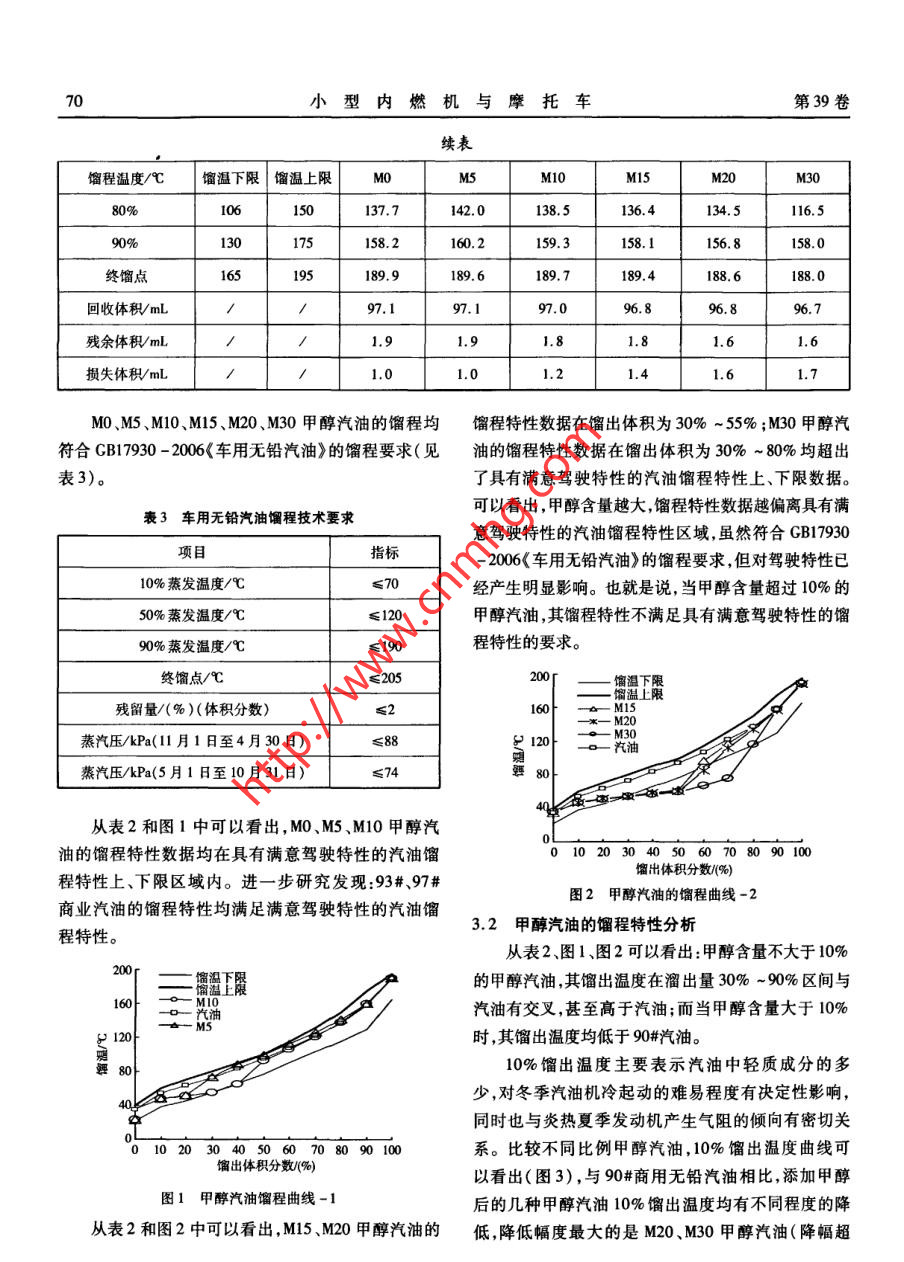第39卷第1期小型內(nèi)燃機(jī)與摩托車Vol. 39 No. 12010年2月SMALL INTERNAL COMBUSTION ENGINE AND MOTORCYCLEFeb. 2010甲醇汽油的餾程特性研究周華張道文(西華大學(xué)交通與汽車工程學(xué)院四川 成都610039)摘要:低比例甲醇汽油的餾程特性試驗(yàn)研究結(jié)果表明:當(dāng)甲醇含量不大于30%時(shí),甲醇汽油的10%餾出溫度普遍低于汽油;M5、M10甲醇汽油的50%餾出溫度與汽油變化不大, M15、M20、M30甲醇汽油的50%餾出溫度比90#汽油明顯降低;甲醇汽油的90%餾出溫度與90#汽油變化不大。甲醇含量不大于10%的甲醇汽油具有滿意駕駛特性的餾程特性,含量不大于30%的甲醇汽油有較好的適用性。關(guān)鍵詞:甲醇汽油餾程特性適用性試驗(yàn)研究中圖分類號(hào): TK464文獻(xiàn)標(biāo)識(shí)碼: A文章編號(hào): 1671 -0630(2010)02 -0068 -04Research of Distillation Range Characteristicson Methanol-GasolineZhou Hua, Zhang DaowenXihua University ( Chengdu , Sichuan, 610039, China)Abstract : The experimental research results of disillation range characteristics on low proportional showed: asthe proportional of methanol is lower than or equal to 30%,the temperature of 10% disillation range is lowerthan gasoline's; the temperature of 50% disillation range of M5 and M10 methanol-gasoline are about thesame as gasoline' and those of M15, M20 and M30 methanol-gasoline decrease obviously than gasolines; thetemperature of 90% disillation range is similar with gasolines. Methanol-gasoline has satisfied driving proper-ty of ditillation range characteristics as the proportion of methanol is low or equal to 10% , and methanol-gaso-line has better suitable property as the proportion of methanol is lower than or equal to 30% .Keywords: Methanol-gasoline ,Distillation range characteristics, Suitable property, Experimental research引言響發(fā)動(dòng)機(jī)的加速性、平穩(wěn)性以及最大功率和爬坡能力。燃料的餾程是蒸餾溫度與該溫度下餾出的容積百90%的溜出溫度用以保證燃料良好的蒸發(fā)和完全燃燒分比的關(guān)系曲線。餾程是評(píng)價(jià)燃料蒸發(fā)性大小的主要以防止稀釋機(jī)油,同時(shí)也控制燃料中不應(yīng)有過多的重指標(biāo),從燃料的餾程即可以確定其沸點(diǎn)范圍,也可以判質(zhì)成分,以防止積炭、結(jié)膠"。斷油品組成中輕質(zhì)和重質(zhì)成分的大致含量,燃料的餾甲醇可以與汽油摻燒或單獨(dú)使用,使用低比例甲程特性是影響發(fā)動(dòng)機(jī)性能的主要因素之- -。10% 的溜醇汽油,發(fā)動(dòng)機(jī)可以不作改動(dòng)2。但由于含量不同,出溫度影響發(fā)動(dòng)機(jī)的冷啟動(dòng)性能;50%的溜出溫度影其餾程特性發(fā)生變化,對(duì)發(fā)動(dòng)機(jī)性能產(chǎn)生明顯的影響,基金項(xiàng)月:四川省重點(diǎn)學(xué)科建設(shè)項(xiàng)目(SZD0410)。作者簡介:周華( 1968 -),男,碩士,助理研究員,主要從事發(fā)動(dòng)機(jī)代用燃料的試驗(yàn)研究推廠運(yùn)用以及代用燃料汽車的綜合性能評(píng)價(jià)研究等。第1期周華等:甲醇汽油的餾程特性研究69論文研究低比例甲醇汽油的餾程特性變化規(guī)律,從而續(xù)表判斷甲醇汽油在汽油機(jī)上的適用性,確定甲醇的最佳參數(shù)汽油甲醇摻燒比例,并為發(fā)動(dòng)機(jī)的調(diào)整、改進(jìn)提供參考。十六烷值0-10.31汽油及甲醇的理化特性理論混合熱值/(MJ.kg"')|2.993.07甲醇是一種無色、透明高揮發(fā)、易燃液體,可由煤、天然氣及其它生物質(zhì)制取。甲醇含氧量高、H/C2甲醇汽油餾程試驗(yàn)條件值大、辛烷值高、汽化潛熱大且蒸汽壓低,與汽油相比2.1燃料甲醇具有較高的活性。甲醇與空氣的混合氣著火界限試驗(yàn)選用了90#商用無鉛汽油作為基礎(chǔ)油,其理寬燃燒速率快,對(duì)抑制碳煙生成有利,空氣污染相對(duì)化指標(biāo)滿足CB17930 - 2006<車用無鉛汽油》的要求。較小。其物理和化學(xué)性質(zhì)與汽油相近(見表1),可作甲醇選用的是CB338-1992規(guī)定的工業(yè)甲醇中的一-為汽油的代用燃料。由于甲醇價(jià)格低廉,并且是可再等品(滿足水份含量控制要求)。將甲醇含量體積分生的能源,有廣闊的運(yùn)用前景。數(shù)(占混合燃料)為5% .10%、15% 20%、30%的甲醇表1汽油與甲醇的理化特性汽油,分別記為MS、M10、M15、M20、M30,將90#商用汽油記為MO。參數(shù).分子式C4 -C12烴化合物CH,0H2.2餾程試驗(yàn)方法餾程試驗(yàn)所用儀器的精度、設(shè)備的規(guī)格以及其他相對(duì)分子量約100.32試驗(yàn)條件滿足國家標(biāo)準(zhǔn)GB/T6536 - 1997《石油產(chǎn)品沸點(diǎn)/C32 ~ 20064.8蒸餾測(cè)定法》的規(guī)定;試驗(yàn)方法以及試驗(yàn)數(shù)據(jù)的處理密度(20C) /(kg.L")0.69 -0.790.79均按照國家標(biāo)準(zhǔn)GB/T6536 - 1997《石油產(chǎn)品蒸餾測(cè)氣化潛熱/(kJ.kg"')293 ~8411167定法》的規(guī)定執(zhí)行。雷德法蒸汽壓/MPa0.05 ~0.090.0373試驗(yàn)結(jié)果及分析理論空燃比14.2~15.16.43.1甲醇汽油是 否具有滿意駕駛特性的餾程特性研究法辛烷值( RON)84 ~96112表2中餾溫上限、餾溫下限數(shù)據(jù)是根據(jù)世界燃料自燃溫度/C456500規(guī)范2類汽油揮發(fā)特性要求和歐洲無鉛汽油標(biāo)準(zhǔn)EN228資料整理出的具有滿意駕駛特性的汽油餾程特閃點(diǎn)/C6. I12性上、下限數(shù)據(jù),對(duì)評(píng)價(jià)甲醇汽油餾程特性的優(yōu)劣有很低熱值/(MJ.kg~')43.519. 66好的參考作用。甲醇汽油餾程試驗(yàn)數(shù)據(jù)餾程溫