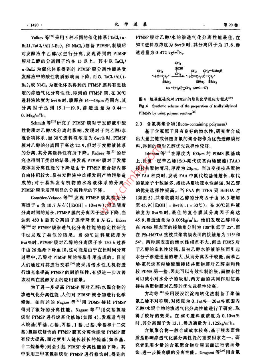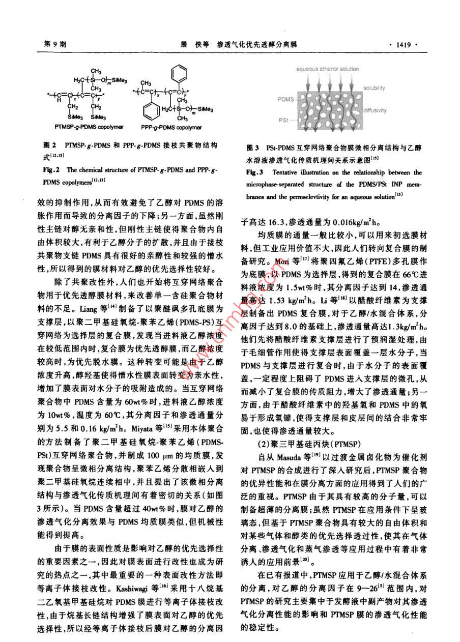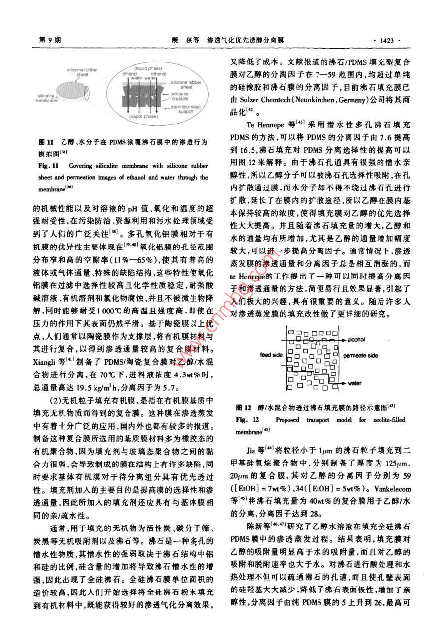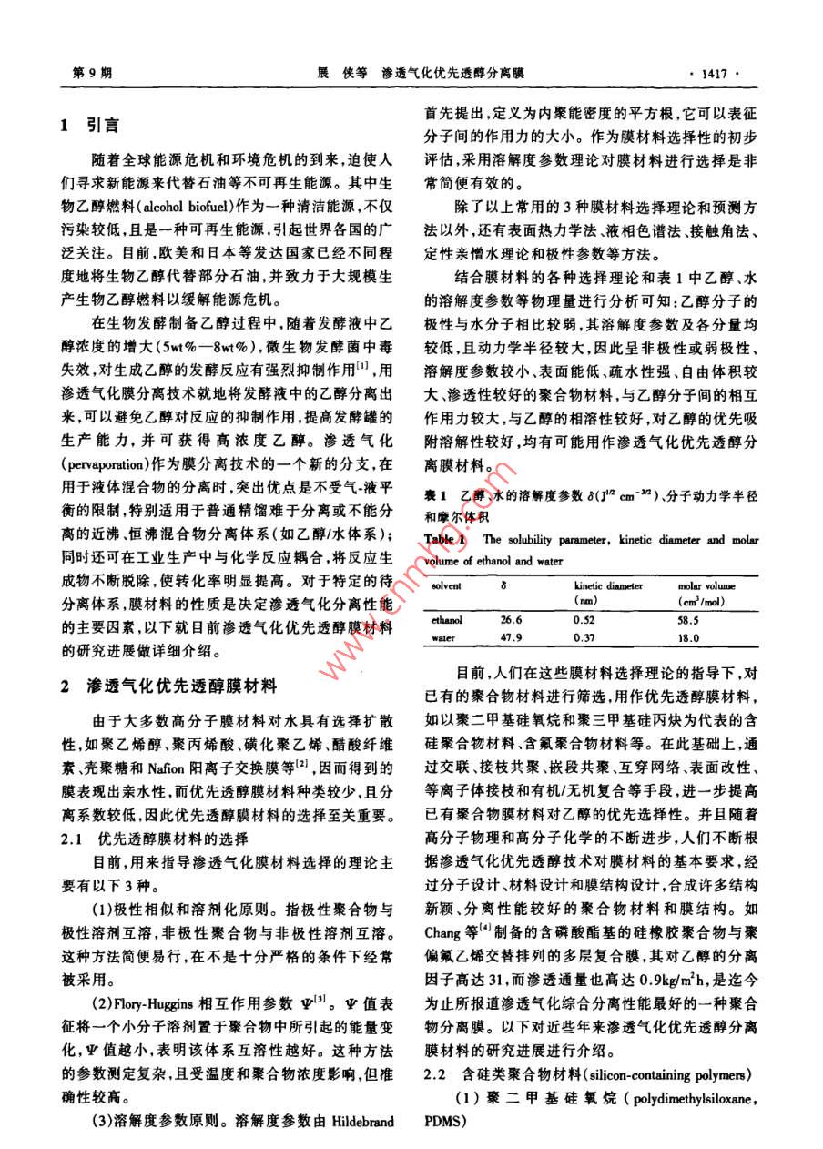 :第20卷第9期化學進展Vol.20 No.92008年9月PROGRESS IN CHEMISTRYSep., 2008滲透氣化優(yōu)先透醇分離膜*展俠李繼定**黃軍其陳翠仙(清華大學化學工程系膜技術工程研究中心北 京100084)摘要20世紀70年代的能源危機促使了人們對可再生能源-發(fā)酵法制備乙醇與節(jié)能分離工藝的探索。滲透氣化膜分離技術作為一種新興的膜分離技術,具有分離效率高、低能耗、易于和發(fā)酵裝置耦合、易于與其它分離方法聯(lián)用等顯著優(yōu)點,特別適用于乙醇/水等恒沸混合物體系的分離。本文簡要介紹了滲透氣化優(yōu)先透醇膜的研究背景,總結并分析了用于指導膜材料選擇的理論,詳細介紹了用于制備優(yōu)先透醇膜的含硅聚合物、含氟聚合物、有機/無機復合膜材料以及其他聚合物膜材料的的結構特點、改性方法及膜材料分子結構與滲透氣化性能間的關系,將不同膜材料對乙醇/水的滲透氣化分離性能進行了總結比較,在此基礎上總結了目前滲透氣化乙醇/水分離膜存在的問題,并對其未來的研究方向和發(fā)展前最進行了展望。關鍵詞滲透氣化 乙醇1水混合物膜材料分離性能中圖分類號: TB383; TQ028.8文獻標識碼: A文章編 號: 1005-281X(2008)09-1416-11Ethanol Perm-Selective Membranes by PervaporationZhan Xia Li jiding°" Huang Junqi Chen Cuixian(Membrane Technology & Engineering Research Center, Department of Chemical Engineering,Tsinghua University, Beijing 100084, China)Abstract The production of renewable ethanol biofuel from fermentation process as well 8 the investigation ofenergysaving separation technics is advanced by the energy crisis in 19708. As a rising membrane separation technology,pervaporation(PV) is espeially attractive in the separation of azeotropic mixtures such as ethanol/water mixtures due tohigh separation eficiency, low energy consumption, integration of pervaponation with fermentor and synergy of performingpervaporation and other separation methods etc. A brief introduction of investigation background of ethanol perm-selectivemembrane by pervaporation is given in this paper. Theories used for the selection of ethanol perm-selective membranematerials are summarized and analyzed. And the structure characteristics, modification methods and PV performance ofethanol perm-selective membrane materials ( such 88 silicon-containing polymers, fluorine-containing polymers, organiclinorganic composite membrane materials and other polymers etc . ) with separation priorities are presented in detail. Therelationship between the stnucture characteristics of PV membrane materials and their separation performance is discussedin detail. The pervaporation performance of various ethanol perm-selective membranes is summarized and compared.Problems existed in PV membrane for ethano/waler separation is proposed based on discussion above. And the foresightof development and investigation of ethanol perm-selective PV membrane is also brought forward.Key words pervaporation; ethanol/ water mixtures; membrane naterials; separation performance收稿: 2007年10月,收修改稿: 2007年11月#國家重點基礎研究發(fā)展計劃(973)項目(No. 2003CB615701).國家自然科學基金項目(No. 20576059, No. 20676067, No.20736003).中石化科技開發(fā)研究基金(No. X505002)和中石油風險創(chuàng)新基金(No.05051143)資助告+通訊聯(lián)系人amil:ljding@ mail.tinghua. edu.cn第9期展俠等滲透氣化優(yōu)先透醇分離膜●1417●首先提出,定義為內聚能密度的平方根,它可以表征1引言分子間的作用力的大小。作為膜材料選擇性的初步隨著全球能源危機和環(huán)境危機的到來,迫使人評估,采用溶解度參數理論對膜材料進行選擇是非們尋求新能源來代替石油等不可再生能源。其中生常簡便有效的。物乙醇燃料(alcohol biofuel)作為一種清潔能源,不僅除了以上常用的3種膜材料選撣理論和預測方污染較低,且是一種可再生能源,引起世界各國的廣法以外,還有表面熱力學法、液相色譜法、接觸角法、泛關注。目前,歐美和日本等發(fā)達國家已經不同程定性親憎水理論和極性參數等方法。度地將生物乙醇代替部分石油,并致力于大規(guī)模生結合膜材料的各種選擇理論和表1中乙醇、水產生物乙醇燃料以緩解能源危機。的溶解度參數等物理量進行分析可知:乙醇分子的.在生物發(fā)酵制備乙醇過程中,隨著發(fā)酵液中乙極性與水分子相比較弱,其溶解度參數及各分量均醇濃度的增大(5wt%- -8wt%), 微生物發(fā)酵菌中毒較低,且動力學半徑較大,因此呈非極性或弱極性、失效,對生成乙醇的發(fā)酵反應有強烈抑制作用",用溶解度參數較小表面能低、疏水性強、自由體積較滲透氣化膜分離技術就地將發(fā)酵液中的乙醇分離出大、滲透性較好的聚合物材料,與乙醇分子間的相互來,可以避免乙醇對反應的抑制作用,提高發(fā)酵罐的作用力較大,與乙醇的相溶性較好,對乙醇的優(yōu)先吸生產能力,并可獲得高濃度乙醇。滲透氣化附溶解性較好,均有可能用作滲透氣化優(yōu)先透醇分(pervaporation)作為膜分離技術的-一個新的分支,在離膜材料。用于液體混合物的分離時,突出優(yōu)點是不受氣-液平表1乙醇、水的溶解度參敷 8(] cm~切)、分子動力學半徑.衡的限制,特別適用于普通精餾難于分離或不能分和摩爾體積離的近沸、恒沸混合物分離體系(如乙醇/水體系);Table 1 The solubility parumeter, kinetic diameter and molar同時還可在工業(yè)生產中與化學反應耦合,將反應生volume of ethanol and water成物不斷脫除,使轉化率明顯提高。對于特定的待solventkinetic diametermolar volume分離體系,膜