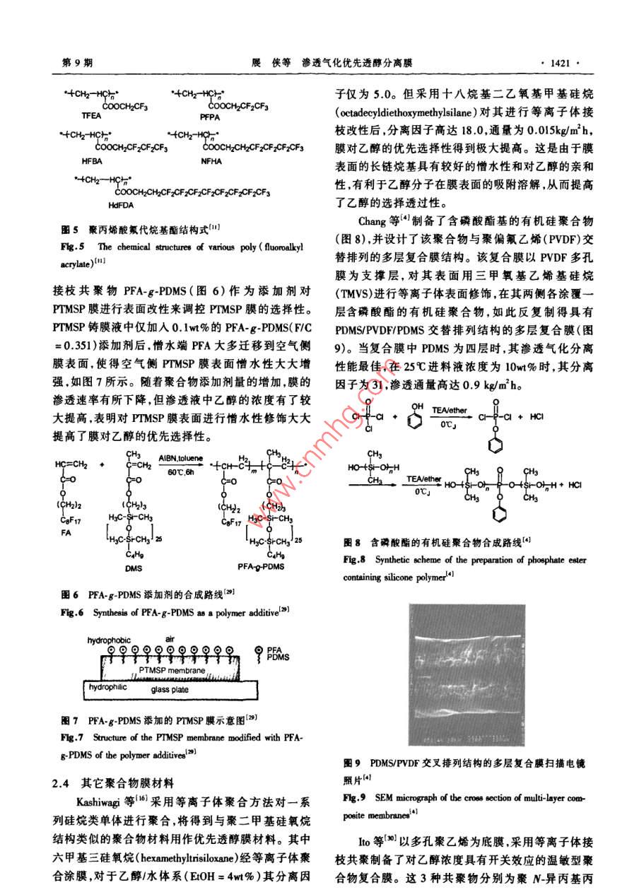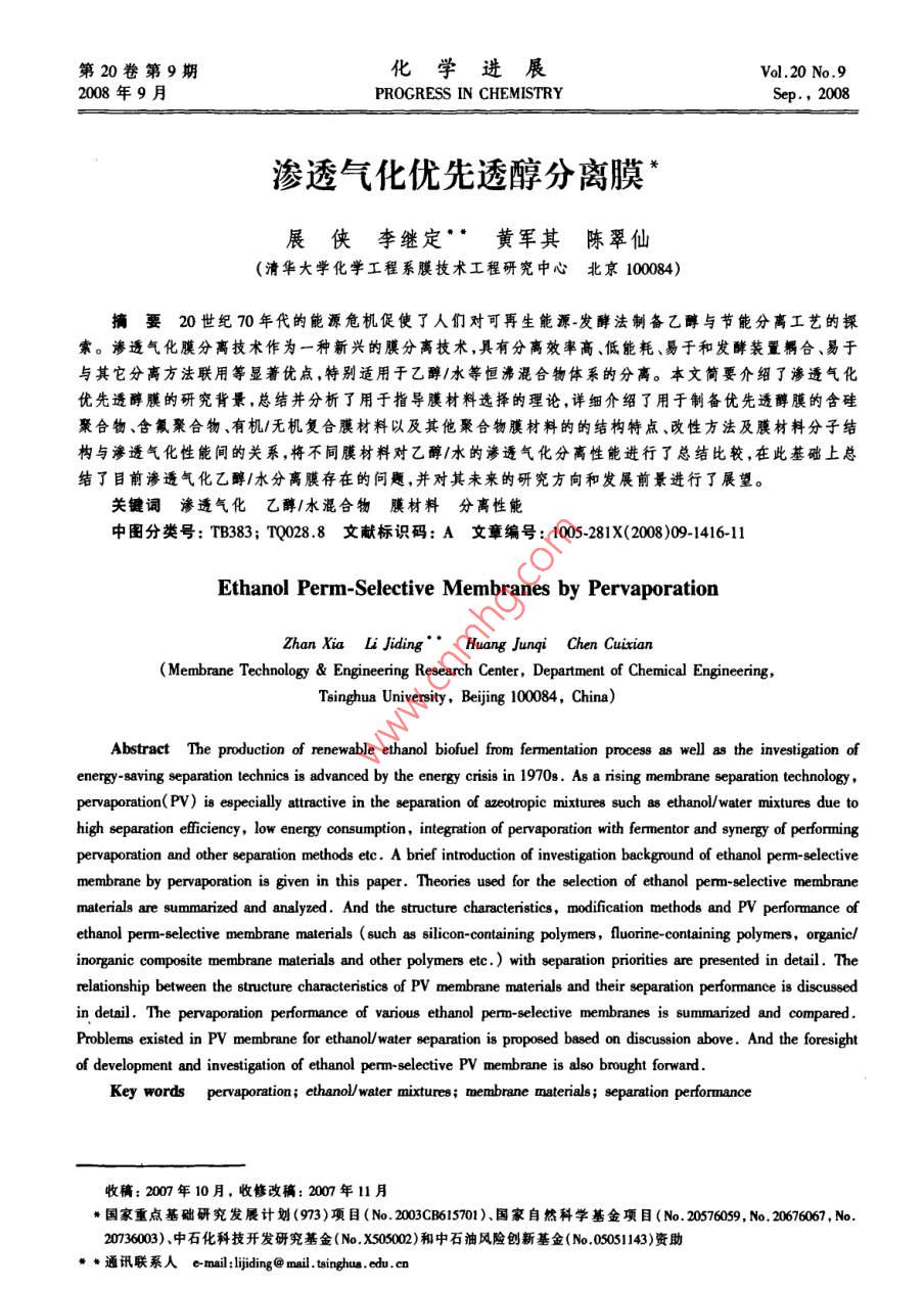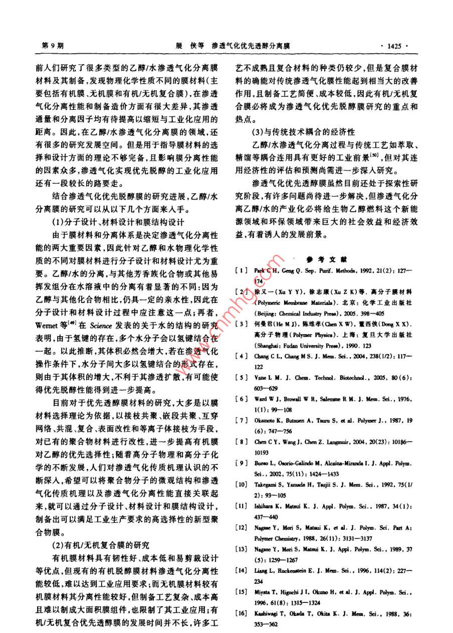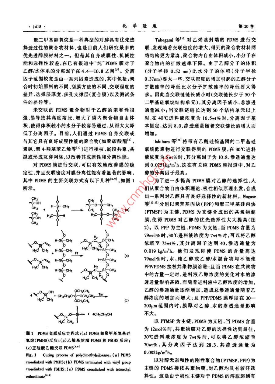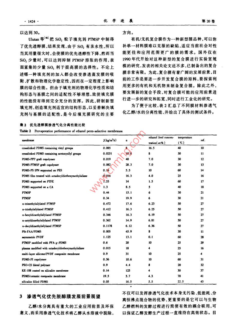 :第20卷第9期化學進展Vol.20 No.92008年9月PROGRESS IN CHEMISTRYSep., 2008滲透氣化優(yōu)先透醇分離膜*展俠李繼定**黃軍其陳翠仙(清華大學化學工程系膜技術工程研究中心北 京100084)摘要20世紀70年代的能源危機促使了人們對可再生能源-發(fā)酵法制備乙醇與節(jié)能分離工藝的探索。滲透氣化膜分離技術作為一種新興的膜分離技術,具有分離效率高、低能耗、易于和發(fā)酵裝置耦合、易于與其它分離方法聯(lián)用等顯著優(yōu)點,特別適用于乙醇/水等恒沸混合物體系的分離。本文簡要介紹了滲透氣化優(yōu)先透醇膜的研究背景,總結并分析了用于指導膜材料選擇的理論,詳細介紹了用于制備優(yōu)先透醇膜的含硅聚合物、含氟聚合物、有機/無機復合膜材料以及其他聚合物膜材料的的結構特點、改性方法及膜材料分子結構與滲透氣化性能間的關系,將不同膜材料對乙醇/水的滲透氣化分離性能進行了總結比較,在此基礎上總結了目前滲透氣化乙醇/水分離膜存在的問題,并對其未來的研究方向和發(fā)展前最進行了展望。關鍵詞滲透氣化 乙醇1水混合物膜材料分離性能中圖分類號: TB383; TQ028.8文獻標識碼: A文章編 號: 1005-281X(2008)09-1416-11Ethanol Perm-Selective Membranes by PervaporationZhan Xia Li jiding°" Huang Junqi Chen Cuixian(Membrane Technology & Engineering Research Center, Department of Chemical Engineering,Tsinghua University, Beijing 100084, China)Abstract The production of renewable ethanol biofuel from fermentation process as well 8 the investigation ofenergysaving separation technics is advanced by the energy crisis in 19708. As a rising membrane separation technology,pervaporation(PV) is espeially attractive in the separation of azeotropic mixtures such as ethanol/water mixtures due tohigh separation eficiency, low energy consumption, integration of pervaponation with fermentor and synergy of performingpervaporation and other separation methods etc. A brief introduction of investigation background of ethanol perm-selectivemembrane by pervaporation is given in this paper. Theories used for the selection of ethanol perm-selective membranematerials are summarized and analyzed. And the structure characteristics, modification methods and PV performance ofethanol perm-selective membrane materials ( such 88 silicon-containing polymers, fluorine-containing polymers, organiclinorganic composite membrane materials and other polymers etc . ) with separation priorities are presented in detail. Therelationship between the stnucture characteristics of PV membrane materials and their separation performance is discussedin detail. The pervaporation performance of various ethanol perm-selective membranes is summarized and compared.Problems existed in PV membrane for ethano/waler separation is proposed based on discussion above. And the foresightof development and investigation of ethanol perm-selective PV membrane is also brought forward.Key words pervaporation; ethanol/ water mixtures; membrane naterials; separation performance收稿: 2007年10月,收修改稿: 2007年11月#國家重點基礎研究發(fā)展計劃(973)項目(No. 2003CB615701).國家自然科學基金項目(No. 20576059, No. 20676067, No.20736003).中石化科技開發(fā)研究基金(No. X505002)和中石油風險創(chuàng)新基金(No.05051143)資助告+通訊聯(lián)系人amil:ljding@ mail.tinghua. edu.cn第9期展俠等滲透氣化優(yōu)先透醇分離膜●1417●首先提出,定義為內聚能密度的平方根,它可以表征1引言分子間的作用力的大小。作為膜材料選擇性的初步隨著全球能源危機和環(huán)境危機的到來,迫使人評估,采用溶解度參數理論對膜材料進行選擇是非們尋求新能源來代替石油等不可再生能源。其中生常簡便有效的。物乙醇燃料(alcohol biofuel)作為一種清潔能源,不僅除了以上常用的3種膜材料選撣理論和預測方污染較低,且是一種可再生能源,引起世界各國的廣法以外,還有表面熱力學法、液相色譜法、接觸角法、泛關注。目前,歐美和日本等發(fā)達國家已經不同程定性親憎水理論和極性參數等方法。度地將生物乙醇代替部分石油,并致力于大規(guī)模生結合膜材料的各種選擇理論和表1中乙醇、水產生物乙醇燃料以緩解能源危機。的溶解度參數等物理量進行分析可知:乙醇分子的.在生物發(fā)酵制備乙醇過程中,隨著發(fā)酵液中乙極性與水分子相比較弱,其溶解度參數及各分量均醇濃度的增大(5wt%- -8wt%), 微生物發(fā)酵菌中毒較低,且動力學半徑較大,因此呈非極性或弱極性、失效,對生成乙醇的發(fā)酵反應有強烈抑制作用",用溶解度參數較小表面能低、疏水性強、自由體積較滲透氣化膜分離技術就地將發(fā)酵液中的乙醇分離出大、滲透性較好的聚合物材料,與乙醇分子間的相互來,可以避免乙醇對反應的抑制作用,提高發(fā)酵罐的作用力較大,與乙醇的相溶性較好,對乙醇的優(yōu)先吸生產能力,并可獲得高濃度乙醇。滲透氣化附溶解性較好,均有可能用作滲透氣化優(yōu)先透醇分(pervaporation)作為膜分離技術的-一個新的分支,在離膜材料。用于液體混合物的分離時,突出優(yōu)點是不受氣-液平表1乙醇、水的溶解度參敷 8(] cm~切)、分子動力學半徑.衡的限制,特別適用于普通精餾難于分離或不能分和摩爾體積離的近沸、恒沸混合物分離體系(如乙醇/水體系);Table 1 The solubility parumeter, kinetic diameter and molar同時還可在工業(yè)生產中與化學反應耦合,將反應生volume of ethanol and water成物不斷脫除,使轉化率明顯提高。對于特定的待solventkinetic diametermolar volume分離體系,膜