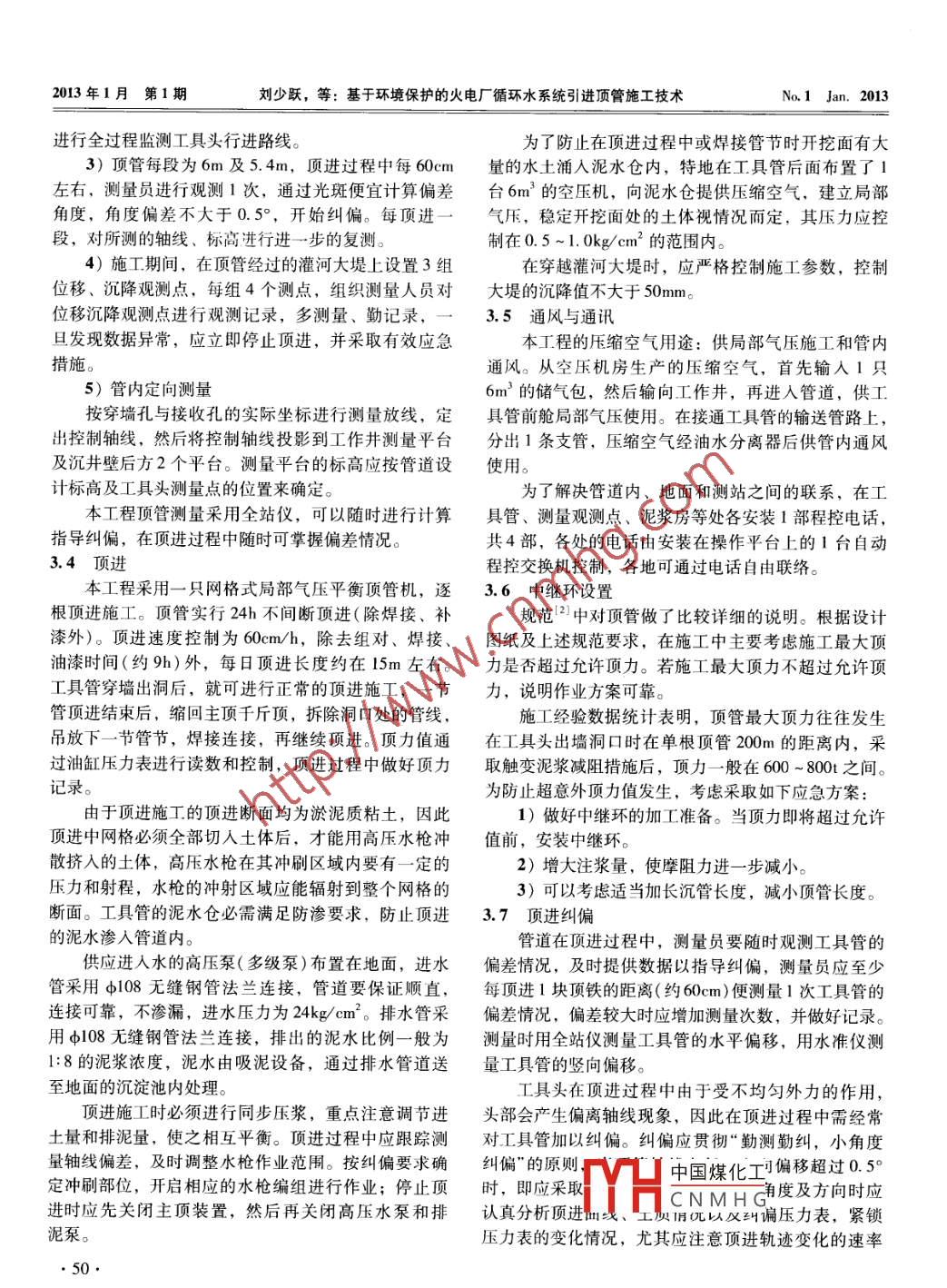 第1期廣東水利水電No, 12013年1月GUANCDONG WATER RESOURCES AND HYDROPOWERJan. 2013基于環(huán)境保護(hù)的火電廠循環(huán)水系統(tǒng)引進(jìn)頂管施工技術(shù)劉少躍',潘健”, 丁孝勇2(1.廣東省源天工程有限公司,廣東廣州511340; 2. 華南理工大學(xué)土木與交通學(xué)院,廣東廣州510640)摘要:以陳家港電廠為例,基于環(huán)境保護(hù)的原則,介紹頂管技術(shù)在火電廠循環(huán)水系統(tǒng)中的機(jī)械選擇、施工設(shè)計(jì)以及安全措施。施工結(jié)果表明頂管施工對(duì)環(huán)境的影響較小、速度快。關(guān)鍵詞:環(huán)境;項(xiàng)管;施工工藝;安全措施中圖分類號(hào): T991.1文獻(xiàn)標(biāo)識(shí)碼: B文章編號(hào): 1008 -0112(2013)01 -0047 -05環(huán)境問題是當(dāng)今世界所面臨的重大準(zhǔn)題。采用工0. 55MPa,平均側(cè)壁摩阻力為16. 9kPa,平均層厚約為程施工技術(shù)最大限度地減少工程施I過程對(duì)環(huán)境的破3. 0m。該層土水域部分逐漸尖滅缺失。壞是工程界的一一個(gè)新課題,結(jié)合在江蘇國華陳家港電②2粉士:黃灰色,濕,松散、局部稍密。該層廠循環(huán)水系統(tǒng)T程施工過程的實(shí)例,介紹頂管技術(shù)在土平均標(biāo)貫擊數(shù)為10.4 擊,靜探平均錐尖阻力為火電廠循環(huán)水系統(tǒng)的應(yīng)用。4. 8MPa,平均側(cè)壁摩阻力為51. 6kPa,平均層厚約為1工程概況3. 4m。該層土自廠區(qū)到灌河逐漸變薄,至河岸附近尖江蘇國華電廠陳家港電廠位于蘇北平原東北部灌,滅缺失。河南岸的沿海涂灘上,地勢平坦,地面高程起伏不大,②3淤泥質(zhì)粘土:淺灰、灰色,流塑,具有水平屬黃河沖擊的濱海平原。循環(huán)水系統(tǒng)由水泵房、引水層理,偶含有機(jī)質(zhì),夾薄層粉土或粉砂,干強(qiáng)度韌性管和取水頭3部分組成,引水管長度為28.6m,需穿中等,局部含腐殖質(zhì),底層見貝殼。該層土平均標(biāo)貫過灌河大堤和河邊灘涂對(duì)蝦養(yǎng)殖場,為保護(hù)周圍的生擊數(shù)為2.4擊,靜探平均錐尖阻力為0. 8MPa,平均側(cè)態(tài)環(huán)境,設(shè)計(jì)采用頂管和沉管相結(jié)合的施工技術(shù),穿.壁摩阻力為13. 7kPa,平均層厚約為12m??辈旆秶^灌河大堤和河邊灘涂對(duì)蝦養(yǎng)殖場段,用頂管施工,內(nèi)分布穩(wěn)定。長度均為173.6m,管徑為3 240mm, 壁厚分別為③粉質(zhì)粘土加粉土:灰綠~黃褐色,可塑~硬塑,36mm、34mm,長度分別為66. 5m、107m, 沉管段長以可塑為主。該層土平均標(biāo)貫擊數(shù)為12.5擊,靜探平為55m。頂管位于循環(huán)水泵房進(jìn)水間邊墻處,中心標(biāo).均錐尖阻力為2.84MPa,平均側(cè)壁摩阻力為57.5kPa,高為-7. 50m,與沉管相接處的標(biāo)高為一10.0m,其沉平均層厚約為9.2m。該層土自廠區(qū)至灌河逐漸變厚,管段中心線坡降為1. 44%。粉土含量逐漸增加。整個(gè)廠址廠區(qū)附近無基巖出露,覆蓋層厚約.④粉砂:黃灰色,飽和,密實(shí),局部夾灰色薄層200m,下伏基巖為奧陶系石灰?guī)r。地基土主要?jiǎng)澐譃榉圪|(zhì)粘土和粉土,具有水平微層理,局部地段層頂發(fā)7個(gè)地層,自上而下分別為:現(xiàn)塊狀泥質(zhì)膠結(jié)。該層土平均標(biāo)貫擊數(shù)為32.4擊,靜①填土:黃灰色,軟塑~可塑,以粉質(zhì)粘土為主,探平均錐尖阻力為14. 14MPa,平均側(cè)璧摩阻力為表層為場地四通一平清淤回填土。該層土平均標(biāo)貫擊165. 7kPa,平均層厚約為6.2m。該層土路域分布穩(wěn)數(shù)為2.5擊,靜探平均錐尖阻力為1. 06MPa,平均側(cè)定,至河床部分逐漸尖滅缺失。壁摩阻力為52. 2kPa。該層土特性變化較大,灘涂河2頂管主要施工工藝塘等:表層主要為未清干凈的淤泥質(zhì)土,水域部分該層2.1工具頭選用土缺失,該層土平均層厚約1. 6m。本I程項(xiàng)管要穿過灌河大堤,頂進(jìn)斷面大都在②3②1淤泥質(zhì)粉質(zhì)粘土:灰黃,淺灰色,軟塑。該淤泥質(zhì)粉質(zhì)粘土層中,頂管上覆蓋土層②2粉土土體層土標(biāo)貫擊數(shù)為2.4擊,靜探平均錐尖阻力為不夠穩(wěn)定,除平甩機(jī)械平衡揩施外還采用氣壓平 衡中國煤化工收稿日期: 2012-07-04YHCNMH G作者簡介:劉少躍(1958-), 男,高級(jí).T程師,主要從事水利水電工程施T.和地基基礎(chǔ)處理等T.作。.47●.2013年1月第1期劉少躍,等:基于環(huán)境保護(hù)的火電廠循環(huán)水系統(tǒng)引進(jìn)頂管施工技術(shù)No.1 Jan. 2013機(jī)頭平衡前方水土壓力,根據(jù)本工程地質(zhì)條件結(jié)合以小,后座及軌道布置時(shí)按水平頂進(jìn)要求進(jìn)行布置。后往類似工程的施工經(jīng)驗(yàn),決定選用網(wǎng)格式局部氣壓平座布置時(shí),充分考慮到墻體結(jié)構(gòu)的允許受力,減少頂衡水力機(jī)械頂管機(jī)。該頂管機(jī)具有以下特點(diǎn):力對(duì)墻體結(jié)構(gòu)的影響。利用設(shè)置在工具頭上的糾偏油1)在管道頂進(jìn)過程中,利用T具管前艙的局部氣缸,通過糾偏油缸不同角度的伸縮,實(shí)現(xiàn)坡度的調(diào)整。壓能有效平衡穩(wěn)定工具管前端土體的水壓、土壓,防2.3頂進(jìn)系統(tǒng)止土體的塌方、涌水、涌泥,以減少對(duì)管道周圍土體1)頂力計(jì)算的擾動(dòng),防止對(duì)地基或大堤沉降的影響。本工程頂管外徑為D=3.24m,單根管頂長度L=2)頂進(jìn)過程中,如遇有地下障礙物(例如樁或塊173. 5m,管道在②3淤泥質(zhì)粘土中頂進(jìn),采用觸變泥石等)可在氣壓下人工排