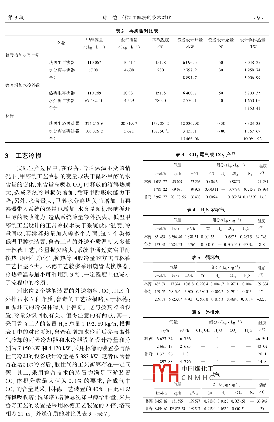 June 2015化肥設(shè)計(jì)第53卷第3期Chemical fertilizer design2015年6月低溫甲醇洗的技術(shù)對(duì)比孫愷(陜西延長(zhǎng)石油延安能源化工有限責(zé)任公司,陜西延安710049)摘要:低溫甲醇洗是目前煤化工項(xiàng)目普遍采用的脫硫脫碳工藝。國(guó)外主要有兩家專利商的技術(shù)可供選擇:德囯林德公司、德囯魯奇公司。兩種技術(shù)的原理相同、工藝流程類似,相應(yīng)的設(shè)備選型、設(shè)備選材也有類似之處。本文參考囯內(nèi)兩套采用水煤漿氣化工藝、氣量基本相同、分別采用林德、魯奇低溫甲醇洗工藝包的甲醇洗裝置,在冷量提供、工藝?yán)鋼p、熱量等幾方面進(jìn)行了類比,并給出了建議。關(guān)鍵詞:低溫甲醇洗;林德工藝;魯奇工藝;冷量;工藝?yán)鋼p;熱量doi:10.3969/j.iss.1004-8901.2015.03.002中圖分類號(hào):TQ44.41文獻(xiàn)標(biāo)識(shí)碼:A文章編號(hào):1004-8901(2015)03-0006-05Comparison of Technology on Rectisol ProcessSUN KaiYanan Energy Chemical Co, Lid, of Shaanxi Yanchang Petroleum( Group )Co., Lid, Yan'an Shaanxi 710049 China)Abstract: Rectisol is nowadays a commonly used desulphuration and CO, removal process for coal chemical projects. There are two optional foreignes: Linde rectisol and Lurgi Rectisol. Thesesimilar equipment and materialssoime recommedations with reference to the rectisolunits of two domestic methanol plants with coal slurry gasification process, identical gas flow, anRectisol Process and Linde Rectisol Process ap-rgi Rectisol; cold duty; process cold losdoi:10.3969/j.issn.1004-8901.2015.03.002甲醇洗工藝是目前煤化工項(xiàng)目普遍采用的工經(jīng)過(guò)與富甲醇換熱在40℃左右作為貧甲醇泵的給藝氣體洗滌浄化流程,主要流程可分為原料氣甲醇料,升壓后再經(jīng)過(guò)循環(huán)水換熱器換熱,而在魯奇工洗滌、富甲醇閃蒸、硫化氫濃縮、甲醇再生、甲醇水藝中通常再生精甲醇在90℃左右作為精甲醇泵的分離、尾氣洗滌6部分。其中尾氣洗滌屬于環(huán)保設(shè)給料,升壓后與富甲醇換熱,通常不設(shè)置循環(huán)水換施,與甲醇洗工藝流程無(wú)直接關(guān)聯(lián),但會(huì)影響系統(tǒng)熱器的水平衡和冷量平衡,間接影響整個(gè)系統(tǒng)1原料氣凈化從工藝設(shè)備設(shè)置的角度看,魯奇工藝與林德工藝在富甲醇液閃蒸、硫化氫濃縮、甲醇水分離、尾氣為了滿足魯奇碎煤氣化的原料氣凈化需要,魯洗滌四部分的流程基本相同,在原料氣洗滌、甲醇奇公司的低溫甲醇洗單元將一臺(tái)繞管換熱器前移再生兩部分的流程略有區(qū)別魯奇工藝采用了中壓至洗氨塔之前,并在甲醇洗滌塔底部增加預(yù)洗段洗滌,而林德工藝沒(méi)有;林德工藝采用了富硫化氫第中國(guó)煤化“冷令凝下來(lái),減少對(duì)后續(xù)甲醇過(guò)濾器和甲醇水溶液過(guò)濾器、原料氣水分離系CNMH商榷,但在目前處理器,而魯奇工藝沒(méi)有;魯奇工藝在主洗塔分別采用含m出什時(shí)上藝中,魯奇工藝是唯一預(yù)洗甲醇、CO2甲醇、精甲醇依次對(duì)原料氣進(jìn)行洗的選擇滌,而林德只用一路貧甲醇由下到上對(duì)原料氣進(jìn)行作者簡(jiǎn)介:孫愷(1975年-),男,吉林省吉林市人,1996年畢業(yè)于西安理工大學(xué)機(jī)加工工藝與設(shè)備專業(yè),高級(jí)工程師,現(xiàn)從事基礎(chǔ)設(shè)計(jì)洗滌,洗滌精度逐漸提高;林德工藝中再生貧甲醇審查、設(shè)備采購(gòu)分級(jí)等工作。第3期孫愷低溫甲醇洗的技術(shù)對(duì)比1.1魯奇碎煤氣化的原料氣初步凈化流程簡(jiǎn)述1.3魯奇水煤漿氣化的原料氣初步凈化流程原料氣噴淋甲醇后經(jīng)過(guò)繞管換熱器E10l預(yù)冷在魯奇水煤漿氣化過(guò)程中,原料氣進(jìn)入第一繞至θ℃;進(jìn)人分離罐ⅥIoⅠ進(jìn)行氣液分離;其后進(jìn)入管換熱器FO初步降溫至0℃,冷凝氨組分和絕大第二繞管換熱器El02進(jìn)一步冷卻至-12℃,再進(jìn)部分的水進(jìn)入洗氨塔C01脫除其中的氨和水,噴淋入吸收塔Tlo預(yù)洗段脫除絕大部分的酚、部分酸甲醇后再進(jìn)入第二繞管換熱器F2降溫至-12℃性介質(zhì),預(yù)洗段底部液相進(jìn)入共沸塔T017和層析而后進(jìn)入吸收塔C02的預(yù)洗段。洗氨塔的液相送器V109,分離出石腦油、甲醇水。其中,E102的結(jié)至灰水處理單元閃蒸處理。構(gòu)形式取決于原料氣中有機(jī)物組分的凝結(jié)溫度,在與林德甲醇洗對(duì)應(yīng)流程相比,魯奇在原料氣初美國(guó)大平原氣化廠,該處采用了一臺(tái)氨冷器步凈化方面,流程設(shè)置較為冗長(zhǎng),設(shè)備較多。林德結(jié)合《美國(guó)大平原氣化廠20年運(yùn)行總結(jié)》中的流程中的洗氨塔是可以用變換單元洗氨塔代替的,描述和國(guó)內(nèi)山西大化甲醇洗的運(yùn)行情況,該處有機(jī)物而魯奇流程的洗氨塔作為其流程的中間部分,取消的脫除并不是十分理想,兩個(gè)廠家多年的運(yùn)行都糾結(jié)后會(huì)牽扯性能保證、物料平衡等一些列問(wèn)題,取消于水分離塔的結(jié)垢和發(fā)泡。大平原做了很多技改,水變換的洗氨塔會(huì)導(dǎo)致進(jìn)入第一繞管換熱器的原料分離塔仍然需要每6~8月清洗1次。這是由石腦氣中液相組分增多,帶來(lái)氣液兩相流沖刷甚至凍結(jié)油、甲醇的物性決定的,兩者互溶、密度十分接近,都等問(wèn)題。預(yù)洗段的富甲醇經(jīng)過(guò)閃蒸回收有效氣后,是優(yōu)良的溶劑,只有加水才能使兩者