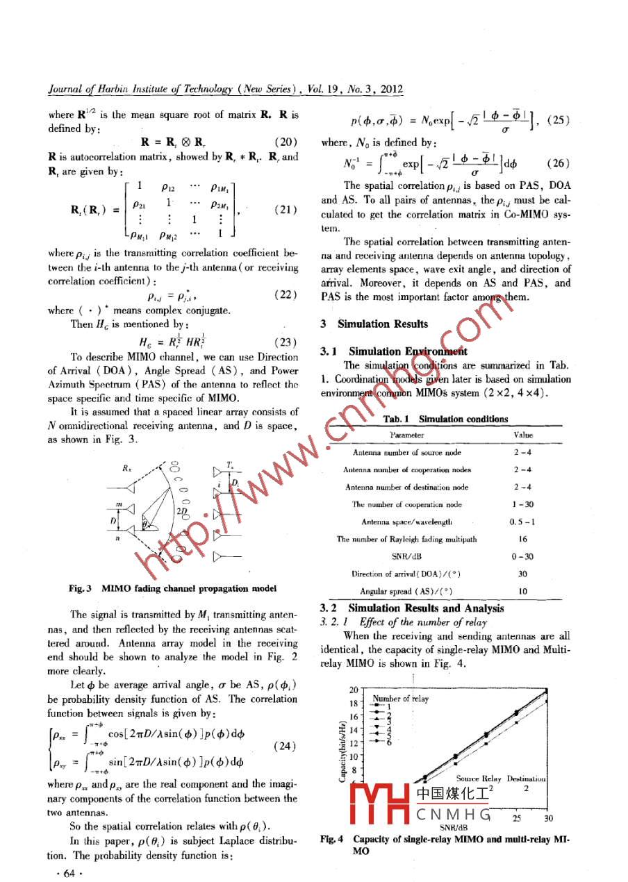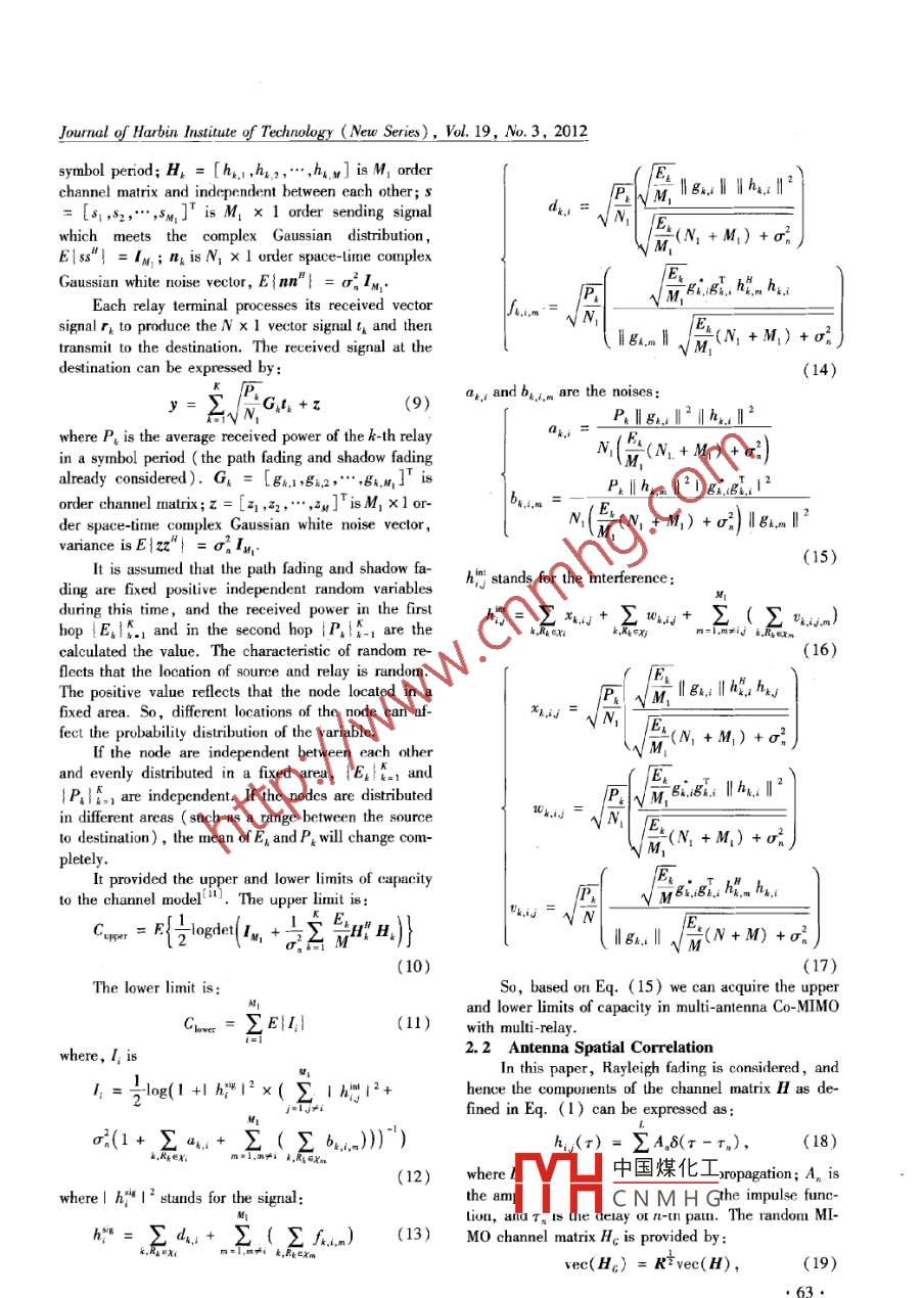 Journal of Harbin Instinute of Technology (New Series),Vol. 19,No.3, 2012Performance analysis on channel capacity in cooperative MIMO systemTnungtan Nguyen, MENG Wei- xiao, WANG Hong-yu, L Zhuo-lin阮中迅,孟維曉,王宏宇,李卓霖(School of Eecronice and Informaion Engineering, Hacbin Insitule of Techuolugs , Habin 150001 , China)rate ( BER) and lower the transmit power in radio mobile networks, especially when the direct channel betweenthe source and the destination is poor. Cooperaive multiple input mulhiple output (Co-MIMO) is a kind of MI-MO technique, where the muliple inputs and outputs are frmed via coperaion.n The capacity of Co-MIMOsystem over wireless channel has been investigated a lot, however few papers pay attention to the loeations of thechannel that may afet the probability distributions of the variable and the efeet of antenna spatial correlation.The results can be achieved by choosing sub-channels that is not related to other sub channels. This paper focu-ses on this problem. The simulation resuts show that once we search the partner we should consider trade offscooperation get optimum system performance. It further investigates that cooperation between diferent terninalscan reduce antenna spatial correlation, thereby increase the capacity and throughput of the system, and evenreach the ideal capacity of MIMO Bsystem. .Key words : cooperative MIMO; channel capacity ; muliple -antenna terminalsCLC number: TN929. 53Document code: AArticle ID: 1005-9113(2012)03-0061-07Multiple input multiple output ( MIMO)wirelessresource allocation strategy. In the aspect of multi -an-communication technology is a combination of antennatenna Co-MIMO channel model, it proceeds with hier-diversity technology and space-time processing technol-archical cooperation to obtain the linear throughputogy and belongs lo smnart antenna technology. In wire-range in the fixed area networkHowever, it paysless channel , multipath transmission can cause fading,attention to the mixed network of cellular and ad-hocthus it is considered as a harmful factor. MIMO systemnetwork, where are cooperative links between. relaysuse multi-antenna in both transmitter and receiver, thusand mobile terminals to create communication betweenthe quality of service ( QoS) to each user can. be im-base station and cooperative node- .。The study focusesproved. A new spatial diversity technology-cooperativeon base station which has multiple antennas'. Whendivcrsityt' makcs the mobile terminal use single anten-the base station transmits signals to a node of the nodena to utilize spatial diversity. The study results showcluster, other nodes this cluster proceed to cooperativethat in the flat fading environment , cooperative diversi-transmission to assist the destination node to receive in-ty can increase the channel capacity, raise QoS and im-formation. The channel correlated degree is proved toprove system performance because partners share eachbe a furiction of angle spread , scattering material char-other's antenna. They form virtual MIMO system. Inacterstics, distance of array antenna, the physical pa-Ref. [2], the cross-layer routing and resource alloca-rameter of array antenna and Doppler spread. There-tion problems of cooperative MIMO ( Co- MIMO) arefore, they affeet the channel capacity of MIM0 systemstudied. The gain and changing problems of Co-MIMOdirectly.capacity is studied in Ref. [3]. The basic idea of Co-This paper considers the channel model of multi-MIMO technology is greatly influenced in the study ofantenna terminal with Co-MIMO. .Then ingenuity dis-Virtual Antenna Array ( VAA) on the 4G technology.cusses the influence of antenna spatial correlation asDohler et al. proposed transmission strueture of VAAwell as multi-path number to the channel capacity theo-for cellular networks, and the base station is equippedretically. According to the analysis of channel capacitywith multi- antennas. A multi-hop relay VAA structureof different cooperative model, the functions of spatialof the cellular network system was studied in Ref.correlation and the number of multi-path are discussed.[4], proposed by some related agreements, which an-coopert中國(guó)煤化工he dir ofalyzcs the capacity of end to end system, and providesTYRCNMHGRecived 201-12-15.Sponsored by the National Natural Science Foundation of China( Grant No. 60872016) and Progam for New Century Excellent Talents in Univesity( Grant No. NCET08-0157).Coresponding author: MENG Wei-xiao, E-mail; wxmeng@ hit. edu. cn..61.Journal of Harbin Instinute of Technology (New Series), Vol. 19, No.3, 2012The rest of this paper is organized as follows.where SNR and SNR, are the normalized power ratiosSome basic theory is. described in Section II. Sectionof X, to the noise ( after fading) at each receiver anten-III discusses the Co- MIMO modcls, the efect of thena of the cooperative node and the destination node,number of relay, the effect of cooperative nodes distri-and SNRs is the normalized power ratio of X2 to thebution and the effect of antenna spatial correlation onnoise at each antenna of the destination node.Co-MIMO syslem. The simulalion resuls ure presented1.2 Capacity of Co-MIMO Channelin Section IV. Finally, the important conclusions areBo Wang et al. 9 provided the Rayleigh fadingdrawn in Section V.ase, and an upper bound on the ergodic capacity ofthe Co-MIMO channel is given by :1 PrelininaryC≤Cper = min(C,C2)(4)JC = E{log[det(IM, +ηH° H + nH* H2)]}1.1 Cooperative MIMO System ModelThe model of Co-MIMO systeml9l is shown in Fig. 1,lCz = E{log[de(I, +np]H; H2+nH:' H)]}whereX, and X2 are the transmitted signals from the(5)source node and the relay node ( cooperative node) rewhere the expectations are taken with respect to chan-spectively; Y and Y are the received signals at the co-nel matrices H, H, and Hj.operative node and the destination node; H,H, andA lower bound on the ergodic capacity of the Co-H, are the MIMO model channel fading coficient ma-MIMO