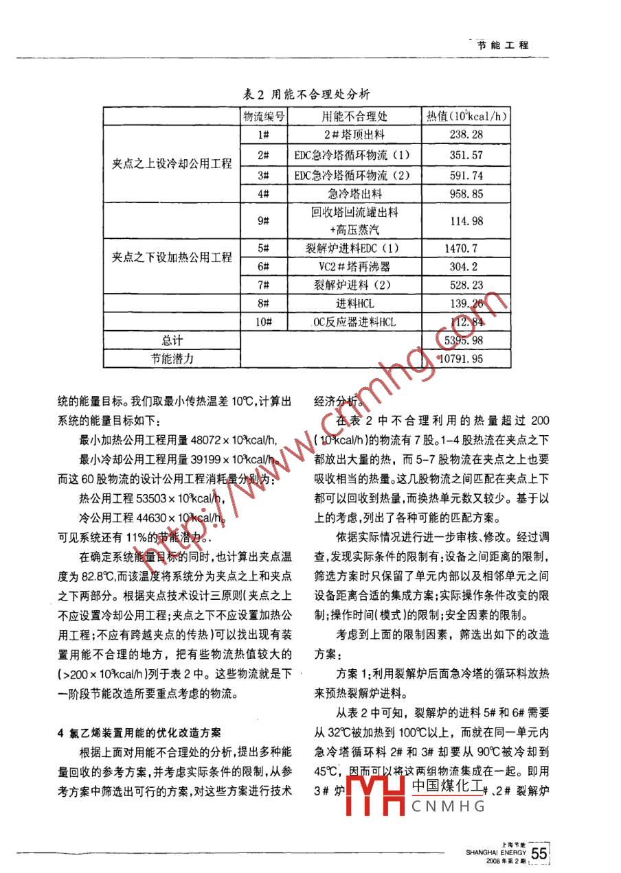 節(jié)能工程氯乙烯生產(chǎn)中能量的優(yōu)化集成上海氯堿化工股份有限公司金玉華摘要: 通過對換熱網(wǎng)絡夾點技術的分析應用,提出了公司氯乙烯裝置用能的優(yōu)化節(jié)能改造方案,進一步提高熱能利用效率,肯定了運用過程系統(tǒng)能量的的優(yōu)化集成技術所帶來的節(jié)能效應,使企業(yè)達到降低能耗、增加效益、提高能源利用率的目的。關鍵詞:夾點技術;換熱網(wǎng)絡技術分析;系統(tǒng)節(jié)能優(yōu)化;節(jié)能降耗The application of energy optimization and integration in chlorethyleneproducing processBy jin YuhuaAbstract: By analysis of heat exchange network pinch point technology, the authorbrings forward the creative solution of energy optimization and integration in chlorethyleneproducing process, which improves energy eficiency and confirms the energy saving effect thatis obtained in the process of using system energy optimization and integration technology. It'sgoal is to reduce company s cost, enhance company's profit and improve energy efficiency.Keywords: pinch point technology; analysis of heat exchange network; system energysaving optimization; energy saving and waste- -gas reducing1前言找出夾點不允許通過夾點換熱;再以最少換熱設備上海氯堿化工股份有限公司是一個現(xiàn)代化的數(shù)為 目標,對初始網(wǎng)絡進行調(diào)優(yōu),以減少換熱設備數(shù)特大型化工企業(yè),全年消耗水、電汽、燃料油達70及設備 投資費用,從而獲得-個最優(yōu)或 接近最優(yōu)的萬噸標準煤,能源成本30%以上,節(jié)能降耗潛力很換熱網(wǎng)絡。 夾點技術以熱力學理論為基礎,形成了大。節(jié)約能源是實現(xiàn)可持續(xù)發(fā)展、提高企業(yè)競爭力較為 系統(tǒng)的理論基礎。使用實踐證明,該技術對換的基本保證。應用能量的優(yōu)化集成技術,通過對公熱 器網(wǎng)絡的最優(yōu)綜合簡單有效,很有應用前景。司用熱設備和放熱設備的用能匹配改造后,系統(tǒng)的當冷熱復合曲線同時出現(xiàn)在T-H圖上時,兩用能可望明顯減少,進而提高余能余熱回收水平,條曲線的相對位置有三種不同的情況。是實現(xiàn)公司系統(tǒng)節(jié)能優(yōu)化,能耗進- -步 下降的有效如圖1(a)所示,全部冷物流由加熱公用工程措施。加熱,全部熱流由冷卻公用工程冷卻,過程中的熱量全部沒有回收。此時,加熱公用工程所提供的熱2換熱網(wǎng)絡的夾點.量Qh和冷卻公用工程所提供的冷卻量Qc為最夾點技術的核心是根據(jù)能量目標構造- -個具大。有最大能量回收特性的換熱初始網(wǎng)絡,其基本點是中國煤化工平移,則熱流所YHCNMHGSHANGHAI ENERGY 532008年第2期節(jié)能工程放出的一部分熱量可以用來加熱冷物流,所以加熱夾點之上和夾點之下。夾點之上是熱端,只有換熱公用工程所提供的熱量Qh和冷卻公用工程所提和加熱公用工程,沒有任何熱量流出,可看成是一供的冷卻量Qc均相應減少。但此時由于是以最高個熱阱 ;夾點之下是冷端,只有換熱和冷卻公用工溫度的熱流加熱最低溫度的冷流,傳熱溫差很大,程 ,沒有任何熱量流入,可看成是一個熱源;在夾點可回收利用的余熱Qr也有限。處,熱流量為零。如果繼續(xù)移動冷復合曲線至圖1 (c)所示位如果發(fā)生跨越夾點的熱量傳遞a,即夾點之置,使兩條復合曲線幾乎在某點重合,此時,加熱公上熱物流與夾點之下冷物流進行換熱匹配,則根據(jù)用工程所提供的熱量Qh和冷卻公用工程所提供夾點上下子系統(tǒng)的熱平衡可知,夾點之上的加熱公的冷卻量Qc均達到最小,所回收的熱量Qr達到用工程量和夾點之下的冷卻公用工程量均相應的最大。冷熱復合曲線在某點重合時該系統(tǒng)內(nèi)部換熱增加 a。因此,為達到最小公用工程用量,夾點方的極限,重合即該點的傳熱溫差為零,該點即為夾法的設計 原則是:點。1)夾點之上不應設置任何公用工程冷卻器;夾點的出現(xiàn)將整個換熱網(wǎng)絡分成了兩個部分:2)夾點之下不應設置任何公用工程加熱器;3)不應有跨越夾點的傳熱。T↑(a)3氯乙烯裝置用能不合理處分析公司的氯乙烯生產(chǎn)裝置已經(jīng)具備了年產(chǎn)40萬噸的產(chǎn)能。裝置采用日本三井東亞公司技術,在不斷的擴產(chǎn)過程中,進行了節(jié)能技術改造,其中平衡2HH氧氯化單元和裂解單元采用德國專利商的冷急冷技術及熱急冷技術。↑(b)在整個聚氯乙烯生產(chǎn)過程程中,氯乙烯裝置的用能占了整個生產(chǎn)用能的50%(見表1)。表1氯乙烯裝置公用工程月耗量公用工程消耗量(t)] 占全廠 同類項目總能耗比例(%) ]低壓蒸汽1730230.0中壓蒸汽|1572978.6循環(huán)水1065.07 萬58.7↑(e)連續(xù)操作的換熱器為交換熱量,使介質(zhì)達到工藝所需溫度的重要耗能設備。熱量交換的對象是流程中的物流。我們將這些物流分為吸收熱量的冷物| 夾點流和放出熱量的熱物流。我們一共從流程中提取了27股熱物流和33股冷物流(這些物流在熱量交換◆H時,不會影響分離效果)。QeQar根據(jù)現(xiàn)有換熱網(wǎng)絡的情況,并設定最小傳熱溫差中國煤化工軟件計算出系團1換熱系統(tǒng)的集成YHCNMHG! 54 SHANGHAI ENERGY2008年第2期節(jié)能工程表2用能不合理處分析| 物流編號用能不合理處熱值(10'kcal/h)2#塔頂出料238. 282#EDC急冷塔循環(huán)物流(1)351. 57夾點之上設冷卻公用工程3EDC急冷塔循環(huán)物流(2)591.74急冷塔出料958. 85回收塔回流罐出料9114. 98+高壓蒸汽5裂解爐進料EDC (1