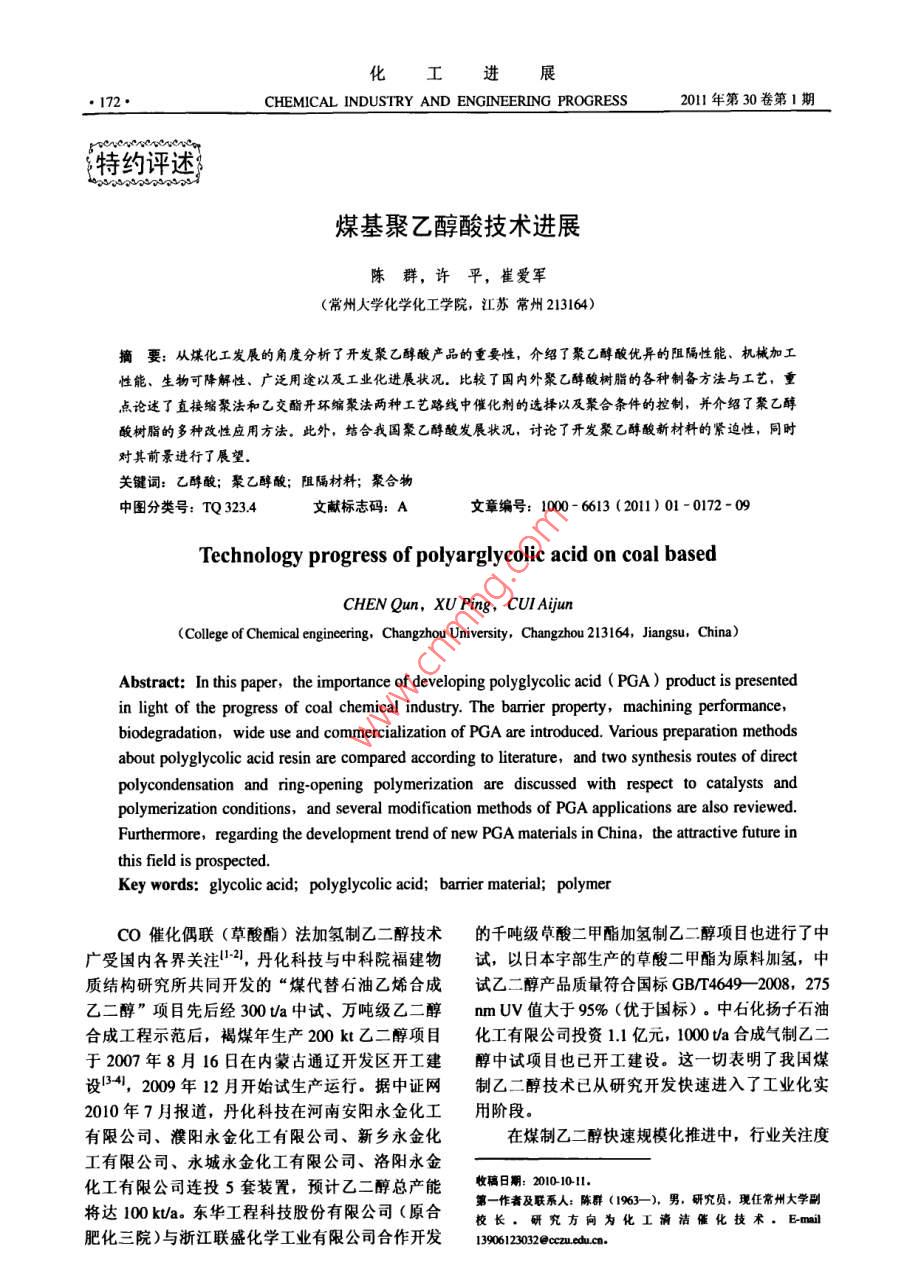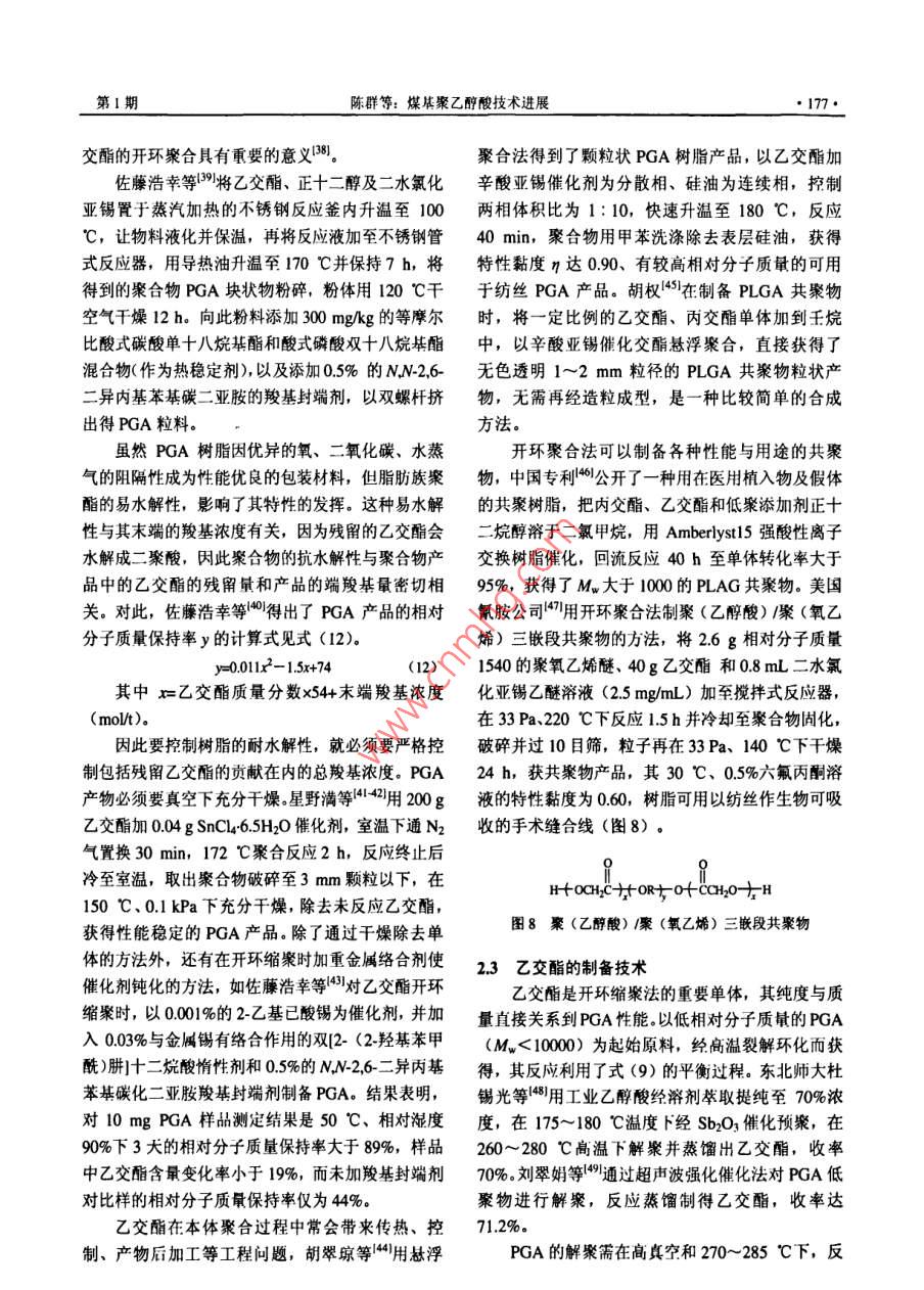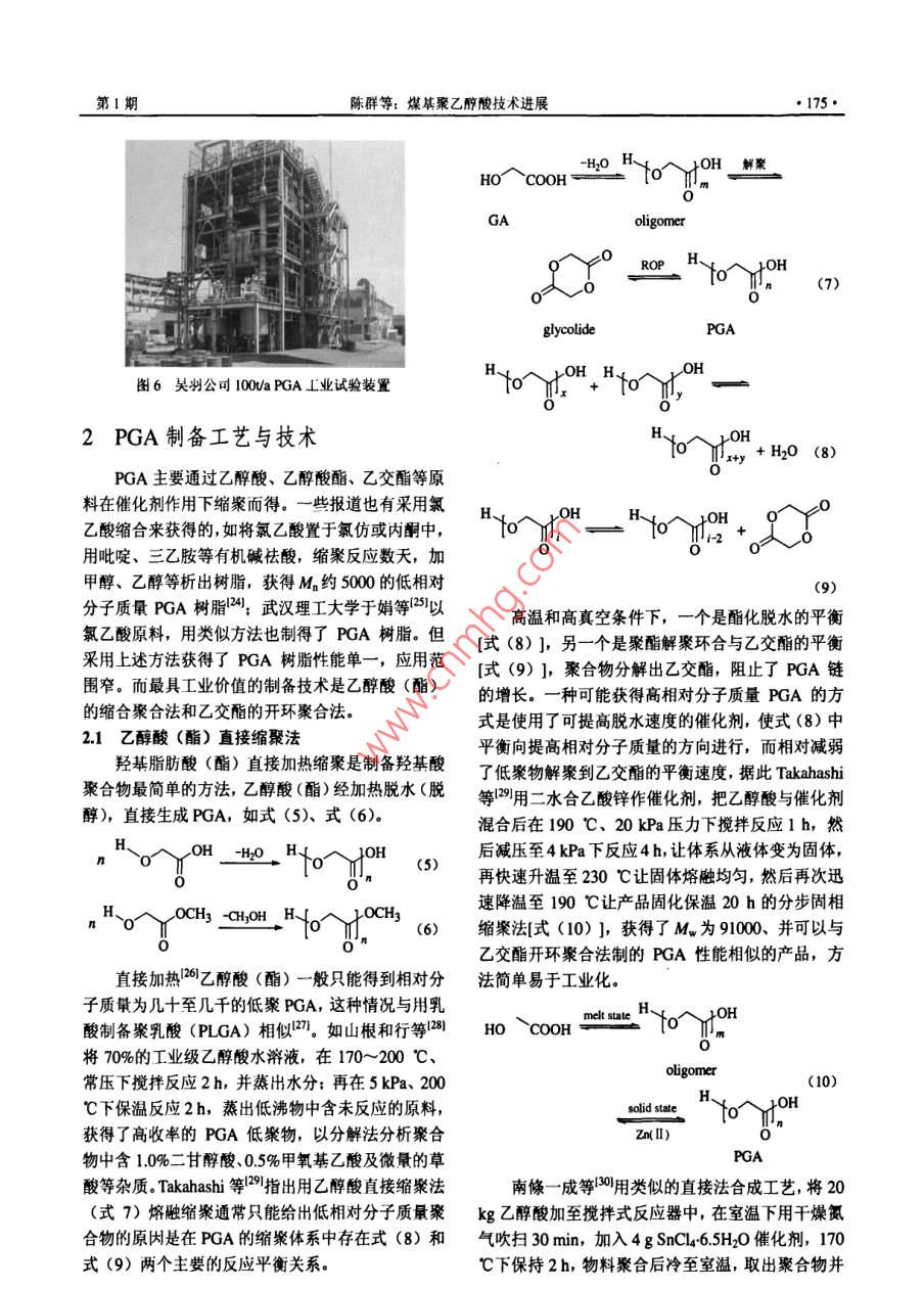 化工進·172CHEMICAL INDUSTRY AND ENGINEERING PROGRESS2011年第30卷第1特約評述煤基聚乙醇酸技術進展陳群,許平,崔愛軍(常州大學化學化工學院,江蘇常州213164)要:從煤化工發(fā)展的角度分析了開發(fā)聚乙醇酸產品的重要性,介紹了聚乙醇酸優(yōu)異的阻隔性能、機槭加工生物可降解性、廣泛用途以及工業(yè)化進展狀況。比較了國內外聚乙醇酸樹脂的各種制備方法與工藝,重點論述了直接縮聚法和乙交酯開環(huán)縮聚法兩種工藝路線中催化劑的選擇以及聚合條件的控制,并介紹了聚乙醇酸樹脂的多種改性應用方法。此外,結合我國聚乙醇酸發(fā)展狀況,討論了開發(fā)聚乙醇酸新材桿的緊迫性,同時對其前景進行了展望。關鍵詞:乙醇酸;聚乙醇酸;阻隔材料;聚合物中圖分類號:TQ3234文獻標志碼:A文章編號:1000-6613(2011)01-0172-09Technology progress of polyarglycolic acid on coal basedCHEN Qun, XU Ping, CUl AijunCollege of Chemical engineering, Changzhou University, Changzhou 213164, Jiangsu, China)Abstract: In this paper, the importance of developing polyglycolic acid(PGA)product is presentedin light of the progress of coal chemical industry. The barrier property, machining performancebiodegradation,wide use and commercialization of PGa are introduced. Various preparation methodsabout polyglycolic acid resin are compared according to literature, and two synthesis routes of directco d iti ns od seve al modification meth ods o pga applications are also reviewedFurthermore, regarding the development trend of new PGA materials in China, the attractive future inthis field is prospectedKey words: glycolic acid; polyglycolic acid; barrier material; polymerco催化偶聯(lián)(草酸酯)法加氫制乙二醇技術的千噸級草酸二甲酯加氫制乙二醇項目也進行了中廣受國內各界關注12,丹化科技與中科院福建物試,以日本宇部生產的草酸二甲酯為原料加氫,中質結構研究所共同開發(fā)的“煤代替石油乙烯合成試乙二醇產品質量符合國標GB/T46492008,275乙二醇”項目先后經300如a中試、萬噸級乙二醇mUV值大于95%(優(yōu)于國標)。中石化揚子石油合成工程示范后,褐煤年生產200kt乙二醇項目化工有限公司投資11億元,1000a合成氣制乙二于2007年8月16日在內蒙占通遼開發(fā)區(qū)開工建醇中試項目也已開工建設。這一切表明了我國煤設14,2009年12月開始試生產運行。據中證網制乙二醇技術已從研究開發(fā)快速進入了工業(yè)化實2010年7月報道,丹化科技在河南安陽永金化工用階段。有限公司、濮陽永金化工有限公司、新鄉(xiāng)永金化在煤制乙二醇快速規(guī)?;七M中,行業(yè)關注度工有限公司、永城永金化工有限公司、洛陽永金化工有限公司連投5套裝置,預計乙二醇總產能收福日:20010第一作者及聯(lián)系人:陳群(1963-),男,研究員,現(xiàn)任常州大學副將達100kUa,東華工程科技股份有限公司(原合長,研究方向為化工清清催化技.Em肥化三院)與浙江聯(lián)盛化學工業(yè)有限公司合作開發(fā)19∞61232@ccu.edu.cn第1期陳群等:煤林聚乙醉酸技術進展最高的是產品質量和生產成本,但隨著乙二醇生產11絕佳的氣體阻隔性的不斷規(guī)?;?大量工藝副產物的開發(fā)利用將成為圖2是PGA樹脂與其它材料的氧透過率與水裝置運行的瓶頸,如乙醇酸酯及低聚乙醇酸的應用蒸氣透過率比較,表明了PGA對氧氣和水蒸氣的與深加工將對煤制乙二醇成本帶來影響眾所周知,阻隔性是PET的100倍和PLA的10倍。PGA對煤制乙二醇的原理如式(1)~式(4)所示。氣體的阻隔性基本不受環(huán)境溫度影響,是制造多層Co+2RONO→(C00R)2+2NO(1)PET碳酸飲料(啤酒)瓶的優(yōu)先材料,使用PGA2NO+O2+2ROH 2RONO +H20 (2)阻隔芯層的PET瓶可減少20%的PET用料,將成為各類飲料和防腐食品包裝的理想選擇(COORh +4H2 -(CH2OH)+2 ROH (3)2c0+方O2+4H2(CH2OH2+H20(日本宇部興產和美國聯(lián)合碳化物公司的專利對該方法與技術進行了詳細介紹。通常草酸二甲酯加氫轉化率≥98%,乙二醇選擇性≥95%,乙醇酸甲酯及其低聚物的產量與催化劑活性、選擇性王導二E,EVOHˇrFKNy-MXD PVDF及裝置運行負荷有關,平井浩一認為乙醇酸甲PVDCHDPE酯與加氫深度和加氫選擇性有關。國內還未見就煤法乙二醇工藝中的乙醇酸甲酯副產物如何開發(fā)00|00010000100000OTR/cm'. m"( d, I atm, 30 C, 80%RH利用等的報道。長期以來,工業(yè)乙醇酸的生產方法是甲醛與氰化氫酸催化制羥基乙腈冉水解獲得圖2PGA樹脂與其它材料的O2TR/wVTR對比圖的,如杜邦等用腈水解酶水解羥基乙腈來獲得膜厚20)乙醇酸,在美國建有工業(yè)裝置,但該法工藝過程1.2優(yōu)良的機械性能長,成本高。針對當前我國煤化工發(fā)展現(xiàn)狀,作圖3、圖4列出了PGA樹脂與其它幾種常用合者認為,應當充分利用好現(xiàn)有乙二醉技術及裝置成樹脂的彎曲強度與拉伸強度的對比,表明了它是產能的優(yōu)勢,開發(fā)低成本的乙醇酸甲酯與低聚乙種機械性能出色的合成樹脂,可配合多種其它高醇酸副產物的衍生產品與用途,圍繞聚乙醇酸類分子材料用于擠壓與射出成型。實驗室測定的PGA產品、性能、應用、工業(yè)化開發(fā)組織力量進行技術攻關,以填補我國在高性能聚乙醇酸材料研究13出色的可生物降解性低相對分子質量的PGA是理想的微生物降解進行了總結。誘發(fā)劑,具有微生物降解和水降解特點,無毒并最1聚乙醇酸樹脂性能、應用與工業(yè)化終分解為水和二氧化碳,是世界公認保護地球環(huán)境聚乙醇酸(簡稱PGA)是一種單元碳數最少■末增強