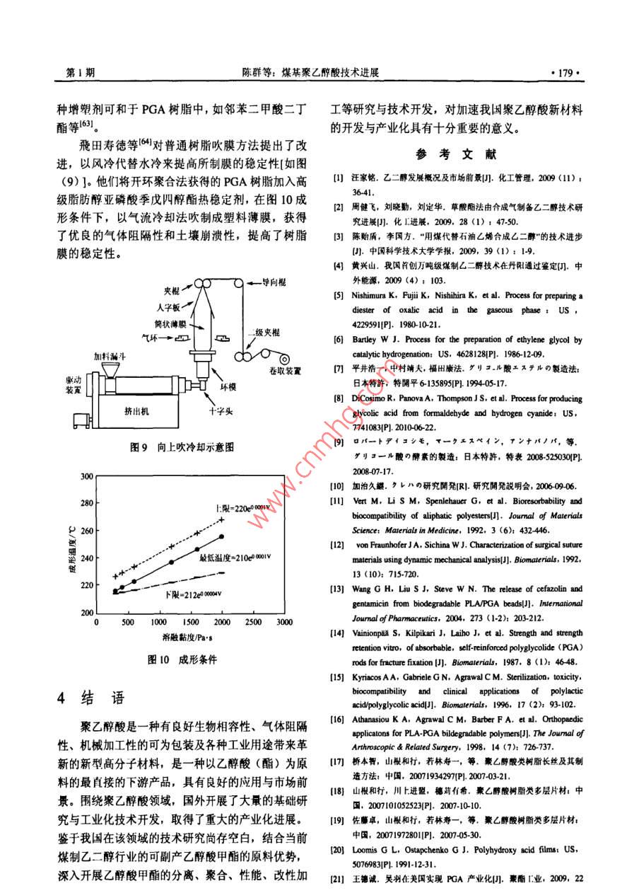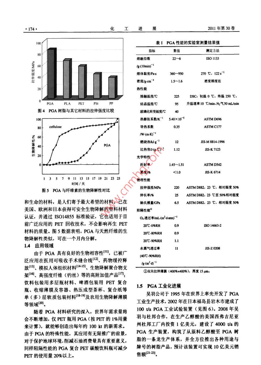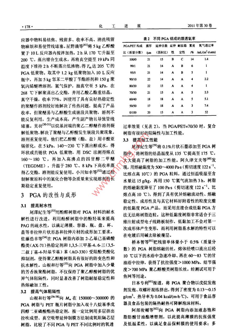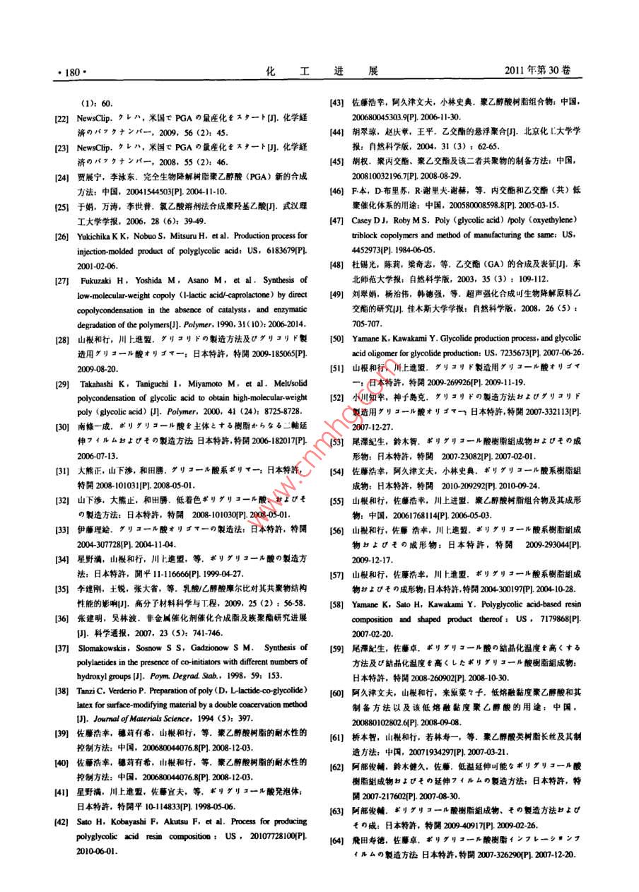 化工進·172CHEMICAL INDUSTRY AND ENGINEERING PROGRESS2011年第30卷第1特約評述煤基聚乙醇酸技術進展陳群,許平,崔愛軍(常州大學化學化工學院,江蘇常州213164)要:從煤化工發(fā)展的角度分析了開發(fā)聚乙醇酸產品的重要性,介紹了聚乙醇酸優(yōu)異的阻隔性能、機槭加工生物可降解性、廣泛用途以及工業(yè)化進展狀況。比較了國內外聚乙醇酸樹脂的各種制備方法與工藝,重點論述了直接縮聚法和乙交酯開環(huán)縮聚法兩種工藝路線中催化劑的選擇以及聚合條件的控制,并介紹了聚乙醇酸樹脂的多種改性應用方法。此外,結合我國聚乙醇酸發(fā)展狀況,討論了開發(fā)聚乙醇酸新材桿的緊迫性,同時對其前景進行了展望。關鍵詞:乙醇酸;聚乙醇酸;阻隔材料;聚合物中圖分類號:TQ3234文獻標志碼:A文章編號:1000-6613(2011)01-0172-09Technology progress of polyarglycolic acid on coal basedCHEN Qun, XU Ping, CUl AijunCollege of Chemical engineering, Changzhou University, Changzhou 213164, Jiangsu, China)Abstract: In this paper, the importance of developing polyglycolic acid(PGA)product is presentedin light of the progress of coal chemical industry. The barrier property, machining performancebiodegradation,wide use and commercialization of PGa are introduced. Various preparation methodsabout polyglycolic acid resin are compared according to literature, and two synthesis routes of directco d iti ns od seve al modification meth ods o pga applications are also reviewedFurthermore, regarding the development trend of new PGA materials in China, the attractive future inthis field is prospectedKey words: glycolic acid; polyglycolic acid; barrier material; polymerco催化偶聯(lián)(草酸酯)法加氫制乙二醇技術的千噸級草酸二甲酯加氫制乙二醇項目也進行了中廣受國內各界關注12,丹化科技與中科院福建物試,以日本宇部生產的草酸二甲酯為原料加氫,中質結構研究所共同開發(fā)的“煤代替石油乙烯合成試乙二醇產品質量符合國標GB/T46492008,275乙二醇”項目先后經300如a中試、萬噸級乙二醇mUV值大于95%(優(yōu)于國標)。中石化揚子石油合成工程示范后,褐煤年生產200kt乙二醇項目化工有限公司投資11億元,1000a合成氣制乙二于2007年8月16日在內蒙占通遼開發(fā)區(qū)開工建醇中試項目也已開工建設。這一切表明了我國煤設14,2009年12月開始試生產運行。據中證網制乙二醇技術已從研究開發(fā)快速進入了工業(yè)化實2010年7月報道,丹化科技在河南安陽永金化工用階段。有限公司、濮陽永金化工有限公司、新鄉(xiāng)永金化在煤制乙二醇快速規(guī)?;七M中,行業(yè)關注度工有限公司、永城永金化工有限公司、洛陽永金化工有限公司連投5套裝置,預計乙二醇總產能收福日:20010第一作者及聯(lián)系人:陳群(1963-),男,研究員,現(xiàn)任常州大學副將達100kUa,東華工程科技股份有限公司(原合長,研究方向為化工清清催化技.Em肥化三院)與浙江聯(lián)盛化學工業(yè)有限公司合作開發(fā)19∞61232@ccu.edu.cn第1期陳群等:煤林聚乙醉酸技術進展最高的是產品質量和生產成本,但隨著乙二醇生產11絕佳的氣體阻隔性的不斷規(guī)?;?大量工藝副產物的開發(fā)利用將成為圖2是PGA樹脂與其它材料的氧透過率與水裝置運行的瓶頸,如乙醇酸酯及低聚乙醇酸的應用蒸氣透過率比較,表明了PGA對氧氣和水蒸氣的與深加工將對煤制乙二醇成本帶來影響眾所周知,阻隔性是PET的100倍和PLA的10倍。PGA對煤制乙二醇的原理如式(1)~式(4)所示。氣體的阻隔性基本不受環(huán)境溫度影響,是制造多層Co+2RONO→(C00R)2+2NO(1)PET碳酸飲料(啤酒)瓶的優(yōu)先材料,使用PGA2NO+O2+2ROH 2RONO +H20 (2)阻隔芯層的PET瓶可減少20%的PET用料,將成為各類飲料和防腐食品包裝的理想選擇(COORh +4H2 -(CH2OH)+2 ROH (3)2c0+方O2+4H2(CH2OH2+H20(日本宇部興產和美國聯(lián)合碳化物公司的專利對該方法與技術進行了詳細介紹。通常草酸二甲酯加氫轉化率≥98%,乙二醇選擇性≥95%,乙醇酸甲酯及其低聚物的產量與催化劑活性、選擇性王導二E,EVOHˇrFKNy-MXD PVDF及裝置運行負荷有關,平井浩一認為乙醇酸甲PVDCHDPE酯與加氫深度和加氫選擇性有關。國內還未見就煤法乙二醇工藝中的乙醇酸甲酯副產物如何開發(fā)00|00010000100000OTR/cm'. m"( d, I atm, 30 C, 80%RH利用等的報道。長期以來,工業(yè)乙醇酸的生產方法是甲醛與氰化氫酸催化制羥基乙腈冉水解獲得圖2PGA樹脂與其它材料的O2TR/wVTR對比圖的,如杜邦等用腈水解酶水解羥基乙腈來獲得膜厚20)乙醇酸,在美國建有工業(yè)裝置,但該法工藝過程1.2優(yōu)良的機械性能長,成本高。針對當前我國煤化工發(fā)展現(xiàn)狀,作圖3、圖4列出了PGA樹脂與其它幾種常用合者認為,應當充分利用好現(xiàn)有乙二醉技術及裝置成樹脂的彎曲強度與拉伸強度的對比,表明了它是產能的優(yōu)勢,開發(fā)低成本的乙醇酸甲酯與低聚乙種機械性能出色的合成樹脂,可配合多種其它高醇酸副產物的衍生產品與用途,圍繞聚乙醇酸類分子材料用于擠壓與射出成型。實驗室測定的PGA產品、性能、應用、工業(yè)化開發(fā)組織力量進行技術攻關,以填補我國在高性能聚乙醇酸材料研究13出色的可生物降解性低相對分子質量的PGA是理想的微生物降解進行了總結。誘發(fā)劑,具有微生物降解和水降解特點,無毒并最1聚乙醇酸樹脂性能、應用與工業(yè)化終分解為水和二氧化碳,是世界公認保護地球環(huán)境聚乙醇酸(簡稱PGA)是一種單元碳數最少■末增強