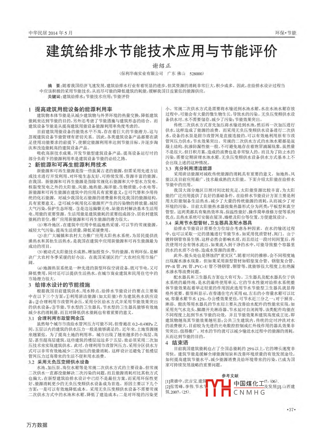 中華民居2014年5月環(huán)?!す?jié)能建筑給排水節(jié)能技術(shù)應(yīng)用與節(jié)能評價謝紹正(保利華南實業(yè)有限公司廣東佛山528000摘要:隨著我國經(jīng)濟飛速發(fā)展,建筑給排水行業(yè)有著明顯的進步,但其資源的消耗非常巨大,積少成多。因此,在給排水設(shè)計過程當(dāng)中應(yīng)該積極的采用節(jié)能技術(shù),從而盡可能的降低建筑的耗能,緩解我國日益緊張的能源供應(yīng)。關(guān)鍵詞:建筑給排水;節(jié)能技術(shù)應(yīng)用;節(jié)能評價1提高建筑用能設(shè)備的能源利用率小。常規(guī)二次供水方式是需要將水輸送到水池水箱,水在水池水箱存放建筑物本體節(jié)能是從減少建筑物與外界環(huán)境的熱量交換降低建筑過程中,可能會有大量的微生物生長,導(dǎo)致水的污染,無負(fù)壓變頻供水設(shè)能耗來達到節(jié)能的目的,另外還考慮了節(jié)能措施與建筑形態(tài)的結(jié)合。而備供水時,水不需要儲存,減少了污染;節(jié)能效果突出建筑設(shè)備節(jié)能是從提高建筑用能設(shè)備能源利用率角度考慮的。傳統(tǒng)二次供水方式首先加壓將水輸送到水池,然后再一次加壓進行目前建筑用能設(shè)備的能效水平不高,存在著巨大的節(jié)能潛力,這與供水,這樣造成了能源的浪費而采用無負(fù)壓變頻供水設(shè)備進行二次供忽視建筑設(shè)備節(jié)能管理有密切關(guān)系。因此,各類建筑設(shè)備產(chǎn)品都要在滿水,設(shè)備的水泵是跟市政管網(wǎng)是直接連接的,可以有效地利用原有市政足使用功能要求的前提下,使穎定能源利用率達到節(jié)能目標(biāo),并逐步淘管網(wǎng)壓力供水;節(jié)水效果突出:常規(guī)的二次供水方式的水池水箱都是混吸收高新技術(shù)成果開發(fā)節(jié)能型建筑設(shè)備產(chǎn)品,提高設(shè)備運行時的不是很大,但日積月累造成的浪費也是非常驚人的而且為了防止水的部分負(fù)荷下的能源利用率是建筑設(shè)備節(jié)能的必經(jīng)之路會出現(xiàn)上述的這種情況新能源和可再生能是雖古老的能溉,但需采用先進方法3充分利用清潔能源或技術(shù)進行開發(fā)利用、對環(huán)境生態(tài)友好、可持續(xù)發(fā)展、資源豐富的能源。采用淸潔能源對減收傳統(tǒng)能源的消耗具有重要的意義,如地?zé)?、風(fēng)在我國,新能源和可再生能源是指除常規(guī)化石能源和大中型水力發(fā)電、能以及目前應(yīng)用最廣,技術(shù)最成熟的太陽能。下面介紹太陽能在給排水核裂變發(fā)電之外的太陽能、風(fēng)能地?zé)崮?海洋能、生物質(zhì)能、小水電等:節(jié)能中的應(yīng)用新能源和可再生能源在建筑中的應(yīng)用具有重要意義:①可代替和少用傳我國大部分地區(qū)日照時間比較充足,太陽能資源比較豐富,為太陽統(tǒng)的化石能源,對減少我國化石能源的消費量和優(yōu)化我國的能源結(jié)構(gòu)能的廣泛應(yīng)用提供了良好的基礎(chǔ)條件。在給排水節(jié)能設(shè)計方面主要是利具有重要意義。②可減少耗用化石能源所產(chǎn)生的污染物的排放量,減輕用太陽能制備生活熱水,減少了大量的傳統(tǒng)能源的消耗,從而減少了對大氣污染保護生態(tài)環(huán)境:③是邊遠偏僻無電能農(nóng)村解決基本生活用環(huán)境的污染,目前太陽能熱水器校集熱器形式分為兩類平板型和直空優(yōu)點,且熱水系統(tǒng)可安裝在屋頂、墻壁及陽臺等位置,方便建筑設(shè)計。④)寒冷地區(qū),在建筑中應(yīng)用中低溫地?zé)岵膳?可以節(jié)約常規(guī)能源,34采用節(jié)水型管材、衛(wèi)生器具及配水器具減輕大氣污染,提高生活質(zhì)量,降低采暖費用。給排水節(jié)能設(shè)計需要全方位綜合考慮各種因素,在水的輸送過程2)在廣大城鎮(zhèn)和農(nóng)村大力推廣應(yīng)用太陽熱水系統(tǒng),為居民提供洗中,也可以采取一定的措施進行節(jié)能節(jié)水,如采用優(yōu)質(zhì)管材閥門。由于澡熱水和其他生活熱水,是我國在建筑中應(yīng)用新能源和可再生能源最為鍍鋅鋼管容易生銹這樣必然會影響水質(zhì),而且經(jīng)過一段時間閑置后;再成功的項目。3被動式太陽能技術(shù)成熟、增加投資少、節(jié)約能源、有利環(huán)保,是解的水的水質(zhì)不合格這成水資源的良費廣大農(nóng)村冬季采暖的好辦法,在我國采暖區(qū)的廣大農(nóng)村應(yīng)用市場廣此外,接頭處也是銹蝕的“重災(zāi)區(qū)”,隨著時間的推移,會不同程度地闊出現(xiàn)漏水滲水現(xiàn)象,但如果采用新型管材如鋁塑復(fù)合管、鋼塑復(fù)合管4)地源熱泵系統(tǒng)是一種先進的新型環(huán)??照{(diào)設(shè)備,既可節(jié)電,又可PR管P管、PNCU管不銹鋼管、銅管等,就能夠很大程度上杜絕漏降低費用,同時還可以提供生活熱水,在城市商業(yè)建筑和民用住宅中的水滲水等浪費問題市場潛力很大配水器具和衛(wèi)生器具方面也大有可為。衛(wèi)生器具及配水器具位于供3給排水設(shè)計的節(jié)能措施水系統(tǒng)的最終端,是水的最終使用單元,它的節(jié)水性能對給排水系統(tǒng)整根據(jù)我國目前建筑供水、用水特點,給排水節(jié)能設(shè)計的要點主要集體節(jié)能效果起著舉足輕重的作用因此選用節(jié)水節(jié)能型衛(wèi)生器具就顯得格外重要。據(jù)資料顯示,在普通住宅內