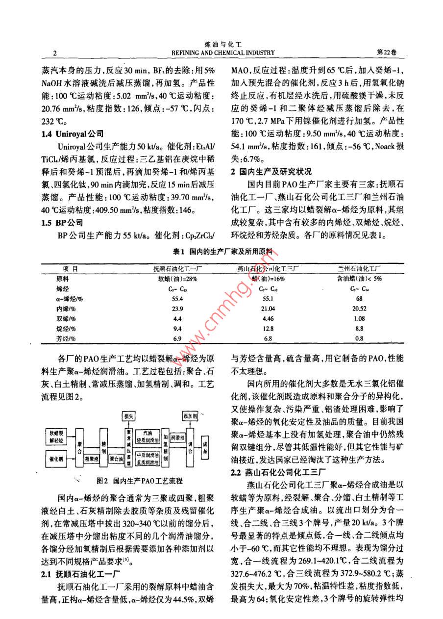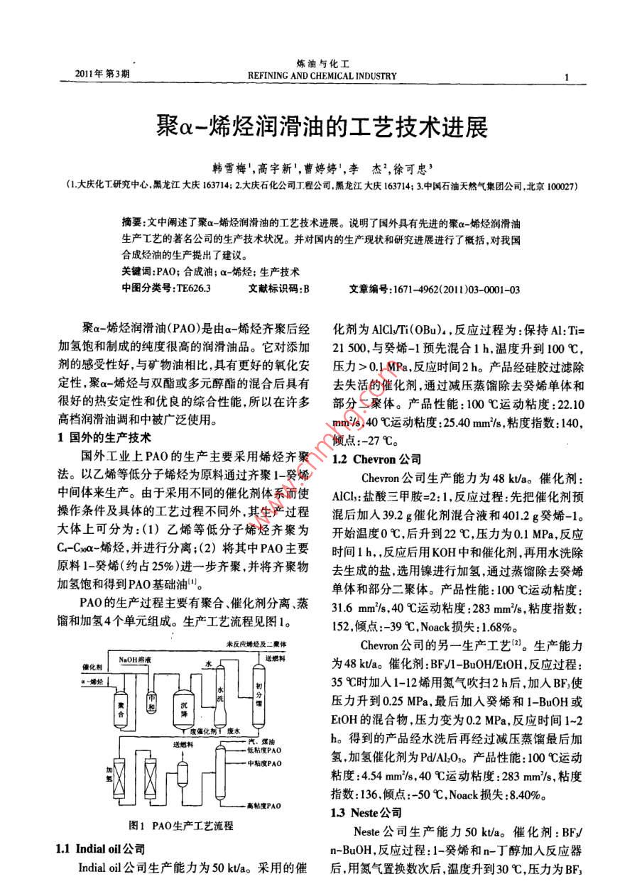 煉油與化工2011年第3期REFINING AND CHEMICAL INDUSTRY1聚a-烯烴潤滑油的工藝技術(shù)進展韓雪梅',高宇新',曹婷婷',李杰',徐可忠3(1.大慶化工研究中心,黑龍江大慶163714; 2.大慶石化公司工程公司,黑龍江大慶163714; 3.中國石油天然氣集團公司,北京1002)摘要:文中闌述了聚a-烯烴潤滑油的工藝技術(shù)進展。說明了國外具有先進的聚ax烯烴潤滑油生產(chǎn)T藝的著名公司的生產(chǎn)技術(shù)狀況。并對國內(nèi)的生產(chǎn)現(xiàn)狀和研究進展進行了概括,對我國合成烴油的生產(chǎn)提出了建議。關(guān)鍵詞:PAO;合成油;a烯烴;生產(chǎn)技術(shù)中圖分類號:TE626.3文獻標(biāo)識碼:B文章編號:1671- 4962(2011)03-0001-03聚a-烯烴潤滑油(PAO)是由a-烯烴齊聚后經(jīng)化劑為AlCI/Ti(OBu).,反應(yīng)過程為:保持Al:Ti=加氫飽和制成的純度很高的潤滑油品。它對添加21 500,與癸烯-1預(yù)先混合1h,溫度升到100 C,劑的感受性好,與礦物油相比,具有更好的氧化安壓力> 0.1 MPa,反應(yīng)時間2h。產(chǎn)品經(jīng)硅膠過濾除定性,聚a-烯烴與雙酯或多元醇酯的混合后具有去失活的催化劑,通過減壓蒸餾除去癸烯單體和很好的熱安定性和優(yōu)良的綜合性能,所以在許多部分二聚體。產(chǎn)品性能:100C運動粘度:2.10高檔潤滑油調(diào)和中被廣泛使用。mm/s, ,40 C運動粘度: 25.40 mm2/s,粘度指數(shù): 140,1國外的生產(chǎn)技術(shù)傾點:-27 C。國外工業(yè)上PAO的生產(chǎn)主要采用烯烴齊聚1.2 Chevron 公司法。以乙烯等低分子烯烴為原料通過齊聚1-癸烯Chevron公司生產(chǎn)能力為48kt/a。催化劑:;中間體來生產(chǎn)。由于采用不同的催化劑體系而使AlCl:鹽酸三甲胺=2:1,反應(yīng)過程:先把催化劑預(yù)操作條件及具體的工藝過程不同外,其生產(chǎn)過程混后加入39.2 g催化劑混合液和401.2 g癸烯-1。大體上可分為:(1)乙烯等低分子烯烴齊聚為開始溫度0 C,后升到22 C,壓力為0.1 MPa,反應(yīng)C-CxQx-烯烴,并進行分離;(2)將其中PAO主要時間1 h, ,反應(yīng)后用KOH中和催化劑,再用水洗除原料1-癸烯(約占25%)進一步齊聚,并將齊聚物生成的鹽,選用鎳進行加氫,通過蒸餾除去癸烯加氫飽和得到PAO基礎(chǔ)油"。單體和部分二聚體。產(chǎn)品性能: 100 C運動粘度: .PAO的生產(chǎn)過程主要有聚合、催化劑分離、蒸31.6 mm2/s, 40 C運動粘度:283 mm'/s,粘度指數(shù):餾和加氫4個單元組成。生產(chǎn)工藝流程見圖1。152,傾點:-39 C, Noack損失: 1.68%。未反應(yīng)嫌烴及二秦體Chevron公司的另- -生產(chǎn)工藝2。生產(chǎn)能力使化劑NaOH溶液水I送燃料為48 ktao催化劑: BF/1-Bu0H/EtOH,反應(yīng)過程:a-娜烴35 C時加入1-12烯用氮氣吹掃2h后,加人BF使壓力升到0.25MPa,最后加入癸烯和1-BuOH或Et0H的混合物,壓力變?yōu)?.2MPa,反應(yīng)時間1~2h。得到的產(chǎn)品經(jīng)水洗后再經(jīng)過減壓蒸餾最后加送燃料氫,加氫催化劑為Pd/Al20s。產(chǎn)品性能: 100 C運動中粘度PAO粘度:4.54 mm2/s, 40 C運動粘度:283 mm'/s,粘度指數(shù): 136.傾點:-50 C, Noack損失:8.40%。-高粘度PAO1.3 Neste公司圖1 PA0生產(chǎn)工藝流程Neste公司生產(chǎn)能力50kUa。催化劑:BFJ/1.1 Indial oil公司n-Bu0H,反應(yīng)過程:1-癸烯和n-丁醇加人反應(yīng)器Indial oil公司生產(chǎn)能力為50 kt/a。采用的催后,用氮氣置換數(shù)次后,溫度升到30 C,壓力為BF,煉油與化工2REFINING AND CHEMICAL INDUSTRY第22卷蒸汽本身的壓力,反應(yīng)30min,BF;的去除:用5%MAO,反應(yīng)過程:溫度升到65 C后,加入癸烯-1,NaOH水溶液堿洗后減壓蒸餾,再加氫。產(chǎn)品性加入預(yù)先混合的催化劑,反應(yīng)3 h后,用氫氧化鈉能:100 C運動粘度:5.02 mm2/s , 40 C運動粘度:終止反應(yīng),有機層經(jīng)水洗后,用硫酸鎂干燥,未反20.76 mm2/s, 粘度指數(shù):126,傾點:-57 C,閃點:應(yīng)的癸烯-1和二聚體經(jīng)減壓蒸餾后除去,在232 C。170 C,2.7 MPa下用鎳催化劑進行加氫。產(chǎn)品性14 Uniroyal公司能: 100 C運動粘度:9.50 mm'/s, 40 C運動粘度:Uniroyal公司生產(chǎn)能力50 kta。催化劑: EtAI/54.1 mm'/s,粘度指數(shù):161,傾點:- 56 C, Noack損TiCL/烯丙基氯,反應(yīng)過程:三乙基鋁在庚烷中稀;失:6.7%。釋后和癸烯-1預(yù)混后,再滴加癸烯-1和/烯丙基2國內(nèi)生產(chǎn)及研究狀況氯、四氯化鈦,90min內(nèi)滴加完,反應(yīng)15min后減壓國內(nèi)目前PAO生產(chǎn)廠家主要有三家;撫順石蒸餾。產(chǎn)品性能: 100 C運動粘度: 39.70 mm'/s,油化工一廠、燕山石化公司化工三廠和蘭州石油40 C運動粘度:409.50 mm2/s,粘度指數(shù): 146。化工廠。這三家均以蠟裂解ax-烯烴為原料,其組1.5 BP公司成較復(fù)雜,其中含有較多的內(nèi)烯烴、雙烯烴、烷烴、BP公司生產(chǎn)能力55 kU/ao催化劑: Cp:ZrCl/環(huán)烷烴和芳烴雜質(zhì)。各廠的原料情況見表1。表1國內(nèi)的生產(chǎn)廠家及所用原料項目撫順石油化工一廠燕山石化公司化工三廠蘭州石油化工廠軟蠟(油)=28%蜻(油)=16%含油蠟(油)< 5%烯烴Cr- CsCr~ CoCr~ Cua-烯烴%55.1 .68內(nèi)烯/%23.921.0420.52雙烯/%4,44.461.08烷烴/%).412.88.芳烴1% .,.96.0.各廠的PAO生產(chǎn)工藝均以蠟裂解a烯烴為原與芳烴含量高,硫含量高,用它制備的PAO,性能料生產(chǎn)聚a-烯烴潤滑油。工藝過程包括:聚合、石不太理想?;?、白土精制、常減壓蒸餾、加氫精制、調(diào)和。工藝國內(nèi)所用的催化劑大多數(shù)是無水三氯化鋁催流程見圖2。化劑,該催化劑既造成原料和聚合分子的異構(gòu)化,失]譚加刑又使操作