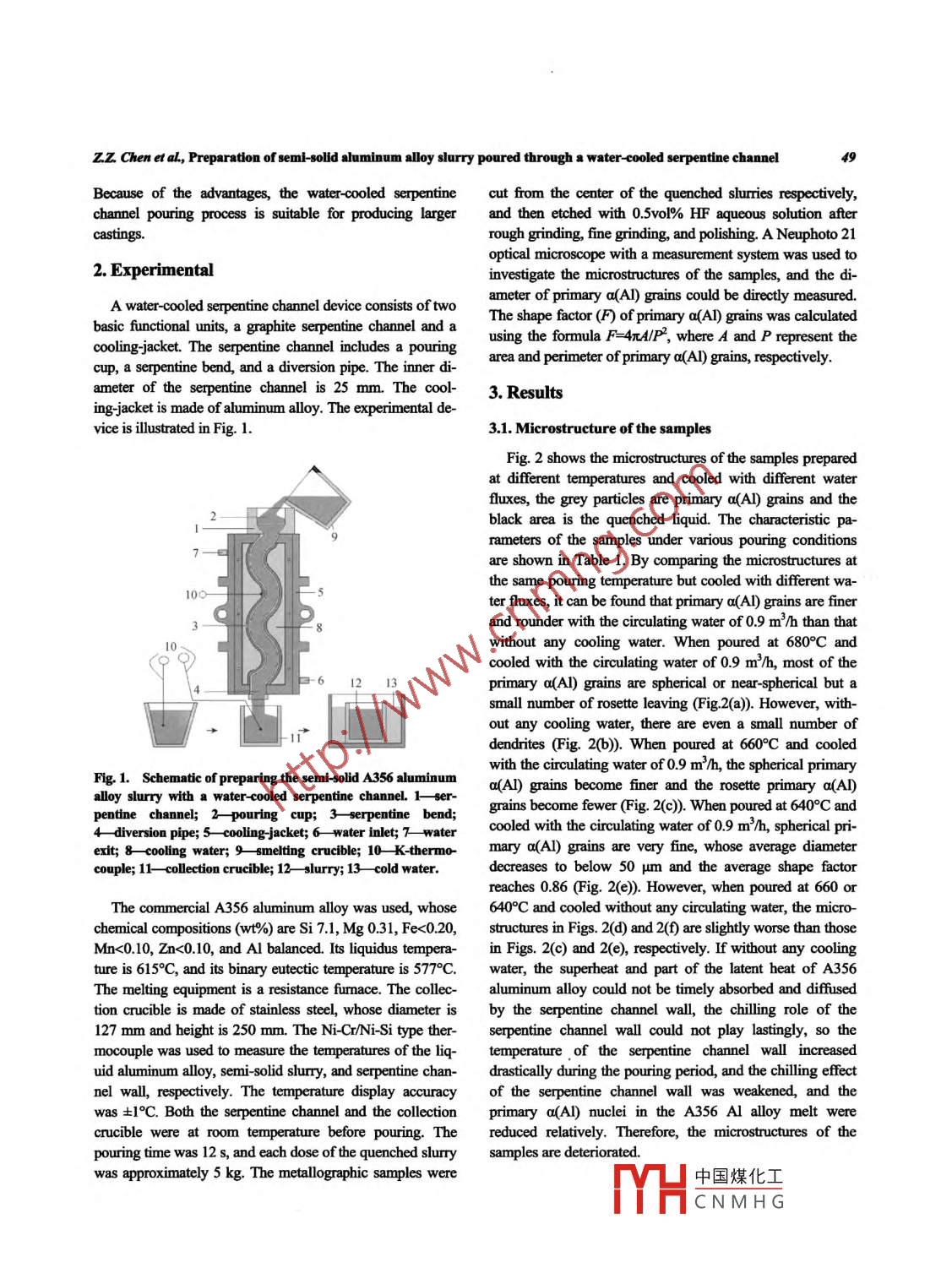 International Journal of Minerals, Metallurgy and MaterialsVolume 19, Number 1, Jan 2012, Page 48DOI: 10.1007/s12613-012-0513-6Preparation of semi-solid aluminum alloy slurry poured througha water-cooled serpentine channelZheng zhou Chen, Wei -min Mao, and Zong -chuang WuSchool of Materials Science and Engineeing, University of Science and Technology Bejing, Beijng 10083, China(Received: 10 January 2011; revised: 17 February 201; accepted: 6 March 2011)Abstract: A water-cooled serpentine channel pouring process was invented to produce semi-solid A356 aluminum alloy slurry for rheocast-ing, and the effects of pouring temperature and circulating cooling water flux on the microstructure of the slurry were investigated. The論sults show that at the pouring temperature of 640-6809C and the circulating cooling water flux of 0.9 m'/hn, the semi-solid A356 aluminumalloy slurry with spherical primary a(AI) grains can be obtained, whose shape factors are between 0.78 and 0.86 and the grain diametercanreach 48-68 um.When the pouring temperatures are at 660-680C, only a very thin solidifed shell remains inside the serpentine channel andcan be removed easily. When the serpentine channel is cooled with circulating water, the microstructure of the semi-solid slurry can be im-proved, and the serpentine channel is quickly cooled to room temperature after the completion of one pouring. In terms of the productivity ofthe special equipment, the water-cooled serpentine channel is economical and fficient.Keywords: semi-solid slurry; aluminum alloys; microstructure; rheocastingf China (No.50774007), the National High-Tech Re-search and Development Program of China (No.2006AA03Z115), and the National Basic Research Priorities Program of China(No.2011CB606302-1.)1. Introductioninvented according to the theories of“controlling nucleationand inhibting dendrtes growth" and“promoting the earlyThe theo- diecasting technique of semi -solid metal (SSM)solidification nucleation” [10], which have one commonwas put forward and researched by Flemings in the earlymerit that a special stiring device is cancelled, so these1970s [1], but owing to the difficulties of preservation andpreparation processes are simple, inexpensive, and have atransportation of SSM slurry, its development was very slowbroad prospect for application.over a long period of time. Meanwhile, the studies of SSMforming technology were mainly focused on thixo-diecas-Before this study, the preparation technology of SSMslurry through a serpentine channel has been introducedting or thixo-forging. Fortunately, several novel preparationmethods of SSM slury have been developed in recent dec-[11-12]. In this paper, an innovative preparation techniqueades, so much attention has been focused on rheoformingof SSM slurry, water-cooled serpentine channel pouringtechnologies again. These preparation processes include theprocess, is presented, which can produce satisfactory SSMcooling slope casting process [2-3], damper cooling tubeslurry with a larger volume. At an appropriate pouring tem-method (DCT) [4], cooling slope casting [5-6], vertical pipeperature, no solidified shell can form in the serpentinepouring process [7], vibrating wavelike sloping plate proc-channel after the pouring process. Moreover, the serpentineess [8], and low superheat pouring with a shear fieldchannel can be fast cooled to room temperature, which can(LSPSF) [9]. These preparation processes may have beenpromote the preparation efficiency of the special equipment.Corresponding author: Zheng zhou ChenE-mail: chzz19710425@126 com◎University of Science and Technology Bejing and Springer Verlag Berlin Heidelberg 2012包Springer中國煤化工MHCNMH G50Im. J. Miner. Metall Mater, VoL.19, No.I, Jan 2012(a)(b200 um(d)(e)(fFig. 2. Effects of pouring temperature and cooling water flux on the microstructure of semi-solid A356 alloy quenched slurries: (田)680°C, 0.9 m/h; (b) 680°C, 0 m/h; (C) 660°C, 0.9 m/n; (d) 660°C, 0 m/mn; (e) 640°C, 0.9 m/h; (D 640°C, 0 m2/h.After pouring at 680 or 660°C for 12 s, it was found thatthe channel, which miglno solidified shell remained in the serpentine channel, butThe experimental results show that when the water cooledwhen the pouring temperature was decreased to 640°C, theserpentine channel is used to produce the semi-solid A356solidified shell formed in the serpentine channel, as shownAl-alloy slurry, if the pouring temperature is appropriate, notin Fig.3. The left shell (Fig. 3(a)) is formed under the con-only can the microstructure of the samples be improveddition of no cooling water and the right shell Fig. 3(b)) isduring a longer pouring time, but also can the volume offormed with a cooling water flux of 0.9 m'/h. At the sameTable 1. Characteristics of the samples prepared under vari-pouring temperature and in the same pouring time, the vol-ous conditionsume of the solidified shell with the cooling water flux of0.9Pouring temperaure/9C680 680 660 660 640 640m2/h is larger than that without any cooling water. If the liq-uid A356 alloy was poured at a lower temperature and theCooling water fux/ (m2.hr) 0.9 0 0.9 0 0.9 0channel was cooled by water, the serpentine channel couldOutlet temperaure/°C611 61260860960660Shape factor0.78 0.75 0.82 0.80 0.86 0.84provide high cooling strength on the alloy, and the primarya(AI) nuclei could easily grow and adhere on the surface ofGain diameter/ um70_ 56624856中國煤化工TYHCNMHGz.Z. Chen etal, Preparation of semi-solid aluminum alay slurry poured through a water-cooled serpentine channel51ciency of the serpentine channel is acceptable.The temperatur-time variation curves and the criticaltemperature data of the serpentine channel wall are shown inFig. 4(b) and Table 2 when there is no circulating water inthe cooling-jacket. Pouring at 640°C for 12 s, the tempera-ture of the channel wall is 306°C. Owing to a thicker solidi-fied shell remaining in the serpentine channel, the maximumtemperature of the channel