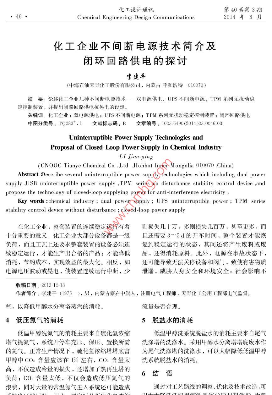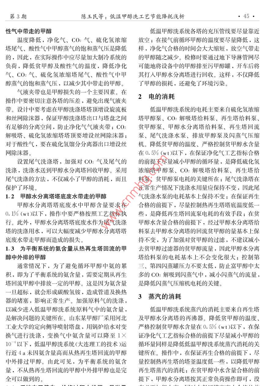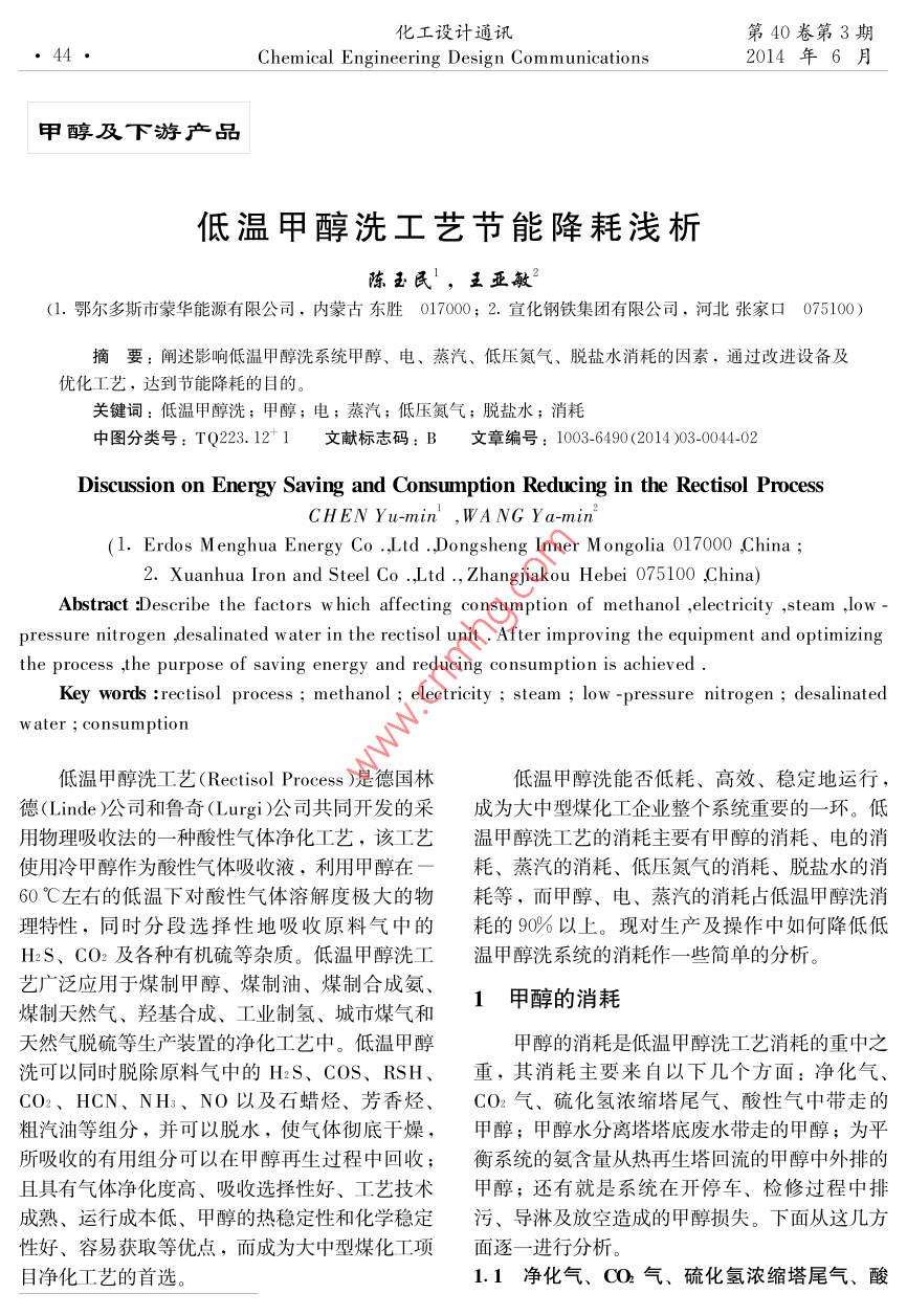 化工設計通訊第40卷第3期Chemical Engineering Design Communications2014年6月甲醇及下游產品低溫甲醇洗工藝節(jié)能降耗淺析陳民,王亞敏2(1.鄂爾多斯市蒙華能源有限公司,內蒙古東勝017000;2.宣化鋼鐵集團有限公司,河北張家口075100)摘要:闡述影響低溫甲醇洗系統(tǒng)甲醇、電、蒸汽、低壓氮氣、脫鹽水消耗的因素,通過改進設備及優(yōu)化工藝,達到節(jié)能降耗的目的。關鍵詞:低溫甲醇洗;甲醇;電;蒸汽;低壓氮氣;脫鹽水;消耗中圖分類號:TQ223.121文獻標志碼:B文章編號:1003-6490(201)0-004-02Discussion on Energy Saving and Consumption Reducing in the rectisol ProcessCHEN Yu-min,WANG Ya-min(1. Erdos Menghua Energy Co Ltd Dongsheng Inner Mongolia 017000 China;2. Xuanhua Iron and Steel Co, Ltd, Zhangjiakou Hebei 075100,China)bstract Describe the factors w hich affecting consumption of methanol, electricity steam,lovpressure nitrogen desalinated water in the rectisol unit. After improving the equipment and optimizingthe process the purpose of saving energy and reducing consumption is achievedKey words rectisol process; methanol electricity steam; low-pressure nitrogen desalinatewater consumption低溫甲醇洗工藝( Rectisol process)是德國林低溫甲醇洗能否低耗、髙效、穩(wěn)定地運行,德( Linde)公司和魯奇( Lurgi)公司共同開發(fā)的采成為大中型煤化工企業(yè)整個系統(tǒng)重要的一環(huán)。低用物理吸收法的一種酸性氣體浄化工藝,該工藝溫甲醇洗工藝的消耗主要有甲醇的消耗、電的消使用冷甲醇作為酸性氣體吸收液,利用甲醇在—耗、蒸汽的消耗、低壓氮氣的消耗、脫鹽水的消60℃左右的低溫下對酸性氣體溶解度極大的物耗等,而甲醇、電、蒸汽的消耗占低溫甲醇洗消理特性,同時分段選擇性地吸收原料氣中的耗的90%以上。現對生產及操作中如何降低低HS、CO及各種有機硫等雜質。低溫甲醇洗工溫甲醇洗系統(tǒng)的消耗作一些簡單的分析。藝廣泛應用于煤制甲醇、煤制油、煤制合成氨煤制天然氣、羥基合成、工業(yè)制氫、城市煤氣和1甲醇的消耗天然氣脫硫等生產裝置的凈化工藝中。低溫甲醇甲醇的消耗是低溫甲醇洗工藝消耗的重中之洗可以同時脫除原料氣中的H2S、COS、RSH、重,其消耗主要來自以下幾個方面:凈化氣CO、HCN、NH、No以及石蠟烴、芳香烴、CO2氣、硫化氫濃縮塔尾氣、酸性氣中帶走的粗汽油等組分,并可以脫水,使氣體徹底干燥,甲醇;甲醇水分離塔塔底廢水帶走的甲醇;為平所吸收的有用組分可以在甲醇再生過程中回收;衡系統(tǒng)的氨含量從熱再生塔回流的甲醇中外排的且具有氣體凈化度高、吸收選擇性好、工藝技術甲醇;還有就是系統(tǒng)在開停車、檢修過程中排成熟、運行成本低、甲醇的熱穩(wěn)定性和化學穩(wěn)定污、導淋及放空造成的甲醇損失。下面從這幾方性好、容易獲取等優(yōu)點,而成為大中型煤化工項面逐一進行分析目凈化工藝的首選1.1凈化氣、OO氣、硫化氫濃縮塔尾氣、酸第3期陳玉民等:低溫甲醇洗工藝節(jié)能降耗淺析性氣中帶走的甲醇低溫甲醇洗系統(tǒng)各塔的充壓管線要盡量靠近溫度降低,凈化氣、CO氣、硫化氫濃縮放空;在接氣前循環(huán)甲醇的溫度要盡量降低,這塔尾氣、酸性氣中甲醇蒸氣的飽和蒸氣壓是降低樣,凈化氣合格的時間會大大縮短,放空氣帶走的,因此,在實際操作中應盡量加大制冷系統(tǒng)的的甲醇隨之減少。檢修時要通過地下導淋管網盡負荷,降低貧甲醇及酸性氣的溫度,降低浄化可能地將設備中的甲醇排至污甲醇罐,開車后將氣、CO2氣、硫化氫濃縮塔尾氣、酸性氣中甲其打入甲醇水分離塔進行回收。這樣,不僅降低醇蒸氣的飽和蒸氣壓,以減少其中帶走的甲醇。了甲醇的損耗,還避免了環(huán)境污染。氣液夾帶也是甲醇損失的一個主要因素。在操作中要密切注意各塔的壓差,避免出現氣液夾2電的消耗帶。設計中要考慮在甲醇洗滌塔塔頂增設旋流板低溫甲醇洗系統(tǒng)的電耗主要來自硫化氫濃縮和絲網除沫器,保證甲醇洗滌塔岀口與塔盤之間塔甲醇泵、COε解吸塔給料泵、再生塔給料泵、有足夠的分離空間,防止浄化氣氣液夾帶;CO貧甲醇泵、甲醇水分離塔給料泵、再生塔回流解吸塔、硫化氫濃縮塔塔頂要増設絲網除沫器;泵、尾氣洗滌水泵、排放甲醇泵及閃蒸氣壓縮對于酸性氣,要在硫化氫餾分分離器出口增設絲機。降低貧甲醇的溫度、嚴格控制貧甲醇水含量網除沫器。在0.5%(wt)以下,在保證凈化氣工藝指標合格設置尾氣洗滌塔,加強對COε氣及尾氣的的前提下盡量減小甲醇的循環(huán)量,是降低硫化氫洗滌,洗滌水送到甲醇水分離塔回收甲醇。采用濃縮塔甲醇泵、COε解吸塔給料泵、再生塔給尾氣洗滌的方法,不僅減小了甲醇的消耗,而且料泵、貧甲醇泵電耗的關鍵所在;尾氣洗滌塔在保護了環(huán)境正常生產情況下洗滌水用量應保持不變,因此尾1.2甲醇水分離塔塔底廢水帶走的甲醇氣洗滌水泵的電耗基本上保持不變;在保證再生甲醇水分離塔塔底廢水中甲醇含量要求在合格的前提下,盡量控制熱再生塔塔底溫度低一0.1%(wt)以下,操作中要嚴格按照工藝指標執(zhí)些,是降低再生塔回流泵電耗的有效手段;在貧行。此外,甲醇水分離塔塔底廢水作為尾氣洗滌甲醇水含量合格的前提下,經過甲醇水分離塔給塔的洗滌用水,可以大幅度減少甲醇水分離塔塔料泵去甲醇水分離塔的回流貧甲醇的量基本上保底廢水帶走甲醇而造成的損失持不變,