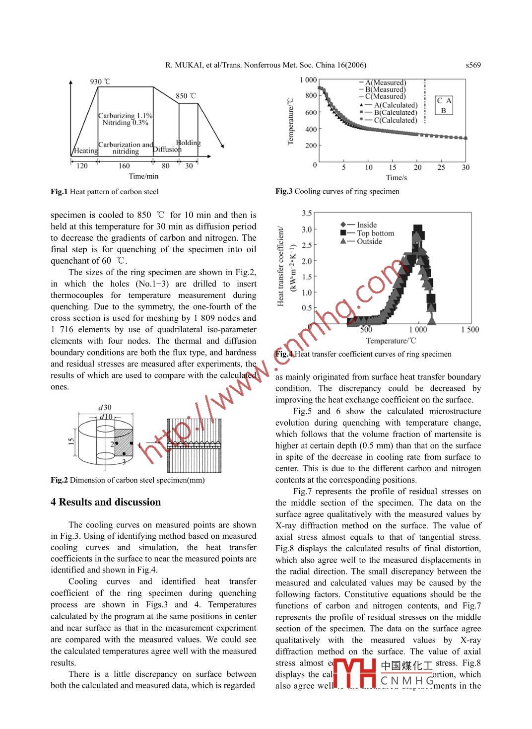 Available online at www.sciencedirect.comsCIENCE(s @oInEoT.Transactions of、Nonferrous MetalsSociety of ChinaScienceTrans. Nonferrous Met. Soc. China 16(2006)s566-s571Presswww.csu.edu.cn/ysxb/Modeling of numerical simulation and experimental verificationfor carburizing-nitriding quenching processR. MUKAI', T. MATSUMOTO, JU Dong-ying', T. SUZUKI, H. SAITO2, Y. ITO41. High-Tech Research Center Special Researcher, Saitama Institute of Technology, Fukaya 369-0293, Japan;2. Department of Mechanical Engineering, Saitama Institute of Technology, Fukaya 369-0293, Japan;3. Research Center of High Technology, Anshan University of Science and Technology, Anshan 1 14044, China;4. Department of Technology Development, Tobuyakin Ltd, JapanReceived 10 April 2006; accepted 25 April 2006Abstract: A model considering quantitative efects of diffused carbon and nitrogen gradients and kinetics of phase transformation ispresented to examine metallo-thermo-mechanical behavior during carburized and nitrided quenching. Coupled simulation ofdiffusion, phase transformation and stres/train provides the final distribution of carbon and nitrogen contents as well as residualstress and distortion. Effects of both transformation and lattice expansion induced by carbon and nitrogen absorption wereintroduced into calculating the evolution of the internal stress and strain. In order to verify the method and the results, the simulateddistributions of carbon and nitrogen content and residual stress/strain of a ring model during carburized and nitrided quenching werecompared with the measured data.Key words: carburizing; nitriding; quenching; numerical simulation; metallo-thermo-mechanical behaviorimprovement are ascribed to the compound layers1 Introductioncomposed of fine nitrides or carbides of alloyingelements, and residual surface stresses are also attributedThe present authors have carried out, for theseto this process. As a known fact, residual stresses aredecades, to construct the fundamental framework ofalways accompanied by changes in shape and size of“metallo-thermo-mechanics [1, 2] relevant to describingwork-piece, which often results in significant distortionthe coupled fields of metallic structure, temperature andof the machine parts. This also leads to undesired effectsstress/strain occurring in the engineering processsuch as increasing noise from transmission gears. Itincorporating phase transformation such as quenching,order to improve such kind of defects, manufacturingwelding and casting, and developed some computerengineers need to have a thorough understanding hovsimulation codes, HEARTS [1, 3], COSMAP [4] andvarious process parameters influence the final profiles ofunder developing. Effect of difused carbon during thecarbon/nitrogen, stress/distortion and microstructures ofcarburized quenching is also possible to be simulated byheat-treated components. To do this, in recent years,these codes, and the results were presented elsewherethere have been a great number of experimental andtheoretical interests in mathematical description ofNitriding is known as another important process ascarburizing and/or nitriding processes [5]. Numericalwell as the carburizing among the thermo-chemicalsimulation by the finite element method (FEM), due tosurface treatments in engineering practice [6- -9]. Theits beneft in reducing consuming time and trial- and-errortechnology is widely applied to machine parts such asexperiments that plague engineers, is looking forward toautomotive gears, shafts and so on due to the beneficialbeing used widely in engineering problems. However, ineffects on fatigue resistance, tribological andmany commerc中國煤化工solve someanti-corrosion properties. The reasons for the propertyproblems on theYHCNMHGgenorsimul-Corresponding author: JU Dong-ying; Tel: +81 -48- 595-6826; Fax: +81-48-585-5928; E-mail: dyju@sitac.jip.R. MUKAI, et al/Trans. Nonferrous Met. Soc. China 16(2006)s567taneous difusion of carbon and nitrogen on theDxv(N)= Dv,of(C,N)h(gradC, gradN)-.following thermo-mechanical simulation still remainimperfect.(4)With respect to this, the numerical modeling forexpRT )simulating the metallo-thermo-mechanical behaviorduring carburized and nitrided quenching is developed inwith the functions f(C, N) and h(gradC, gradN) of carbonthis paper. The purpose of the modeling aims to make itand nitrogen concentrations and the gradients,capable to calculate not only diffusion of multi-elementrespectively. And Qr in Eqn.(4) is the activation energyduring chemical treatment but also the evolution offor diffusing nitrogen, and DN, 0 and R are materialconstants. The coefficient of surface reaction rate βv inmicrostructure, stress and distortion during carburizedEqn.(2) of nitriding process under partial pressure p(H2)and nitrided quenching by considering the effect of CNof hydrogen in the mixed gas is given bydiffusion on distortion and phase transformation kinetics.QIn order to verify the numerical method, the simulatedβN = Bop(H2)exp|RT(5)distributions of carbon and nitrogencontents,temperature and variation of microstructure as well aswhere Po is a constant [5].The equation governing carbon diffusion kineticsresidual stress/strain of a ring during carburized annitrided quenching are compared with the measuredcan be simply obtainable by exchanging N and C in Eqns.results.(1)-(4). When the coefficient of surface reaction rate βcfor carbon is decided by using experimental method [6],2 Modelingthev carbon diffusion in steel can be expressed by thefollowing boundary condition,The modeling developed by the authors can be usedDn;=βc(C-Cw)(6)to predict the evolution of temperature, microstructure,0x;stress/distortion and profiles of chemical componentsuch as carbon and nitrogen and so on during some2.2 Heat conductionprocesses of thermochemical treatment and heatTheheat conduction equation govemingtreatment. The models involved in the FEM proceduretemperature field Tiscan be divided into four catego