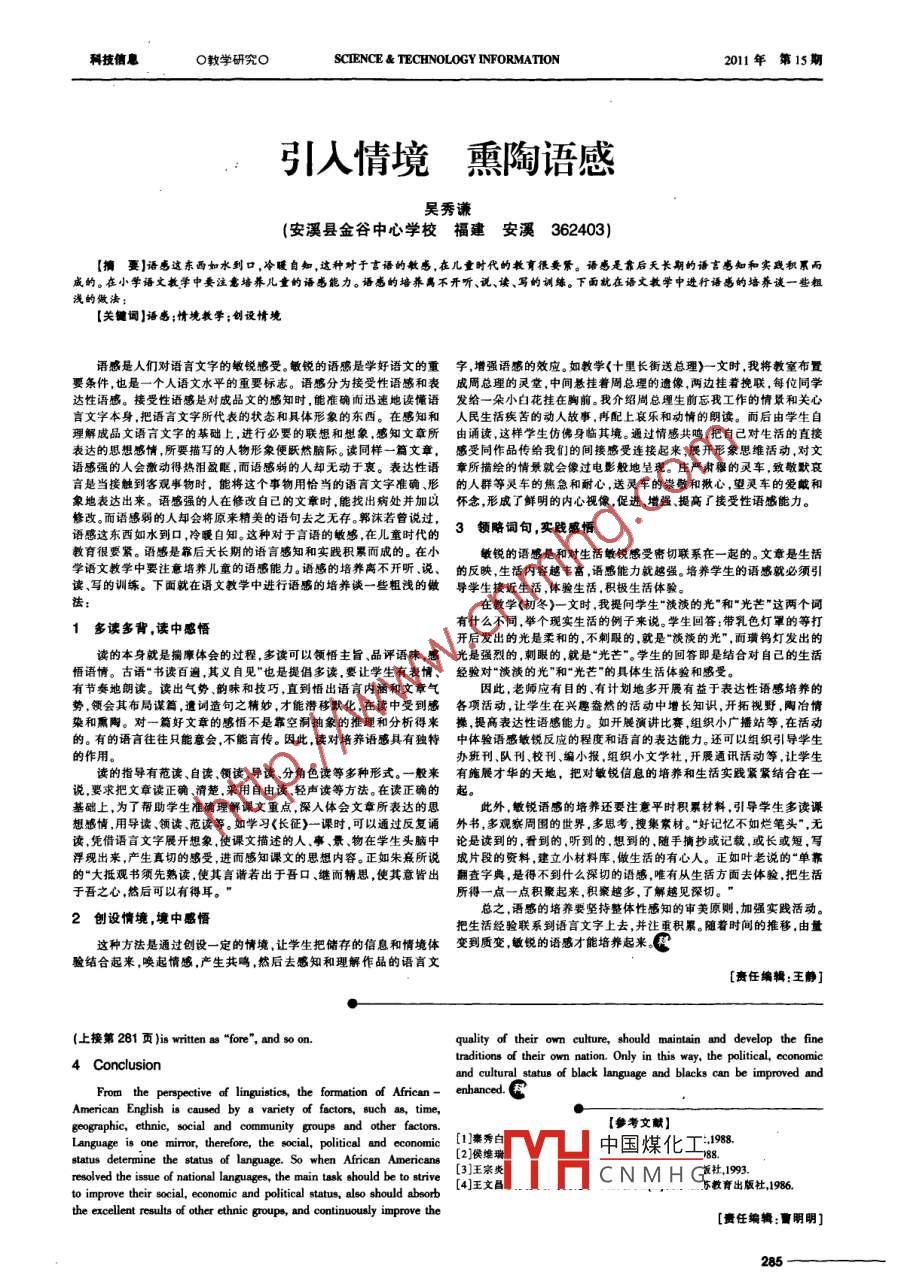 科技信息O外語論壇OSCIENCE & TECHNOLOGY INPORMATION2011年第15期The Analysis of African- American English楊明霞1唐秀峰2袁媛3(1.曲阜師范大學(xué)外國語學(xué)院山東曲阜273100;2. 曲阜師范大學(xué)外語教研部山東曲阜273100;3.泰山醫(yī)學(xué)院外國語學(xué)院山東泰安271000)[擠要]美國黑人英語作為英語中最重要的種族變體,以其獨特的語音 、詞匯、語法等特點與標準莢語存在較大的區(qū)別黑人英語的形成是由多種因素引起的,它受到時間、地域、種族.社會和社會集團等因素的制約,形成了具有自己特色的一種語言形式.[關(guān)鍵詞]黑人英語;標準英語;種族變體1 Introduction3.1.2 Phonetic varistion on vowels(1)The confusion of lil and le: Blacks seldom make the diferenceAfrican-American English is a variant of English, users are mostlybetween 1i/ and lel. For example, "pin" /pin/ is read /pen/, "tin" /in/ islower African Americans living in the community. Looking the African-American English a8 inferior is a social concept based on nacialread /ten/. The pronunciationof the vowels is identical with each other,discrimination and this social concept is inconsistent with linguistics. Thewhich is pronounced as the sound between Iiv and lel.(2)In the dialect of African-American English, the double vowe!voice,morphologyntax and voceabulary eysem of African -Americanis the pure blending sound, not is the gliding sound. For example,English is significantly diferent from the charateristics of Standard"right"/rai/ is read as /ret, “my" /mai 1 is read as /maw.English, however it is consistent with principle of "language is a system.2 African- American English in Grammatical Variationof rule".The most obvious and fundamental difference between African -2 The Definition of African- American EnglishAmericanEnglish and StandardAmerican English is the granmarstructure. Grammar is the moet constant and most different part. TheThe words "African -American English" wereproduced in 1969. fllowing are the main features of African American English in granmerArican-American English usually refers to the English which is used inaspecl.the norhem cities, and it is aloo known a Blaeck Vemacular English,or 3.2.1 The replecement of adverbAfro-American Vemacular English. African-American English is not aIn the dialect of African-American English, some grammar featuresgeographical concept nor is the concept of race. Most of blaecks of are showm on the verb physical appearance. In Standard English, peoplemiddle -clags don't speak African - American English, and except 80usually use adverb to emphasize the action that took place at this time orpercent of African Americans speak African-American English, there ae the Continuous action. However, African-Ameican Englishuse "be" toalso some whites (especially the plantation owners in the Soutb), Puertoreplace the adverb. For example,Ricans in New York city and some Indians to speak African-AmericanAfrican-American EnglishStandard EnglishEnglish. Therefore, not all blacks speak Black English. But the peopleHe be studyingHe is studyingwho speak African-American English are majority blacks.3.2.2 The disappearance of“-g" inflection3 Features of Atrican- American Englishome blacks who live at the botton of society and have a loweconomic status omit“- a" sometimes, such as the plural noun, theThe voice, morphology, syntax and vocabulary systems of African- possessive noun and the third person singular verb. For example,American English are significantly diferent from the features of StandardMy mamma tlk all the time =My mamma tlks all the timeEngliah. However, it is consistent with the principle that "language is aHe dance well=He dances wellsystem of nules". African- American English is the result the cooperationWe see many student in the lasroom=We sce many students in theof language rules, there is clear system and self- regulation. The fllowing claesroomare the main features of Afnican- American English from the aspeet of the.2.3pronunciation, grammar and vocabulary.One very unique feature of African -American English is the3.1 African-American English in Phonetic Variationormission of linking verb or the auxiliary verb "be". If an action or state3.1.1 Phonetic variation on consonantsposesses a fixed time, or in the static situation, and nhot often oceurs or(1 )On the sound "“h"18/, Aincan-American English diferns from thereoccurs, then "be" in the sentence can be omitted. For example,Standard English in several aspects:African- American English Standard English(a)When Blacka speak the prefix voiceleas consonant“th" 10/, theyMary sick todayMary is sick todaypronounce“t" IHI. For example, the pronunciation of “thin" /0in/ is readThey walking nowThey are walking now齲/tin/, "thanks" /0exnks/ is read a /uegks/.This my sister- in-lawThis is my sister-in-law(b)In the blecks’ dilecl, the voiced consonant “h"/JwasYou too short for meYou are too short for mepronounced“d" ld. For example,“this" 1is/ is read as /dis,“that" 163.2.4 The use of "He"eV is reaed as /det.When African Americans use pronoun to stand for the gender, they(e)If the"th" is in the middle or end of the word, it was pronouncedusually use "he". "he" not only stand for positive gender, but also standuU. For example, "birthday" /b:0dei/ is read as /bafdei/, "nothing"/ n^Ofor the negative gender. For exarmple,in/ is read a8 /nAfig/, "mouth" /mau0/ is read as /maul/ ,"both" /bou0/ isHe a beautiful woman =She is a beautiful woman.read as /boud/.He my mother = She is my mother.(2)The oison of nv eound: Many Blackes often omit the middleor 33 Ani 1中國煤化工- riationending consonants nN. For example, "help" /help/ is read /hep/,“felt" 1GeneArican Americans is infelu is read Hietl, "tool" /tu:/ is read /tu:/,“coal" /kau/ is read kow/ and line withaction which is diferentso on.YHCNMHGetion”all "goober",(3)The omission of lr/ sound: In these