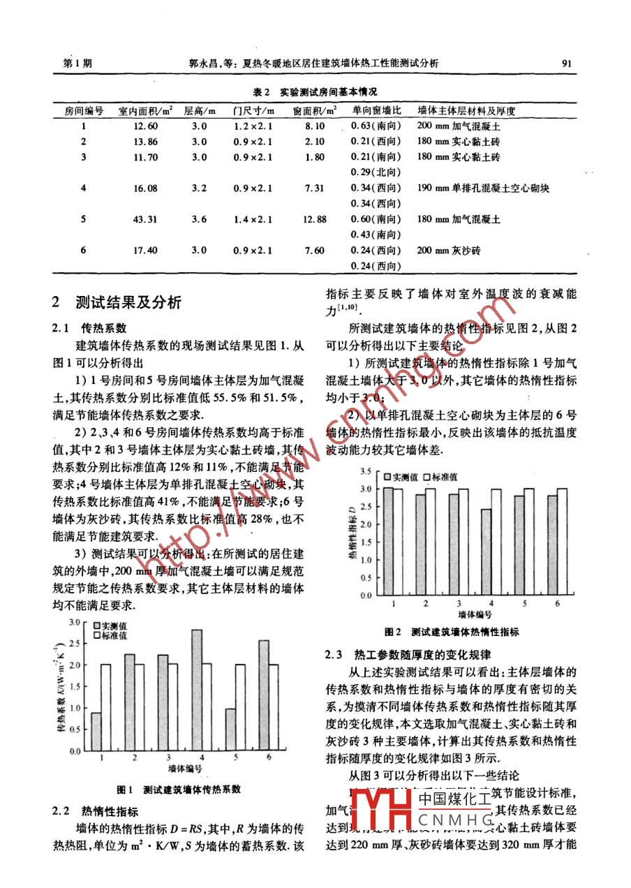 第25卷第1期廣東工業(yè)大學(xué)學(xué)報Vol 252008年3月Journal of Guangdong University of Technology夏熱冬暖地區(qū)居住建筑墻體熱工性能測試分析郭永昌,楊晚生,劉鋒(廣東工業(yè)大學(xué)建設(shè)學(xué)院廣東廣州510506)摘要:在分析夏熱冬暖地區(qū)熱工氣候特點的基礎(chǔ)上,對該地區(qū)典型居住建筑的墻體熱工性能進行了詳細(xì)的實驗測試研究,得出了其傳熱系數(shù)熱情性指標(biāo)和厚度對其熱工性能參數(shù)的影響規(guī)律摸清了該地區(qū)典型居住建筑墻體熱工性能基本特點,找出了其熱工性能參數(shù)隨厚度的變化規(guī)律關(guān)鍵詞:夏熱冬暖;居住建筑;墻體;熱工性能中圖分類號:TU.2文獻(xiàn)標(biāo)識碼:A文章編號:1007-7162(2008)010004夏熱冬暖地區(qū)在我國熱工分區(qū)的南區(qū),屬于典地區(qū)既有建筑墻體的熱工性能狀況,為其墻體節(jié)能技型的亞熱帶氣候帶地區(qū),其氣候特點為夏季炎熱漫術(shù)的開展提供基礎(chǔ)性試驗依據(jù)和具體技術(shù)措施長,冬季短暫溫暖,冷期短、霜日少、太陽輻射強度大雨量充沛豐裕一年中最冷為1-2月最熱為71測試基本情況9月.夏熱冬暖地區(qū)的氣候特點,決定了其居住建1.1主要測試儀器設(shè)備筑的節(jié)能控制重點為夏季防熱,一般不考慮冬季保為保證實驗測試的可靠性和客觀性,根據(jù)文獻(xiàn)溫12.本文主要對夏熱冬暖地區(qū)某城市典型居住建[34]選取實驗測試儀器對典型居住建筑進行測試,筑進行了墻體熱工實驗測試,目的在于了解和掌握該本實驗測試所采用的主要儀器設(shè)備見表1.表1實驗測試所采用的主要儀器儀器名稱主要功能規(guī)格型號技術(shù)參數(shù)溫濕度自動采集儀窒內(nèi)外溫濕度自動巡測記錄mwsI溫度:測量范圍-40~125℃,精度±0.1℃;濕度(RH):測量范圍1%-99%,精度±0.2%單點熱流計測試圍護結(jié)構(gòu)單點熱流JTRL I測量范圍.0~99W/m2;精度:<5%溫度與熱流自動測試系統(tǒng)自動巡測采集熱流和溫度溫度測量范圍-50~100℃,精度±0.5℃;熱流測量范圍0-200mV精度≤±1硅半導(dǎo)體便攜式數(shù)字溫度計測量室內(nèi)外空氣溫度JM22測量范圍:-100-199℃;準(zhǔn)確度:±0.2%;分辨率0.1數(shù)字相對濕度計室內(nèi)、外相對濕度CHIPO測量范圍:10%-%5%;準(zhǔn)確度:±5%熱球風(fēng)速儀測量室內(nèi)外空氣流速Testo SG-08工作溫度范圍:0~50℃;測量范圍:0.1-30m/s;分辨率:0.1m/s觸式紅外線測溫儀測量圍護結(jié)構(gòu)內(nèi)外表面溫度測溫范圍:-18~260℃;測量精度0.1℃太陽輻射強度測量僅測量室外太陽輻射強度mBQg測范圍:0-150m測量精度:±1%1.2測試建筑物以保證測試數(shù)據(jù)的可靠性和客觀性實驗測試建筑本實驗測試選取了6個典型居住建筑房間作為的基本情況見表29測試對象,每個房間都進行了3-7d的連續(xù)檢測,中國煤化工收稿日期:2007-0124基金項目:東莞市建設(shè)局科研課題資助項目(2005004)CNMHG作者簡介:郭永昌(1974),男講師主要研究方向為復(fù)合材料在工程中的應(yīng)用第1期郭永昌,等:夏熱冬暖地區(qū)居住建筑墻體熱工性能測試分析表2實驗測試房間基本情況房間編號室內(nèi)面積m層高/m門尺寸/m窗面積m3單向窗墻比墻體主體層材料及厚度12.60301.2×2.18.100.63(南向)200mm加氣混凝土13.86300.9×2.12.100.21(西向)180mm實心黏土磚3.00.9×2.11.800.21(南向)180mm實心黏土磚0.29(北向16.083.20.9×2.17.310.34(西向)190mm單排孔混凝土空心砌塊0.34(西向)1.4x2.112.880.60(南向)180mm加氣混凝土0.43(南向)17.403.00.9×2.17600.24(西向)200mm灰沙磚2測試結(jié)果及分析指標(biāo)主要反映了墻體對室外溫度波的衰減能力[1,10)2.1傳熱系數(shù)所測試建筑墻體的熱惰性指標(biāo)見圖2,從圖2建筑墻體傳熱系數(shù)的現(xiàn)場測試結(jié)果見圖1.從可以分析得出以下主要結(jié)論圖1可以分析得出1)所測試建筑墻體的熱情性指標(biāo)除1號加氣1)1號房間和5號房間墻體主體層為加氣混凝混凝土墻體大于3.0以外,其它墻體的熱情性指標(biāo)土,其傳熱系數(shù)分別比標(biāo)準(zhǔn)值低55.5%和515%,均小于3.0;滿足節(jié)能墻體傳熱系數(shù)之要求.2)以單排孔混凝土空心砌塊為主體層的6號2)234和6號房間墻體傳熱系數(shù)均高于標(biāo)準(zhǔn)墻體的熱惰性指標(biāo)最小,反映出該墻體的抵抗溫度值,其中2和3號墻體主體層為實心黏土磚墻,其傳波動能力較其它墻體差熱系數(shù)分別比標(biāo)準(zhǔn)值高12%和11%,不能滿足節(jié)能要求;4號墻體主體層為單排孔混凝土空心砌塊,其口實測值口標(biāo)準(zhǔn)值傳熱系數(shù)比標(biāo)準(zhǔn)值高41%,不能滿足節(jié)能要求;6號墻體為灰沙磚,其傳熱系數(shù)比標(biāo)準(zhǔn)值高28%,也不能滿足節(jié)能建筑要求153)測試結(jié)果可以分析得出:在所測試的居住建筑的外墻中,200mm厚加氣混凝土墻可以滿足規(guī)范規(guī)定節(jié)能之傳熱系數(shù)要求,其它主體層材料的墻體均不能滿足要求墻體編號30口實測口標(biāo)準(zhǔn)值圖2測試建筑墻體熱情性指標(biāo)23熱工參數(shù)隨厚度的變化規(guī)律從上述實驗測試結(jié)果可以看出:主體層墻體的傳熱系數(shù)和熱惰性指標(biāo)與墻體的厚度有密切的關(guān)系,為摸清不同墻體傳熱系數(shù)和熱情性指標(biāo)隨其厚05度的變化規(guī)律,本文選取加氣混凝土、實心黏土磚和灰沙磚3種主要墻體,計算出其傳熱系數(shù)和熱情性指標(biāo)隨厚度的變