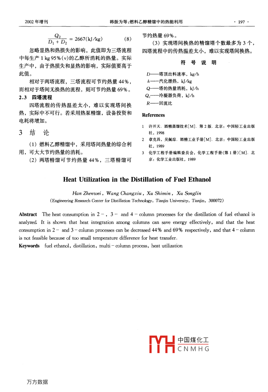 194·CHEMICAL INDUSTRY AND ENGINEERING PROGRESS2002年增刊燃料乙醇精餾中的熱能利用韓振為王昌秀徐世民許松林(天津大學(xué)精餾技術(shù)工程研究中心,天津,300072)摘要對于燃料乙醇精餾中的兩塔、三塔和四塔流程的熱量消耗和存在的問題進(jìn)行了分析。結(jié)果表明,塔間熱量的綜合利用是一項有效的節(jié)能技術(shù),采用兩塔流程可節(jié)約熱量44%,三塔流程可節(jié)約熱量69%,四塔流程傳熱溫差過小,難以實現(xiàn)塔間的換熱。關(guān)鍵詞燃料乙醇,精餾,多塔流程,熱能利用中圖分類號TQ028文獻(xiàn)標(biāo)識碼A引言此,合理利用能量,降低精餾過程的熱量消耗對降低燃料乙醇的生產(chǎn)成本有重要意義。臨枯竭,同時,石油作為能源的大量使用,給環(huán)境1燃料乙醇精餾的工藝流程造成了嚴(yán)重污染。目前,各國都在競相研究和開發(fā)精餾工段的作用是對發(fā)酵工段過來的成熟醪液新型低污染的可再生能源,以替代當(dāng)前的石油能進(jìn)行精餾,使乙醇濃度提高到95%(v)以上。根源。燃料乙醇即是一種非常理想的石油能源替代品。在汽油中加入適量的燃料乙醇,不但可以節(jié)省據(jù)精餾分離理論,對于乙醇一水體系的分離,采用石油能源,而且可以有效地降低排放污染。個精餾塔即可滿足要求,但由于醪液中僅含約發(fā)酵法生產(chǎn)燃料乙醇的過程包括原料的液化、10%的乙醇,濃度較低,且含有部分固體雜質(zhì),因糖化、發(fā)酵、精餾、脫水等過程,其中精餾過程的此乙醇精餾中通常采用粗餾塔和精餾塔兩個塔完成蒸汽消耗約占其生產(chǎn)總熱量消耗的一半左右,因乙醇-水的分離,如圖1所示。95%(V)乙醇成熟醪液粗餾塔h中國煤化工CNMHGFig 1 Schematic diagram for the distillation of fuel ethanol第一作者簡介韓振為,男,38歲,副研究員。E- mail whan@eyou.cm2002年增刊韓振為等燃料乙醇精餾中的熱能利用195降低精餾工段熱量消耗的最有效方法就是塔間熱量以利用其塔頂?shù)恼羝鳛槠渌臒嵩?。但若壓力的綜合利用。在圖1所示的兩塔流程中,如果將精過高,其加熱介質(zhì)的成本就會增加。同時,乙醇餾塔塔頂?shù)睦淠饔米鞔逐s塔塔釜的再沸器,可節(jié)水體系的共沸組成隨著壓力的增加而降低,當(dāng)壓力約熱量消耗近一倍達(dá)到0.5066MPa時,共沸物的乙醇濃度為95%為了進(jìn)一步節(jié)約蒸汽消耗,可采用三塔、四塔(wt)2),若再增加壓力,將得不到95%(wt)的乙或更多的塔組成的流程,但因為受冷卻介質(zhì)溫度和醇。此壓力下水的飽和溫度約為152℃13,若采用塔操作壓力的限制,精餾塔的數(shù)目不可能太多。本水蒸氣作為加熱介質(zhì),其壓力應(yīng)在0.6MPa(絕文分析了兩塔、三塔和四塔流程的節(jié)能效果和存在壓)以上,若再增加壓力,加熱蒸汽的壓力也要相的問題。應(yīng)增加。對于燃料乙醇的精餾,脫水工段要求的乙1.1各塔操作壓力的確定醇濃度一般為不低于95%(v),相當(dāng)于92.4%為了實現(xiàn)塔間熱量的充分利用,各塔需在不同(wt),考慮設(shè)計余量后,塔的操作壓力可增加至的壓力下操作。操作壓力最高的塔與操作壓力最低0.55MPa(塔頂)。的塔之間的壓差越大,塔間熱量的利用越容易實1.2多塔流程中精餾塔的個數(shù)現(xiàn)。對于操作壓力最低的塔,應(yīng)選擇較低的壓力,通過以上分析,燃料乙醇精餾中,最高操作壓但若壓力過低,該塔塔頂冷凝器冷介質(zhì)的成本就會力的塔壓力約為0.55MPa(塔頂絕壓),最低操作增加。粗餾塔的原料固含量較高,不宜在髙溫下操壓力的塔壓力約為0.04MPa(塔頂絕壓)。若選擇作,且塔頂可利用的熱量較少,因此,選擇粗餾塔粗餾塔在最低壓力下操作,其壓力降按0.00MPa在最低壓力下操作較為合理。粗餾塔塔頂蒸汽含乙計算,其余各塔壓力降均按0.029MPa計算,塔醇約40%(wt)(1,經(jīng)熱力學(xué)平衡計算可知,在頂乙醇蒸汽按92.4%(wt)計算,則可計算出兩塔0.04kPa壓力下的泡點溫度約70℃。若再降低壓流程中平均傳熱溫差約為48℃,三塔流程中的平力,冷凝的成本可能會增加,實際上,除乙醇和水均傳熱溫差約為10℃,四塔流程在上述塔壓降條外,發(fā)酵過程中還會產(chǎn)生一些乙醛、甲醇等輕組件下無法實現(xiàn)塔間換熱。即使各塔壓降為零,平均分,使冷凝成本會進(jìn)一步增加。傳熱溫差也不到1℃。因此,實際生產(chǎn)中能夠?qū)崿F(xiàn)對于操作壓力最高的塔,應(yīng)選擇較高的壓力,塔間換熱的精餾塔個數(shù)最多為3個。95%(v)乙醇成熟醪液中國煤化工CNMHG粗餾塔Fig 2 Schematic diagram of 2-column process196化工進(jìn)展002年增刊95%(v)乙醇95%(v)乙醇成熟醪液粗餾塔第一精餾塔第二精餾塔2不同工藝流程的熱量消耗頂蒸汽作為第一精餾塔的加熱介質(zhì),第一精餾塔的塔頂蒸汽作為粗餾塔的加熱介質(zhì)。2.1兩塔流程第一個精餾塔所需熱量為:如圖2所示,將精餾塔塔頂?shù)睦淠髯鳛榇逐sQ1=(R+1)D1h(1)塔塔釜的再沸器,所需熱量可由精餾塔的冷凝負(fù)荷第二個精餾塔冷凝器負(fù)荷為(氣相出料):近似計算。乙醇蒸汽的潛熱用常壓下含乙醇Q 3= RD2h292.4%(wt)的乙醇蒸汽潛熱(約為960kJ/kg{2)將第二個精餾塔的冷凝器作為第一個精餾塔的近似計算,回流比取為4,則可計算出精餾塔每生再沸器,因此有:產(chǎn)1kg產(chǎn)品所消耗的熱量為:=(4+1)×960=4800(kJ/kg)近似認(rèn)為忽略顯熱和熱損失的影響,此值即為每生產(chǎn)hI =h2=h(4)1kg95%(v)的乙醇所消耗的熱量。實際生