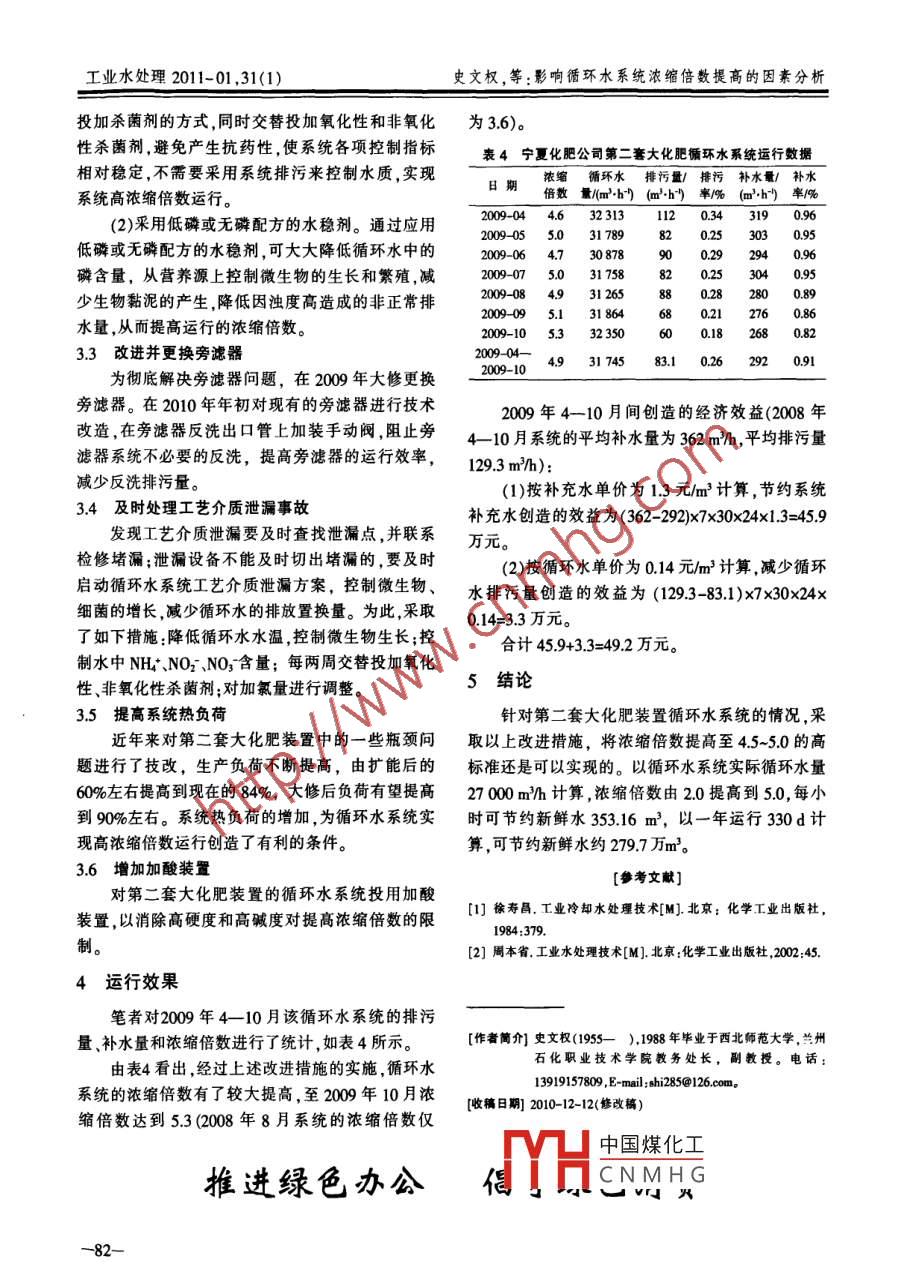 第31卷第1期工業(yè)水處理VoL.31 No.12011年1月Industrial Water TreatmentJan. ,2011影響循環(huán)水系統(tǒng)濃縮倍數(shù)提高的因素分析史文權(quán)',馬轉(zhuǎn)娥2,趙凱智2(1.蘭州石化職業(yè)技術(shù)學(xué)院教務(wù)處,甘肅蘭州730060;2.寧夏石化公司生產(chǎn)運(yùn)行處,寧夏銀川750026)[摘要]介紹了寧夏石化公司第二套大化肥循環(huán)水系統(tǒng)設(shè)備水處理單元操作等方面的現(xiàn)狀,分析了影響濃縮倍數(shù)提高的主要原因,探討了提高濃縮倍數(shù)運(yùn)行的可行性,提出了循環(huán)水節(jié)水思路。[關(guān)鍵詞]循環(huán)水;濃縮倍數(shù);節(jié)水[中圖分類號(hào)]TQ085 [文獻(xiàn)標(biāo)識(shí)碼]B [文章編號(hào) ]1005- -829X(2011)01-0080-03Analysis on the factors influencing the increase ofcirculating water system concentration cycleShi Wenquan' , Ma Zhuan ' e2 ,Zhao Kaizhi?(1. Dean's ffice ,Lanzhou Petrochemical Colle ofVocational Technologn ,Lanzhou 730060,China;2. Production & Operation Department ,Ningxia Petrochemical Corporation, Yinchuan 750026 ,China)Abstract: The status quo of the circulating water system and water treatment unit operation in the Second GreatFertilizer Plant , Ningxia Petrochemical Corp. is introduced. The main reasons influencing the increase of concentra-tion cycle are analyzed. The operation feasibility of increasing the concentration cycle is discused. At the end , theconcept of water saving for circulating water is brought forward.Key Words : circulating water;concentration cycle ;water saving我國是貧水國,人均水資源僅占世界人均量的水量隨之減少,見圖1。.1/4,全國有400多個(gè)城市缺水,農(nóng)業(yè)缺水量達(dá)350億m2/a。但我國工業(yè)噸產(chǎn)品的耗水量卻是世界300-平均水平的5~10倍,其中占工業(yè)用水量70%的循200-環(huán)冷卻水系統(tǒng)是用水的大戶。如何有效地提高循環(huán)052345 - o方冷卻水的濃縮倍數(shù),減少補(bǔ)充水量,節(jié)約用水,已成濃縮倍數(shù)為工業(yè)生產(chǎn)的重要關(guān)鍵。圍1補(bǔ)水量隨濃縮倍數(shù)變化情況循環(huán)水系統(tǒng)濃縮倍數(shù)是循環(huán)水運(yùn)行中的一項(xiàng)重1第二套大化肥循環(huán)水 系統(tǒng)現(xiàn)狀要指標(biāo),濃縮倍數(shù)的大小決定了水的重復(fù)利用率和節(jié)水水平的高低,可用公式“)表示:寧夏石化公司第二套大化肥循環(huán)水系統(tǒng)于K=(E+B/B+M(M-E)=1/(1-E/M)1998年建成投產(chǎn),設(shè)計(jì)循環(huán)冷卻水量33 500 m2/h,式中:K一.濃縮倍數(shù) ;補(bǔ)充水量691m2/h,系統(tǒng)保有水量12000m3,設(shè)計(jì)循M一補(bǔ)水 量,m/h;環(huán)水溫差10 C。該系統(tǒng)共有涼水塔11間,循環(huán)水泵E--蒸 發(fā)水量,m/h;6臺(tái),供第二套大化肥裝置約55臺(tái)水冷器使用。近.B一排污水 量(包含風(fēng)吹損失和漏損) ,m/h。年來該系統(tǒng)循環(huán)水濃縮倍數(shù)不斷上升,但始終難以若蒸發(fā)量保持不變,排污量越小,則補(bǔ)水量越達(dá)到4.5~-5倍的高標(biāo)準(zhǔn)。小,而濃縮倍數(shù)K則越大。中國煤化工保有水量和循環(huán)濃縮倍數(shù)提高后節(jié)水效益相當(dāng)可觀,以循環(huán)量水量CN MH Ct上的問題,旁德10 000 m2/h的循環(huán)水系統(tǒng)為例,濃縮倍數(shù)提高后,補(bǔ)器頻繁僅冼,造成淅鮮水浪貿(mào)。運(yùn)行管理方面也存在-80- -經(jīng)驗(yàn)交流工業(yè)水處理2011-01 ,31(1)一些問題,如系統(tǒng)泄漏、藥劑對微生物的控制不力、大補(bǔ)置換。因此,系統(tǒng)自投運(yùn)以來,濃縮倍數(shù)從未達(dá)黏泥危害嚴(yán)重,需要經(jīng)常進(jìn)行系統(tǒng)的大排大補(bǔ)置到4.5倍,平均不到2.9倍。換。此外,寧夏地區(qū)每年春秋季節(jié)都會(huì)出現(xiàn)沙塵天近幾年來第二套大化肥裝置的循環(huán)水平均依縮氣,造成循環(huán)水濁度大增,不得不進(jìn)行系統(tǒng)的大排倍數(shù)統(tǒng)計(jì)情況如表1所示。表|循環(huán)水濃縮倍數(shù)統(tǒng)計(jì)時(shí)間2005-082006-02206-062006-082007-02 .2007-082008-02008-08濃縮倍數(shù)2..6.01.63.21.2影響濃縮倍數(shù)提高的原因分析2.3I藝介質(zhì)泄漏第二套大化肥循環(huán)水系統(tǒng)每年都有物料泄漏2.1 循環(huán)水系統(tǒng)V/R過大由理論推導(dǎo)可知,當(dāng)B值一定時(shí), VIR值越小,發(fā)生,尤其是2008年2月份以來二合成氨冷器系統(tǒng)達(dá)到一定濃縮倍數(shù)所需的時(shí)間越短。因此,V/R發(fā)生氨泄漏,系統(tǒng)水質(zhì)惡化。為使水質(zhì)盡快恢復(fù)正值越小,系統(tǒng)受外排水的影響越小,越易提高濃縮倍常,一般要進(jìn)行系統(tǒng)置換,因此循環(huán)水不能得到有效數(shù)。而第二套大化肥裝置的循環(huán)水系統(tǒng)VIR值為濃縮。2.4 系統(tǒng)生產(chǎn)負(fù)荷較低0.44,與工業(yè)循環(huán)水設(shè)計(jì)規(guī)范中要求的VIR在1/5~第二套大化肥裝置自擴(kuò)能改造后,受工藝設(shè)計(jì)1/3之間相差較大,這就增加了提高循環(huán)水濃縮倍及設(shè)備狀況制約,生產(chǎn)負(fù)荷較低,系統(tǒng)產(chǎn)生熱量少,數(shù)的難度。循環(huán)水的蒸發(fā)量少,濃縮倍數(shù)也很難提高。2.2 旁濾系統(tǒng)損耗該循環(huán)水系統(tǒng)的12臺(tái)旁濾器自1998年投產(chǎn)以2.5加酸裝置不夠來,已經(jīng)使用10a以上,內(nèi)部構(gòu)件部分損壞,濾料表循環(huán)水系統(tǒng)的原設(shè)計(jì)是不加酸調(diào)節(jié),pH自然平面污染嚴(yán)重,造