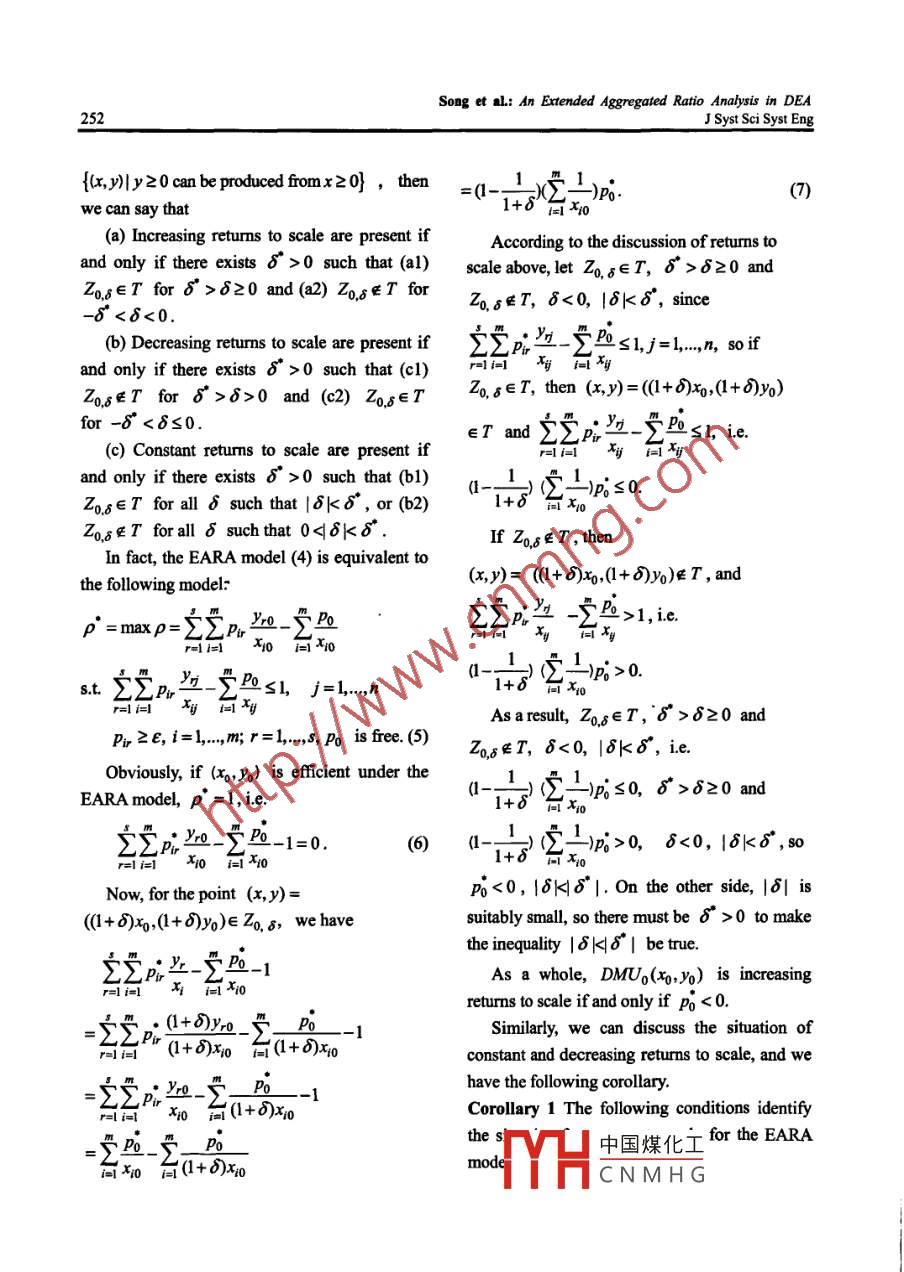 J Syst Sci Syst Eng (Jun 2011) 20(2): 249-256ISSN: 1004-3756 (Paper) 1861-9576 (Online)DOI: 10.1007/s11518-011-5162-1CNII -2983/NTechnical NoteAN EXTENDED AGGREGATED RATIO ANALYSIS IN DEAMalin SONG'Jie Wu2Yumei WANG3'School of Statistics and Applied Mathematics, Anhui University of Finance & Economics, Bengbu, 233030, Chinasongmartin@163.com (網)School ofManagement, University of Science & Technology ofChina, Hefei, 230026, Chinajacky012@mail.ustc.edu.cn'School of Satistics and Applied Mathematics, Anhui University of Finance & Economics, Bengbu, 233030, Chinaacwangyumei@163.comAbstractData Envelopment Analysis (DEA) and Ratio Analysis (RA) are two widely used methods formeasuring units' productivity and any other criteria that could be assessed based on the available inputand output variables. A number of researchers have studied DEA and RA and noted the positive andnegative differences between them. Aggregated ratio analysis (ARA) model, which provide animportant linkage between DEA and RA theory, is. equivalent to the CCR DEA model, and thisequivalence property offers a great deal of opportunities for DEA to be interpreted and applied indifferent ways. This paper extends the results of ARA model and proposes an extended aggregatedratio analysis (EARA) model, similar as the development ftom CCR model to BCC model in DEAcontext. The proposed model can offer an insight into the characteristic of returns to scale, playing thecorresponding role as BCC model does. The numerical example is revisited in the paper and the resultsare compared.Keywords: Data Envelopment Analysis (DEA), aggregated ratio analysis, efficiency evaluation,returs to scale1. Introductionvariables. Although the two methods share theData Envelopment Analysis (DEA) andsame goal, their approach is different in manyRatio Analysis (RA) are two methods foraspects. In brief, DEA is a nonparametricbenchmarking production units' productivity,method that generates a single relative efficiencyproftability or any other criteria that could bescore, while considering multiple inputs andassessed based on the available input and outputoutputs simultaneously. RA, in contrast, uses theThis work is fnancial support by National Natural Science59), Ministry ofEducation Foundation of Humanities and Social Sciences of P.R.中國煤化工aton of NauralScience for Colleges and Universities in Anhui, China (KJ2011AMYHC N M H Gdation of Anbui,China (AHSK07-08D25, AHSKF09-10D116, AHSK09-10D14).◎Systems Engineering Society ofChina and Springer-Verlag Berlin Heidelberg 2011Song et al: An Extended Aggregated Ratio Analysis in DEA250J Syst Sci Syst Engratio of a single output to a single input andalso prove that the ARA model is equivalent togenerates a relative efficiency score by dividingthe DEA CCR model by Charmes et al. (1978),the aforesaid ratio by the corresponding "bestthat is, to any given DMU, the efficiency ofperformer's”ratio, on this specific ratioaggregated ratio model is the same as thedefinition. DEA and individual ratios agreeefficiency of CCR model, and the best DMU inweakly on the performance of the unit and it isaggregated ratio model is on the DEA frontier.because DEA reflects the overall efficiencyHowever, the ARA model in Wu et al. (2005)based on a“ratio” of the weighted sum ofcan't help to detect the RTS (returns to scale)relevant outputs over inputs and the RA is atype as DEA BCC model does. Thus it isfactor specific efficiency.necessary to advance an extended aggregatedA number of researchers have studied DEAratio analysis (EARA) model which can play theand RA and noted the positive and negativesimilar role as BCC model while maintainingdifferences between them, such as Chen et al.the advantages of ARA model. In this paper, we(2009), Thanassoulis et al. (1996), Cronje (2002),propose the EARA (extended aggregated ratioFeroz et al. (2003), Bowlin (2004) and so on.analysis) model, similar as the development thatBesides, there are some studies which attemptedthe CCR model evolves into the BCC model in0 combine or relate the DEA and RA. ForDEA context. This extended model can offer anexample, Chen & Ali (2002) characterized theinsight into the characteristic of returns to scale.inherent relationships between the DEA frontierThe rest of this paper unfolds as follows. SectionDMUs and output-input ratios. They showed2 presents the extended aggregated ratio analysisthat top-ranked performance by ratio was a DEAmodel. The returns to scale characterizations arefrontier point and DEA subsumed the premise ofillustrated in Section 3. A numerical illustrationthe RA. Being motivated by the study of Chen &is revisited in Section 4 and concluding remarksAli (2002), Wu et al. (2005) proposed anare in Section 5.aggregated ratio analysis model in DEA. Thisratio model has been proven to be equivalent to2. The Extended Aggregated Ratiothe CCR model. Some other related studies canAnalysis (EARA) Modelbe referred to Chen & McGinnis (2007), DespicWe assume that there are n DMUs to beet al. (2007), Emrouznejad & Amin (2009),evaluated. Each DMU consumes m differentGonzalez- Bravo (2007), Hollingsworth & Smithinputs to produce s different outputs. Let the(2003), Holl6 & Nagy (2006) and so on.inpuand output vectors of DMUIn the current paper, we will consider thebe x,+=(x2..xmy)" >0,y =(Yyj,Y2j,study of Wu et al. (2005) among the variousrelated studies of DEA and RA abovementioned...y).. >0, +.... respetively.As said before, Wu et al. (2005) present an ARAThen themathematicalprogramming(aggregated ratio analysis) model where theproblem of the BCC“ratio-form”DEA model inaggregated sum of ratios of all outputs to allBanl中國煤化工inputs is regarded as a performance index. TheyYHCNMHGSong et l: An ExtendedAggregated Ratio Analysis in DEAJSyst Sci Syst Eng251=它u4ryro -uo)/analysis framework, here we introduce thei=following extended aggregated ratio analysis(EARA) model for DMUg:s.t.(_ny-u)/2xySl,網ρ° =maxp= SpWo -只Poj=...n u,2E, y2E,