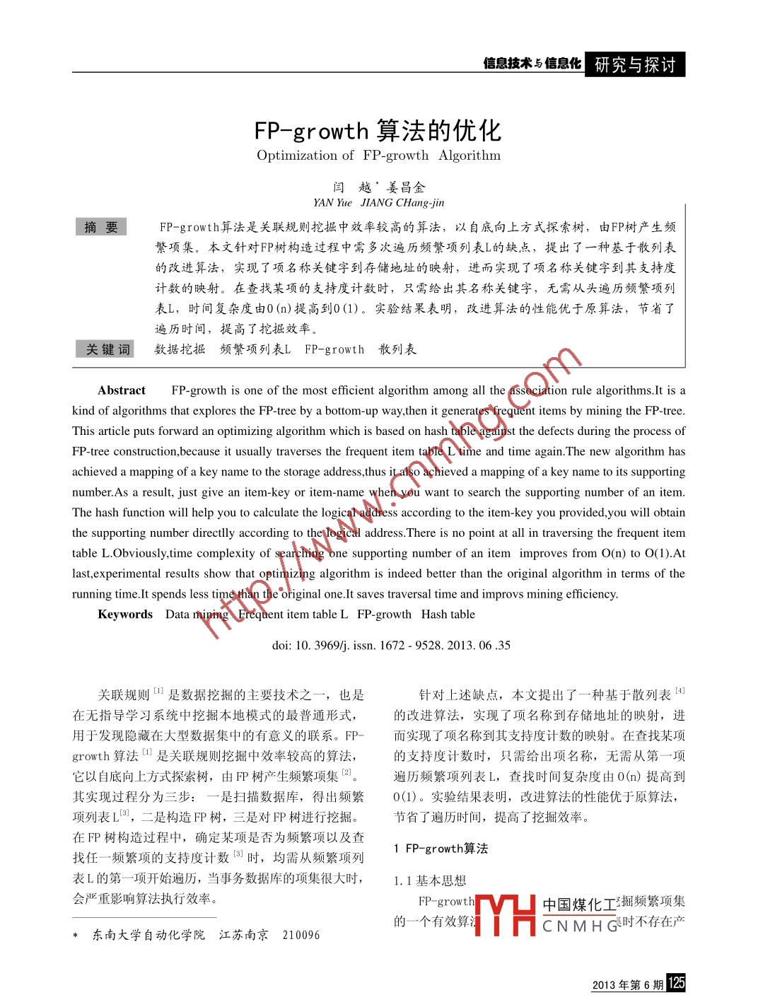 信息技術(shù)與信息化研究與探討FP-gr owth算法的優(yōu)化Optimization of FP-growth Algorithm閆越’姜昌金YAN Yue JIANG CHang-jin摘要FP-growth算法是關(guān)聯(lián)規(guī)則挖掘中效率較高的算法,以自底向.上方式探索樹(shù),由PP樹(shù)產(chǎn)生頻繁項(xiàng)集。本文針對(duì)PP樹(shù)構(gòu)造過(guò)程中需多次遍歷頻繁項(xiàng)列表L的缺點(diǎn),提出了一種基于散列表的改進(jìn)算法,實(shí)現(xiàn)了項(xiàng)名稱關(guān)鍵字到存儲(chǔ)地址的映射,進(jìn)而實(shí)現(xiàn)了項(xiàng)名稱關(guān)鍵字到其支持度計(jì)數(shù)的映射。在查找某項(xiàng)的支持度計(jì)數(shù)時(shí),只需給出其名稱關(guān)鍵字,無(wú)需從頭遍歷頻繁項(xiàng)列表L,時(shí)間復(fù)雜度由0(n)提高到0(1)。實(shí)驗(yàn)結(jié)果表明,改進(jìn)算法的性能優(yōu)于原算法,節(jié)省了遍歷時(shí)間,提高了挖掘效率。關(guān)鍵詞數(shù)據(jù)挖掘頻繁項(xiàng)列表L FP-growth 散列表AbstractFP-growth is one of the most eficient algorithm among all the association rule algorithms.It is akind of algorithms that explores the FP-tree by a bottom-up way,then it generates frequent items by mining the FP-tree.This article puts forward an optimizing algorithm which is based on hash table against the defects during the process ofFP-tree consruction,because it usually traverses the frequent item table L time and time again.The new algorithm hasachieved a mapping of a key name to the storage address,thus it also achieved a mapping of a key name to its supportingnumber.As a result, just give an item-key or item-name when you want to search the supporting number of an item.The hash function will help you to calculate the logical address according to the item-key you provided,you will obtainthe supporting number directlly according to the logical address.There is no point at all in traversing the frequent itemtable L.Obviously,time complexity of searching one supporting number of an item improves from O(n) to 0(1).Atlast,experimental results show that optimizing algorithm is indeed better than the original algorithm in terms of the :running time.It spends less time than the original one.It saves traversal time and improvs mining efficiency.Keywords Data mining Frequent item table L FP-growth Hash tabledoi: 10. 3969/j. issn. 1672 - 9528. 2013. 06.35關(guān)聯(lián)規(guī)則[n是數(shù)據(jù)挖掘的主要技術(shù)之一,也是針對(duì)上述缺點(diǎn),本文提出了一種基于散列表4在無(wú)指導(dǎo)學(xué)習(xí)系統(tǒng)中挖掘本地模式的最普通形式,的改進(jìn)算法,實(shí)現(xiàn)了項(xiàng)名稱到存儲(chǔ)地址的映射,進(jìn)用于發(fā)現(xiàn)隱藏在大型數(shù)據(jù)集中的有意義的聯(lián)系。FP-而實(shí)現(xiàn)了項(xiàng)名稱到其支持度計(jì)數(shù)的映射。在查找某項(xiàng)growth算法1是關(guān)聯(lián)規(guī)則挖掘中效率較高的算法,的支持度計(jì)數(shù)時(shí),只需給出項(xiàng)名稱,無(wú)需從第一項(xiàng)它以自底向上方式探索樹(shù),由FP樹(shù)產(chǎn)生頻繁項(xiàng)集(2。遍歷頻繁項(xiàng)列表L,查找時(shí)間復(fù)雜度由0(n)提高到其實(shí)現(xiàn)過(guò)程分為三步::是掃描數(shù)據(jù)庫(kù),得出頻繁0(1)。實(shí)驗(yàn)結(jié)果表明,改進(jìn)算法的性能優(yōu)于原算法,項(xiàng)列表L8,二是構(gòu)造FP樹(shù),三是對(duì)FP樹(shù)進(jìn)行挖掘。節(jié)省了遍歷時(shí)間,提高了挖掘效率。在FP樹(shù)構(gòu)造過(guò)程中,確定某項(xiàng)是否為頻繁項(xiàng)以及查1 FP-growth算法找任一-頻繁項(xiàng)的支持度計(jì)數(shù)[3]時(shí),均需從頻繁項(xiàng)列表L的第一項(xiàng)開(kāi)始遍歷,當(dāng)事務(wù)數(shù)據(jù)庫(kù)的項(xiàng)集很大時(shí),1. 1基本思想會(huì)嚴(yán)重影響算法執(zhí)行效率。FP-growth中國(guó)煤化工掘頻繁項(xiàng)集東南大學(xué)自動(dòng)化學(xué)院江蘇南京210096的一個(gè)有效算注YHCN MH G時(shí)不存在產(chǎn)2013年第6期125研究與探討信息技術(shù)與信息化生候選集的繁瑣過(guò)程,而是采取分治策略[5。首先,1.2.2.2構(gòu)造 FP-tree5)將提供頻繁項(xiàng)的數(shù)據(jù)庫(kù)壓縮到一棵頻繁模式樹(shù)(FP創(chuàng)建FP樹(shù)的根節(jié)點(diǎn),以“null”標(biāo)記它。對(duì)于樹(shù)) ,但仍保留項(xiàng)集關(guān)聯(lián)信息。然后,將壓縮后的數(shù)事務(wù)數(shù)據(jù)集中每個(gè)事務(wù)trans,設(shè)排序后頻繁項(xiàng)列表?yè)?jù)庫(kù)劃分成一組條件數(shù)據(jù)庫(kù),每個(gè)條件數(shù)據(jù)庫(kù)關(guān)聯(lián)一(即表3中每條事務(wù))為[p|P],其中,p是第-一個(gè)元素,個(gè)頻繁項(xiàng),并分別對(duì)每個(gè)條件數(shù)據(jù)庫(kù)進(jìn)行挖掘。而P是剩余元素的列表。對(duì)每個(gè)事務(wù)調(diào)用insert_1.2算法描述 .tree([p|P],T),其中T為相對(duì)父節(jié)點(diǎn)。該過(guò)程執(zhí)1.2.1 掃描數(shù)據(jù)庫(kù),得到頻繁項(xiàng)列表L .行情況如下:如果T有一個(gè)子女N,使得N. item-對(duì)事務(wù)數(shù)據(jù)集(格式見(jiàn)表1)進(jìn)行一次掃描,確name=p. item- name,則N的計(jì)數(shù)增加1;否則,創(chuàng)建定每個(gè)項(xiàng)的支持度計(jì)數(shù)。丟棄非頻繁項(xiàng),將頻繁項(xiàng)按個(gè)新節(jié)點(diǎn)N,將其計(jì)數(shù)設(shè)置為1, 鏈接到它的父節(jié)支持度遞減排序[2。之所以這樣排序,是因?yàn)镕P樹(shù)點(diǎn)T,并通過(guò)節(jié)點(diǎn)鏈結(ji