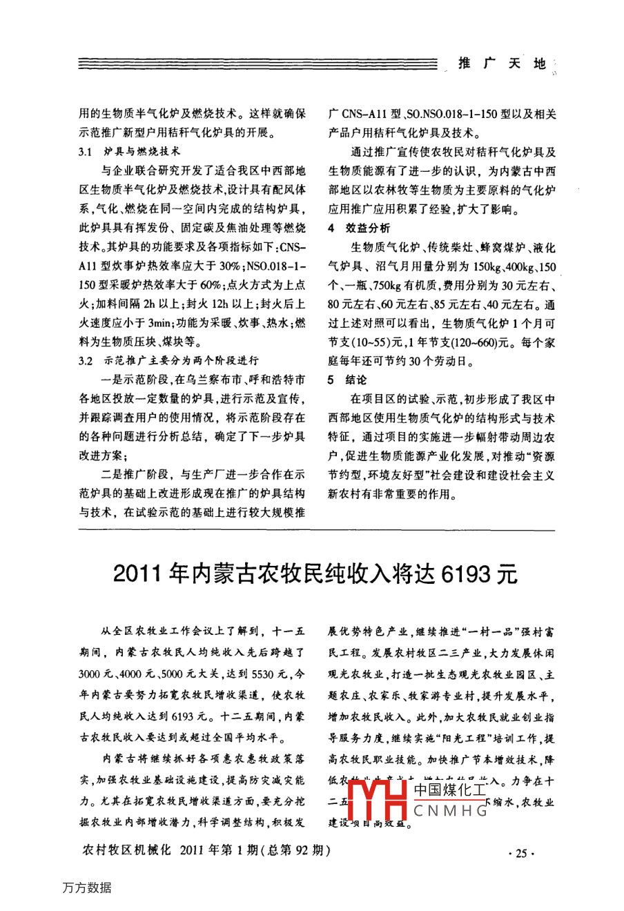 推廣天地生物質(zhì)氣化爐示范推廣于波' 牛世平21.內(nèi)蒙古農(nóng)牧業(yè)機(jī)械技術(shù)推廣站2.巴 彥淖爾市農(nóng)機(jī)化研究所[摘要]本文簡要介紹了生物質(zhì)能及其他斷型能源,戶用生物質(zhì)氣化爐結(jié)構(gòu)特點(diǎn)及技術(shù)參數(shù),以及在我區(qū)的試驗示范推廣情況。[關(guān)鍵詞]生物質(zhì)能 氣化爐 示范推廣1生物質(zhì)能一類是生物質(zhì)半氣化爐。在2009中國民用爐具生物質(zhì)能是一種新興能源又稱非常規(guī)能研討會上多數(shù)專家學(xué)者及生產(chǎn)廠家代表認(rèn)為由源。新興能源是指傳統(tǒng)能源之外的各種能源形于生物質(zhì)完全氣化爐結(jié)構(gòu)相對較復(fù)雜、制造成式,如太陽能、地?zé)崮?、風(fēng)能、海洋能、生物質(zhì)能本較高,燃燒時產(chǎn)生的煙及焦油不能完全燃燒,和核聚變能等。這些剛開始開發(fā)利用或正在積釋放在屋內(nèi)對人身健康有一定危害,不適宜推極研究、有待推廣的能源是我國“十二五”規(guī)范廣應(yīng)用。而生物質(zhì)半氣化爐由于結(jié)構(gòu)簡單,成本中的重點(diǎn)發(fā)展領(lǐng)域。生物質(zhì)能和風(fēng)能、太陽能一低,對揮發(fā)份.固定碳的燃燒以及產(chǎn)生焦油問題樣是可再生能源,取之不盡、用之不竭。我國每基本得到解決,有利于推廣應(yīng)用,因此生物質(zhì)半年可利用的生物質(zhì)量約有6億多t,相當(dāng)于4億氣化爐將 會是今后發(fā)展方向。t標(biāo)煤。將生物質(zhì)加工成具有得高密度的成型燃3示范推廣料是一種新型的利用方式,實(shí)現(xiàn)清潔燃燒,成為戶用秸稈氣化爐具示范推廣是內(nèi)蒙古科技新型能源,完全可以代替煤炭和石油,應(yīng)用于商廳 2009年招標(biāo)下達(dá)的應(yīng)用技術(shù)研究與開發(fā)資業(yè)場所和居民家庭的供暖、炊事和洗浴等。生物金項目,項目主持單位為內(nèi)蒙古自治區(qū)農(nóng)牧業(yè)機(jī)質(zhì)能是國際上公認(rèn)的綠色、無污染、可再生的新械技術(shù)推廣站。項目主要實(shí)施地區(qū)為呼和浩特型能源。近年來隨著環(huán)保、節(jié)能的嚴(yán)格要求,生市、烏蘭察布市、巴彥淖爾市等。項目主持單位物質(zhì)燃料開始被人們廣泛關(guān)注和接受,進(jìn)入應(yīng)根據(jù)項目合同書要求,制定項目實(shí)施方案,并組用時期,發(fā)揮其獨(dú)有的優(yōu)勢,成為一種重要的能織進(jìn)行項目的實(shí)施。能否順利完成示范推廣新源補(bǔ)充和替代。型戶用秸稈氣化爐具的目標(biāo)任務(wù),爐具的選擇2氣化爐至關(guān)重要。通過對全國幾十家生產(chǎn)的爐具進(jìn)行伴隨著生物質(zhì)能的開發(fā)利用,生物質(zhì)爐具調(diào)查與了解, 并結(jié)合我區(qū)中西部地區(qū)的實(shí)際情研究開發(fā)也運(yùn)用而生,生物質(zhì)爐具研究開發(fā)在況司生產(chǎn)的爐具,我國仍屬起步階段。我國現(xiàn)階段民用生物質(zhì)爐與我YH中國煤化工一步的協(xié)商與.具可分為兩大類:-類是生物質(zhì)完全汽化爐,另合作C N MH. G中西部地區(qū)使●24●農(nóng)村牧區(qū)機(jī)械化2011 年第1期(總第92期)推廣天地用的生物質(zhì)半氣化爐及燃燒技術(shù)。這樣就確保廣CNS- A11型、SO.NS0.018- 1-150型以及相關(guān)示范推廣新型戶用秸稈氣化爐具的開展。產(chǎn)品戶用秸稈氣化爐具及技術(shù)。3.1 爐具與燃燒技術(shù)通過推廣宣傳使農(nóng)牧民對秸稈氣化爐具及與企業(yè)聯(lián)合研究開發(fā)了適合我區(qū)中西部地生物質(zhì)能源有了進(jìn)一步的認(rèn)識,為內(nèi)蒙古中西區(qū)生物質(zhì)半氣化爐及燃燒技術(shù),設(shè)計具有配風(fēng)體部地區(qū)以農(nóng)林牧等生物質(zhì)為主要原料的氣化爐系,氣化燃燒在同一空間內(nèi)完成的結(jié)構(gòu)爐具,應(yīng)用推廣 應(yīng)用積累了經(jīng)驗,擴(kuò)大了影響。此爐具具有揮發(fā)份、固定碳及焦油處理等燃燒4效益分析技術(shù)。其爐具的功能要求及各項指標(biāo)如下:CNS-生物質(zhì)氣化爐、傳統(tǒng)柴灶蜂窩煤爐、液化Al1型炊事爐熱效率應(yīng)大于30% ;NS0.018-1-氣爐具、 沼氣月用量分別為150kg、400kg.150150型采暖爐熱效率大于60%;點(diǎn)火方式為上點(diǎn).個、-瓶.750kg有機(jī)質(zhì),費(fèi)用分別為30元左右、火;加料間隔2h以上;封火12h以上;封火后上80元左右、60元左右、85元左右、40元左右。通火速度應(yīng)小于3min;功能為采暖.炊事熱水;燃過上述對照可以看出,生物質(zhì)氣化爐1個月可料為生物質(zhì)壓塊、煤塊等。節(jié)支(10~55)元,1年節(jié)支(120-660)元。每個家3.2示范推廣 主要分為兩個階段進(jìn)行庭每年還可節(jié)約30個勞動日。一是示范階段,在烏蘭察布市呼和浩特市5結(jié)論.各地區(qū)投放一定數(shù)量的爐具,進(jìn)行示范及宣傳,在項目區(qū)的試驗示范,初步形成了我區(qū)中并跟蹤調(diào)查用戶的使用情況,將示范階段存在西部地區(qū)使用生物質(zhì)氣化爐的結(jié)構(gòu)形式與技術(shù)的各種問題進(jìn)行分析總結(jié),確定了下一步爐具特征,通過項目的實(shí)施進(jìn)一步幅射帶動周邊農(nóng)改進(jìn)方案;戶,促進(jìn)生物質(zhì)能源產(chǎn)業(yè)化發(fā)展,對推動“資源二是推廣階段,與生產(chǎn)廠進(jìn)-步合作在示節(jié)約型,環(huán)境友好型"杜會建設(