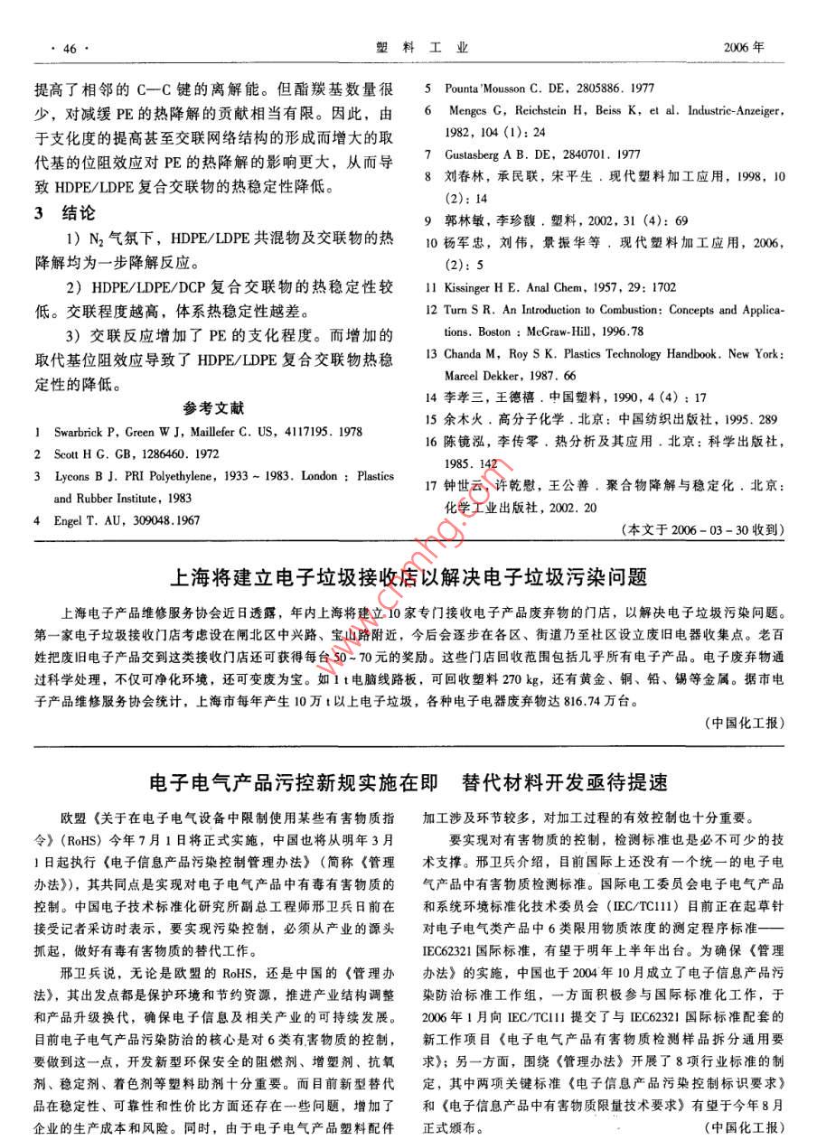 第34卷第7期塑料工業(yè)2006年7月CHINA PLASTICS INDUSTRY43HDPE/IDPE復(fù)合交聯(lián)物的熱降解研究楊軍忠',劉偉,景振華,王軍2,王延偉2(1.石油化工科學(xué)研究院,北京10083;2.中國(guó)石化洛陽(yáng)分公司,河南洛陽(yáng)471012)摘要:采用熱重分析儀(TG)考察了高密度聚乙烯(HDE)/低密度聚乙烯(LDPE)復(fù)合交聯(lián)物的熱穩(wěn)定性。結(jié)果顯示,HDPE/DPE復(fù)合交聯(lián)物的熱穩(wěn)定性低于 HDPE/ LDPE共混物。FTIR分析證實(shí),交聯(lián)反應(yīng)使聚乙烯(PE)的支化程度提高,取代基的位阻效應(yīng)在一定程度上影響了PE的熱降解過(guò)程。在N2氣氛下, HDPE/LDPE共混物及交聯(lián)物的熱降解過(guò)程均為一步降解反應(yīng)。 Kissinger法求解HDPE/IDE共混物及其復(fù)合交聯(lián)物的熱降解活化能發(fā)現(xiàn),LDPE質(zhì)量分?jǐn)?shù)在20%~30%之間變化時(shí),HDPE/LDE交聯(lián)物的熱降解過(guò)程對(duì)溫度的敏感性發(fā)生了突變關(guān)鍵詞:高密度聚乙烯;低密度聚乙烯;復(fù)合交聯(lián)物;熱降解中圖分類(lèi)號(hào):TQ325.I+2文獻(xiàn)標(biāo)識(shí)碼:A文章編號(hào):1005-5770(2006)07-0043-04Study on Thermal Degradation of HDPE/LDPE Crosslinked ProductYANG Jun-zhong, LIU Wei, JING Zhen-hua, WANG Jun, WANG Yan-wei(1. Research Institute of Petrochemical Sci. Beijing 100083, China2. Luoyang Subsidiary Company, SINOPEC, Luoyang 471012, China)Abstract: The thermal stability of HDPE/LDPE crosslinked product was studied by means of thermogravimetric(TGA). The results showed that the thermal stability of HDPE/LDPE crosslinked product was poorer thanthat of HDPE/LDPE blend. The result of FTIR analysis informed that the branch concentration of the crosslinked PEwas increased significantly by crosslinking reaction, their substituted alkyl groups would subsequently effect thehole degradation of the crosslinked PE. Furthermore, it was found that the thermal degradation reactions forHDPE/LDPE blend and HDPE/LDPE crosslinked products were much more similar and both belong to one-stepmechanism. It was also noticed that the sensitivity to temperature for the thermal stability of HDPE/LDPEcrosslinked products was changed sharply while the amounts of LDPE changed from 20 to 30% in calculating theactivated energy of the blend in thermal degradation by means of Kissinger methodKeywords: HDPE; LDPE; Multiplex Crosslinked Product; Thermal Degradation自從聚乙烯(PE)工業(yè)化以來(lái),研究人員圍繞過(guò)選擇合適的原料配比和合適的交聯(lián)工藝可以獲得微各種牌號(hào)FE進(jìn)行了大量的改性研究和應(yīng)用開(kāi)發(fā)。尤觀結(jié)構(gòu)相對(duì)完善的網(wǎng)絡(luò)交聯(lián)結(jié)構(gòu)0。為全面掌握這其在交聯(lián)PE領(lǐng)域,相繼開(kāi)發(fā)出了硅烷交聯(lián)工藝1,21、類(lèi)交聯(lián)物的性能,本文采用熱重分析儀(TGA)和紅過(guò)氧化物交聯(lián)工藝、輻射交聯(lián)工藝3等。由于不需要外分析儀(FTIR)研究HDP/LDPE復(fù)合交聯(lián)物的熱特殊且昂貴的加工設(shè)施,有機(jī)過(guò)氧化物交聯(lián)工藝備受降解特性和熱降解動(dòng)力學(xué),并對(duì)HDPE復(fù)合交聯(lián)物的重視,典型的過(guò)氧化物交聯(lián)工藝有 Engel法(]、Po熱降解機(jī)理進(jìn)行分析。a' Mousson法)、超高頻交聯(lián)技術(shù)6以及德國(guó)Gus-1實(shí)驗(yàn)部分taysberg公司的Az法。國(guó)內(nèi)在有機(jī)過(guò)氧化物交聯(lián)1.1原料PE方面也開(kāi)展了一系列研究9。筆者在研究高密度HDPE:5000,齊魯石化公司;DDPE:TN26,齊聚乙烯(HDPE)交聯(lián)物的制備過(guò)程中發(fā)現(xiàn),在魯石化公司;引發(fā)劑:DCP,上海高橋石化公司;氣HDPE/DCP交聯(lián)體系中加入低密度聚乙烯(LDPE),相法二氧化硅(SiO2):市售。可以改善HDPE的交聯(lián)過(guò)程和交聯(lián)物的微觀結(jié)構(gòu),通1.2實(shí)驗(yàn)方法及樣品制備聯(lián)系人010-82368254, liuwei4258cn@sna,com44塑料工業(yè)06年1.2.1實(shí)驗(yàn)方案紅外分析:將各種HDPE/LDPE復(fù)合物在壓膜機(jī)HDPE/IDPE復(fù)合物的配比見(jiàn)表1。其中,HLC1上熱壓成薄膜,采用美國(guó)PE公司的PE200紅外分析HLC4為共混物,無(wú)交聯(lián)劑,而HLC5~HLC8加儀測(cè)定。人了一定比例的交聯(lián)劑DCP。2結(jié)果討論表1HDPE/LDE復(fù)合物配比(質(zhì)量比)及其凝膠質(zhì)量分?jǐn)?shù)2.1HDPE/LDE復(fù)合物的熱穩(wěn)定性Tab I Prescriptions of HDPE/LDPE multiplex products從表1可以看出,隨LDPE質(zhì)量分?jǐn)?shù)的增加and their gel contentHDPE/LDPE/DCP交聯(lián)物凝膠的質(zhì)量分?jǐn)?shù)增加。這可編號(hào) HDPE LDPE DCP SiO2凝膠質(zhì)量分?jǐn)?shù)/%能是由于DDPE中含有較多的支鏈,更有利于交聯(lián)的HLC19010HLC28020發(fā)生。HLC370300000圖1為HDPE/LDPE復(fù)合物在300~550℃之間以IC4604010℃/min的速度升溫時(shí)的熱失重和熱失重微分曲線HLC-5 90100.3HLC-6 80200.340.12從圖1可以看出,N2氣氛下,樣品的熱失重微分曲HLC-7 7042,19線均為單峰,說(shuō)明HDPE/LDPE共混物及交聯(lián)物的熱HLC-84431降解過(guò)程均為一步降解反應(yīng);但交聯(lián)物的熱穩(wěn)定性低1.22HDPE/IDPE復(fù)合物的制備于其對(duì)應(yīng)的共混物。HDPE/IDPE復(fù)合物的典型熱穩(wěn)各組分經(jīng)SHR-10型高速混合機(jī)混合后,在SLF定性參數(shù)見(jiàn)表2。35B型雙螺桿擠出機(jī)中混煉、水環(huán)切粒,溫度控制范圍170~220℃。13性能測(cè)試與分析交聯(lián)度:取一定量擠出切粒樣品W1,裝入銅網(wǎng)中用二甲苯在索氏抽提