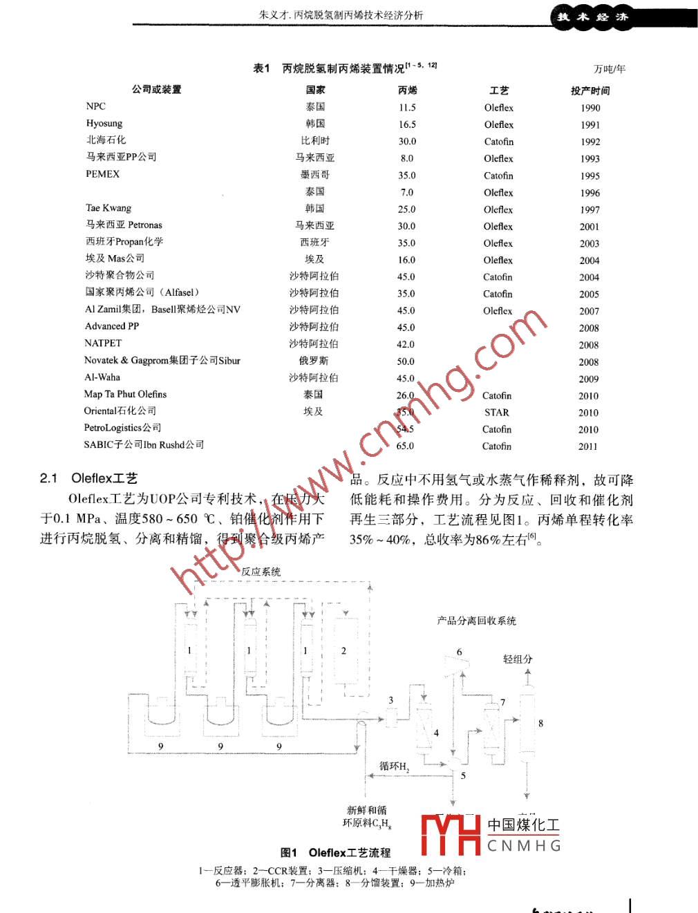 丙烷脫氫制丙烯技術經(jīng)濟分析朱義才(中國石化股份有限公司金陵分公司,南京210033)摘要:列出了一些丙烷脫氫裝置及其工藝技術,介紹了幾種常見丙烷脫氫制丙烯工藝技術,詳細對比分析了兩種工業(yè)化使用較多的 Reflex工藝和 Cat ofin工藝。結(jié)合我國情況進行了技術經(jīng)濟分析,并提出了投資建議。關鍵詞:丙烷脫氫丙烯 Reflex工藝 Cat ofin工藝技術經(jīng)濟分析丙烯作為重要的石油化工中間體,主要用于 Catofin工藝使用較多,Uhde公司STAR工藝剛工業(yè)生產(chǎn)聚丙烯、丙酮、丁醇、辛醇、丙烯腈、環(huán)氧化。③裝置多建在中東、非洲及其他廉價丙烷供丙烷、異丙苯、丙烯酸以及異丙酸等。近年來,應充足地區(qū)。④沙特阿拉伯近幾年新建該類裝置隨著聚丙烯等下游產(chǎn)品需求的快速增長,以及以較多,因為新的乙烷裂解制乙烯工藝在該地區(qū)得乙烷為原料的新建乙烯裝置比例的增加,丙烯資到推廣,而該工藝幾乎不生成丙烯,以前石腦油源供需缺口逐漸增加。以丙烷為原料,通過氧化裂解制乙烯大量聯(lián)產(chǎn)丙烯空缺需要填補,且該地脫氫制丙烯這一工藝路徑逐漸受到了人們重視區(qū)廉價丙烷原料充足。丙烷脫氫制丙烯工藝及其應用概況2丙烷脫氫工藝技術丙烷選擇性脫氫生產(chǎn)丙烯技術是在異丁烷內(nèi)烷脫氫為強吸熱反應,高溫和低分壓促進脫氫生產(chǎn)異丁烯基礎上發(fā)展起來的。目前,丙脫氫反應,但溫度過高會增加副反應,且多數(shù)有烷脫氫已逐步成為工業(yè)化生產(chǎn)丙烯的重要工藝過影響的副反應都不會受熱力學平衡的限制,從而程,其市場份額正不斷擴大。由于丙烷脫氫過程降低生成丙烯主反應的選擇性,工業(yè)上反應溫度原料單一,產(chǎn)品只有氫氣與丙烯且易分離,因此都保持在650℃以下。為得到較高單程轉(zhuǎn)化率需要丙烯收率較高。目前較成熟的丙烷脫氫制丙烯工較長停留時間,對丙烯的選擇性也有很大的負面藝有UOP公司的 Preflex工藝、 ABB Lummus公司影響,采用絕對壓力稍高于大氣壓或用稀釋劑降的 Catofin工藝、 Linde ag/BASF的PDH工藝、低烴分壓來保持低分壓,由于這些因素,丙烷脫Snamproggetti/ Yarsintez公司的FBD-3工藝、 Krupp氫工藝單程轉(zhuǎn)化率在32%~55%之間,丙烯選擇Uhde公司的STAR工藝。其中 Reflex工藝和 Catofin性在87%~91%(摩爾)之間。目前主要有以下幾種工藝已有多套工業(yè)化應用,STAR工藝有一套工業(yè)工藝?;b置,詳見表1。從表1可看出:①丙烷脫氫制丙烯裝置規(guī)模已從最初的10萬噸/年左右增加到現(xiàn)在的40萬噸/年收稿!V凵中國煤化工以上,近幾年新建裝置規(guī)模已達50萬噸/年左右。作者CNMAHO從事科技信息②UOP公司的 Reflex工藝和 ABB Lummus公司的調(diào)研和化2012年第8期總第212期方數(shù)朱義才.丙烷脫氫制丙烯技術經(jīng)濟分析術經(jīng)濟表1丙烷脫氫制丙烯裝置情況.1萬噸庳公司或裝置國家丙烯工藝投產(chǎn)時間泰國l15ReflexHyosung韓北海石化Catofin馬來西亞PP公馬來西亞1993PEMEX墨西哥35.0泰國Oleflexang韓國Reflex馬來西亞 Petronas馬來西亞30.0Reflex2001西班牙 Propan化學西班牙35.02003埃及Mas公司埃及16.0Reflex2004沙特聚合物公司沙特阿拉伯Catofin2004國家聚丙烯公司( Alfasel)沙特阿拉伯35.0CatofinAl zamil集團,Base聚烯烴公司NV沙特阿拉伯Advanced PP沙特阿拉伯45.02008NATPET沙特阿拉伯2008Novatek& Gazprom集團子公司 Sibur俄羅斯2008沙特阿拉伯45.02009Map Ta Phut Olefins泰國CatofinOriental石化公司埃及STARPetrologistics公司SABC子公司 bn rushd公司Catofin2.1 Reflex工藝品。反應中不用氫氣或水蒸氣作稀釋劑,故可降Oleflex工藝為UOP公司專利技術,在壓力大低能耗和操作費用。分為反應、回收和催化劑于0.MPa、溫度580~650℃、鉑催化劑作用下再生三部分,工藝流程見圖1。丙烯單程轉(zhuǎn)化率進行丙烷脫氫、分離和精餾,得到聚合級丙烯產(chǎn)35%~40%,總收率為86%左右反應系統(tǒng)品分離回收系統(tǒng)輕組分新鮮和循環(huán)原料CH中國煤化工圖1 Reflex工藝流程CNMHG1一反應器:2CCR裝置;3一壓縮機:4干燥器:5一冷箱6一透平膨脹機;7一分離器:8-分餾裝置:9—加熱爐2012年第8期總第212期R3M代31)反應部分。丙烷原料與富含氫氣的循環(huán)丙和再循環(huán)的丙烷,可得到純度為995%~99.8%的烷氣混合,加熱到反應器所需進口溫度并在高選丙烯產(chǎn)品擇性鉑催化劑作用下反應生成丙烯,使用4臺徑流3)再生部分。再生部分具有催化劑燒焦、式反應器,使吸熱反應的轉(zhuǎn)化率和選擇性達到優(yōu)鉑催化劑重新分配、除去額外的水分及催化劑再化,催化劑連續(xù)再生。生等4項主要功能。催化劑循環(huán)再生時間通常為2)回收精餾部分。反應生成氣經(jīng)冷卻、壓5~10天??s、干燥,然后送到冷箱部分冷凝,氣體分為2.2 Catofin工藝循環(huán)氣和純凈氣,純凈氣是摩爾分數(shù)近90%的氫Catofin工藝是美國 ABB Lummus公司開發(fā)的氣,雜質(zhì)主要是甲烷和乙烷;液體主要是丙烯和C3~Cs烷烴脫氫生產(chǎn)單烯烴技術,該工藝分為反未反應丙烷混合物,送到下游精餾部分回收丙烯應、壓縮、回收和精制4個工段,工藝流程見圖2。氣燃料蒸汽未轉(zhuǎn)化排汽循環(huán)丙烷H任變壓吸附1≯燃料氣10圖2 Catofin工藝流程1一換熱器;2一蒸汽發(fā)生器;3一加熱爐;4—吹掃段反應器;5一加工段反應器:6一冷卻器:7一壓縮機:8一空冷:9閃蒸罐;10一干燥器:11-冷箱;12一氣化器:13-—加