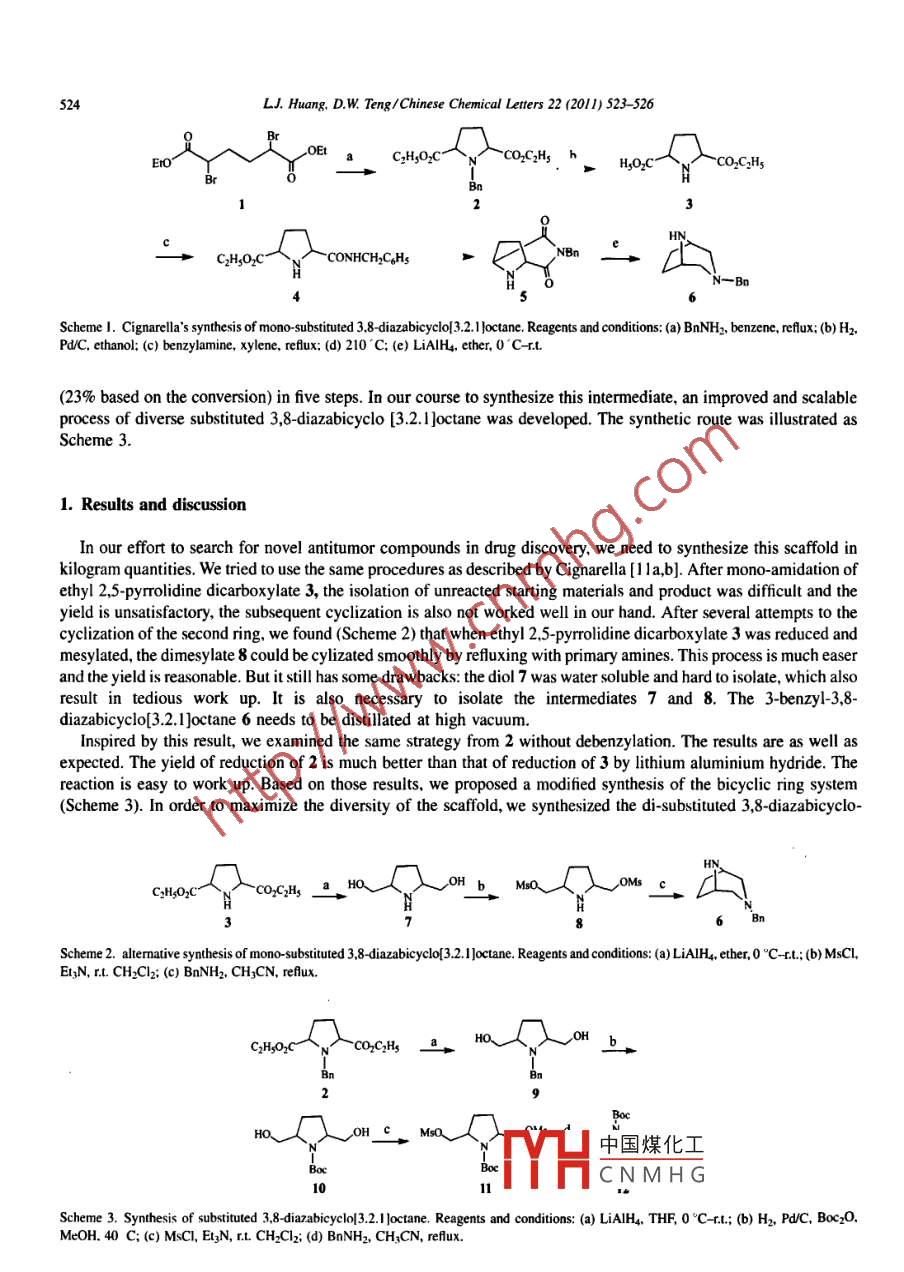 Available online at www.sciencedirect.comCHINES E。ScienceDirectC HEMICAL. L ETTERSEL SEVIERChinese Chemical Letters 22 (2011) 523- -526www.elsevier.com/locate/ccletAn improved and scalable process for 3,8-diazabicyclo[3.2.1]-octane analoguesLong Jiang Huang, Da Wei TengCollege of Chemical Engineering, Qingdao University of Science & Technology. Qingdao 266042. ChinaReceived 23 August 2010Available online 1 March 201 IAbstractAn improved and scalable process for substituted 3,8-diazabicyclo[3.2. I]octane was developed. N-Benzy1-2.5-dicarbethoxy-pyrrolidine 2 was reduced to N-benzyl-2,.5 dihydroxymethylpyrolidine 9 and subsequently debenzylated to afford N-Boc-2,5-dihydroxymethylpyrrolidine 10. After mesylation of the diol 10 and cyclization with benzylamine, a diversity of scaffold, 3,8-diazabicylol3.2.1loctane analogue 12 was obtained in a total yield of 42% in five steps.心2010 Da Wei Teng. Published by Elsevier B.V. on behalf of Chinese Chemical Society. All rights reserved.Keywords: 3.8-Dazabicyelo13.2.1 loctane; Scaffold; Process developmentThe piperazine nucleus is often found embedded in chemotherapic agents exhibiting a wide range of biologicalactivities [1,2]. As an analogue and alternative of piperizine in drug discovery, compounds based on 3,8-diazabicyclo[3.2.1]octanyl ring system received great interest for their biological acativities such as anti-tumoractivity [3], antiarrhythmic activity [4], antinociceptive activity [5], analgetic activity [5,6], as μ-opioid receptor [7],neuronal nicotinic acetylcholine receptor [8] as well as novel amide CCR5 antagonist [9].Cignarella et al. [10] first reported the synthesis of 3,8-diazabicyclo[3.2.1 ]octane derivatives. Several 3-substituted-8-methyl-3,8-diazabicyclo[3.2. l]octanes were synthesized starting from 2,5-dicarbethoxypyrrolidine, which wasconverted into N-carbobenzoxy-2,5-pyrrolidine dicarboxylic acid anhydride in three steps. The latter reacted withappropriate amines to give 3-substituted-8-carbobenzoxy-3,8-diazabicyclo[3.2. I ]octanes-2,4-diones from which thecorresponding bicyclic bases were obtained by reduction with lithium aluminium hydride. The process suffers fromseveral disadvantages such as long steps, tedious and labrious isolation of intermediates and low overall yields. A moreefficient synthesis of 3-benzyl-3,8-diazabicyclo[3.2.1 ]octanes was subsequently reported soon and has being usedtoday (Scheme I) [3.5,9,1 I]. The key intermediate, 2-benzylcarbamyl-5- carbethoxy pyrrolidine 4 was obtained in anoverall yield of 87% based on the recovery of starting materials by refluxing 3 with benzylamine in xylene. 4 was thenheated at 200 -210 C to afford intermediate 5 from which the 3-benzyl-3,8- diazabicyclo[3.2.1 ]octane was obtained byreduction with lithium aluminiun hydride. The modified synthesis is much shorter and efficient than the original one.But it still has some drawbacks. The intermediates need to be isolated in each step, which result in labrious work-upand isolation. The cyclization of the key intermediate 4 was carried out at high temperature. The total yield is only 17%* Corresponding author.中國煤化工E-mail udress: dteng@qus.edu.cn (D.W. Teng).MHCNMHG.1001-84175 - see front matter C 2010 Da Wei Teng. Published by Elsevier B.V. on behalf of Chinese Chemical Society. All rights reserved.doi;10.1016j.cclet.2010.1 1.030524LJ. Huang, D.W. Teng/Chinese Chemical Letters 22 (2011) 523 -526CHzO2CCO2C2HsHyO2CNCO2C:Hs3n3CH2O2CCONHCH2CHs?出N- -BnScheme I. Cignerella's synthesis of mono substituted 3.8 diazabiclol3.2.loctane. Reagents and conditions: (a) BnNH2, benzene, refux; (b) H2,Pd/C, ethanol; (c) benzylamine, xylene, refux; (d) 210 'C; (e) LiAlH4, ether, 0 'C r.t.(23% based on the conversion) in five steps. In our course to synthesize this intermediate, an improved and scalableprocess of diverse substituted 3,8 diazabicyclo [3.2.1 ]octane was developed. The synthetic route was illustrated asScheme 3.1. Results and discussionIn our effort to search for novel antitumor compounds in drug discovery, we need to synthesize this scaffold inkilogram quantities. We tried to use the same procedures as described by Cignarella [1 la,b]. After mono-amidation ofethyI 2,5-pyrrolidine dicarboxylate 3, the isolation of unreacted starting materials and product was difficult and theyield is unsatisfactory, the subsequent cyclization is also not worked well in our hand. After several attempts to thecyclization of the second ring, we found (Scheme 2) that when ethyl 2.5-pyrrolidine dicarboxylate 3 was reduced andmesylated, the dimesylate 8 could be cylizated smoothly by refluxing with primary amines. This process is much easerand the yield is reasonable. But it still has some drawbacks: the diol 7 was water soluble and hard to isolate, which alsoresult in tedious work up. It is also necessary to isolate the intermediates 7 and 8. The 3-benzyl-3,8-diazabicyclo[3.2.l]octane 6 needs to be distillated at high vacuum.Inspired by this result, we examined the same strategy from 2 without debenzylation. The results are as well asexpected. The yield of reduction of 2 is much better than that of reduction of 3 by lithium aluminium hydride. Thereaction is easy to work up. Based on those results, we proposed a modifed synthesis of the bicyclic ring system(Scheme 3). In order to maximize the diversity of the scaffold, we synthesized the di-substituted 3,8-diazabicyclo-C:HsO2C-Co,C;Hs_ a . HO~OH b MsOBnScheme 2. alternative synthesis of mono-substituted 3,8-diazabicyclo[3.2. l]octane. Reagents and conditions: (a) LiAIH4, ether, 0 °C-rt; (b) MsCl,El;N, r.t. CH2Cl2; (c) BnNH2, CHzCN, refux.CHsO2CCO2C;Hs_ aHb,29Boc中國煤化工3oeTYHCNMHGScheme 3. Synthesis of substituted 3.8 diazabicyclo|3.2.1 loctane. Reagents and conditions: (a) LiAlH, THF, 0 °C- tu; (b) H2, Pd/C, Boc2O,MeOH. 40 C; (c) MsCI, ElzN, rL. CH2Cl2; (d) BnNH2, CH;CN, refux.LJ. Huang, D.W. Teng/Chinese Chemical Ltters 22 (2011) 523- -526525[3.2.1 ]octane 12, which could b