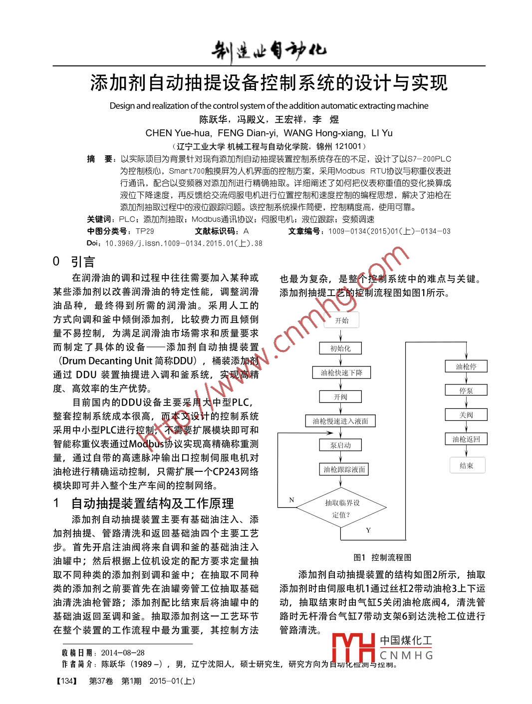 制造止自動化添加劑自動抽提設備控制系統(tǒng)的設計與實現(xiàn)Design and realization of the control system of the addition automatic extracting machine陳躍華,馮殿義,王宏祥,李煜CHEN Yue-hua, FENG Dian-yi, WANG Hong-xiang, LI Yu(遼寧工業(yè)大學機械工程與自動化學院,錦州121001)摘要:以實際項目為背景針對現(xiàn)有添加劑自動抽提裝置控制系統(tǒng)存在的不足,設計了以S7-200PLC為控制核心,Smart700觸摸屏為人機界面的控制方案,采用Modbus RTU協(xié)議與稱重儀表進行通訊,配合以變頻器對添加劑進行精確抽取。詳細闡述了如何把儀表稱重值的變化換算成液位下降速度,再反饋給交流伺服電機進行位置控制和速度控制的編程思想,解決了油槍在添加劑抽取過程中的液位跟蹤問題。該控制系統(tǒng)操作簡便,控制精度高,使用可靠。關鍵詞: PLC;添加劑抽取; Modbus通訊協(xié)議;伺服電機;液位跟蹤;變頻調(diào)速中圖分類號: TP29文獻標識碼: A文章編號: 1009-0134(2015)01( 上)-0134-03)oi: 10.3969/j. issn. 1009- -0134. 2015.01(上).380引言在潤滑油的調(diào)和過程中往往需要加入某種或也最為復雜,是整個控制系統(tǒng)中的難點與關鍵。某些添加劑以改善潤滑油的特定性能,調(diào)整潤滑添加劑抽提工藝的控制流程圖如圖1所示。油品種,最終得到所需的潤滑油。采用人工的方式向調(diào)和釜中傾倒添加劑,比較費力而且傾倒開始量不易控制,為滿足潤滑油市場需求和質(zhì)量要求↓而制定了具體的設備一添加劑自動抽提裝置初始化(Drum Decanting Unit 簡稱DDU),桶裝添加劑油槍停通過DDU裝置抽提進入調(diào)和釜系統(tǒng),實現(xiàn)高精油槍快速下降度、高效率的生產(chǎn)優(yōu)勢。停泵目前國內(nèi)的DDU設備主要采用大中型PLC,整套控制系統(tǒng)成本很高,而本文設計的控制系統(tǒng)油槍慢速進入液面采用中小型PLC進行控制,不需要擴展模塊即可和》↓油槍返回智能稱重儀表通過Modbus協(xié)議實現(xiàn)高精確稱重測泵啟動量,通過自帶的高速脈沖輸出口控制伺服電機對廠結束油槍進行精確運動控制,只需擴展一個CP243網(wǎng)絡油槍跟蹤液面模塊即可并入整個生產(chǎn)車間的控制網(wǎng)絡。1自動抽提裝置結構及工作原理抽取臨界設定值?添加劑自動抽提裝置主要有基礎油注入、添加劑抽提、管路清洗和返回基礎油四個主要工藝步。首先開啟注油閥將來自調(diào)和釜的基礎油注入圖1控制流程圖油罐中;然后根據(jù)上位機設定的配方要求定量抽取不同種類的添加劑到調(diào)和釜中;在抽取不同種添加劑自動抽提裝置的結構如圖2所示,抽取類的添加劑之前要首先在油罐旁管工位抽取基礎添加劑時由伺服電機1通過絲杠2帶動油槍3上下運油清洗油槍管路;添加劑配比結束后將油罐中的動,抽取結束時由氣缸5關閉油槍底閥4,清洗管基礎油返回至調(diào)和釜。抽取添加劑這一工藝環(huán)節(jié)路時無桿滑臺氣缸7帶動支架6到達洗槍工位進行在整個裝置的工作流程中最為重要,其控制方法管路清洗。中國煤化工收稿日期:2014-08-28.YHCNMH G作者簡介:陳躍華(1989-) ,男,遼寧沈陽人,碩士研究生, 研究方向為自動化位測與控制。[134]第37卷 第1期 2015- -01(上)制造止訇動化2.2程序結構概述系統(tǒng)程序由一個主程序和若干子程序組成,包括通訊程序、系統(tǒng)初始化程序,手動調(diào)試程序,自動運行程序、定時中斷程序和帶參數(shù)的(變頻器調(diào)用子程序等;程序結構采用SCR順序控制,在設備上電后首先執(zhí)行初始化,設定各參數(shù)初值,伺服電機和閥門返回初始位置,當各初始位傳感器給出反饋信號后進入自動運行狀態(tài),自動運行程序包含4個工藝步子程序;當切換到手動調(diào)試模式時,自動運行停止,手動操作電機和閥門;點擊自動運行,系統(tǒng)重新執(zhí)行初始化后進入自動運行程序。2.3添加劑精確抽取控制策略1.伺服電機; 2.導軌絲杠; 3.油槍; 4.油槍底閥;5.封口氣缸; 6.支架; 7.滑臺氣缸在添加劑的抽取過程中,為提高工作效率,首先使用較大速度對添加劑進行抽取,當距離設圖2裝置 結構圖定量還剩20%時,PLC記錄 下儀表此時采集的添加2控制系統(tǒng)設計劑重量VD658,然后減去后續(xù)抽取過程中添加劑2.1控制系統(tǒng)硬件配置的實時重量VD646,得到該時刻已抽重量LD12,PLC作為整個控制系統(tǒng)的核心用來完成現(xiàn)場再用設定值VD662的20%減去已抽重量LD12,得設備的實時控制,根據(jù)控制方案及點數(shù)選擇西門到距離設定量的差值LD16,PLC會隨著設定量子公司的CPU224XP晶體管型PLC,上面 帶有2個的臨:近控制變頻器的輸出轉(zhuǎn)數(shù)成比例減小,有效RS485自由通訊口,其中Port0與柯力智能稱重儀防止了因泵的抽取速度過快而造成的抽取過量問表采用Modbus RTU協(xié)議通信,Port1 口與Smart700題,從而保證了添加劑的配比精度,為消除機械觸摸屏通過PPI電纜進行通信"。在該型CPU的系統(tǒng)動作上造成的延時誤差,當距離設定值5%o基礎上擴展一-個模擬量模塊EM235,使用CPU自時,關閉槍口閥,停泵,結束抽取。帶的高速脈沖輸出口(Q0.0)和EM235上的模擬PLC與智能稱重儀表之間通過RS485總線建立量輸出通道AQW0對伺服電機進行位置控制和速起Modbus通訊網(wǎng)絡。Modbus協(xié)議采用主從方式度控制,通過CPU.上的模擬量輸出通道控制臺達的查詢響應機制,主機PLC發(fā)起通訊,智能儀表變頻器調(diào)節(jié)泵的抽取速度,HMI