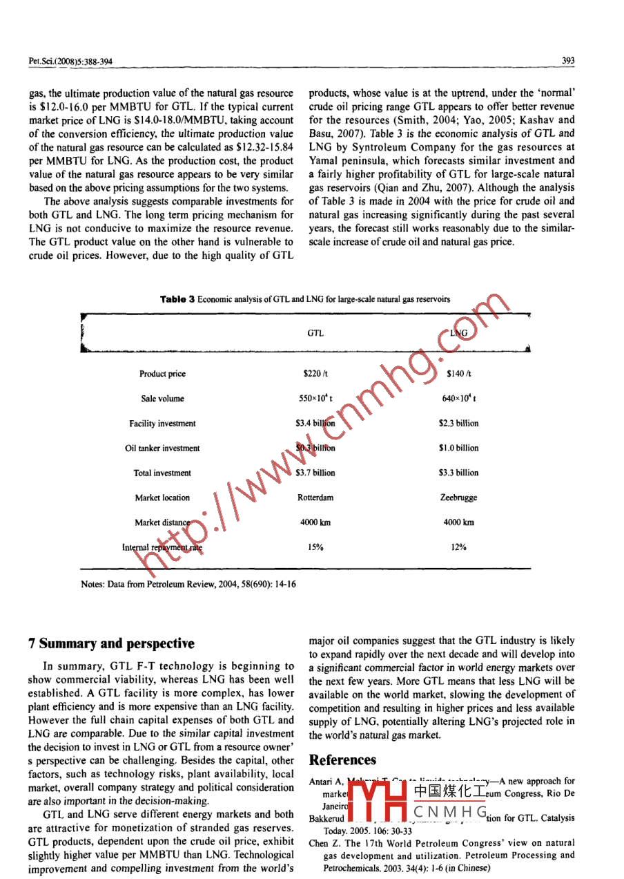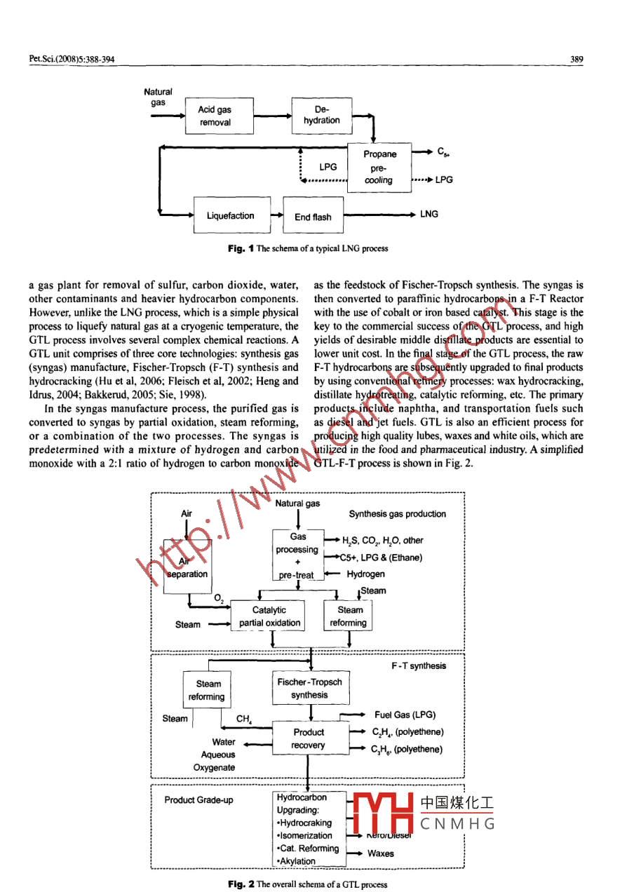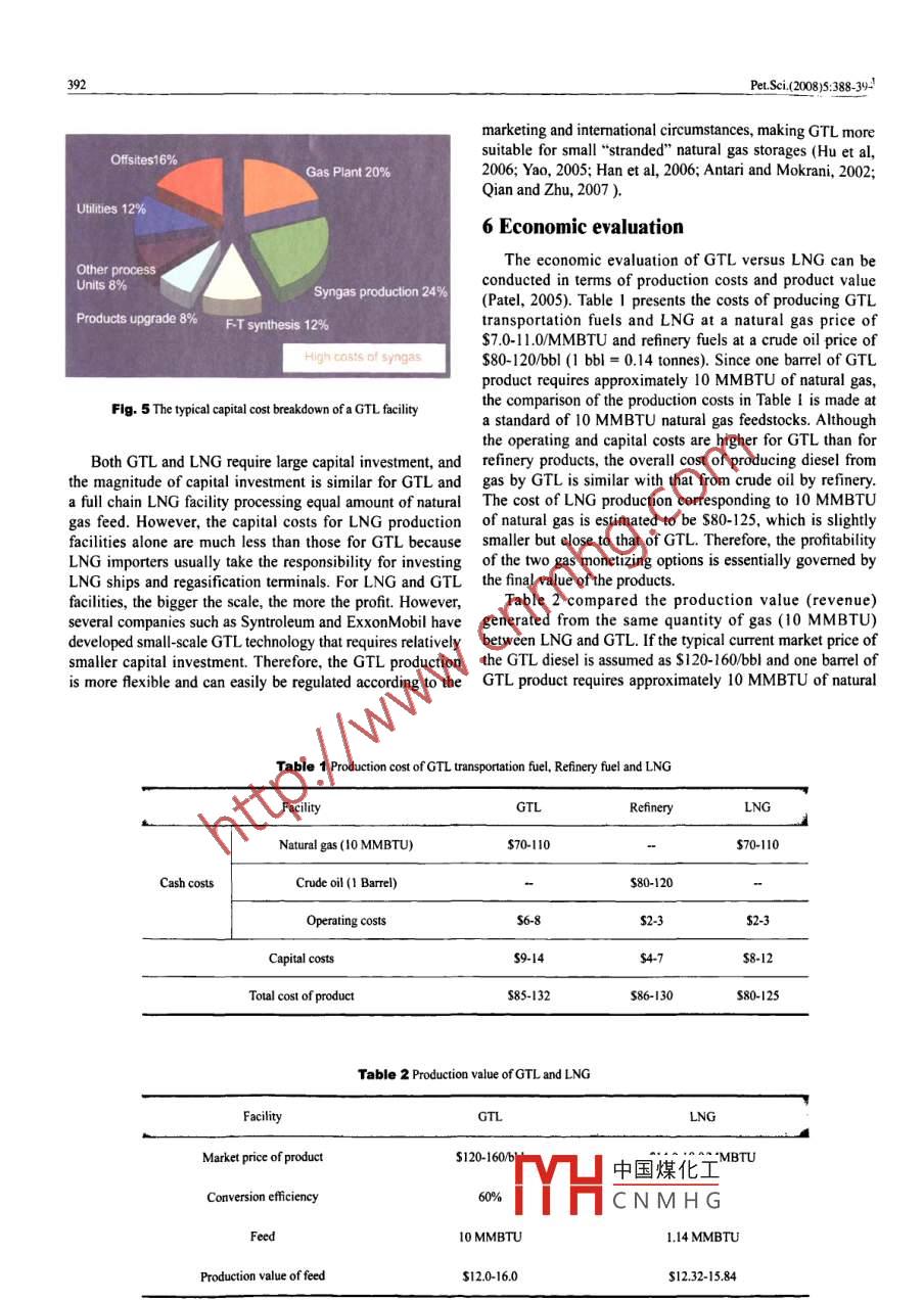 Pet.Sci(200895:388394DoI0.1007/s121820080063-8GTL or LNG: which is the best wayto monetize“ stranded” natural gasDong lichun, Wei Shun'an, Tan Shiyu*and Zhang HongjingSchool of Chemistry and Chemical Engineering, Chongqing University, Chongqing 400044, ChinaAbstract: A large portion of worlds natural gas reserves are"stranded"resources, the drive tomonetize these resources leads to the development of gas-to-liquids(GTL) and liquefied natural gas(LNG)technologies. LNG has the advantage of having been developed for the past 40 years and havingan excellent safety record. GTL on the other hand is another option with substantial benefits, but itslevelopment stage and commercial viability are far behind LNG. This paper presents a techno-economicomparison of GtL with LNG, including technical development, plant efficiency, market potential for theproducts, and capital cost for the infrastructure. The aim is to give an overall view on both LNG and GtLand provide a perspective on the profitability of these two technologiesKey words: GtL (gas to liquids), LNG(liquefied natural gas), " stranded "natural ga1 IntroductionLNG and GtL serve different energy markets withdifferent marketing systems, policies and strategies. Thei Natural gas is playing a more and more important role comparison between LNG and GtL is the most prominentthe supply of energy for both industrial and domestic use. debate for resource owners, developers and investorsThe total global annual gas consumption is forecast to rise alike. Several factors have to be considered to evaluateto 4.59 trillion cubic meters by 2020 with an annual increase the project economics. LNG has the obvious advantage ofrate of 3.2%( Chen, 2003), which is much faster than that of having been developed for the past 40 years and has to-dateil and coal the world,s plentiful gas supply sources, the enjoyed robust growth and has an excellent safety recorddesire for less carbon-intensive fuels, and the need for cleaner GTL on the other hand is a developing alternative to LNGair are driving a continuous innovation of gas technologies. with substantial benefits in terms of sustainable economicHowever, a considerable portion of the world natural gas social and environmental development. With the recentreserves fall into the category termed asstranded", whicdevelopment of GTL technology, the debate between GtLmeans that the gas reserves are either located remotely and LNG is no longer"is the project economic"but ratherfrom consumers or are sporadic in the region where any " which project is most profitable". This paper examinessingle reserve is relatively small. For the"stranded"gas, the the technical performance and market potential for LNGconventional means of transportation via pipeline is usually and GTL products, and the capital costs for LNG and GTLnot practical or economical because of geographical, political, infrastructure. The aim is to give an overall view on bothor diplomatic limitations. The owners of the"stranded"gas LNG and GTL and provide a perspective on the profitabilityface a challenge on how to monetize the large stranded gas of the two technologies(Pyrdol and Baron, 2006)resources. This drive leads to the developments in LNG andGTL technologies. The LNG is essentially a physical process 2 Technical developments of GtL and LNGconverting natural gas to liquid for easy transportation,while gtL is a chemical process that methane is convertedThe LnG process first involves a gas treatment plant forto naphtha, transportation fuels, and specialty chemicals via removal of acid gas(sulfur, carbon dioxide, water, and otherFischer-Tropsch(F-T)synthesis or into methanol and into contaminants. The gas is then cooled to separate the heaviergasoline with a methanol to gasoline(MTG) direct process. hydrocarbons such as C,, Ca, and Cs. components. TheseThe discussion in this paper is focused on Fischer-Tropsch heavier components are then fractionated to produce Cs. andsynthesis. The LNG and GTL products offer environmental Liquefied petroleum gas(LPG) products. The purified gas isbenefits over other conventional fuels such as coal and then liquefied in cryogenic exchangers at a temperatureproducts derived from crude oil; both offer excellent -162中國煤化工 of its original volumeprospects to countries having gas resources with potential for inin LNG tanks pricior tomonetizationCNMHGd tankers and regasifiedfor use in conventional gas markets such as power generationand domestic applications(Yang and Wang, 2005). A typicalCorrespondingauthor.email:thy@cqu.edu.cnLNG process is as Fig. 1Received July 23, 2008Like the LNG process, the gtl process also starts withPet. Sci.(2008)5:388-394NaturalremovalydrationPropane>LPGEnd flashFig. 1 The schema of a typical LNG processa gas plant for removal of sulfur, carbon dioxide, water, as the feedstock of Fischer-Tropsch synthesis. The syngas isother contaminants and heavier hydrocarbon components. then converted to paraffinic hydrocarbons in a F-T ReactorHowever, unlike the LNG process, which is a simple physical with the use of cobalt or iron based catalyst. This stage is theprocess to liquefy natural gas at a cryogenic temperature, the key to the commercial success of the Gtl process, and highGtL process involves several complex chemical reactions. a yields of desirable middle distillate products are essential toGTL unit comprises of three core technologies: synthesis gas lower unit cost. In the final stage of the Gtl process, the raw(syngas)manufacture, Fischer-Tropsch(F-T)synthesis and F-t hydrocarbons are subsequently upgraded to final productshydrocracking(Hu et al, 2006: Fleisch et al, 2002; Heng and by using conventional refinery processes: wax hydrocracking.Idrus, 2004; Bakkerud, 2005: Sie, 1998)distillate hydrotreating, catalytic reforming, etc. The primaryIn the syngas manufacture process, the purified gas is products include naphtha, and transportation fuels suchconverted to syngas by partial oxidation, ste