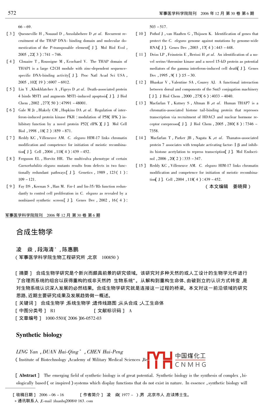572軍事醫(yī)學科學院院刊2006年12月第30卷 第6期66 - 69.503 -517.[3 ] Quesneville H , Nouaud D , Anxolabehere D et al. Recurrent re-[ 10] Pothof J , van Hatn G ,hijssen K. Identification of genes thatcruitment of the THAP DNA- binding domain and molecular do-protect the C. elegans genome against mutations by genome-widemestication of the P-transposable element[ J ] Mol Biol Evol ,RNA[J] Genes Dev ,2003 ,17( 4 ):443 - 448.2005 ,22(3 ):741 -746.[11 ] Deiss LP ,Feinstein E , Berissi H el al. An ienification of a no-[4] Clouaire T , Roussigne M , Ecochard V. The THAP domain ofvel serine/ threonine kinase and a novel 15-kD protein as potentialTHAPI is a large C2CH module with zinc-dependent sequence-mediators of the garnma interferon-induced cell deat[ J ] Genesspecifie DNA-binding activity[ J ] Proe Natl Acad Sci USA ,Dev ,1995 ,9(1 ):15 -30.2005 , 102( 19):6907 - 6912.[ 12 ] Bhaskar V , Valentine SA , Courey AJ. A functional interaction[5] Lin Y , Khokhlatchev A , Figeys D et al. Death-associated proteinbetween dorsal and components of the Smt3 conjugation machinery4 binds MST1 and augments MSTI -induced apoptosi[ J] J Biol[J] J Biol Chem ,2000 ,275( 6 ):4033 - 4040.Chem ,2002 ,277( 50 ) :47991 - 48001.[ 13] Macfarlan T , Kutney S , Altman B ,et al. Human THAP7 is a[6] Gale M Jr ,Blakely CM , Hopkins DA el al. Regulation of inter-chromain-associated histone tail-binding protein that repressesferon-induced protein kinase PKR : modulation of P58( IPK ) in-transcription via recruitment of HDAC3 and nuclear hormone re-hibitory function by a novel protein P52( rIPK )[ J ] Mol Cellceptor corepressor[ J] J Biol Chem , 2005 , 280( 8 ): 7346 -Biol , 1998 ,18(2):859 - 871.7358.[7] Reddy KC , Villeneuve AM. C. elegans HIM-17 links chromatin[ 14] Macfarlan T , Parker JB , Nagata K ,et al. Thanatos-associatedmodification and competence for initiation of meiotic recombina-protein 7 associates with template activating factor- I β and inhib-tior[J] Cell ,2004 ,118(4) :439 -452.its histone acetylation to repress transcription[ J ]. Mol Endocri-[8] Ferguson EL , Horviz HR. The multivulva phenotype of certainnol ,2006 ,20( 2):335 -347.Caenorhabditis elegans mutants resuts from defects in two func- [ 15] Reddy KC , Villeneuve AM. C. elegans HIM-17 links chromatintionally redundant pathways[ J ] Genetics, 1989 , 123( 1 ):109-121.tior[ J]. Cell ,2004 ,118(4 ):439 -452.[9] Fay DS , KeenanS ,Han M. Fzr-1 and lin-35/ Rb function redun-(本文編輯姜曉舜)dantly to control cell proliferation in C. elegans as revealed by anonbiased synthetic screen[ J] Genes Dev , 2002 , 16( 4 ):軍事醫(yī)學科學院院刊_ 2006年12月 第30卷第6期合成生物學凌焱,段海清”,陳惠鵬(軍事醫(yī)學科學院生物工程研究所北京100850 )[摘要]合成生物學研究是個新興而頗具前景的研究領域。該研究對多種天然的或人工設計的生物學元件進行了合理而系統(tǒng)的組合以獲得重構的或非天然的生物系統(tǒng)”。從解構到重構生命體、由破到立的認識方式轉變是對生物系統(tǒng)認識深入發(fā)展的必然結果。合成生物學研究就是連接這-過程的橋梁。本文對這-前沿領域的研究思路、近期主要研究成果及發(fā)展趨勢做一概述。[關鍵詞]合成生物學 系統(tǒng)生物學遺傳線路圖從頭合成人工生命體[中圖分類號] R1[文獻標識碼]A[文章編號] 100-5501( 2006 )06-0572-03Synthetic biologyLING Yan , DUAN Hai-Qing* , CHEN Hui-Peng中國煤化工( Institute of Biotechnology Academy of Military Medical Sciences ITYHCNMHG[ Abstract ] The emerging field of synthetic biology is of great potential. Synthetic biology is the synthesis of complex ,bi-ologically based ( or inspired ) systems which display functions that do not exist in nature. In essence , synthetic biology will[收稿日期] 2006 -06-16.[作者簡介]凌焱(1977- )男北京市人在讀博士生。*通訊聯(lián)系人E-mail xduanhq2008@ 163. com軍事醫(yī)學科學院院刊2006 年12月第30卷第6期enable the design of biological systems in a rational and systematic way. Synthetic biology stands at the meeting-point of de-structing life and construction of life. In this article the current state of this field in scientific and technalogical perspectiveis reviewed and the potentially beneficial outcomes are explored.[ Key words ] synthetic biology ; systems biology ; genetic circuit ; de novo synthesis ; artificial life早在1978年就已有人預言合成生物學"時代將會來題.上(例如利用光能來處理廢氣、凈化水)或者能制造出用臨'。人工合成基因研究最早出現(xiàn)在20世紀60年代2]然化學與生物合成方法都難以獲得的具有復雜結構的藥物或而受到當時基因合成能力與成本因素的制約在飛速發(fā)展者將-些能對身體健康狀況的改變做出應答的基因和蛋白的DNA重組技術備受矚目時人工合成基因的應用十分有質(zhì)整合成分子醫(yī)生”,使其在多種疾病的發(fā)病早期就發(fā)送限。時過境遷隨著遺傳工程和系統(tǒng)生物學的發(fā)展人們對警示訊息[51湛至還可以協(xié)助人類尋找宇宙中的其他生命跡生物系統(tǒng)的認識逐步加深隨著基因組數(shù)據(jù)庫的日益豐富、象[°]。無疑結合了對基本生物學元件的深入了解和自由操生物信息學與材料科學領域的進步新的技術方法、更高的作能力的合成生物學的前景極其廣闊。效率和更低的成本令人工合成生命體的設想開始成為可能。2近期研究成果合成生物學研究以-種嶄新的姿態(tài)重新出現(xiàn)在學者們面前3。當前雖然在世界范圍內(nèi)合成生物學研究還沒有形成系統(tǒng)化與規(guī)?;惨呀?jīng)取得了不少令人欣喜的研究成果。1合成生物學的概念與意義2.1非天然的控制細胞生命活動的分子網(wǎng)
