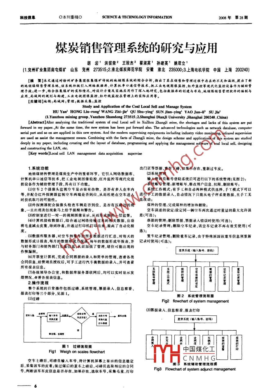 科技僧息.O本刊重稿OSCIENCE & TECHNOLOGY INFORMATION2008年第28期煤炭銷售管理系統(tǒng)的研究與應用胡巖'洪留榮2王致杰3翟淑英'孫建英'姚君立1(1.兗州礦業(yè)集團南屯煤礦山東兗州273515;2.淮北煤炭師范學院 安徽淮北235000;3. 上海電機學院中國上海200240)摘要]本文通過對徐州礦務集團張集煤礦傳統(tǒng)的地鋪煤系統(tǒng)的綜合分析,指出了其在銷售和管理過程中存在的不足和漏洞,提出了新的地銷煤銷售管理系統(tǒng),該系統(tǒng)積極引入網(wǎng)絡數(shù)據(jù)庫、計算機串口通信等技術(shù),把工業(yè)電視團像監(jiān)控、虹外監(jiān)控等現(xiàn)代化監(jiān)控設備作為輔助管理手段;進一步,結(jié)合張集煤礦的實際情況,對設計方案及實施應用作了深入地研究,包括數(shù)據(jù)庫的創(chuàng)建與布局,地鋪煤銷售管理軟件的編制與應用,局域網(wǎng)的規(guī)劃與構(gòu)建,工業(yè)電視圖像監(jiān)控、紅外線監(jiān)控在管理上的實際應用等。[關(guān)鍵詞]地銷;局城網(wǎng);管理;數(shù)據(jù)采集;監(jiān)控Study and Application of the Coal Local Sell and Manage SystemHU Yan' HONG Liu -rong' WANG Zhi-jie' QU Shu -ying' SUN Jian -ying' YAO Jun-IP su Je'(1.Yanzhou mining group, Yanzhou Shandong 273515; 2.Shanghai DianJi University ,Shanghai 200240, China)[Abstract]After analyzing the taditional system of coul Local sell in XxuZhou Zhangli mine, the shortages and lacks of this sytem are putforward in my paper.At the same time, the new Bystem has been put forward also. The advanced technologies such as network database, computerserial port and B0 on are applied in this new system. And the moderm supervising equipments including industry video monitoring, infrared supervisionare used昭asist the management meane. Combining with the facts of Zhangi mine, the deign scheme and aplications of this sytem are studieddeeply in my paper, ineluding creating and the layout of database, programming and applying the management sofware of coal loceal ell,, desigingand constructing the LAN, etc.[Key words]Local sell LAN managenent dala acquisition supervise1.系統(tǒng)功能出門證等票據(jù),重車下磅,如果不存在.重新過車皮。地銷煤銷傳管理是煤炭生產(chǎn)中的重要環(huán)節(jié),它引入網(wǎng)絡數(shù)據(jù)庫、(2)系統(tǒng)管理計算機串口通信等技術(shù),把工業(yè)電視圖像監(jiān)控、紅外監(jiān)控等現(xiàn)代化監(jiān)輸人管理員賬號登陸系統(tǒng)后可進行以下的系統(tǒng)管理(見圖2): .控設備作為輔助管理下段,具有以下功能。系統(tǒng)賬號管理:新增賬號,修改用戶信息.權(quán)限,刪除賬號:(1)空車2個攝像頭監(jiān)視空車是否裝有雜物,是否有多人在車內(nèi)系統(tǒng)工作模式:有手L和自動兩種模式供選擇,手T.模式下可以等,并配合紅外探測器監(jiān)視空車兩端是否到位,從而杜絕在空車進入進行 手工的數(shù)據(jù)錄人,自動情況下只能從電子秤采集數(shù)據(jù),且乎T.無時投機取巧的可能性。法改動:(2)外探測器配合攝像頭檢在車輛是否到位,是否有壓磅邊的現(xiàn)煤種的管哩:完成煤種的增加和刪除;象,一旦出現(xiàn)類似現(xiàn)象馬上給予提醒和警告。空車誤差的設定:設定同一輛空車兩次通過時重址的最大允許誤(3)控制室進行一對-的視頻圖像顯示,從而形成新的一層監(jiān)骨。差(可選);(4)計算機接收數(shù)據(jù)后,結(jié)合逋過網(wǎng)絡傳輸過來的相關(guān)數(shù)據(jù),自動票據(jù)的管理:刪除票據(jù).票據(jù)錄人錯誤時使用(可選);將毛重減去皮重,得到凈重,并通過打印機打印出來,提高了自動化程空車紀錄管理:刪除空車紀錄.該空車記錄不再有效文使用(可(5)數(shù)據(jù)庫服務器,對空車和重車的所有數(shù)據(jù)進行匯總,對每犬的重車紀錄管理:剿除重車記錄,由于特殊原因該重車信息須重新數(shù)據(jù)形成口報表,每月的數(shù)據(jù)形成月報表,每年的數(shù)據(jù)形成年報表,并記求時使用(可 選);與財務部門]和銷件部門互通信息.從面加強了管理.堵住可能出現(xiàn)的作弊溜洞。壹錄系境 (輸入脹號、密鶴)(6)開票室計算機.完成合同票據(jù)的錄人和簡單的管理,在看各類合同信息,經(jīng)管理員授權(quán)后,可手工進行汽車衡數(shù)據(jù)的錄入,并可查看所有報表信息。(7)各級領導辦公室,和數(shù)據(jù)庫服務器聯(lián)網(wǎng)后,均可以實時顯示發(fā)煤情況,奮看各報表信息。|2.操作流程武|整個系統(tǒng)的日常操作包括過磅.系統(tǒng)管理,票據(jù)錄入、信息察看、報表打印等三個部分,見圖1。圖2系統(tǒng)管理流程圈(1)過磅Fig2 flowchart of system management(3票據(jù)錄入、信息察看、報衣打印車入場,輸入車號精3+<年度在型速取$車出腸采舞毛宣壹錄系統(tǒng)(輸入賬號。密碼) .打印集提畜||圈1過磅流程圈中國煤化工品ig1 Weigh on scales flowchart空車上磅后,司磅員輸人車號,待計算機屏幕上顯示的信息穩(wěn)定TYHCNMHG圖3系統(tǒng)輔助管理流程圜后,采集該車的皮重;裝過煤后的重車上確后.問磅員選取相應的合同F(xiàn)ig3 Flowchart of system adjunct management號,判斷該車車皮信息是否存在.如果存在,選取車號,采集毛重,打印科技信息.O本刊重稿OSCTENCE & TECHNOLOGY INFORMATION2008年第28期輸人操作員賬號登陸系統(tǒng)后可進行合同的最人,補充合同的承人,合問余址的刪除,合同.車輛信總的查看,各類報表的查看,以及打印報故等(見圖3)。3.應用中遇到的問題及解決方案2003年3月3