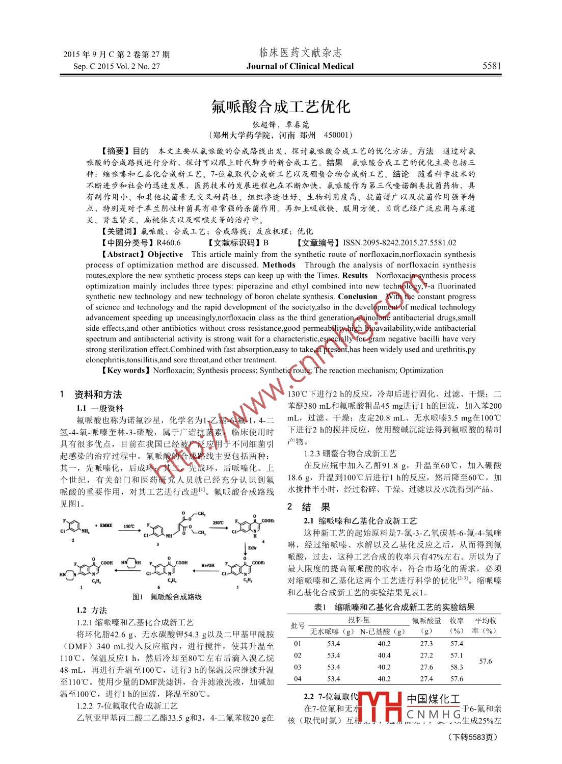 2015年9月C第2卷第27期臨床醫(yī)藥文獻(xiàn)雜志Sep. C 2015 Vol. 2 No. 27Journal of Clinical Medical5581氟哌酸合成工藝優(yōu)化張超鋒,覃春菀鄭州大學(xué)藥學(xué)院,河南鄭州450001)【摘要】目的本文主要從氟哌酸的合成路線岀發(fā),探討氟哌酸合成工藝的優(yōu)化方法。方法通過對(duì)氟哌酸的合成路線進(jìn)行分析,探討可以跟上時(shí)代腳步的新合成工芑。結(jié)果氟哌酸合成工藝的優(yōu)化主要包括種:縮哌嗪和乙基化合成新工藝、7-位瓶取代合成新工藝以及硼螫合物合成新工藝。結(jié)論隨著科學(xué)技術(shù)的不斷進(jìn)步和社會(huì)的迅速發(fā)展,醫(yī)藥技術(shù)的發(fā)展進(jìn)程也在不斷加快,氟哌酸作為第三代喹諾酮類抗菌藥物,具有副作用小、和其他抗菌素?zé)o交叉耐藥性、組織滲透性好、生物利用度高、抗菌譜廣以及抗菌作用強(qiáng)等特點(diǎn)、,特別是對(duì)于革蘭陰性桿菌具有非常強(qiáng)的殺菌作用。再加上吸收快、服用方便,目前已經(jīng)廣泛應(yīng)用與尿道炎、腎盂腎炎、扁桃體炎以及咽喉炎等的治療中【關(guān)鍵詞】氟哌酸;合成工藝;合成路線;反應(yīng)機(jī)理;優(yōu)化【中圖分類號(hào)】R460.6【文獻(xiàn)標(biāo)識(shí)碼】B【文章編號(hào)】ISSN,2095-8242.201527.5581.02Abstract l Objective This article mainly from the synthetic route of norfloxacin, norfloxacin synthesisprocess of optimization method are discussed. Methods Through the analysis of norfloxacin synthesisroutes, explore the new synthetic process steps can keep up with the Times. Results Norfloxacin synthesis processoptimization mainly includes three types: piperazine and ethyl combined into new technology, 7-a fluorinatedsynthetic new technology and new technology of boron chelate synthesis. Conclusion With the constant progressof science and technology and the rapid development of the society, also in the development of medical technologyadvancement speeding up unceasingly, norfloxacin class as the third generation quinolone antibacterial drugs, smallside effects, and other antibiotics without cross resistance, good permeability, high bioavailability, wide antibacterialspectrum and antibacterial activity is strong wait for a characteristic, especially for gram negative bacilli have verystrong sterilization effect. Combined with fast absorption, easy to take, at present, has been widely used and urethritis, pyelonephritis, tonsillitis, and sore throat, and other treatment.( Key words Norfloxacin; Synthesis process; Synthetic route; The reaction mechanism; Optimization資料和方法130℃下進(jìn)行2h的反應(yīng),冷卻后進(jìn)行固化、過濾、干燥1.1一般資料苯醚380mL和氟哌酸粗品45mg進(jìn)行l(wèi)h的回流,加入苯200氟哌酸也稱為諾氟沙星,化學(xué)名為1-乙基-6-氟1,4mL,過濾、干燥;皮定20.8mL、無(wú)水哌嗪35mg在:100C氫-4氧-哌嗪奎林-3-磷酸,屬于廣譜抗菌素,臨床使用時(shí)下進(jìn)行2h的攪拌反應(yīng),使用酸堿沉淀法得到氟哌酸的精制具有很多優(yōu)點(diǎn),目前在我國(guó)已經(jīng)被廣泛應(yīng)用于不同細(xì)菌引產(chǎn)物。起感染的治療過程中。氟哌酸的合成路線主要包括兩種1.2.3硼螯合物合成新工藝其一,先哌嗪化,后成環(huán):其二,先成環(huán),后哌嗪化。上在反應(yīng)瓶中加入乙酐91.8g,升溫至60℃,加入硼酸個(gè)世紀(jì),有關(guān)部門和醫(yī)藥研究人員就已經(jīng)充分認(rèn)識(shí)到氟186g,升溫到100℃后進(jìn)行1h的反應(yīng),然后降至60℃,加哌酸的重要作用,對(duì)其工藝進(jìn)行改進(jìn)。氟哌酸合成路線水?dāng)嚢璋胄r(shí),經(jīng)過粉碎、干燥、過濾以及水洗得到產(chǎn)品見圖2結(jié)果2.1縮哌嗪和乙基化合成新工藝EMME這種新工藝的起始原料是7-氯-3-乙氧碳基-6-氟-4-氫喹p‘啉,經(jīng)過縮哌嗪、水解以及乙基化反應(yīng)之后,從而得到氟COOH HN NH F哌酸,過去,這種工藝合成的收率只有47%左右。所以為了H4/OH F最大限度的提高氟哌酸的收率,符合市場(chǎng)化的需求,必須對(duì)縮哌嗪和乙基化這兩個(gè)工藝進(jìn)行科學(xué)的優(yōu)化3??s哌嗪圖1氟哌酸合成路線和乙基化合成新工藝的實(shí)驗(yàn)結(jié)果見表1。1.2方法表1縮哌嗪和乙基化合成新工藝的實(shí)驗(yàn)結(jié)果1.2.I縮哌嗪和乙基化合成新工藝投料量批號(hào)氟哌酸量收率平均收將環(huán)化脂42.6g、無(wú)水碳酸鉀54.3g以及二甲基甲酰胺無(wú)水哌嗪(g)N-已基酸(g)(g(DMF)340mL投入反應(yīng)瓶?jī)?nèi),進(jìn)行攪拌,使其升溫至0127.357110℃,保溫反應(yīng)1h,然后冷卻至80℃左右后滴入溴乙烷0227.248mL,再進(jìn)行升溫至100℃,進(jìn)行3h的保溫反應(yīng)繼續(xù)升溫3至110℃。使用少量的DMF洗濾餅,合并濾液洗液,加堿加_0453427457.6溫至100℃,進(jìn)行1h的回流,降溫至80℃227-位氟取代1227-位氟取代合成新工藝中國(guó)煤化工在7-位氟和無(wú)乙氧亞甲基丙二酸二乙酯335g和3,4二氟苯胺20g在核(取代時(shí)氯)互YHECNMHG于6氟和親以生成25%左(下轉(zhuǎn)5583頁(yè))2015年9月C第2卷第27期臨床醫(yī)藥文獻(xiàn)雜志Sep. C 2015 Vol. 2 No. 27Journal of Clinical Medical5583表1兩組各時(shí)間點(diǎn)血壓與心率變化比較(x±s)組別指標(biāo)HR(次/min)(783±124)(71.5±12.6)(70.6±10.2)(746±12.7)對(duì)照組SBP(mmHg)(1166±13.9)(100.5±8.2)(120.2±10.2)DBP (mmHg(606±11.1(75.3±12.8(788±112)722±123)(71.1±10.2)(75.1±10.2)觀察組(1173±14.7(101.2±15.1)*(1075±8.8)(1207±10.7)DBP (mmHg)(736±10.5)(643±10.2)(656±10.8)*(752±10.6)注:與對(duì)照組相