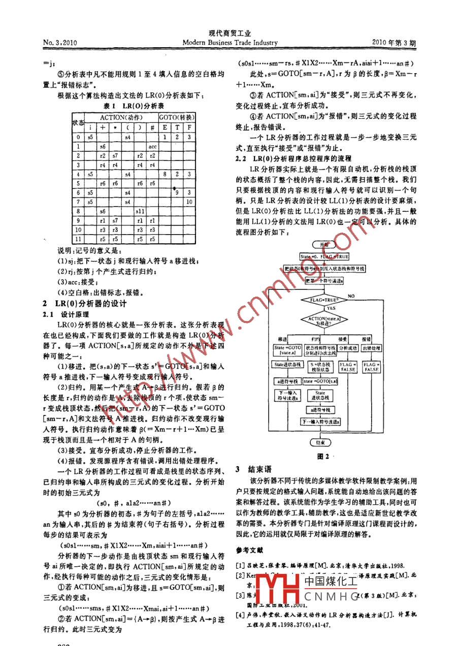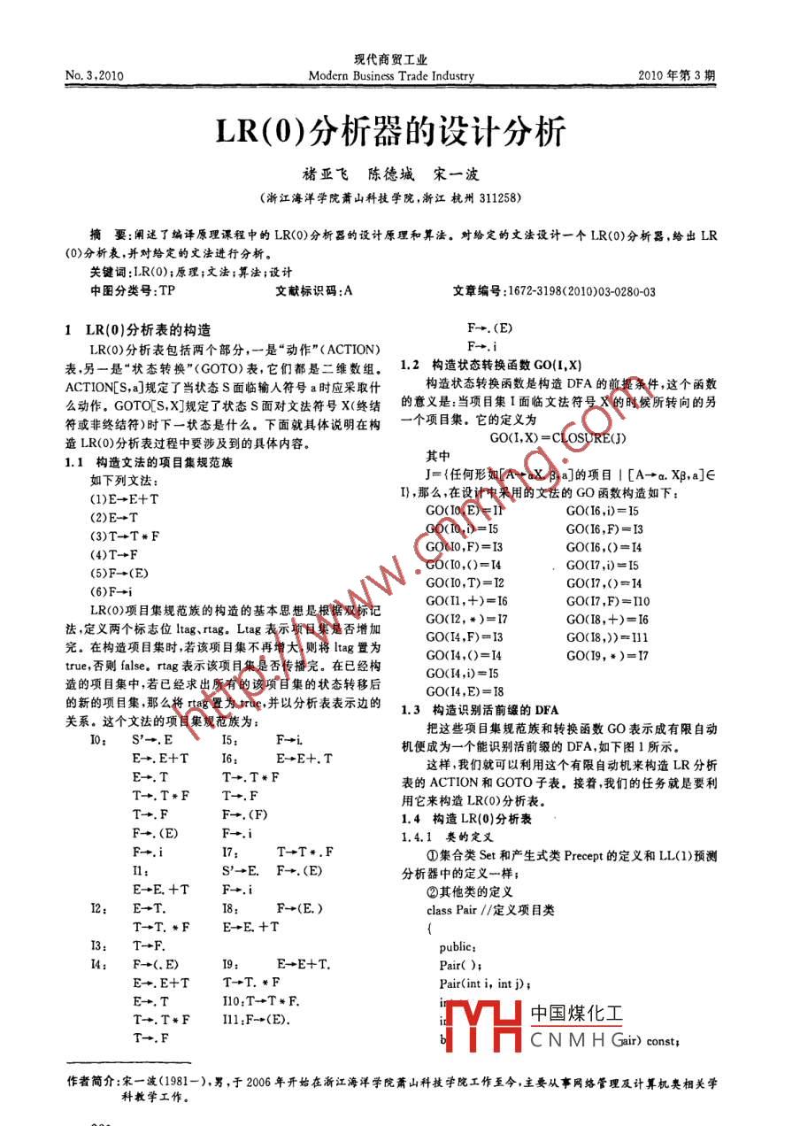 現(xiàn)代商貿(mào)工業(yè)No.3,2010Modern Business Trade Industry2010年第3期LR(0)分析器的設計分析褚亞飛陳德城宋一波(浙江海洋學院蕭山科技學院,浙江杭州311258)摘要:闡述了 編譯原理課程中的LR(0)分析器的設計原理和算法。對給定的文法設計一個LR(0)分析器,給出LR .(0)分析表,并對給定的文法進行分析。關鍵詞:LR(0);原理;文法;算法;設計中圖分類號:TP文獻標識碼:A文章編號:1672-3198(2010)03-0280-031 LR(0)分析表的構(gòu)造F→. (E)LR(0)分析表包括兩個部分,一是“動作" (ACTION)F→.i表,另一是“狀態(tài)轉(zhuǎn)換"(GOTO)表,它們都是二維數(shù)組。1.2 構(gòu)造狀態(tài)轉(zhuǎn)換函數(shù) GO(I,X)ACTION[S,a]規(guī)定了當狀態(tài)s面臨輸人符號a時應采取什構(gòu)造狀態(tài)轉(zhuǎn)換函數(shù)是構(gòu)造DFA的前提條件,這個函數(shù)么動作。GOTO[S,X]規(guī)定了狀態(tài)s面對文法符號X(終結(jié)的意義是:當項目集1面臨文法符號X的時候所轉(zhuǎn)向的另符或非終結(jié)符)時下-狀態(tài)是什么。下面就具體說明在構(gòu)一個項目集。 它的定義為造LR(0)分析表過程中要涉及到的具體內(nèi)容。GO(I,X) =CLOSURE()1.1構(gòu)造文 法的項目集規(guī)范族如下列文法:J= {任何形如[A→aX. p,a]的項目I [A→a Xp,a]∈(1)E-E+TI} ,那么,在設計中采用的文法的GO函數(shù)構(gòu)造如下:GO(I0,E)=l1G0(I6,i)=15(2)E-TG0(10,)=I5GO(I6,F)=I3(3)T→T#FGO(IO,F)=I3GO(I6,()=I4(4)T→FGO(I0,()=I4GO(17,i)=I5 .(5)F→+(E)GO(IO,T)=I2GO(17,()=14(6)F→i .G0(l1,+)=16GO(I7,F)=I10LR(0)項目集規(guī)范族的構(gòu)造的基本思想是根據(jù)雙標記GO(I2,*)=17G0(I8,+)=I6法,定義兩個標志位ltag.rtag. Ltag 表示項目集是否增加.GO(I4,F)=13GO(I8,))=111完。在構(gòu)造項目集時,若該項目集不再增大,則將ltag置為GO(I4,()=I4 .G0(I9,*)=17true,否則false. rtag 表示該項目集是否傳播完。在已經(jīng)構(gòu)GO(I4,i)=I5造的項目集中,若已經(jīng)求出所有的該項目集的狀態(tài)轉(zhuǎn)移后GO(I4,E)= I8的新的項目集,那么將rtag置為true,并 以分析表表示邊的.3 構(gòu)造識別活前緩的DFA關系。這個文法的項目集規(guī)范族為:把這些項目集規(guī)范族和轉(zhuǎn)換函數(shù)GO表示成有限自動S'+.E5;機便成為一個能識別活前綴的DFA,如下圖1所示。E→. E+T6:E→+E+.T這樣,我們就可以利用這個有限自動機來構(gòu)造LR分析E→.TT→.T*F表的ACTION和GOTO子表。接著,我們的任務就是要利T+.F用它來構(gòu)造LR(0)分析表。T→.FF→.(F)1.4構(gòu)造LR(0)分析表.4.1 類的定義.7:T→T#.F①集合類Set和產(chǎn)生式類Precept的定義和LL(1)預測1:S'→E. F→. (E)分析器中的定義一樣;E→E. +T②其他類的定義2:E- +T. .I8;F→(E.)class Pair //定義項目類T→T. *F3:T→F.public :I4;F→(. E)9:E→E+T.Pair( );E+. E+TT→T. *PPair(inti, int j);E+. TIl0:T→T*F.11:F-(E).中國煤化工T-.FYHCN M H Gair) const;作者簡介:宋一波(1981-)男,于2006 年開始在浙江海洋學院蕭山科技學院工作至今,主要從事網(wǎng)絡管理及計算機類相關學科教學工作。一咒數(shù)據(jù)現(xiàn)代商貿(mào)工業(yè)No. 3,2010Modern Business Trade Industry2010年第3期,Precept GetPrecept(int n);Grammar( void) ;~Grammar( void);Grammar(const Grammar & g);const Grammar operator = (const Grammar & g);'void SetVt(string vt);void SetVn(string vn) ;void SetStart(char start);void AddPrecept(string p) ;bool IsGrammarLegal( );bool IsInVn(char cChar);bool IsInVt(char cChar);char GetStart( );void GenerateLR0Table( ); .string OutputHTML( );void Output(char # pFilename);囝1識別活前緩的DFAbool IsLegalLROGrammar( );};private:class GoData //對項目進行傳播的類定義Set VtSet Vn;public:char cStart;GoData( );vector P;~GoData( );vector C;int iFrom;Pair * pTable;char eChar;vector GoSet;int iTo;int nVt;);int nVn; :class ProijectSet//定義項目集族類int nP; .{int nC;void EnlargeGrammar( );ProjetSet(void);void MakeProjects( );~ ProjectSet( void);void GenerateTable( ); .ProjectSet( const ProjectSet & set);Precept GetProject( const Pair & pair1);ProjectSet(Pair pair) ;ProjectSet GetClosure( const Pair & pair1);bool Insert(Pair insert);ProjectSet MakeGoSet(int iI, char cChar);bool Delete(Pair del);int GetGoSet(int il, char eChar) ;bool Find(const Pair & find) const;bool AddProject( const ProjectSet & ps);int FindPos(const Pair & find) const;bool FllTable(int nLine, char eChar, Pair p);int Add(const ProjectSet & set);int ilegal;int Sub( const ProjectSet & set);void CopyGrammar(const Granmar & g);int Size( ) const;protected;PrijetSet operator + (const ProjectSet & set);int GetProjectNum(const Pair & p);PrietSet operator - (const ProjectSet & set);const ProjectSet operator =(const ProjectSet & set);1.4.2構(gòu)造算法bool operator = = (const ProjectSet & set);構(gòu)造LR(0)分析表的關鍵就是要它的ACTION和GO-Pair GetAt(int iPos);TO子表,上面已經(jīng)構(gòu)造好了這個文法的GO函數(shù),我們將bool IsEmpty( );利用這個GO函數(shù)來構(gòu)造出這兩個子表。算法如下:①若項目A→a.a屬于Ik且GO(Ik,a)=lj,a為終結(jié)vector SetContent;符,則置ACTION[k,a]為“把(j,a)移進?!?簡記為“s”;中國煤化工何終結(jié)符a(或終結(jié).class Grammar //定義LR(0)文法類符#),MHCNMHG→a進行歸約”,簡.記為“;個產(chǎn)生式):③若項目S'→S.屬于k,則置ACTION[k, #]為“接.int GetGoTo(int iStatus, char eChar);受”,簡記為“ace" ;Pair GetAction(int iStatus, char cNext);④若GO(Ilk,A) =Ij,A為非終結(jié)符,則置GOTO[k,A]一281一現(xiàn)代商貿(mào)工業(yè)No.3,2010Modern Business Trade Industry2010年第3期=j;.0..... sm - rs, # x2.....m- rA,aiai+ ....n#).⑤分析表中凡不能用規(guī)則1至4填入信息的空白