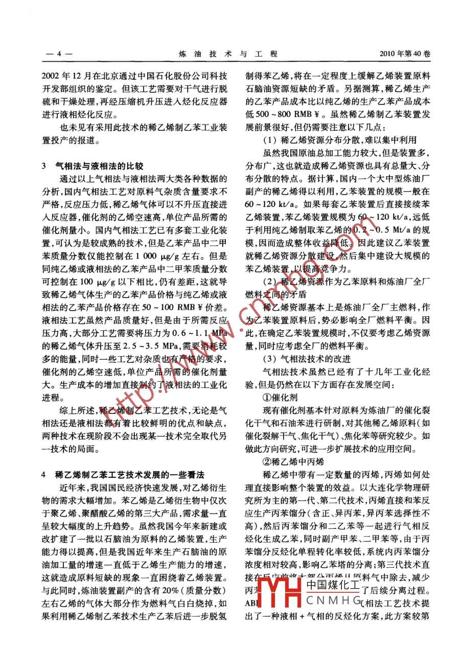 煉油技術(shù)與工程2010年5月PETROLEUM REFINERY ENGINEERING第40卷第5期綜述稀乙烯制乙苯工藝技術(shù)綜述李淑紅中國石化集團(tuán)洛陽石油化工工程公司(河南省洛陽市471003)摘要:介紹了國內(nèi)外氣相法和液相法稀乙烯制乙苯工藝技術(shù),如Mobil/Badger公司的氣相法的成套工藝技術(shù);中國科學(xué)院大連化學(xué)物理研究所為主開發(fā)的氣相法成套工藝技術(shù);中國石化上海石油化工研究院為主開發(fā)的氣相法催化劑;ABB拉默斯環(huán)球有限公司的氣相法工藝技術(shù);UOP公司的Alkar 工藝;CDTech公司的催化精餾工藝;Monsanto/Lummus公司改良的AICl,法;大連化學(xué)物理研究所為主開發(fā)的液相法技術(shù);北京服裝學(xué)院為主開發(fā)的液相法技術(shù)等。對氣相法與液相法工藝進(jìn)行了比較,展望了稀乙烯制乙苯工藝技術(shù)的發(fā)展?fàn)顩r。關(guān)鍵詞:稀乙烯乙苯氣相法液相法綜述乙苯主要用于生產(chǎn)苯乙烯,目前工業(yè)上用的相反應(yīng)類型,這一-點(diǎn)是稀乙烯工藝和純乙烯工藝乙苯,90%以上是用乙烯和苯烷基化制得,少量由最主要的差別)。由于催化反應(yīng)機(jī)理的不同,這石油煉制過程中Cg芳烴分離所得。乙烯和苯烷兩大類技術(shù)在烴化反應(yīng)部分是相對獨(dú)立存在的,基化制取乙苯的技術(shù)分為兩大類,一類以聚合級沒有傳承關(guān)系。一個(gè)專利商可能同時(shí)擁有這兩大乙烯為原料,另一類以稀乙烯為原料。 以聚合級.類技術(shù),但它的這兩大類技術(shù)也是獨(dú)立存在,沒有乙烯為原料的技術(shù)種類繁多,主要有:催化蒸餾傳承關(guān)系,也沒有替代關(guān)系。法、氣相分子篩法、液相分子篩法、均相液相法和傳統(tǒng)液相法,這些技術(shù)在世界范圍內(nèi)均廣泛應(yīng)用。1國內(nèi)外氣相法稀乙烯制乙苯工藝技術(shù)而以稀乙烯為原料的技術(shù)則比較少,實(shí)現(xiàn)工業(yè)化1.1 Mobil Badger氣相法成套工藝技術(shù)的很少。有些聚合級乙烯制乙苯專利擁有者聲稱Mobil/Badger氣相法稀乙烯制乙苯工藝以其專利同樣適用于稀乙烯原料,但沒有見到工業(yè)ZSM-5高硅沸石為催化劑,1977年建成16 kVa化報(bào)道。由于國內(nèi)乙烯資源匱乏,很多科研單位乙苯工業(yè)化試驗(yàn)裝置,并于1992年在英國Stan-一直在進(jìn)行稀乙烯制乙苯技術(shù)的攻關(guān)工作,但多l(xiāng)ow建成投產(chǎn)了160 kV/a的第-套大型工業(yè)化裝數(shù)以催化劑研制、實(shí)驗(yàn)室小試和中試為主,真正進(jìn)置。該工藝適用于乙烯質(zhì)量分?jǐn)?shù)為10% ~ 100%人工業(yè)化試驗(yàn)和已經(jīng)工業(yè)化的技術(shù)則很少。純乙的原料氣, 烴化反應(yīng)壓力約2. 2 MPa,反應(yīng)溫度為烯制乙苯技術(shù)發(fā)展歷史較長,國內(nèi)外已有比較成390 ~428 C,乙烯空速為0.5 h-' ,原料單耗相對熟的技術(shù)。本文重點(diǎn)探討稀乙烯制乙苯工藝較低,苯單耗0.749 Vt,乙烯單耗為0.268 Vt。.技術(shù)。但該工藝對原料氣中其它雜質(zhì)如:丙烯、硫、水、氧稀乙烯制乙苯工藝技術(shù)按照反應(yīng)原料苯在烴等含量要求極其嚴(yán)格,均為百萬分之幾級,需對原化反應(yīng)器中存在的相態(tài)劃分為氣相法和液相法兩料氣進(jìn)行嚴(yán)格精制,稀乙烯氣體升壓至2.9 MPa大類。氣相法是較早開發(fā)成功和工業(yè)應(yīng)用的- -種后脫硫、脫水、脫氧和深冷分離脫除丙烯,其結(jié)果技術(shù),使用固體催化劑,反應(yīng)原料以氣態(tài)形式在催雖然催化劑單程壽命延長,但裝置投資和能耗相化劑.上接觸反應(yīng),屬于氣固兩相反應(yīng)類型。液相對較高。法是在一-種固體催化劑存在下,借助較高壓力使收稿日期:2010 -02 -08。反應(yīng)原料苯處于液態(tài),稀乙烯原料仍以氣體形式中國煤化工年畢業(yè)于天津大學(xué)化學(xué)存在,氣態(tài)烯烴和液態(tài)苯在催化劑上接觸反應(yīng),屬工作?,F(xiàn)任該公司技術(shù)于氣-液-固三相反應(yīng)類型(純乙烯液相法工藝中,YHC N M H G79- 6887,T1純乙烯以液相形態(tài)存在于反應(yīng)器中,屬于液-固兩lishh@ lpe. com. cn煉油技術(shù)與工程2010年第40卷.2 中國科學(xué)院大連化學(xué)物理研究所為主開發(fā)于丙苯餾分不能進(jìn)行液相反烴化,因此該部分改的氣相法成套工藝技術(shù)造也包括了增設(shè)丙苯塔,以保證改造效果。開車該技術(shù)的研究開發(fā)工作始于1985年末,經(jīng)過一次成功 ,效果良好,乙苯產(chǎn)品中二甲苯的質(zhì)量分催化劑研制和小試、中試工藝研究,取得了比較明數(shù)降到1 000 μg/g以下。由于2001年改造的目顯的效果。在上述研究的基礎(chǔ)上,1990年在當(dāng)時(shí)的僅是就液相反烴化反應(yīng)器進(jìn)行工業(yè)試驗(yàn),取得中國石化總公司發(fā)展部的組織下,成立了由撫順工業(yè)試驗(yàn)數(shù)據(jù),并不需要整個(gè)裝置長期在改造后石油二廠、中國科學(xué)院大連化學(xué)物理研究所和洛的狀態(tài)下操作,非試驗(yàn)階段仍按改造前流程操作,陽石油化工工程公司組成的催化裂化干氣與苯烴因此并未就全流程進(jìn)行優(yōu)化,整個(gè)流程不能稱之化制取乙苯工藝技術(shù)聯(lián)合開發(fā)體,對該項(xiàng)工藝技.為第三代技術(shù)。2003年在此裝置基礎(chǔ)上進(jìn)行了術(shù)進(jìn)行工程開發(fā),并于1992年7月由洛陽石油化30kV/