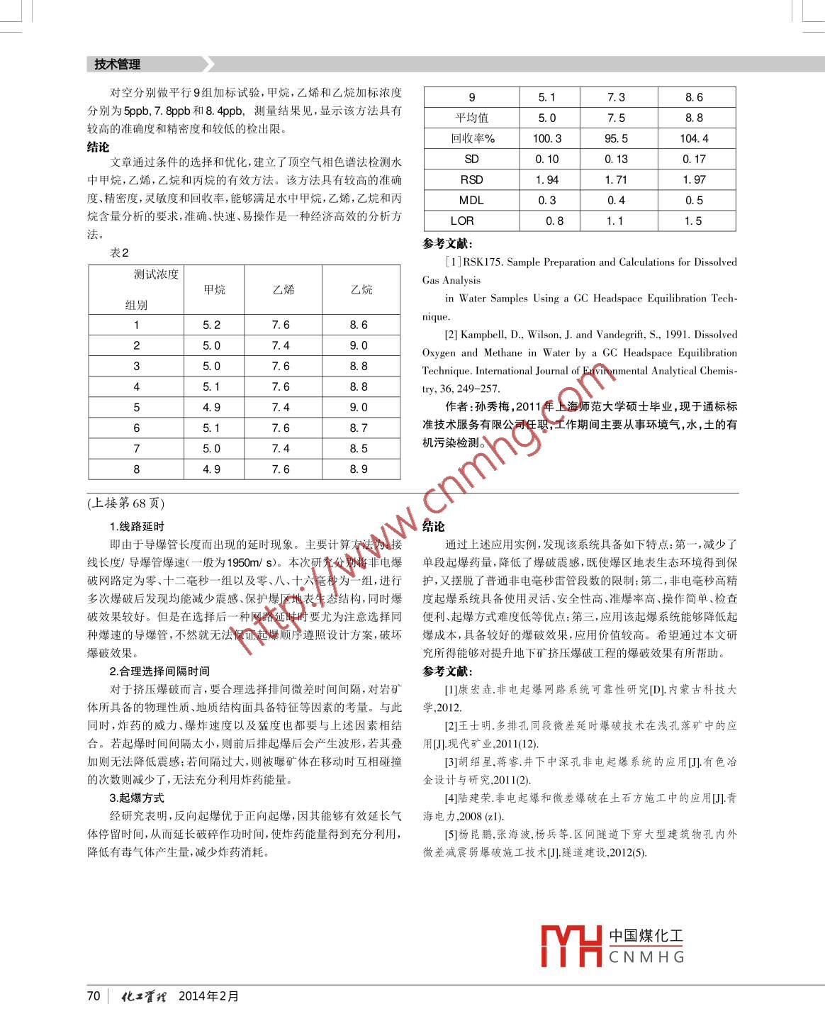 技術(shù)管理頂空法檢測(cè)水中甲烷,乙烷,乙烯孫秀梅(通標(biāo)標(biāo)準(zhǔn)技術(shù)服務(wù)有限公司)摘要:水污染的治理中分析 監(jiān)測(cè)占有很重要的作用,特別32uL110203有機(jī)物的分析檢測(cè)。本文通過溫度、平衡時(shí)間的優(yōu)化選擇,建立mL了適用于地下水中甲烷,乙烯,乙烷和丙烷檢測(cè)的經(jīng)濟(jì)高效的頂154 uL508478空-氣相色譜法分析方法。該分析方法檢出限為5μg/L,準(zhǔn)確度10 mL95.5% ~ 104.4% ,精密度1.71%~1.91% ,標(biāo)準(zhǔn)曲線的相關(guān)系數(shù)大309 uL /0016715于.99,相對(duì)標(biāo)準(zhǔn)偏差為3.1% ~ 7.6%。10 ml關(guān)鍵詞:頂空;氣相色譜法;甲烷323618 uL靜態(tài)頂空方法是將一盛有一 定 體積的待測(cè)水樣,頂部留有一定氣體空間的密封容器,在恒溫下放置一定時(shí)間,讓液相中的溶4.測(cè)定.解氣體進(jìn)入氣相,直到氣體在兩相中的分壓相等,然后取一-定體地下水樣品采樣時(shí)應(yīng)緩慢地將樣品導(dǎo)入預(yù)先加有2滴1:1積的頂空氣進(jìn)行測(cè)定,以得到和液相達(dá)平衡的頂空氣中待測(cè)氣體HCI 的40 mL棕色樣品瓶中,保證樣品pH<2。樣品瓶裝滿形成的濃度,并依據(jù)氣體在海水中的溶解度和平衡時(shí)的物理?xiàng)l件計(jì)算凸液面后迅速 蓋緊瓶蓋,瓶?jī)?nèi)不應(yīng)空余空間或氣泡,每個(gè)樣品至得到平衡前水樣中待測(cè)氣體濃度。少采集兩瓶。每批樣品須有現(xiàn)場(chǎng)空白樣一一個(gè), 所有空白均為不含此方法還可以測(cè)試丙烷,丙烯,正丁烷,異丁烷,質(zhì)控達(dá)標(biāo)的有 待測(cè)物質(zhì)的試劑空白水。樣品存放至4° C(土 2° C)冷藏設(shè)備情況下,當(dāng)測(cè)試二二氧化碳是必須另采- - 瓶。中14天內(nèi)分析[2]。一、實(shí)驗(yàn)部分取10mL水樣加入20mL頂空瓶中,迅速壓緊瓶蓋,以備上1.儀器和試劑機(jī)。樣品的制備與標(biāo)準(zhǔn)溶液的配置應(yīng)同時(shí)在同--環(huán)境下進(jìn)行。(1)儀器二結(jié)果與討論安捷倫7890A氣相色譜儀和7697頂空自動(dòng)進(jìn)樣儀;色譜柱1.平衡時(shí)間和溫度的選擇PLOT-Q:30m x 0.53 mm x 40 μ m; 20mL頂空鉗口玻璃經(jīng)不同平衡時(shí)間發(fā)現(xiàn)平衡30min響應(yīng)明顯比10min和樣品瓶,氣密性注射器25μL到1000uL。20min大,而平衡40min和60min響應(yīng)增加不明顯,從而選擇平(2)試劑衡時(shí)間為30min。平衡溫度選擇在30- 100之間,目標(biāo)化合物都標(biāo)準(zhǔn)品偉創(chuàng)標(biāo)準(zhǔn)混合氣(摩爾%N2):甲烷4.95x 10 0%乙烷低沸 點(diǎn)的,所以溫度對(duì)響應(yīng)結(jié)果影響不大,最終選擇50]平衡溫4.97x103%,乙烯4.96x103%;超純?nèi)ルx子水電阻率≥18度25MQ. cm @250.2.色譜條件的選擇2.色譜操作條件該鍵合聚苯乙烯-二乙烯基苯的色譜柱,比常規(guī)填充柱相比升溫程序:初溫60°C保持2min,以20°C/min升至200°比較適合分離甲烷,乙烯,乙烷,可分析C1- C3異構(gòu)體、烷烴到C;檢測(cè)器250° C,進(jìn)樣口70° C。頂空50° c下震蕩平衡 C12等化合物,經(jīng)驗(yàn)證該色譜條件下無甲醇,苯系物干擾,且所分30min進(jìn)樣體積為1mL。析目標(biāo)化合物分離度較高。3.標(biāo)準(zhǔn)樣品的配置3.標(biāo)準(zhǔn)曲線的繪制每次配標(biāo)時(shí)應(yīng)記錄環(huán)境溫度和壓力并代入計(jì)算,從而將摩爾按表1配置標(biāo)準(zhǔn)曲線樣品。以濃度為橫坐標(biāo)以響應(yīng)為縱坐濃度換算為以u(píng)g/ L為單位。用微量進(jìn)樣針向裝有10mL超純水標(biāo)繪 制如下標(biāo)準(zhǔn)曲線圖(圖1)。甲烷線性關(guān)系y = 2.0324x +的頂空瓶底部慢速加入標(biāo)氣,迅速壓上頂空蓋。25.0° C時(shí)標(biāo)準(zhǔn)13. 045,相關(guān)系數(shù)R2 = 0.9997:乙烯線性關(guān)系y = 2. 3613x品濃度(μ g/ L)及配置記錄見表1.+ 0.5076, 相關(guān)系數(shù)R2 = 0.9995; 乙烷線性關(guān)系y =表12. 4313x - 3. 4219,相關(guān)系數(shù)R2 = 0. 9997.ev|甲烷濃度|乙烷濃度乙烯濃度el|15uL1108.47.8廣-0.99”?!薄?1uL11001716m中國(guó)煤化工4.方法的準(zhǔn)確度與YHCNMH G2014年2月化工管理| 6技術(shù)管理對(duì)空分別做平行9組加標(biāo)試驗(yàn),甲烷,乙烯和乙烷加標(biāo)濃度7.38.6分別為5ppb, 7.8ppb和8.4ppb,測(cè)量結(jié)果見,顯示該方法具有平均值5.08.8較高的準(zhǔn)確度和精密度和較低的檢出限?;厥章?100. 395.5104.4結(jié)論文章通過條件的選擇和優(yōu)化,建立了頂空氣相色譜法檢測(cè)水0.130. 17中甲烷,乙烯,乙烷和丙烷的有效方法。該方法具有較高的準(zhǔn)確RSD1.711. 97度、精密度,靈敏度和回收率,能夠滿足水中甲烷,乙烯,乙烷和丙MDL0.30.0.5烷含量分析的要求,準(zhǔn)確、快速、易操作是--種經(jīng)濟(jì)高效的分析方LOR0.81.1.5法參考文獻(xiàn):表2[1]RSK175. Sample Preparation and Calculations for Dissolved測(cè)試濃度Gas Analysis甲烷乙烯乙烷組別in Water Samples Using a GC Headspace Equilibration Tech-nique.15.27.6[2] Kampbell, D., Wilson, J. and Vandegrift, s., 1991. Dissolved27.49.0Oxygen and Methane in Water by a GC Headspace Equilbration3.0Technique. International Journal of Environmental Analytical Chemis-45.1try, 36, 249-257.54.9作者:孫秀梅,2011年上海師范大學(xué)碩士畢業(yè),現(xiàn)于通標(biāo)標(biāo)68.7準(zhǔn)技術(shù)服務(wù)有限公司任職,工作期間主要從事環(huán)境氣,水,土的有機(jī)污染檢測(cè)。78.588.9(上接第68頁)1.線路延時(shí)即由于導(dǎo)爆管長(zhǎng)度而出現(xiàn)