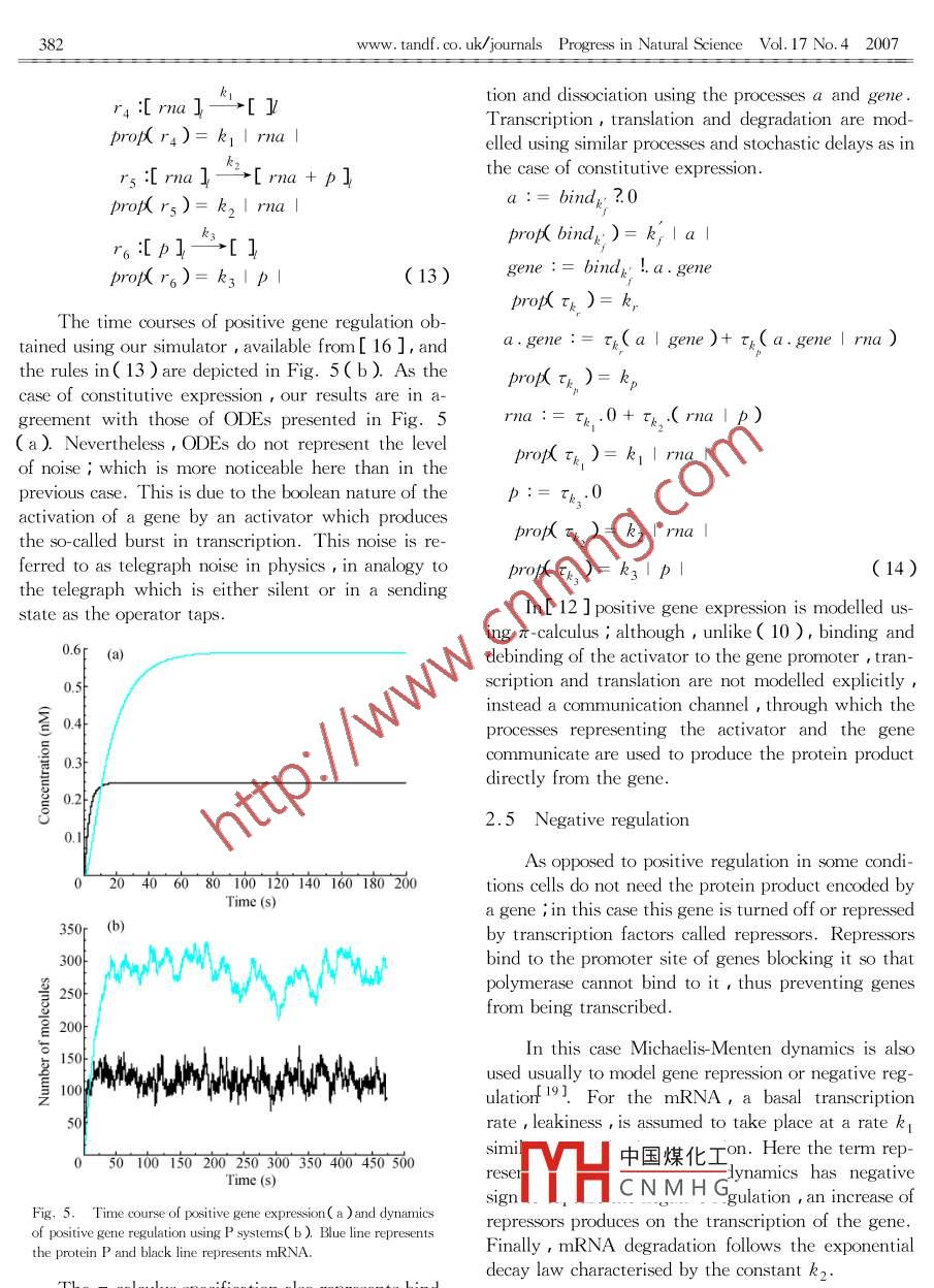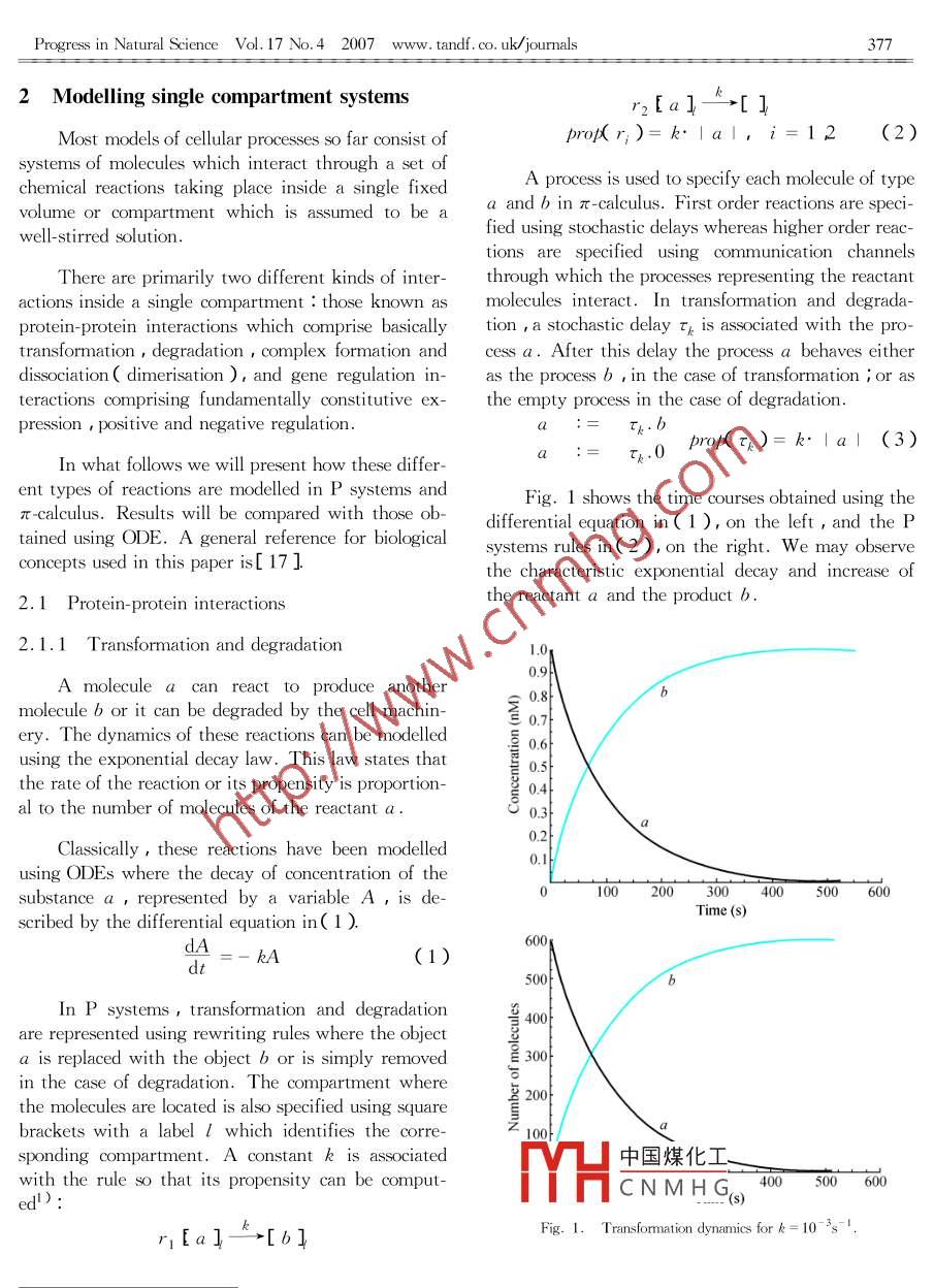 PROGRESS IN NATURAL SCIENCEVol. 17 ,No. 4 ,April 2007INVITED LECTURESCellular modelling using P systems and process algebraFrancisco J. Romero-C amperol* , Marian Gheorghe- , Gabriel Ciobanu'John M. Auld- and Mario J. Perez-Jimenex'( 1. Research Group on Natural Computing , Department of Computer Science and Artificial Itelligence ,University of Seville,Avda.Reina Mercedes , 41012 Sevila , Spain ; 2. Department of Computer Science, The University of Sheffield Regent Court , PortobelloStreet , Sheffield S1 4DP , UK ;3. Romanian Academy , Institute of Computer Science , Blvd. Carol I nr. 11 , 700505 , Iasi,Romania )In this paper various molecular chemical interactions are modelled under different computational paradigms. P systemsand π-calculus are used to describe intra- cllular reactions like protein-protein interactions and gene regulation control.Keywords : cellular modelling , P systems , process algebra.1 Introductionwhich molecular systems play a key role.' There areprimarily three uses of models in science : understand-The more we learn about cell systems , the less ,ing , integration of partial knowledge and discovery ofparadoxically,we seem to understand. Most systemsnew features ; prediction , capability to estimate thin the living cell involve the interaction of multipledynamics of a system ; and control , to constrain orcomponents and subsystems. This complexity makesmanipulate a system to produce a desirable output orit increasingly difficult to visualize any system as abehaviour. These objectives can be more easily obwhole and requires models that can be used as tools totained if there is a close structural connection betweendisentangle these apparent messy interactions.biological data and the model itself. By structural wemean that the model itself reflects the structure of theModels , abstractions of the reality onto a mathe-system being studied 1].matical/ computational formalism , should not be seenor presented as representations of the truth , but in-The classical approach to modelling is based onstead as a statement of our current knowledge of thethe mathematical theory of differential equations.phenomenon under research. A model is often moreDifferential equations have been used successfully touseful when proved to be wrong , since it shows thatmodel kinetics of conventional macroscopic chemicalour current understanding of the phenomenon studiedreactions. Nevertheless there is an implicit assump-does not match the reality. Thus ,it helps experimen-tion of continuously varying chemical concentrationtalists as a way to decide which experiments are nec-and deterministic dynamics. Two critical characteris-essary to advance understandingf 11.tics of this approach are that the number of moleculesA good model should at least have four proper-of each type in the reaction mix is large and that foreach type of reaction in the system , the number of re-ties : relevance , computability , understandability andactions is large within each observation interval,thatextensibility. A model must be relevant capturingis reactions are fast.the essential properties of the phenomenon investigat-ed ; and computable so it can allow the simulation ofWhen the number of particles of the reactingits dynamic behaviour , and the qualitative and quanti-spec中國煤化工re slow , which is fre-tative reasoning about its properties. An understand-quenMHssion control in bacteriaable model will correspond well to the informal con-andCN M. H Gus presumptions are in-cepts and ideas of molecular biology. Finally ,a goodvalid and the deterministic continuous approach tomodel should be extensible to higher levels of organi-chemical kinetics is questionable. Instead one has tosations, like tissues ,organs ,organisms ,etc. inrecognize that the individual chemical reaction steps:dence should be addressed. E -mail : fran@ us. eswww. tandf. co. uk/ journals Progress in Natural Science Vol. 17 No.42007occur discretely and are separated by time intervals ofcepted model for interacting systems with dynamicallyrandom length.evolving communication topology. The π -calculus al-lows channels to be passed as data along other chan-Previous attempts to model cellular systems fromnels , and this fact provides a channel mobility. Thisa computational point of view include Petri nets , a-mobility is an important feature and increases the ex-gent-based approach ,L-systems,state charts ,pro-pressive power. The π-calculus has a simple seman-cess algebra ,etc. While each of these approaches cap-tics and a tractable algebraic theory. Starting withtures some of the information regarding pathways andatomic actions and simpler processes ,complex pro-their molecular components ,none fully integratescesses can be constructed in many ways. The processquantitative dynamics,interactions among molecularexpressions are defined by guarded processes , parallelentities and structural organisation of cells.composition P| Q , nondeterministic choice P+ QMembrane computing is an emergent branch ofreplication ! P , and a restriction operator ( ux )Pnatural computing introduced by Gh. Paurt31. Thiscreating a local fresh channel x for a process P. Anew model of computation starts from the assumptionstructural congruence relation providing a static sethat the processes taking place in the compartmentalmantics is defined over the set of processes. I he evo-structure of a living cell can be interpreted as compu-lution of a process is described in π-calculus by a re-tations. The devices of this model are called P sys-duction relation over processes. This relation containstems. Roughly speaking , a P system consists of athose transitions which can be inferred from a set ofcell-like membrane structure , in the compartments ofrules. Different variants have been used to modelwhich one places multisets of objects which evolve ac-molecular interactions 1 , gene networks , and to in-tegrate molecular and gene networkscording to given rules.In the last year