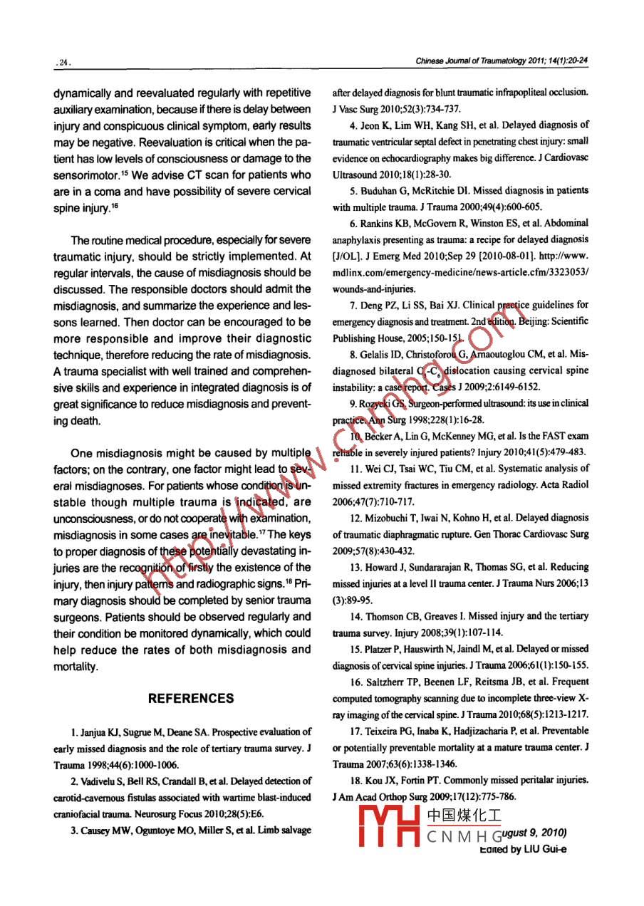 .20.Chinese Joumal of Traumatology 2011; 14():20-24Analysis of misdiagnosis in patients with multiple traumaYANG Fan, BAI Xiang-jun* and LI Zhan-fei[Abstract] Objective: To explore the features, treat-of consciousness, critical cases and shock cases werement outcomes and reasons for misdiagnosis in patients33.78+19.64,(23.59+7.26)days,49.22%,33.01% and 47.46%,with multiple trauma, so as to decrease the incidence ofrespectively, which were significantly higher than those ofmisdiagnosis.the correct diagnosis group (P<0.01). And the data showedMethods: A total of3 163 patients with multiple traumathat the more serious the injury was, the higher the rate ofwho were admitted in our department from August 1997 tomisdiagnosis would be. The rate of primary diagnosis byAugust 2008, were retrospectively studied to compare thetrauma surgeons in correct diagmosis group was 75.78%,sig-features of diagnosis and treatment. There were 2117 malesnificantly higher than that of the misdiagnosis group( x2=382.01,(66.93%) and 1 046 females (33.07%) with the mean age ofP<0.01). The mortality rate of the misdiagnosis group was36.46 years (range, 14 80 years). Parameters such as general2.93%, which was significantly higher than that for all pa-status, traumatic condition, diagnosis and treatmenttients ( x5.22, P<0.05).situation, prognosis and mortality were analyzed. The dif-Conclusions: The resuts indicated that patients withferences between misdiagnosis group and correct diagno-severe multiple trauma are at high risk of misdiagnosis insis group were compared in terms of severity of injury, com-early treatment. The mortality rate of misdiagnosed patientsplications and treatment outcomes to elucidate the causeis higher than the correctly-diagnosed patients. To preventand prevention of misdiagnosis.misdiagnosis, physicians need to take great care to con-Results: The misdiagnosis rate of multiple trauma induct thorough clinical examinations and repeated evaluation.this study was 16.19%. The major anatomic sites misdiag-Key words: Delayed diagnosis; Diagnostic errors;nosed were limbs and pelvis (299 positions, 39.50%), ab-Muliple trauma; Prevention and control; Treatment out-dominal region and pelvic organ (148 positions, 19.55%),comeand thoracic region (109 positions, 14.40%). In misdiagno-Chin J TraumatoV 2011; 14/):2024sis group, ISS, length of hospital stay, rates of disturbanceecause of the nature of severe multiple traumaMETHODSand complex complications, misdiagnosis ofmultiple trauma often happens at the firstStandard for case selectionassessments. This may worsen the patient's conditionWe collected the data of patients treated in Trau-and even lead to death. Reducing the rate of misdiag-matic Surgery of Tongji Hospital in Wuhan, China, suchnosis is therefore an important clinical issue.as general status, traumatic condition, diagnosis andtreatment situation, prognosis and mortality. PatientsIn this study, we retrospectively analyzed the con-were selected into this study based on the followingdition of misdiagnosis in 3 163 multiple trauma patientscriteria: (1) they experienced mutiple trauma; (2) theytreated in our department from August 1997 to Augustwere hospitalized to receive treatment 24 hours after2008. The patients' data related to misdiagnosis wereinjury; and (3) recorded rescue and resuscitation infor-analyzed and discussed.mation was complete.General conditionDO: 10.3760/cma.jissn. 1008-1275 2011.01.004Department of Traumatic Surgery, Tongji Hospital,Theliaible natients amountedto3 163 cases,2 117Tongji Medical College, Huazhong University of Sciencemale中國煤化工[33.07%). Their ageand Technology, Wuhan 430030, China (Yang F, Bai XJrang|YHCNMHGft13.12)yearsonand LiZF)average. The injury types included road trfc injury in*Corresponding author: Tel: 86-27 83663669, E-mail:1 727 cases (54.60%), violence injury in 467 casesBaixiangjun@hotmail.comChinese Joumal of Traumatoloy 2011; 14/1):20-24.21.(14.76%), flling injury in 393 cases (12. 42%), self-ac~Definition of misdiagnosiscident injury in 365 cases (11.54%), gunshot injury inMisdiagnosis was defined when: (1) new injury was26 cases (0.82%) explosion injury in 14 cases (0.44%)found during TICU after initial treatment; (2) there wasand others in 171 cases (5.41%). All the injuries wereunrecorded injury in the early case report; and (3) in-allocated to more than two anatomic regions accordingjury was found after numerous examination andto the six regions theory of injury severity score (ISS).evaluation. Misdiagnosis was not defined when: (1)The average number of regions involved was 2.55+ 1.24,patients left hospital within 24 hours; or (2) injury wasincluding double regions in 1 366 cases, triple regions inconfirmed by explorative operation.634 cases, quadruplex regions in 295 cases, and overfive regions in 82 cases, 6 241 regions in total. In detail',Statistical analysisthe regions were respectively extremity and pelvis (1 499We used士s to represent the measurement data.cases, 24.02%), head and neck (1 249 cases, 20.01%),The Student's t test and x 2test were used to analyzeabdominal region and pelvic organ (967 cases, 15.49%),the dfference between groups. SPSS Nersion 13.0)werechest (913 cases, 14.63%), body surface (872 cases,used for statistical analysis. P<0.05 was considered to13.97%) and face (741 cases, 11.87%). TheAlS 90-ISSbe statistically significant.values was between 5 and 75, 27.33+ 15.07 on average.RESULTSPatient evaluationEvaluation of patients was made according to theMisdiagnosis featuresfollowing 4 indexes: (1) number of injured areas basedTotall, 512 patients (16.19%) were misdiagnosedon the six regions divided by ISS criteria, including head(Table 1). The delayed time caused by diagnosis wasand neck, face, chest, abdomen, extremity and pelvis,(6.23+4.79)days. The rate of primary diagnosis bytraumaand body surface; (2)trauma severity, which was scoredsurgeons inmisdiagnosis groupwas 32.03%, significantybyAIS and IsS; (3) del