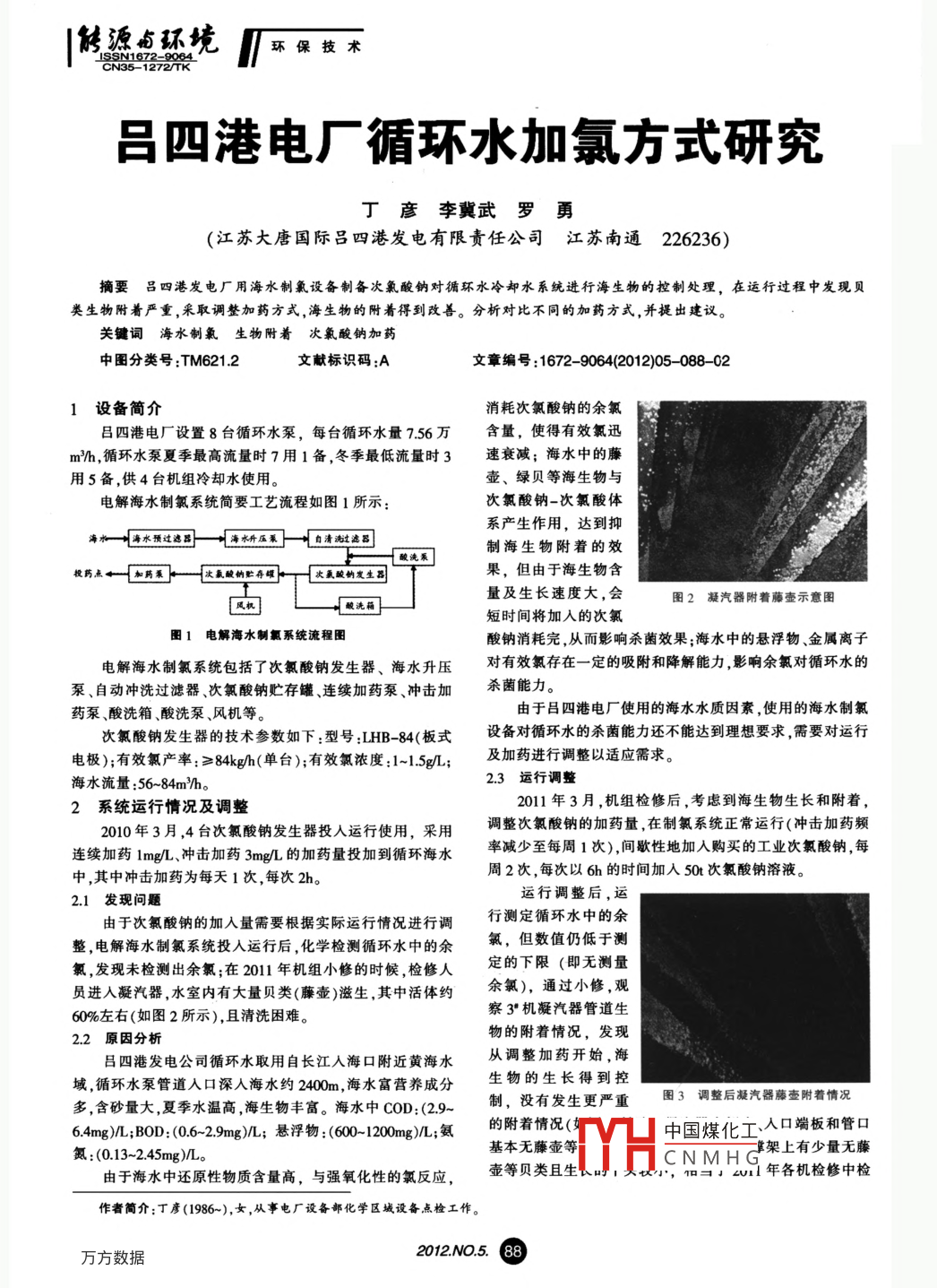 候透點(diǎn)環(huán)統(tǒng)團(tuán)故不呂四港電廠循環(huán)水加氯方式研究丁彥李冀武羅勇(江蘇大唐國(guó)際呂四港發(fā)電有限責(zé)任公司江蘇南通226236摘要呂四港發(fā)電廠用海水制氯設(shè)備制備次氯酸鈉對(duì)循環(huán)水冷卻水系統(tǒng)進(jìn)行海生物的控制處理,在運(yùn)行過(guò)程中發(fā)現(xiàn)貝類(lèi)生物附著嚴(yán)重,采取調(diào)整加藥方式,海生物的附著得到改善。分析對(duì)比不同的加藥方式,并提出建議。關(guān)鍵詞海水制氯生物附著次氟酸鈉加藥中圖分類(lèi)號(hào):TM6212文獻(xiàn)標(biāo)識(shí)碼:A文章編號(hào):1672-9064(2012)05-088021設(shè)備簡(jiǎn)介消耗次氯酸鈉的余氯呂四港電廠設(shè)置8臺(tái)循環(huán)水泵,每臺(tái)循環(huán)水量756萬(wàn)含量,使得有效氯迅h,循環(huán)水泵夏季最高流量時(shí)7用1備,冬季最低流量時(shí)3速衰減;海水中的藤用5備,供4臺(tái)機(jī)組冷卻水使用。壺、綠貝等海生物與電解海水制氯系統(tǒng)簡(jiǎn)要工藝流程如圖1所示次氯酸鈉一次氯酸體系產(chǎn)生作用,達(dá)到抑枷水預(yù)過(guò)選圖海水壓果}清減濾圖制海生物附著的效藥表[加果}[酸悄貯存唱[太氯酸物發(fā)生果,但由于海生物含量及生長(zhǎng)速度大,會(huì)酸洗圖2凝汽器附著藤壺示意圖短時(shí)間將加入的次氯圖1電解海水制氯系統(tǒng)流程圖酸鈉消耗完,從而影響殺菌效果;海水中的懸浮物、金屬離子電解海水制氯系統(tǒng)包括了次氯酸鈉發(fā)生器、海水升壓對(duì)有效氯存在一定的吸附和降解能力,影響余氯對(duì)循環(huán)水的泵、自動(dòng)沖洗過(guò)濾器、次氯酸鈉貯存罐、連續(xù)加藥泵、沖擊加殺菌能力。藥泵、酸洗箱、酸洗泵、風(fēng)機(jī)等。由于呂四港電廠使用的海水水質(zhì)因素,使用的海水制氯次氯酸鈉發(fā)生器的技術(shù)參數(shù)如下:型號(hào):LHB-84(板式設(shè)備對(duì)循環(huán)水的殺菌能力還不能達(dá)到理想要求,需要對(duì)運(yùn)行電極);有效氯產(chǎn)率:≥84kgh(單臺(tái));有效氯濃度:1-15gL;及加藥進(jìn)行調(diào)整以適應(yīng)需求海水流量:56-84mh。23運(yùn)行調(diào)整2系統(tǒng)運(yùn)行情況及調(diào)整2011年3月,機(jī)組檢修后,考慮到海生物生長(zhǎng)和附著,2010年3月4臺(tái)次氯酸鈉發(fā)生器投入運(yùn)行使用,采用調(diào)整次氯酸鈉的加藥量在制氯系統(tǒng)正常運(yùn)行(沖擊加藥頻連續(xù)加藥1mgL、沖擊加藥3mg的加藥量投加到循環(huán)海水率減少至每周1次),間歇性地加入購(gòu)買(mǎi)的工業(yè)次氯酸鈉每中,其中沖擊加藥為每天1次,每次2h周2次,每次以6h的時(shí)間加入50t次氯酸鈉溶液2.1發(fā)現(xiàn)問(wèn)題運(yùn)行調(diào)整后,運(yùn)由于次氯酸鈉的加入量需要根據(jù)實(shí)際運(yùn)行情況進(jìn)行調(diào)行測(cè)定循環(huán)水中的余整,電解海水制氯系統(tǒng)投入運(yùn)行后,化學(xué)檢測(cè)循環(huán)水中的余氯,但數(shù)值仍低于測(cè)氯發(fā)現(xiàn)未檢測(cè)出余氯;在2011年機(jī)組小修的時(shí)候,檢修人定的下限(即無(wú)測(cè)量員進(jìn)入凝汽器,水室內(nèi)有大量貝類(lèi)(藤壺)滋生,其中活體約余氯),通過(guò)小修觀60%左右(如圖2所示),且清洗困難。察3·機(jī)凝汽器管道生2.2原因分析物的附著情況,發(fā)現(xiàn)呂四港發(fā)電公司循環(huán)水取用自長(zhǎng)江入??诟浇S海水從調(diào)整加藥開(kāi)始,海域,循環(huán)水泵管道入口深入海水約240m,海水富營(yíng)養(yǎng)成分生物的生長(zhǎng)得到控多含砂量大,夏季水溫高,海生物豐富。海水中COD:(29制,沒(méi)有發(fā)生更嚴(yán)重圖3調(diào)整后凝汽器藤壺附著情況64mg/L;BOD:(06-29mg)/L;懸浮物:(600-1200mg)/L;氨的附著情況(中國(guó)煤化工人口端板和管口氮:(0.13~2.45mgL?;緹o(wú)藤壺等掌架上有少量無(wú)藤由于海水中還原性物質(zhì)含量高,與強(qiáng)氧化性的氯反應(yīng)壺等貝類(lèi)且生CNMH年各機(jī)檢修中檢作者簡(jiǎn)介:丁彥(1986~),女,從事電廠設(shè)備部化學(xué)區(qū)城設(shè)備點(diǎn)檢工作。12No5保數(shù)木Ⅳ制源點(diǎn)環(huán)境查藤壺大小的約15,且基本沒(méi)有貝類(lèi)存活絕大多數(shù)為貝類(lèi)表1海水加氯方式對(duì)比分析表空殼。這說(shuō)明增加加藥可以控制藤壺的附著量的發(fā)展。加藥方式海水制氯加藥成品次氯酸鈉加藥3不同運(yùn)行方式對(duì)比加藥量連續(xù)加藥1mg/L沖擊加藥3mg/L綜合考慮海水制氯系統(tǒng)、成品次氯酸鈉的成本,結(jié)合運(yùn)沖擊加藥3mg/L行實(shí)際,對(duì)循環(huán)水加氯殺菌的運(yùn)行方式進(jìn)行調(diào)整,以尋求最加藥頻率每天1次,每次2h每天2次,每次6h優(yōu)加藥方式。殺菌效果海生物大量附著有效抑制海生物生長(zhǎng)3.1成品次氯酸鈉加藥方式次氯酸鈉購(gòu)買(mǎi),不宜殺菌效果不佳、系統(tǒng)穩(wěn)時(shí)間存放需建立加藥從2011年3月開(kāi)始,呂四港電廠就間歇性地添加成品缺陷定性低需增加制氯設(shè)備統(tǒng)次氯酸鈉,對(duì)藤壺海生物的生長(zhǎng)與附著起到了抑制的作用影響因素電流海水流量海水水海水水質(zhì)、循環(huán)水量但是加藥間歇時(shí)間較長(zhǎng),次氯酸鈉在循環(huán)海水中降解速度較快,使得余氯的停留時(shí)間變短需要建立加藥流程裝置,調(diào)整運(yùn)行成本不包括基建沉運