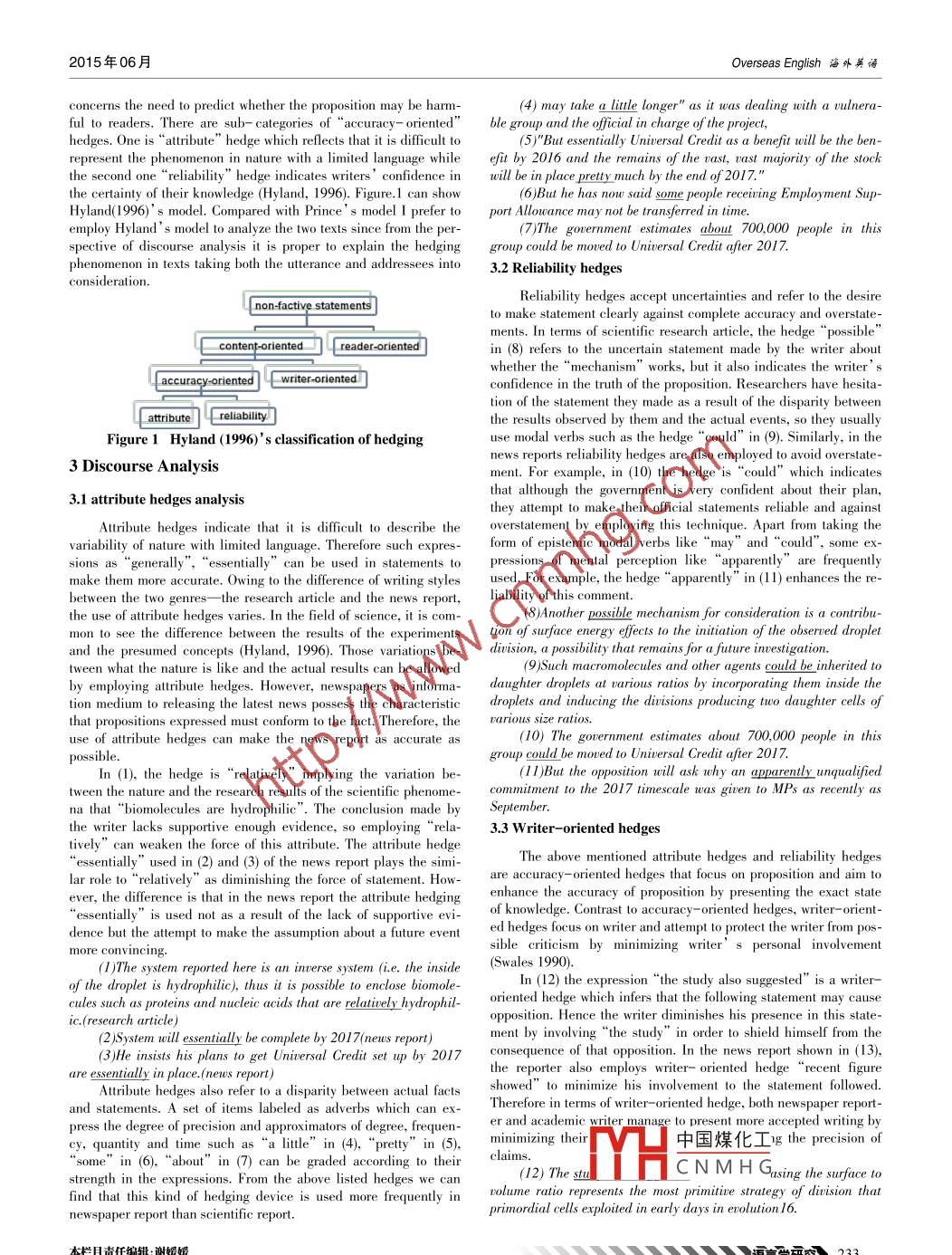 hwsy@overseaen.comISSN 1009- -5039htp://ww.overcaen.comOverseas English海外英語Tel:+86- -551-65690811 65690812Hedging in Discourse AnalysisXIAO Xin(Department of Education, The Universily of York, UK, Y010 5NG)Abstract: In this article an attempt to enhance the awareness of hedging use in discourse analysis and academic writing is madeby analyzing hedges employed in two comparable texts. The discourse analysis is conducted from“content- oriented" hedges and“reader- oriented" hedges. The article suggests that hedging can dampen utterances and statements, weaken the force of what one .says and show politeness to the listeners or readers, which varies from different discourse styles of various genres.Key words:iscourse marker; hedging; research article; news report中圖分類號:H0文獻標識碼:A文章編號: 1009- -5039(2015)12- -0232- -031 Introductionto 1965, neither Zadeh nor W einreich used the term“hedging” or“hedges” in their studies. The notion of hedging from the perspec-In recent studies of discourse analysis metadiscourse receivedtive of linguistics was originally introduced by Lakoff (1973) in hisa great deal of attention. The metadiscourse model proposed by Hy-article "Hedges: A Study in Meaning Criteria and the Logic ofland and Tse (2004) divides metadiscourse into two main calego- Fuzzy Concepts". Lakoff (1973, p.458-- 461) labeled hedging asries- interactive and interactional. As one of the interactional me-linguistic expressions that are used to modify the truth of the propo-ta-signaling devices, hedging generally refers to expressions of pos-sition, conveying fuzziness and tentativeness.sibility such as 'likely’ , 'I think’and‘ may' that can minimizeHedging is defined as a means to make utterances or state-force and provide an opinion rather than a fact (takura & Tsui, ments fzzier and less forceful, protecting the 'face ; of the speak-2011). In spite of some previous studies about hedging, compareder. Biber (1988, 240) gives a discourse- oriented definition of hedg-with other meta- signaling devices such as transitions and framees that“hedges are informal, less specific markers of probability ormarkers, the analyses of hedging are somewhat les. Furthemore, uncertainty". Later Hyland(1996, p.433) put forward a definition ofdespite the frequent occurrence and distribution of hedging in re-hedging highlighting its significance of academic writing thatsearch articles, newspapers and conversational discourses, the anal-“hedging is the expression of tentativeness and possibility and it isysis of hedging in comparable discourses received less attention.central to academic writing where the need to present unprovenTherefore, in this article hedging will be discussed with the pur-propositions with caution and precision is essential”.pose of enhancing the awareness of hedging use in discourse analy-W ith respect to the category of hedging, it presents an unfixedsis and academic writing by analyzing the use of hedging in twomodel. From the semantic and pragmatic perspective, Prince, Frad-comparable texts. One of the comparable texts is an extract of a re-er and Bosk(Prince, Frader, & Bosk , 1982) categorized hedging in-search article in the field of Biotechnology from Scientific Reports to “approximanators” and “shields” “Approximators” are expres-(Sato, Y asuhara, Kikuchi, & Sato, 2013). The other is a news reportfrom BBC Neus (Hawkins, 2013). The discourse analysis will becourse fuzzier and highlight the adequacy of discourse content.conducted from“content oriented" and“witer oiented" hedges "Shields" are worls and phrases like "migh”, "I think" and“per-employed from Hyland's classification of hedging (Hyland, 1996). .haps”which are employed to modify the truth of the utterance,2 Literature Reviewshowing that the speakers and writers are not committed to the va-lidity of what they convey.With respect to the origin of hedging, Zadeh (1965) and Wein-Similar with Prince’s model, the classification of hedging pro-eich (1966) as the most important predecessors of hedging re-posed by Hyland (1996) is in his'pragmatic framework", but he di-search should be mentioned. Zadeh( 1965) considered classes suchvided hedging in the context of academic discourse into two catego-as“animal" to own unchanged membership criteria in his“Fuzyries. One is“content-oriented”which refers to the relationship be-Sets", which is the fuzzy set theory. W einreich( 1996) marked hedg-tween what writers propose and what the reality represent concern-ing as‘metalinguistic operators”in his article “On the Semantic .ing the statements’accuracy conditions. The other is“reader- ori-Structure of English". He argued that:ented”which takes the readers’ response of propositions an"for every language 'metalinguistic operators' such as (in) Eng-whether they accept them into consideration. In sum, a hypothesislish true, real, so- called, strictly speaking, and (in) German ei-made by a writer is related to both the nature of reality and thegentlich, and the most powerful extrapolator of all - like - functionceptability to an audience (Hyland, 1996,). “Content- oriented"as instructions for the loose or strict interpretation of designatal"hedges can be further divided into two categories, namely“accura-(1966, p.163). .cy- oriented”and“ writer- oriented' . The first one is an obligationAlthough they argued the phenomenon of hedging dating backto present propositions as accurately as possible while the second中國煤化工MHCNMHG收稿日期:2015-05-05修回日期:2015-05-25作者簡介:肖欣(1990-),女,湖北孝感人,英國約克大學教育學院對外英語教育研究生,研究方向:對外英語教育。232 /遭孚研酸7 7 2欄目責任編輯:謝媛媛Overseas English海外英語2015年06月(13) Our results reported herein suggest _that a lipid droplet divi-hedges are frequent. Therefore, academic writing teacher shouldsion driven by an in